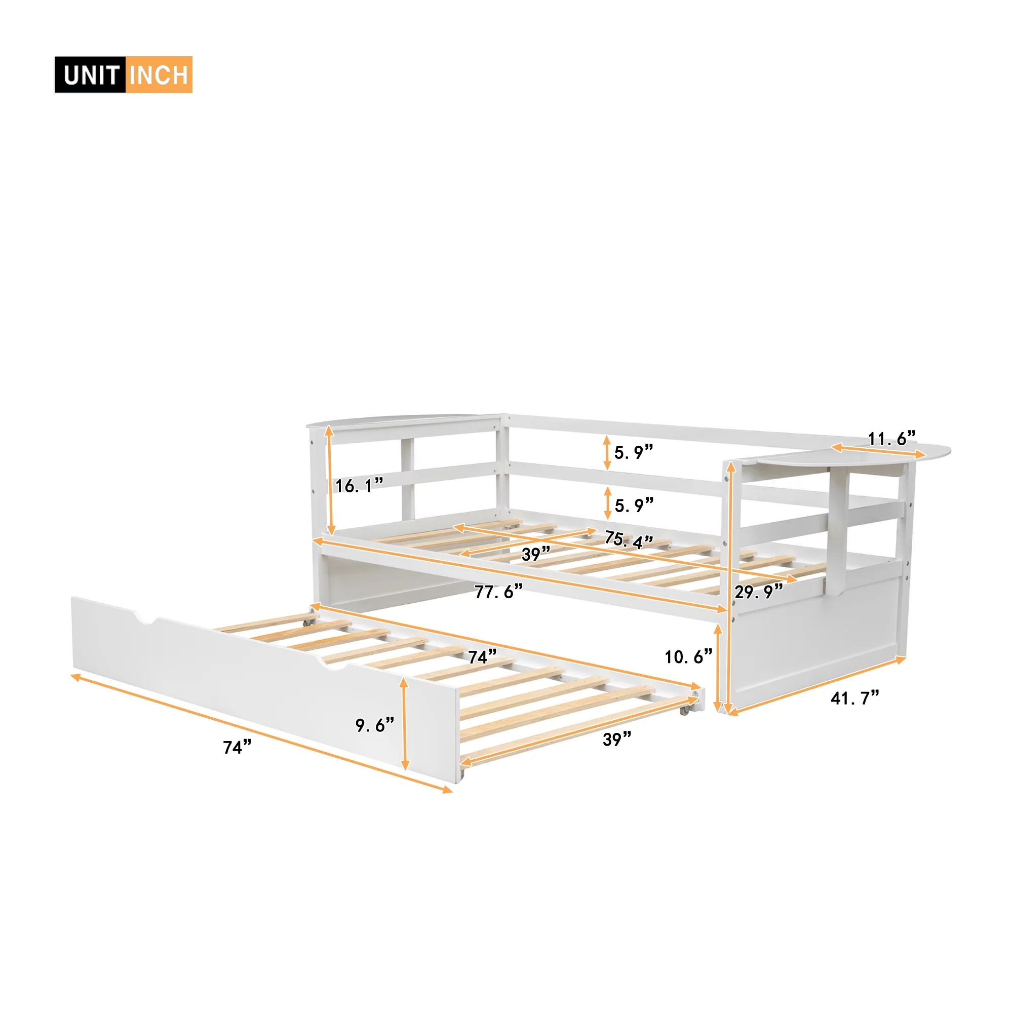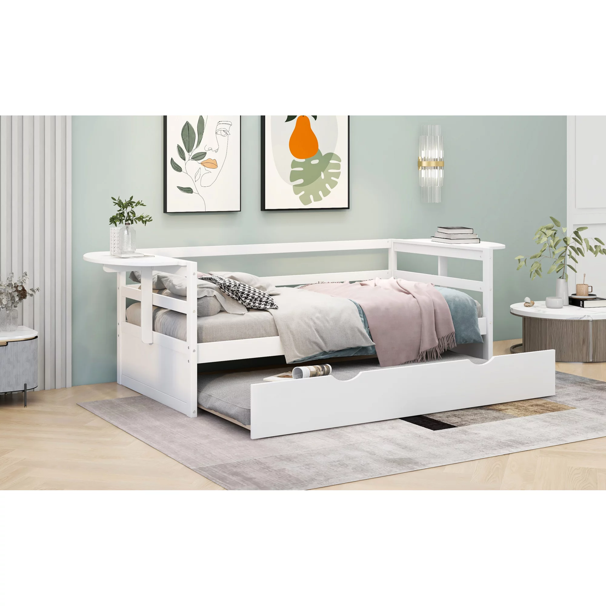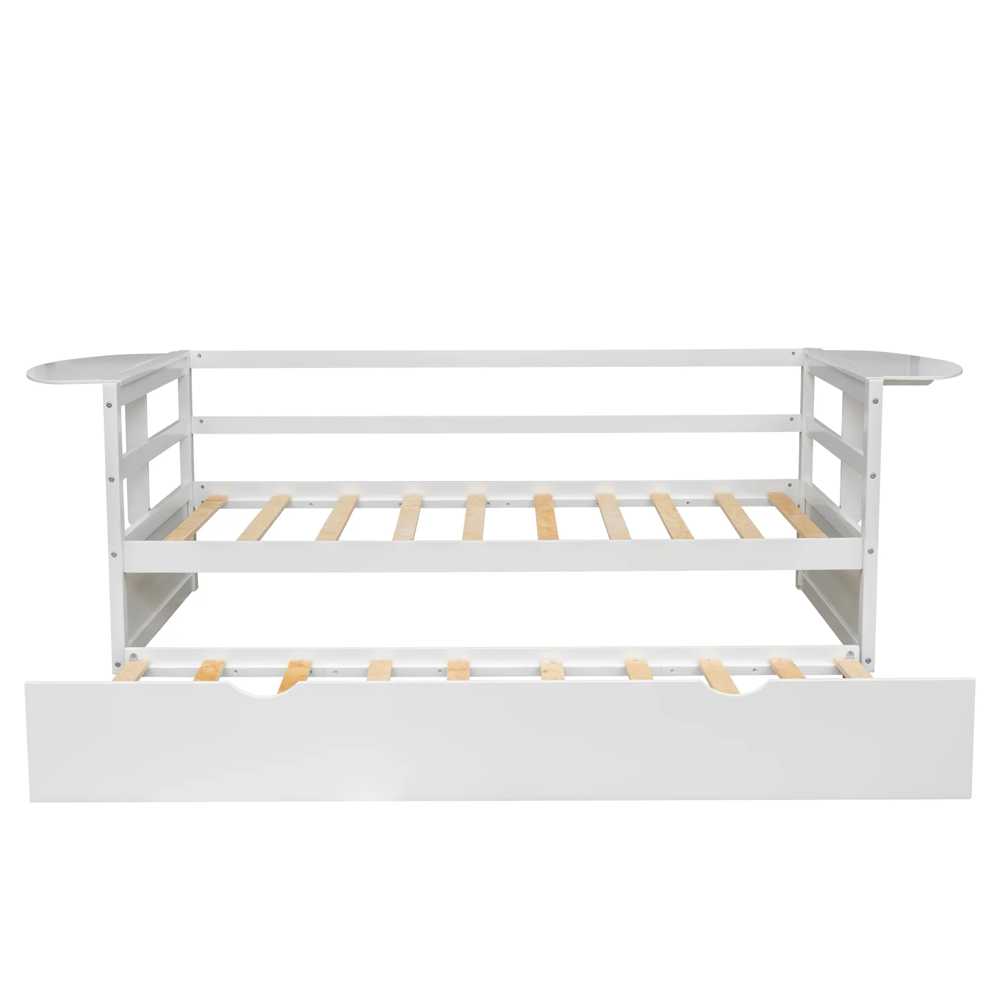 Twin Size Daybed with Trundle and Foldable Shelves on Both Sides, White