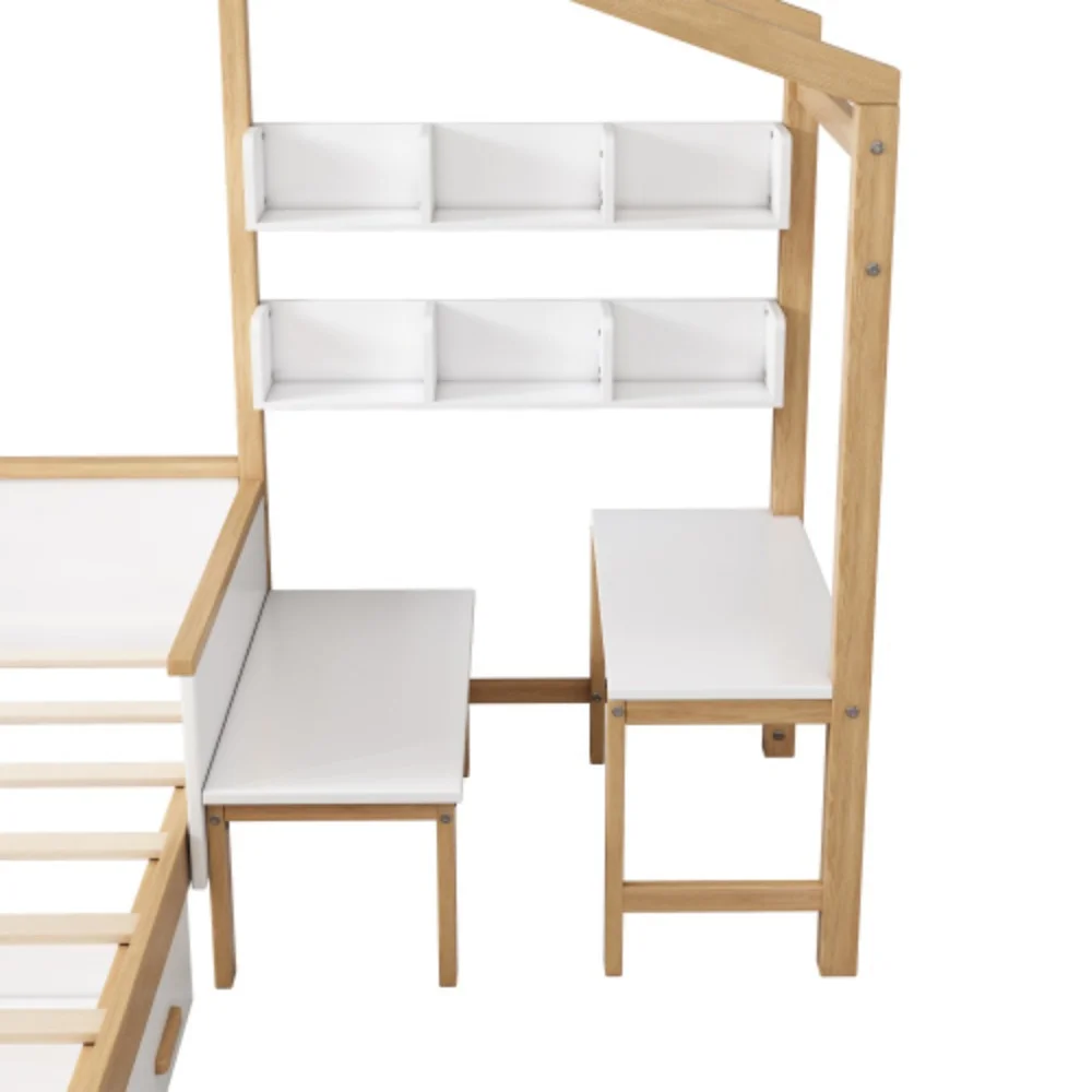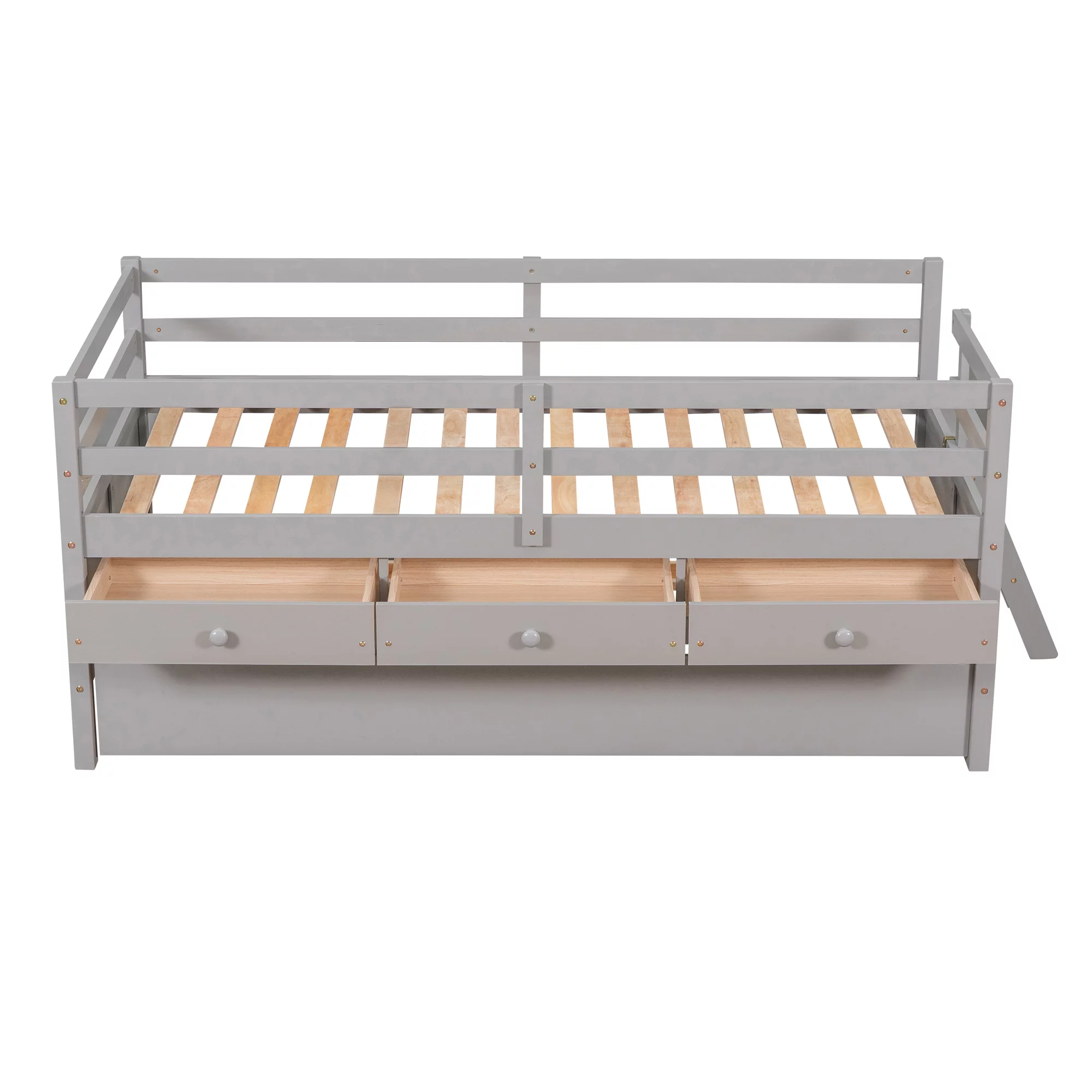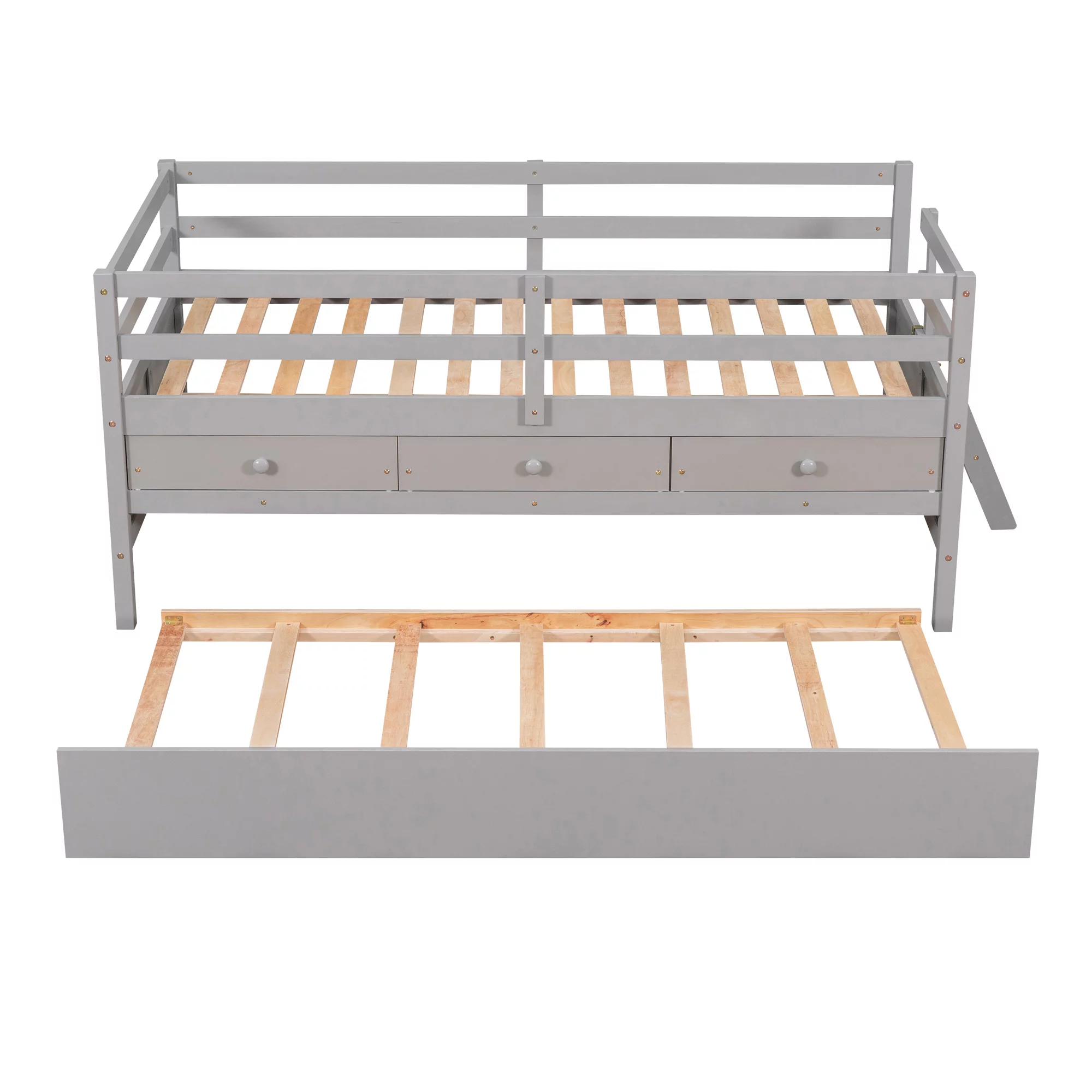 LANTRO JS Low Loft Bed Twin Size with Full Safety Fence, Climbing ladder, Storage Drawers and Trundle Gray Solid Wood Bed
