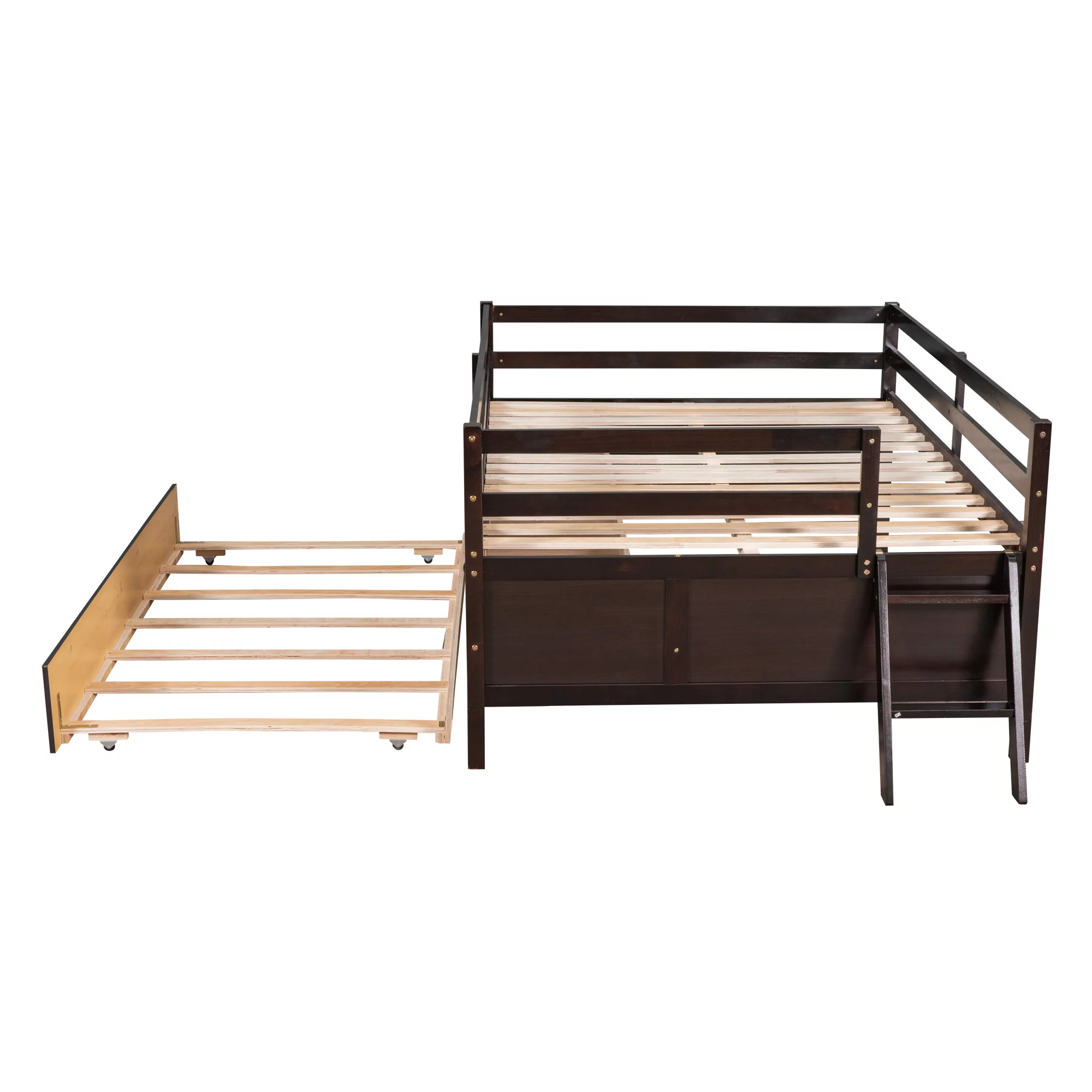 Low Loft Bed Full Size with Full Safety Fence, Climbing ladder, Storage Drawers and Trundle Espresso Solid Wood Bed