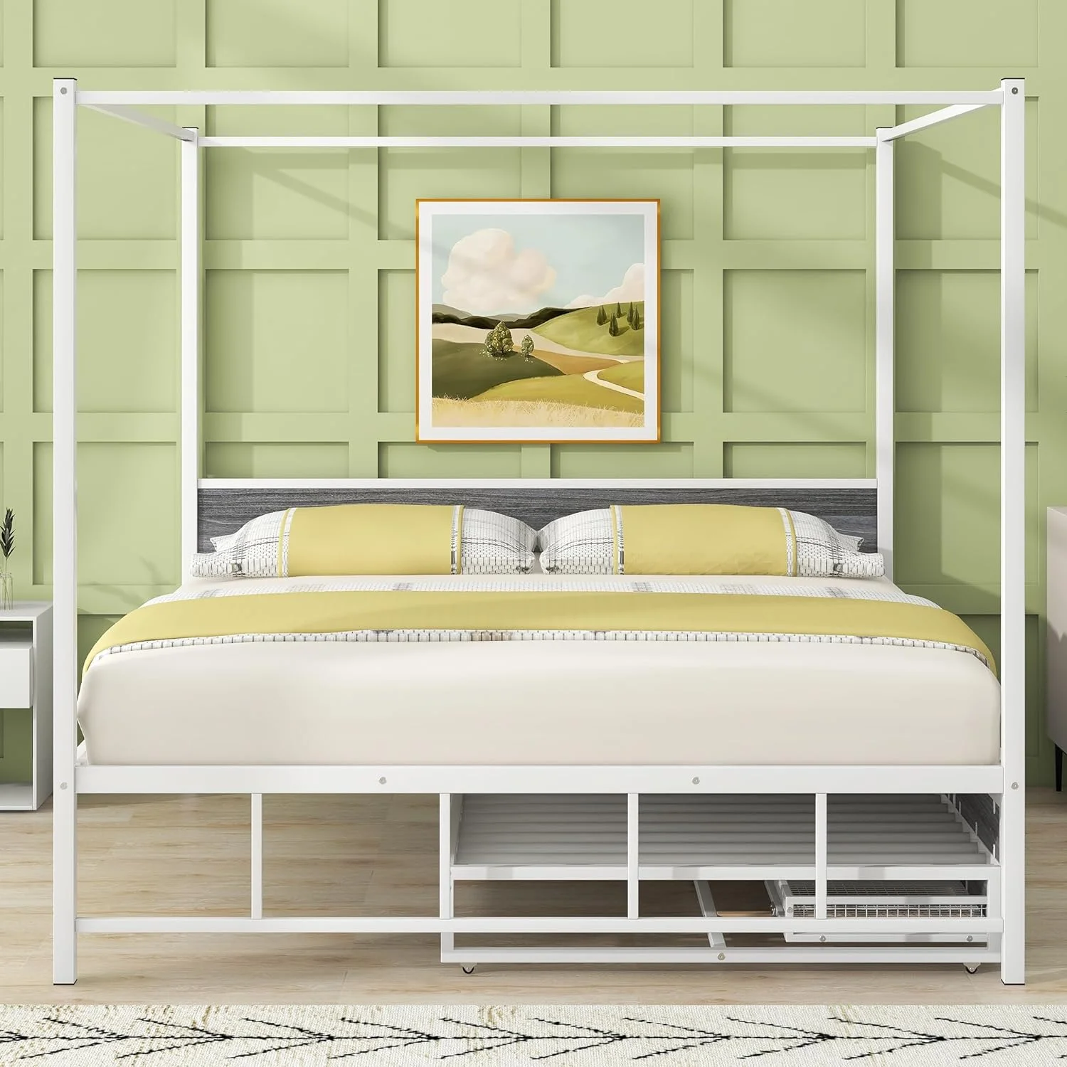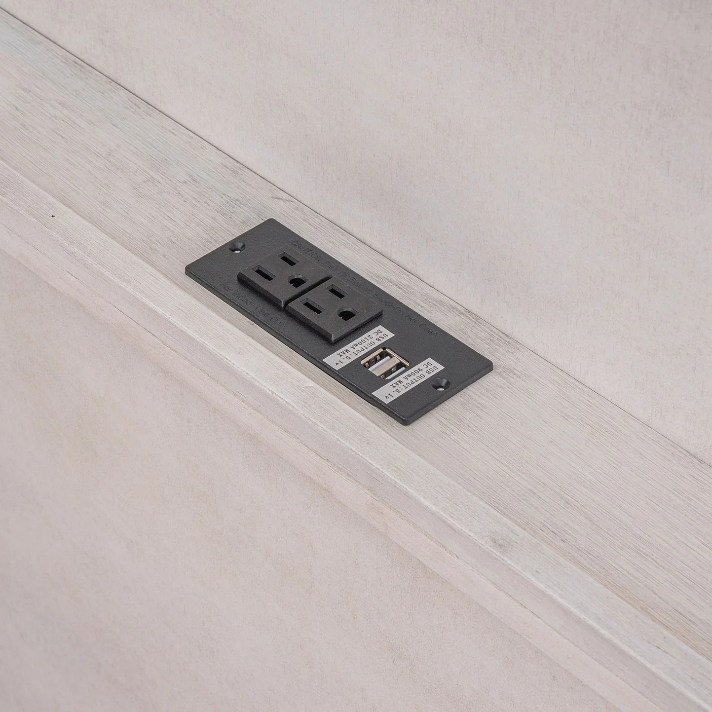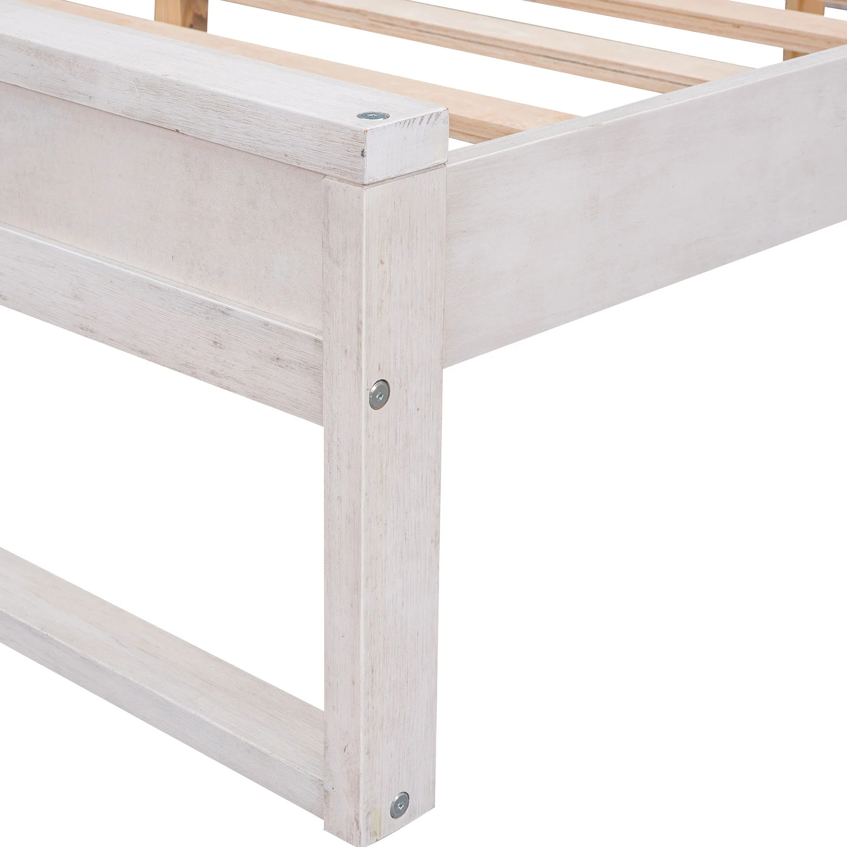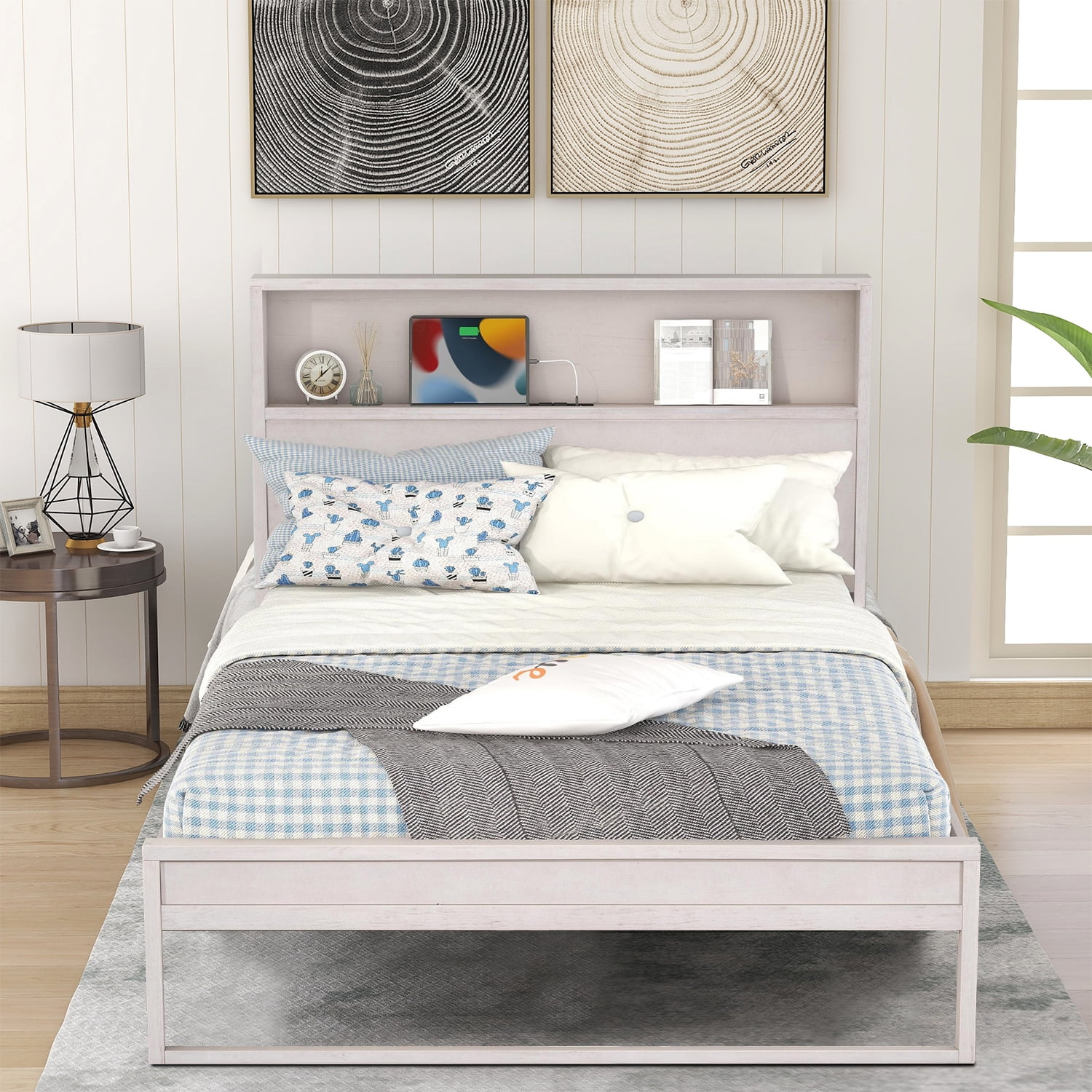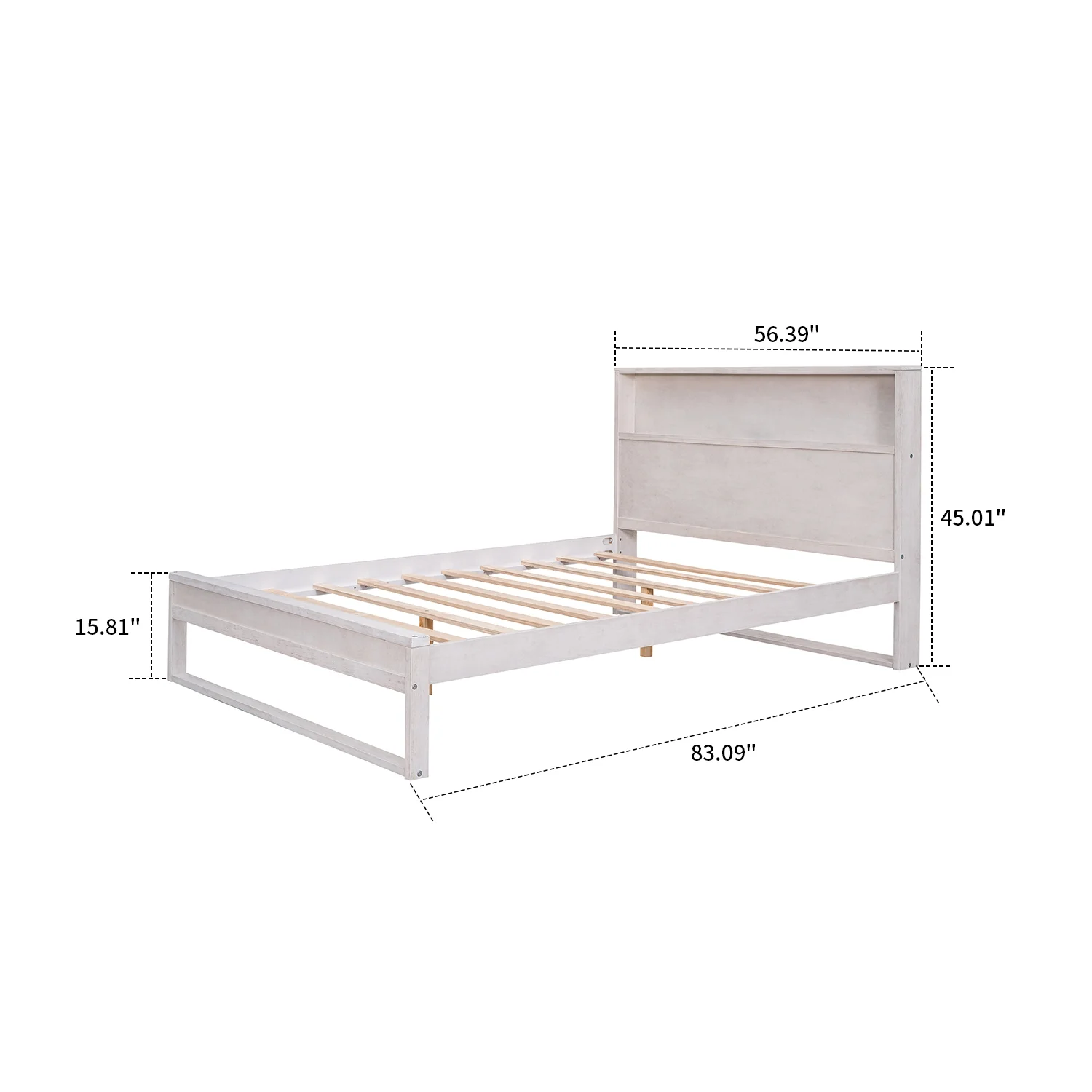 Classic Minimalist Style Full Size Wood Platform Bed with Storage Headboard, Antique White