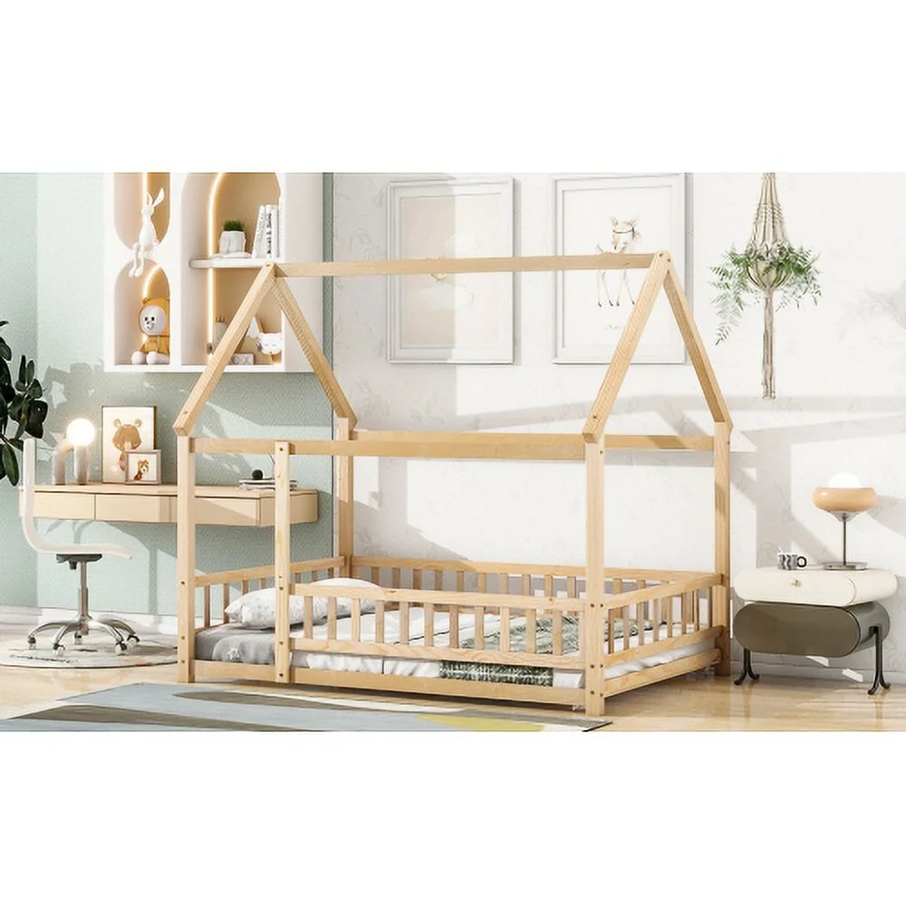 Full Size Floor Wooden Bed with House Roof Frame, Fence Guardrails ,Natural