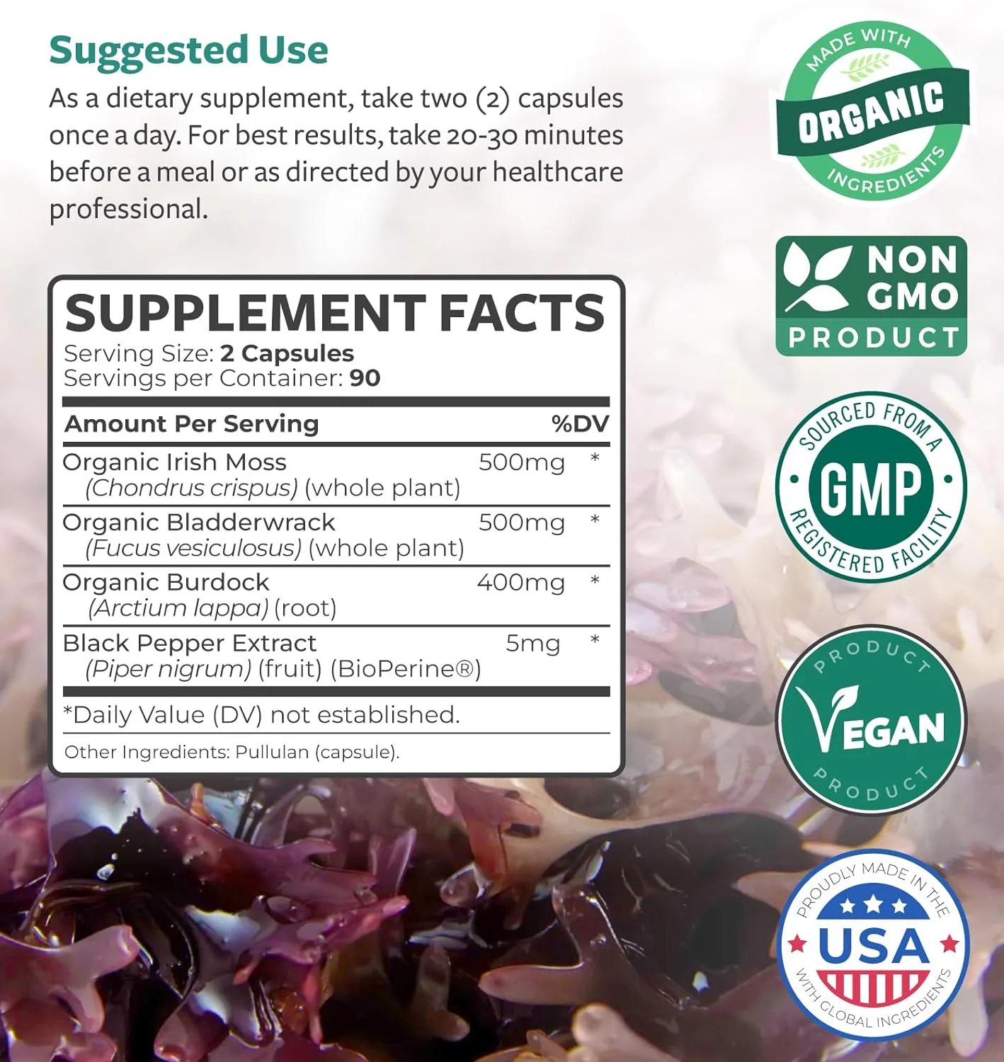 Advanced Irish Sea Moss (Non-GMO) Supports Digestion & Immune Health - Organic & Vegan Ingredients (180 Capsules)