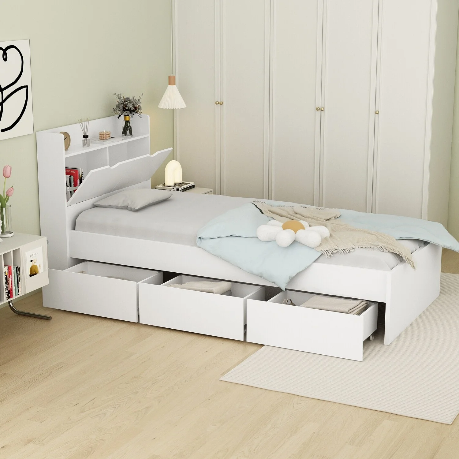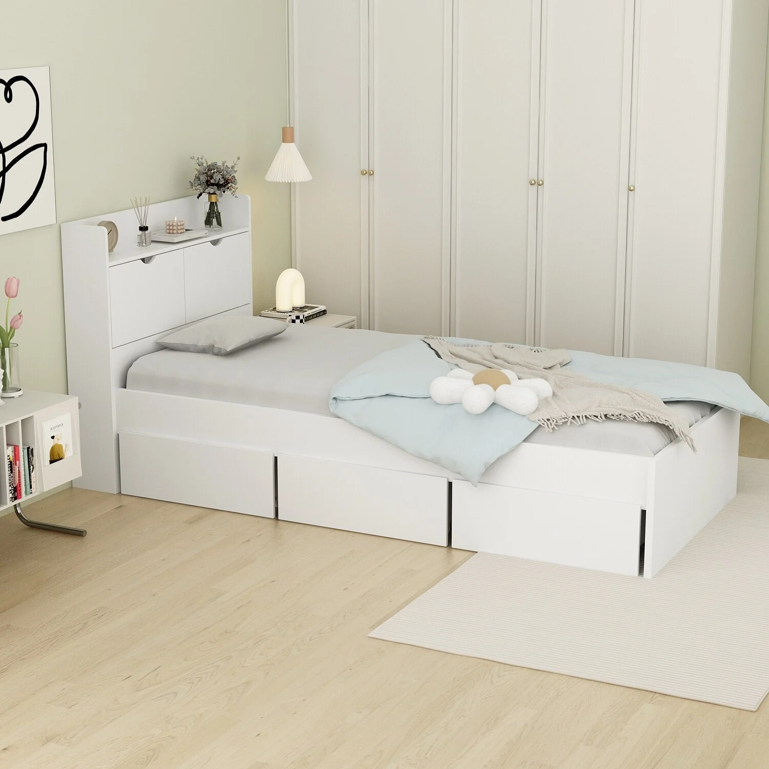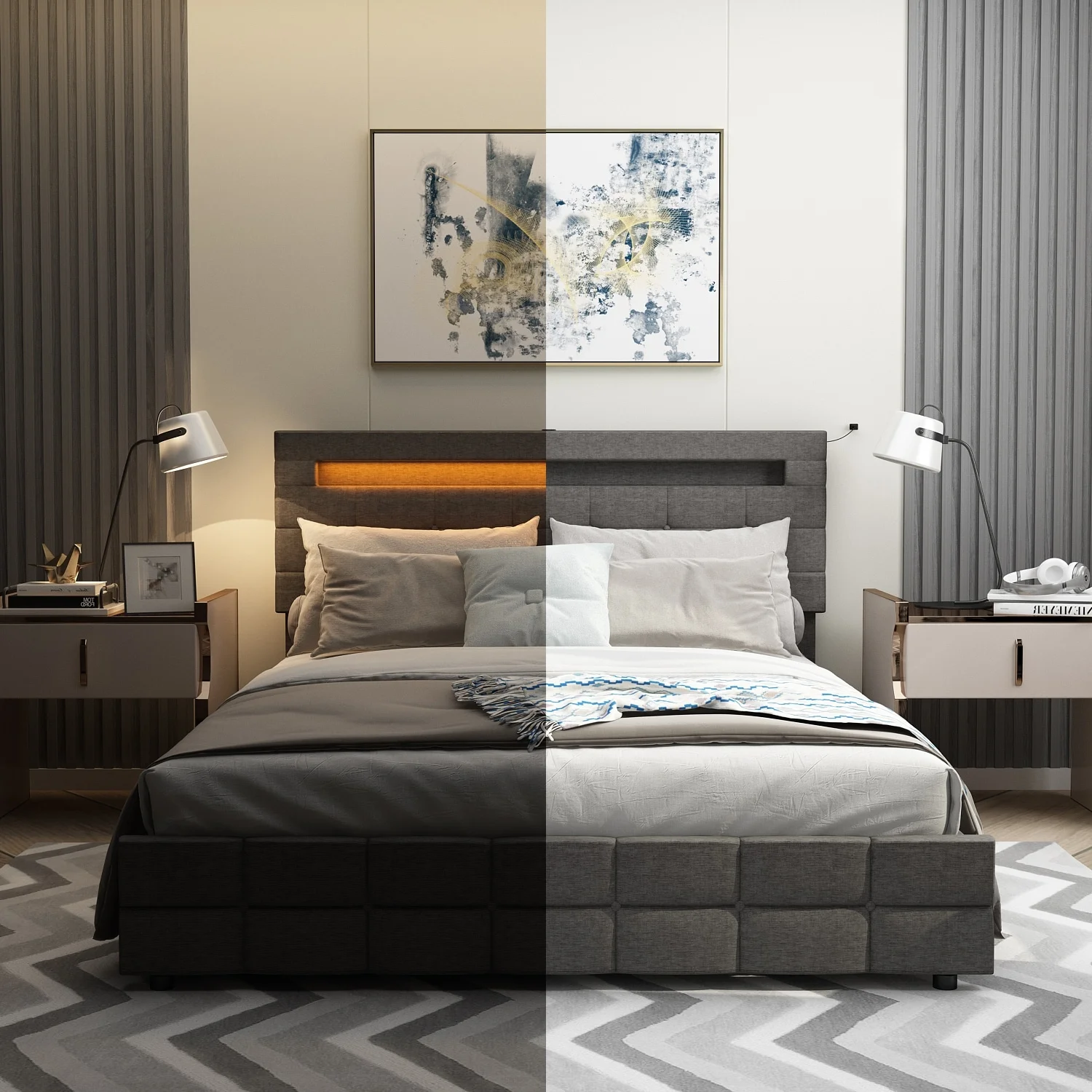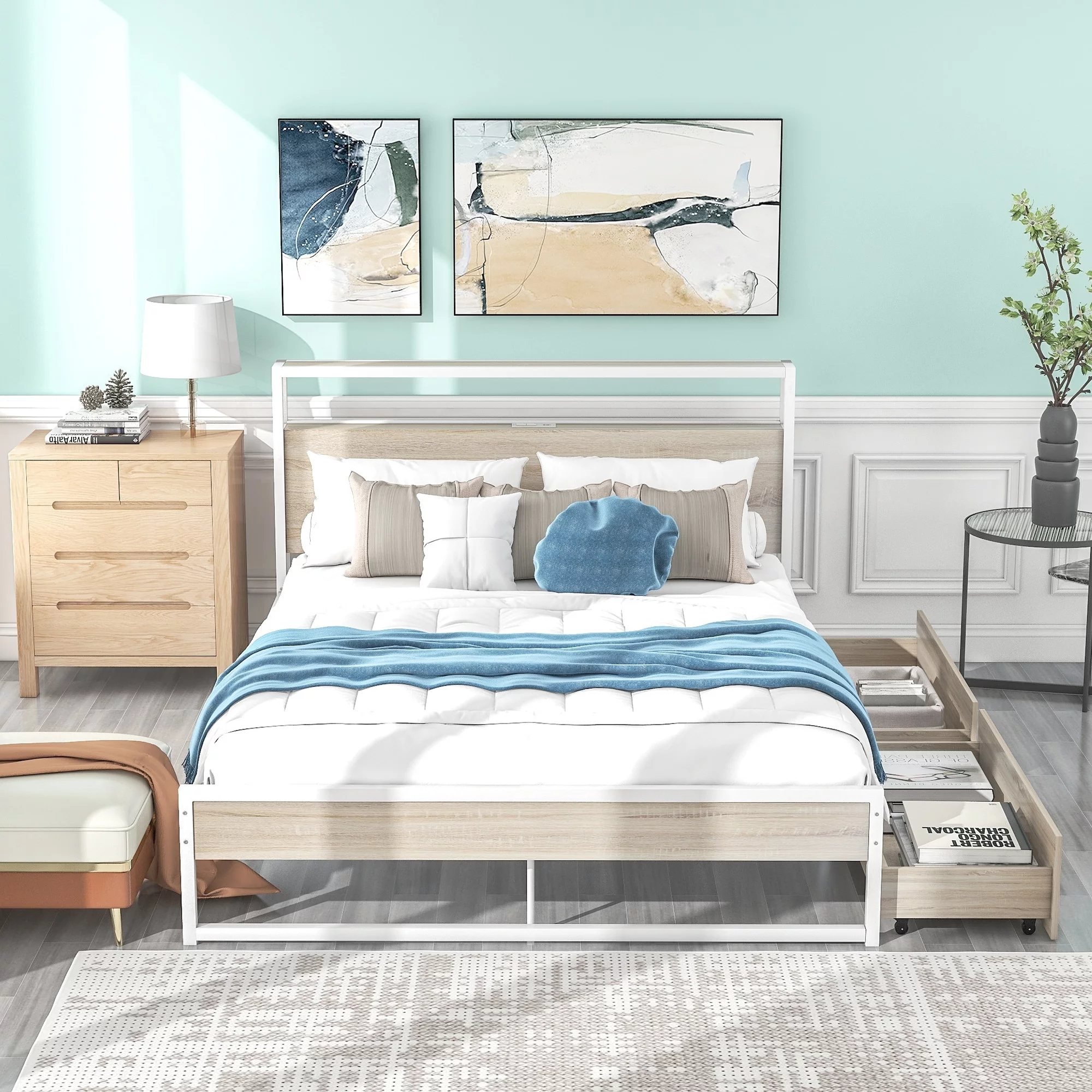 Metal Platform Bed Frame with Wooden Headboard, Storage Drawers, Sockets, USB Ports White - Queen