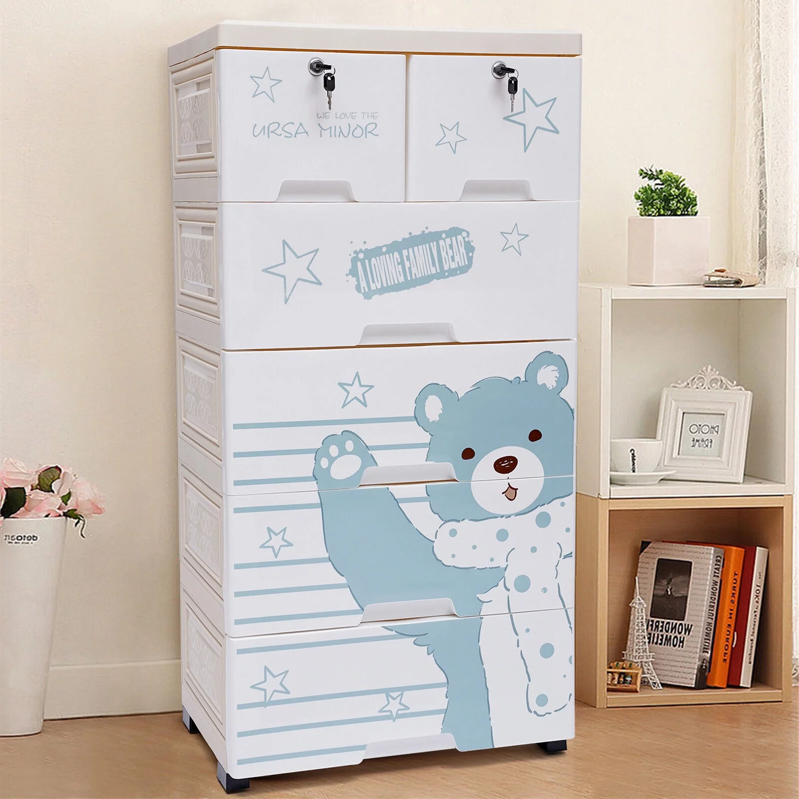 Blue 5 Layers Storage Cabinets 6 Drawer Plastic Dresser Storage Tower Closet Organizer W/ Wheels for Home