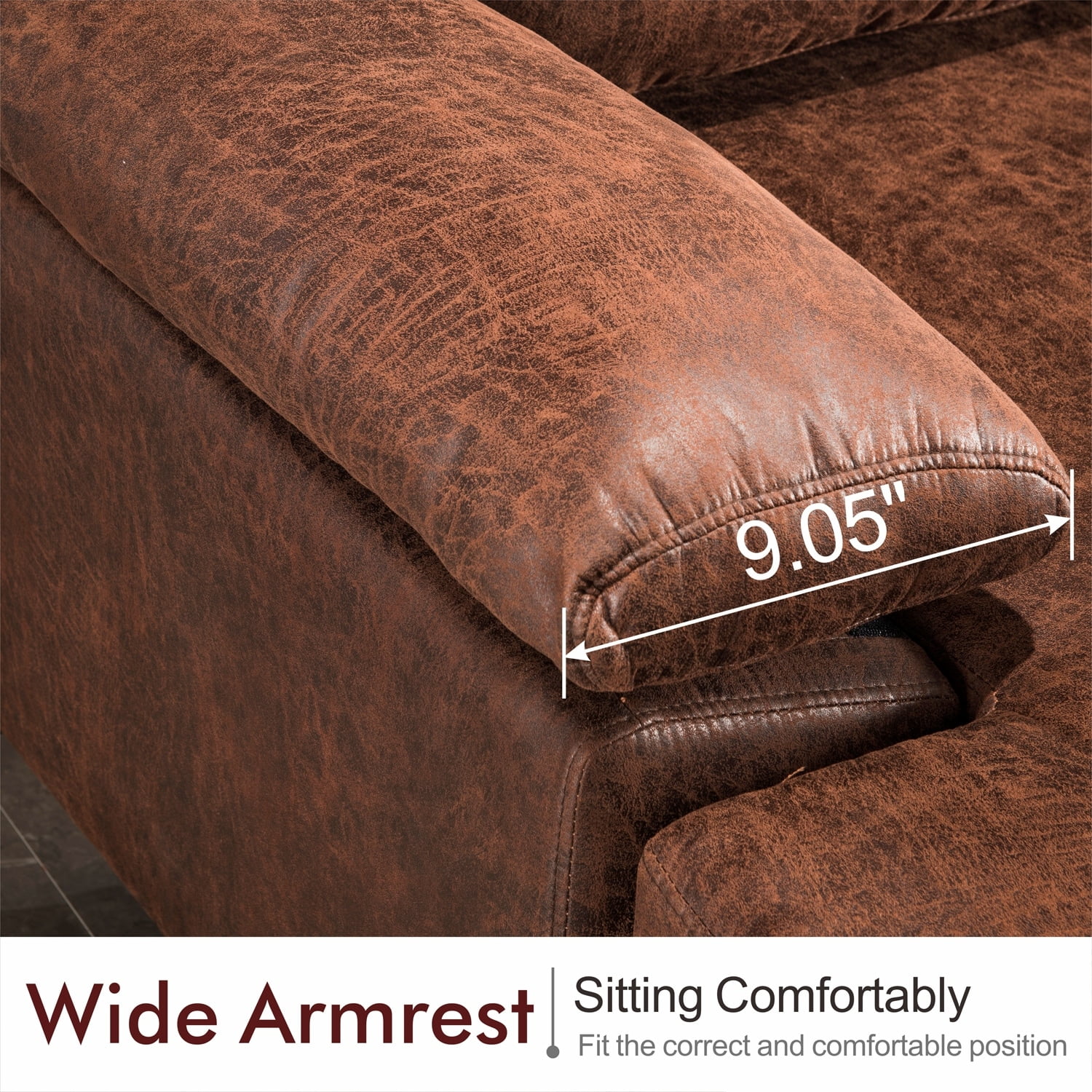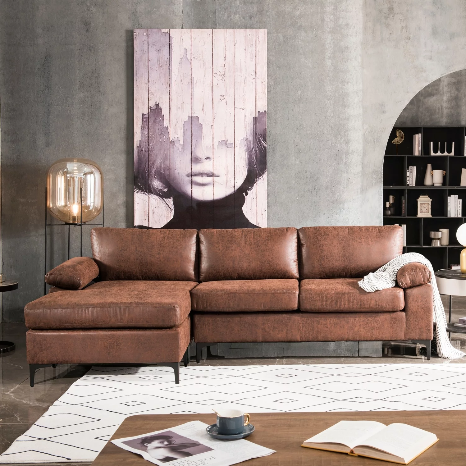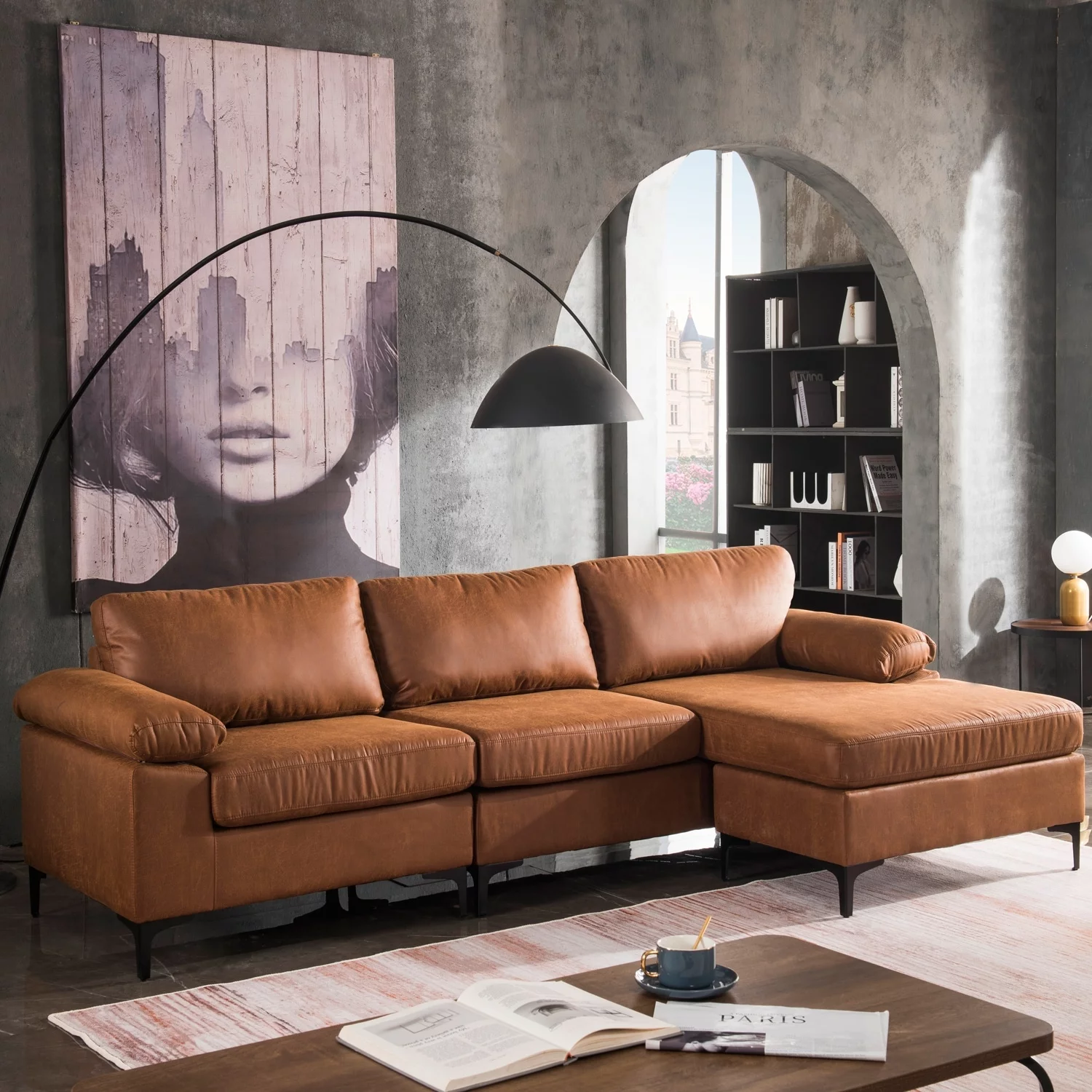 OVIOS Mid-Century SUEDE Leather Chaise Reversible Sofa Camel Suede Reversible Classic