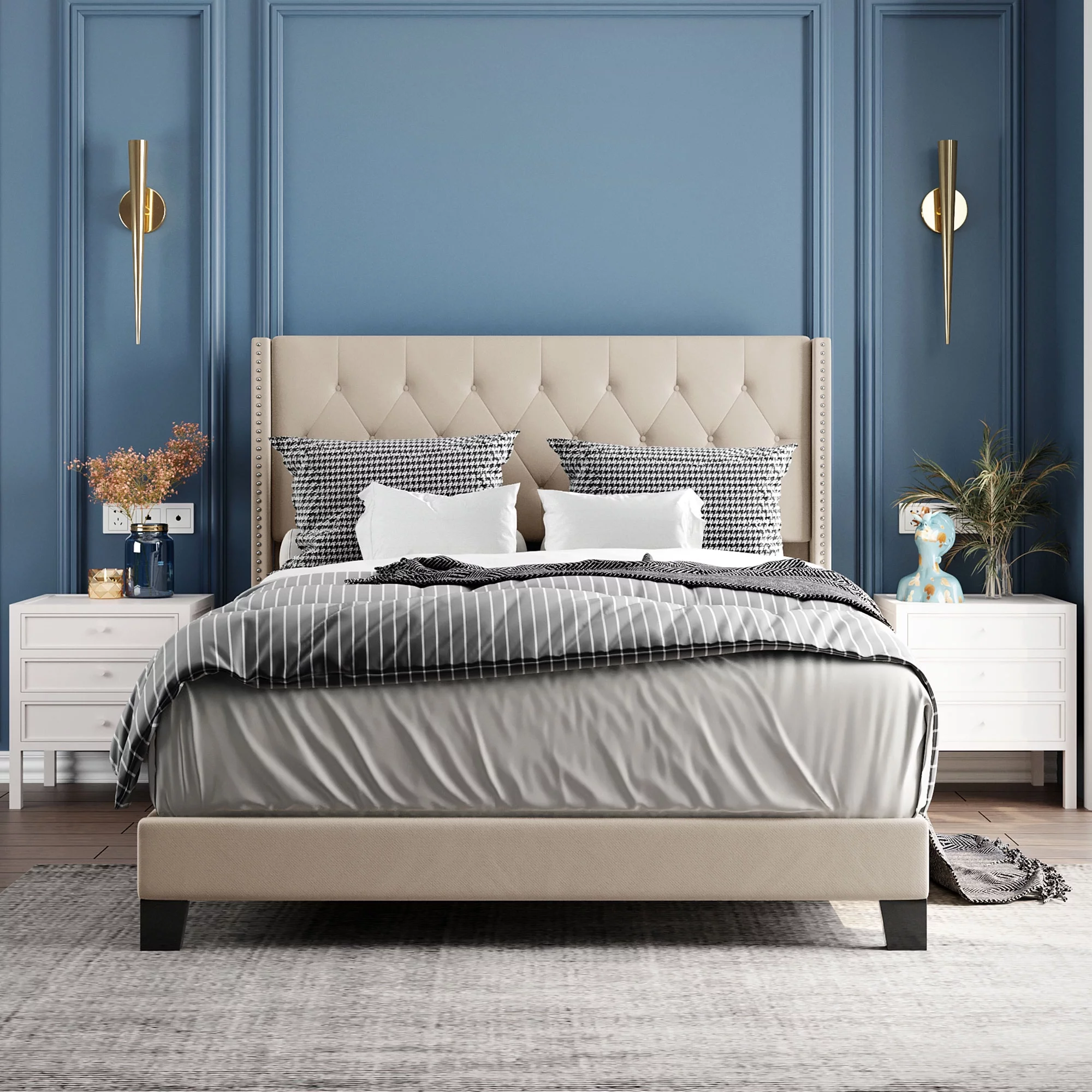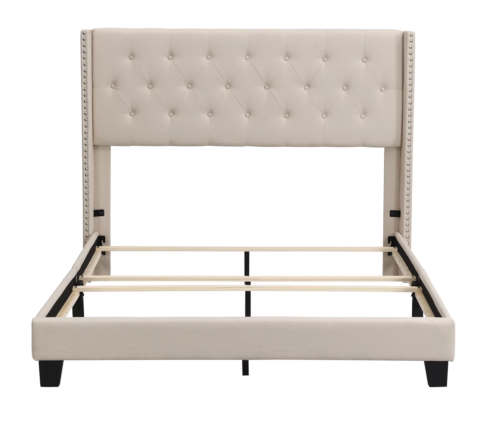 Wooden Queen Bed with Button Tufted Upholstered Headboard, Gray and Brown- Saltoro Sherpi