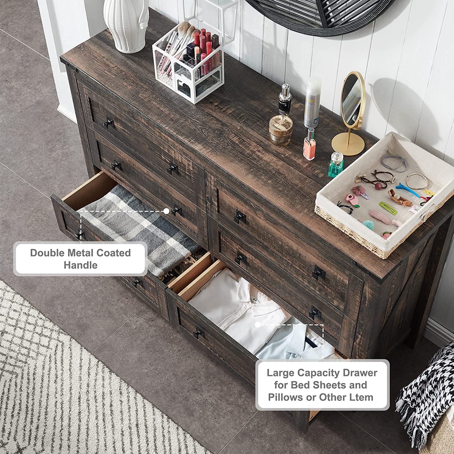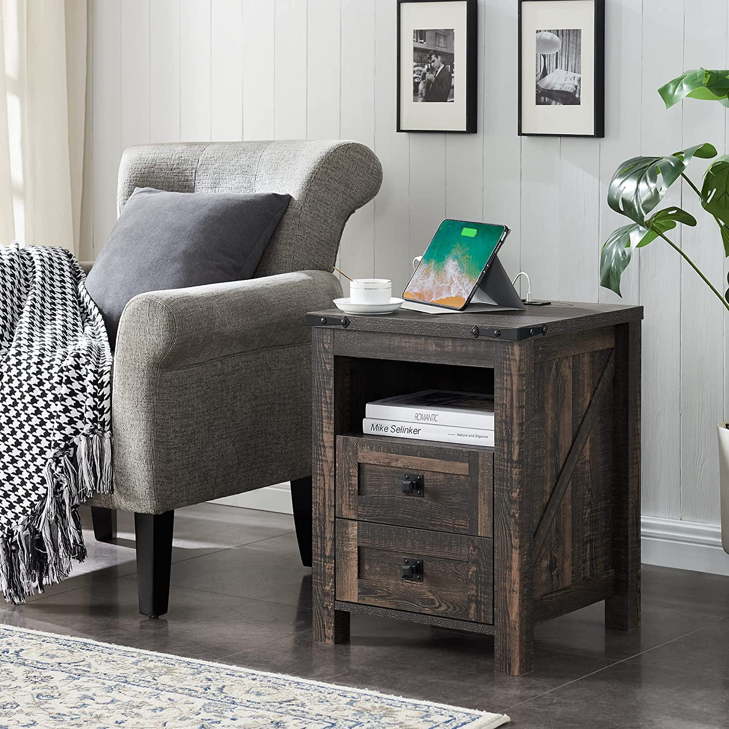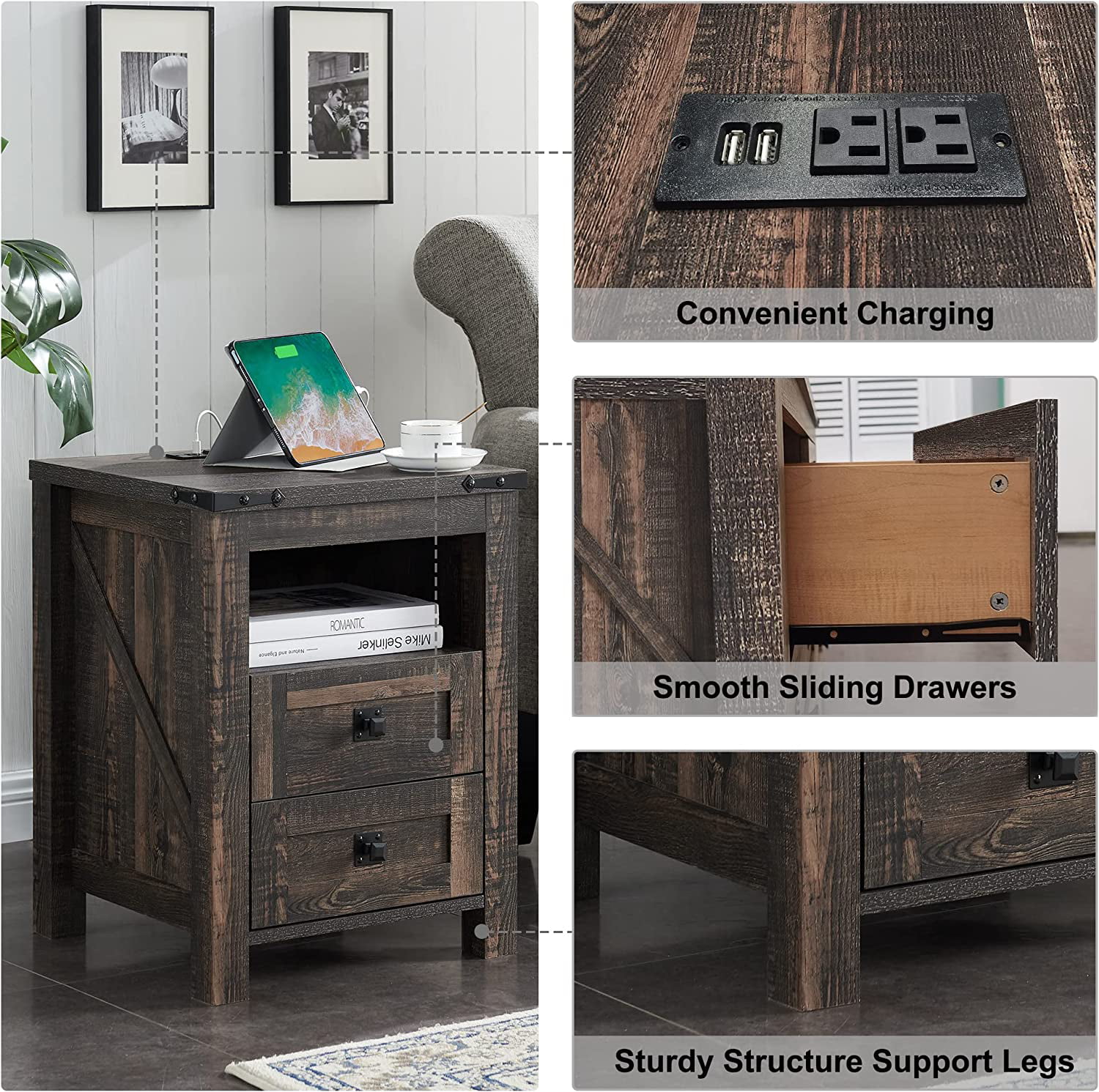 Natural Grey Finish 1pc Queen Size Bed Wooden Bedroom Furniture Drawers Footboard Upholstered Bedframe HB