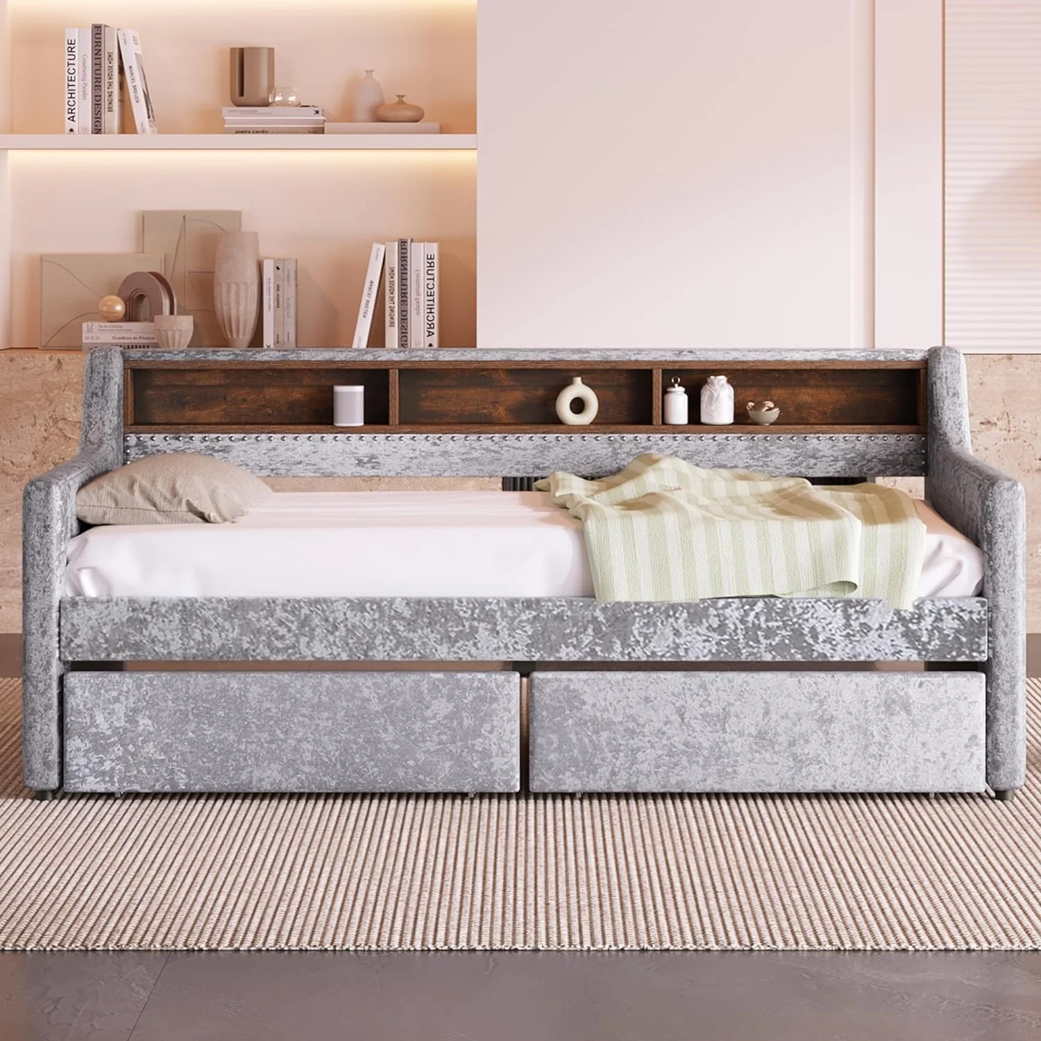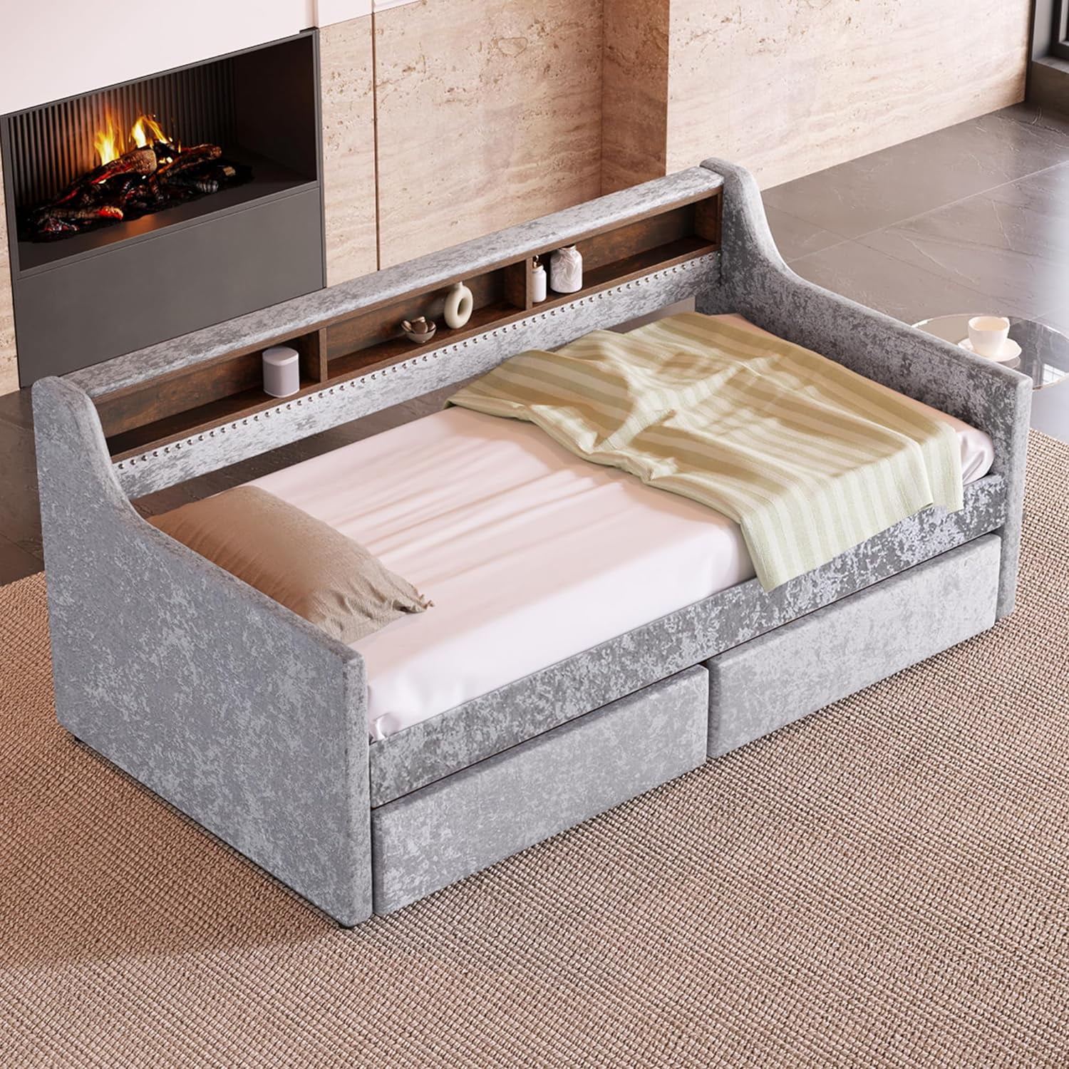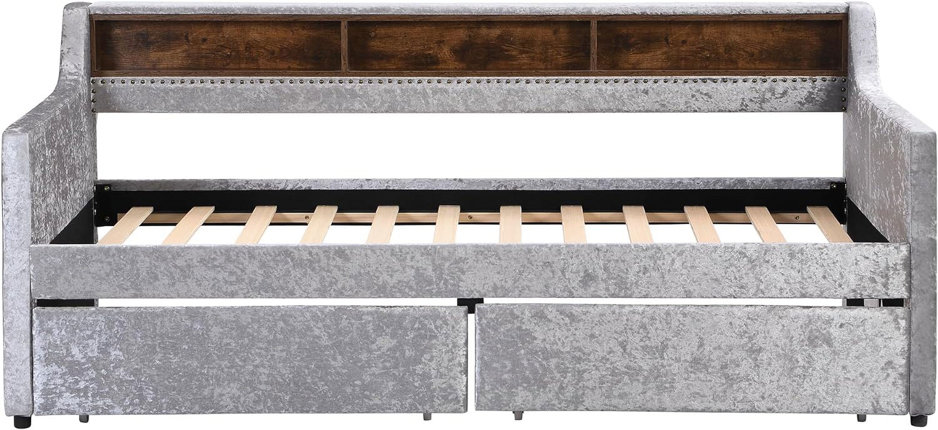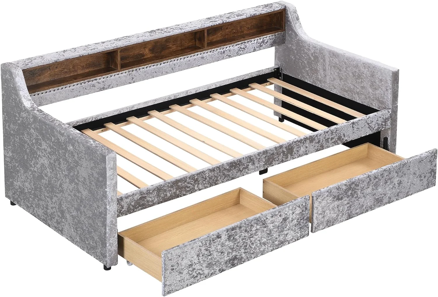 Twin Size Snowflake Velvet Daybed with Two Storage Drawers and Built-in Storage Shelves