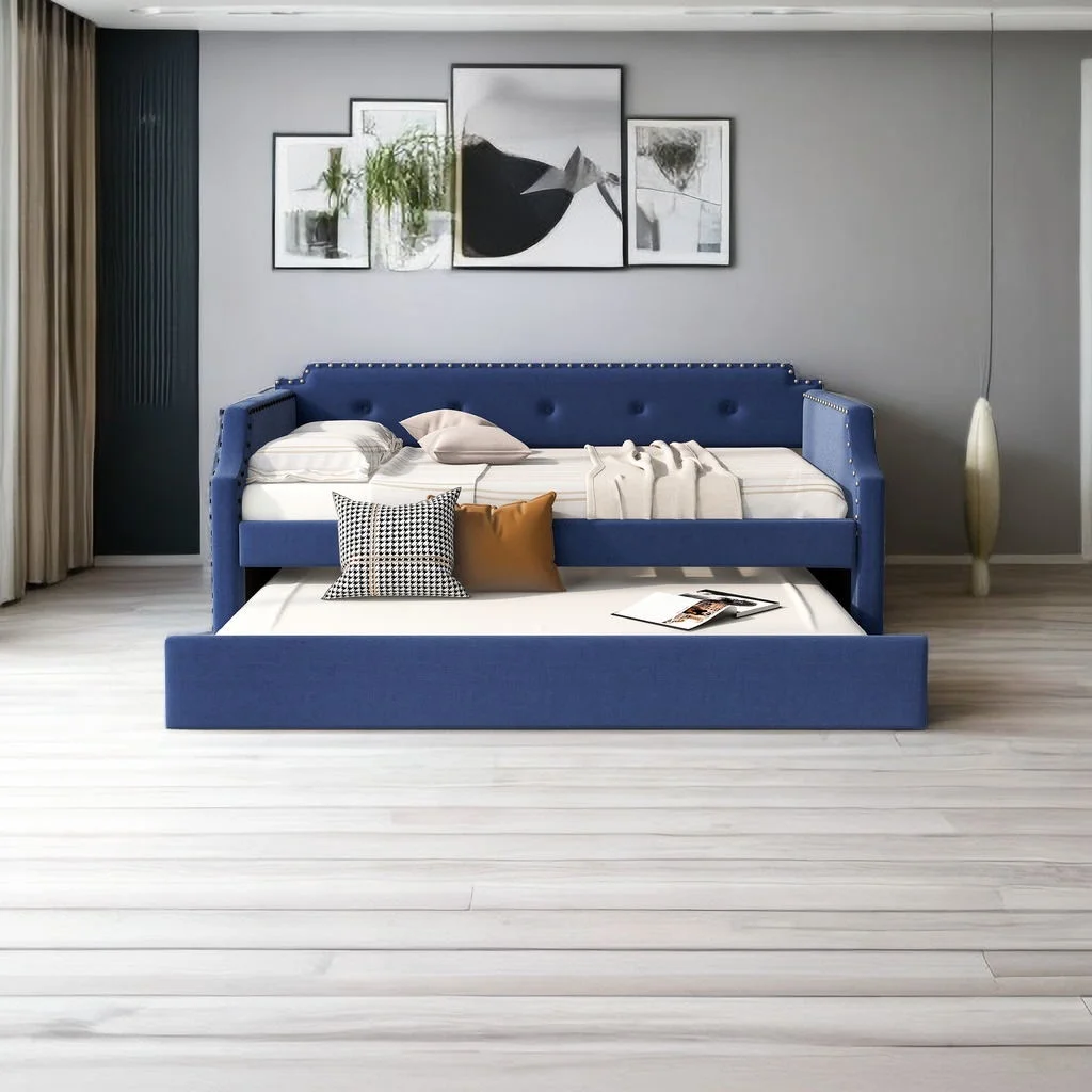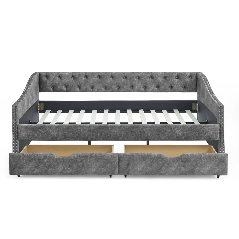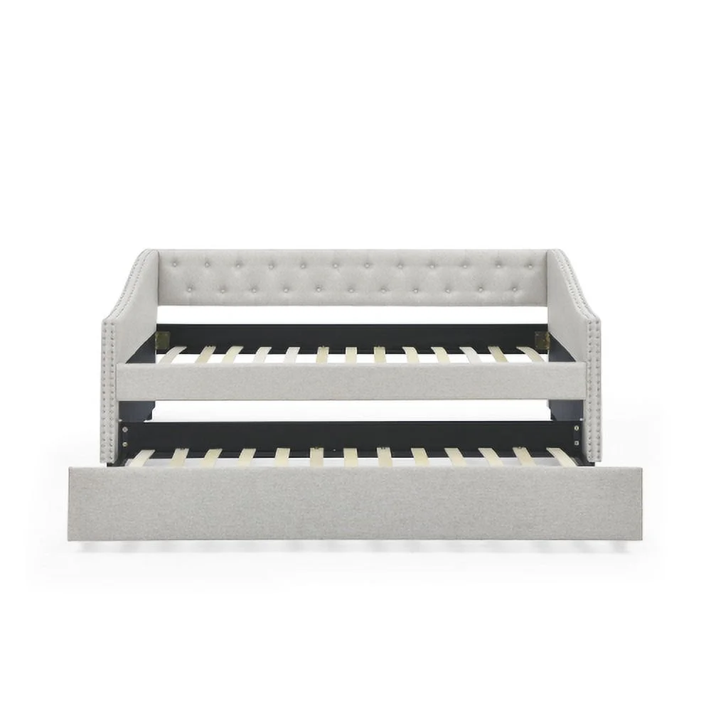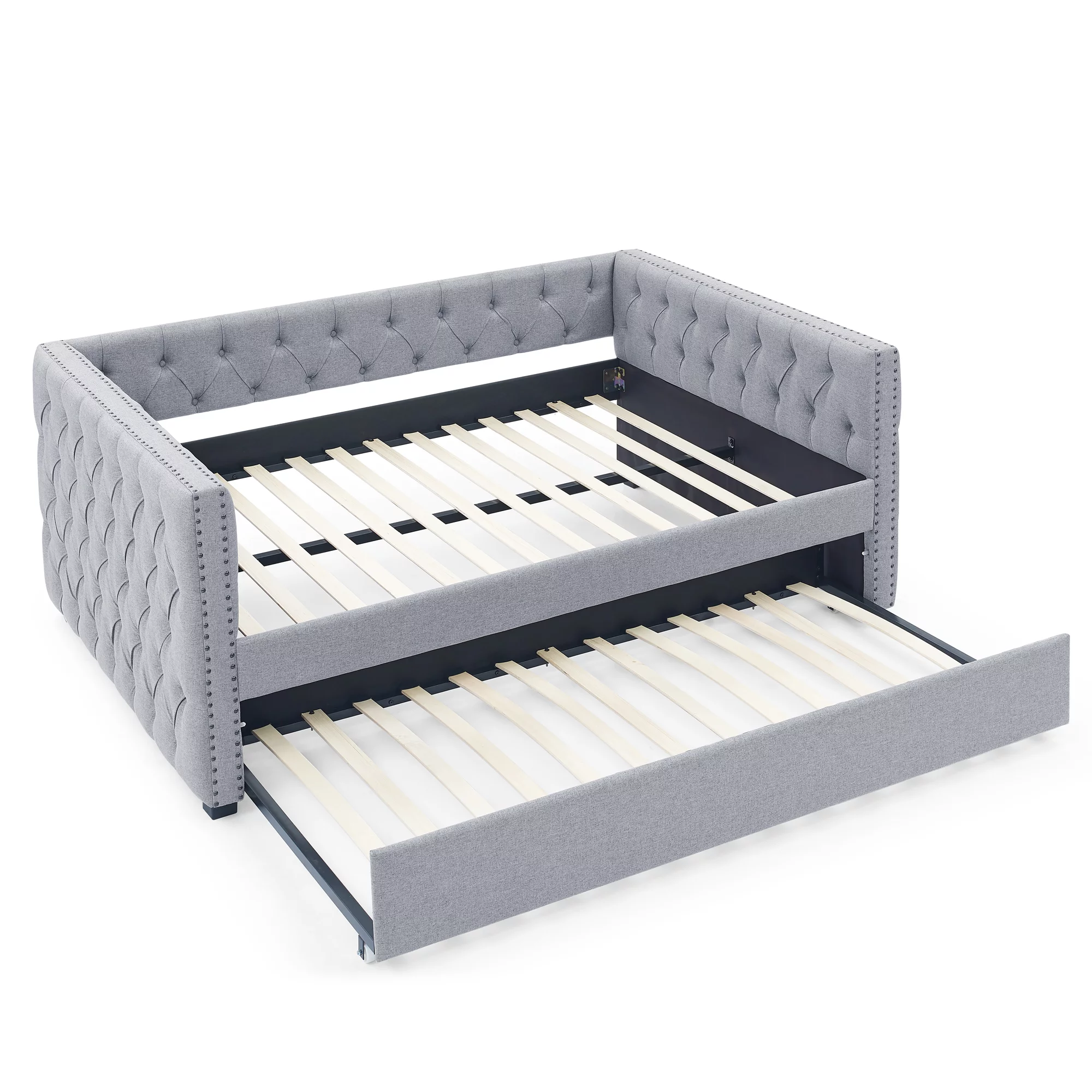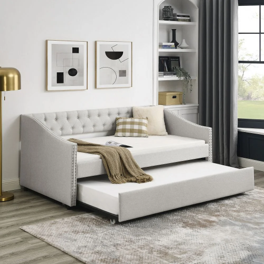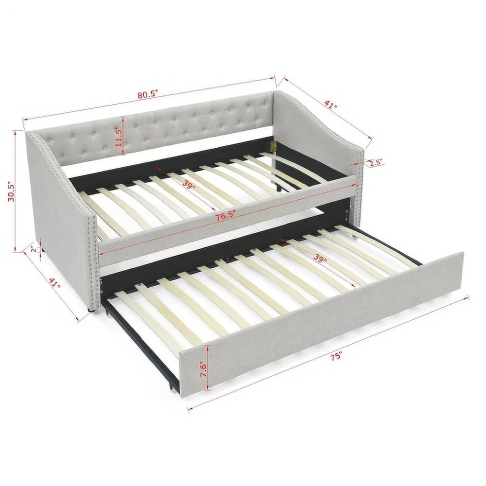 Daybed with Trundle Upholstered Tufted Sofa Bed,with Button and Copper Nail on Arms,both Twin Size,Grey(85.5"x42"x30.5")