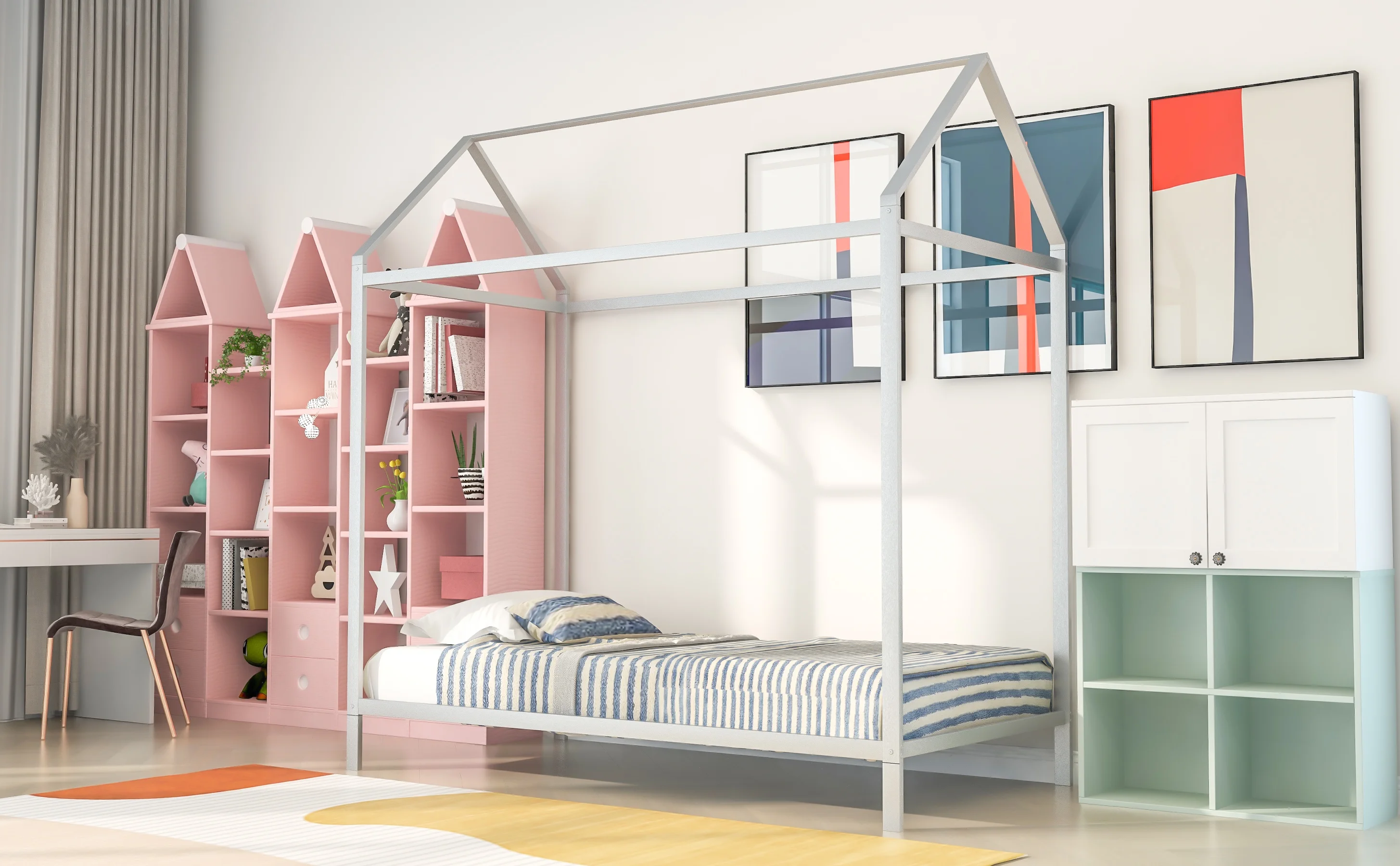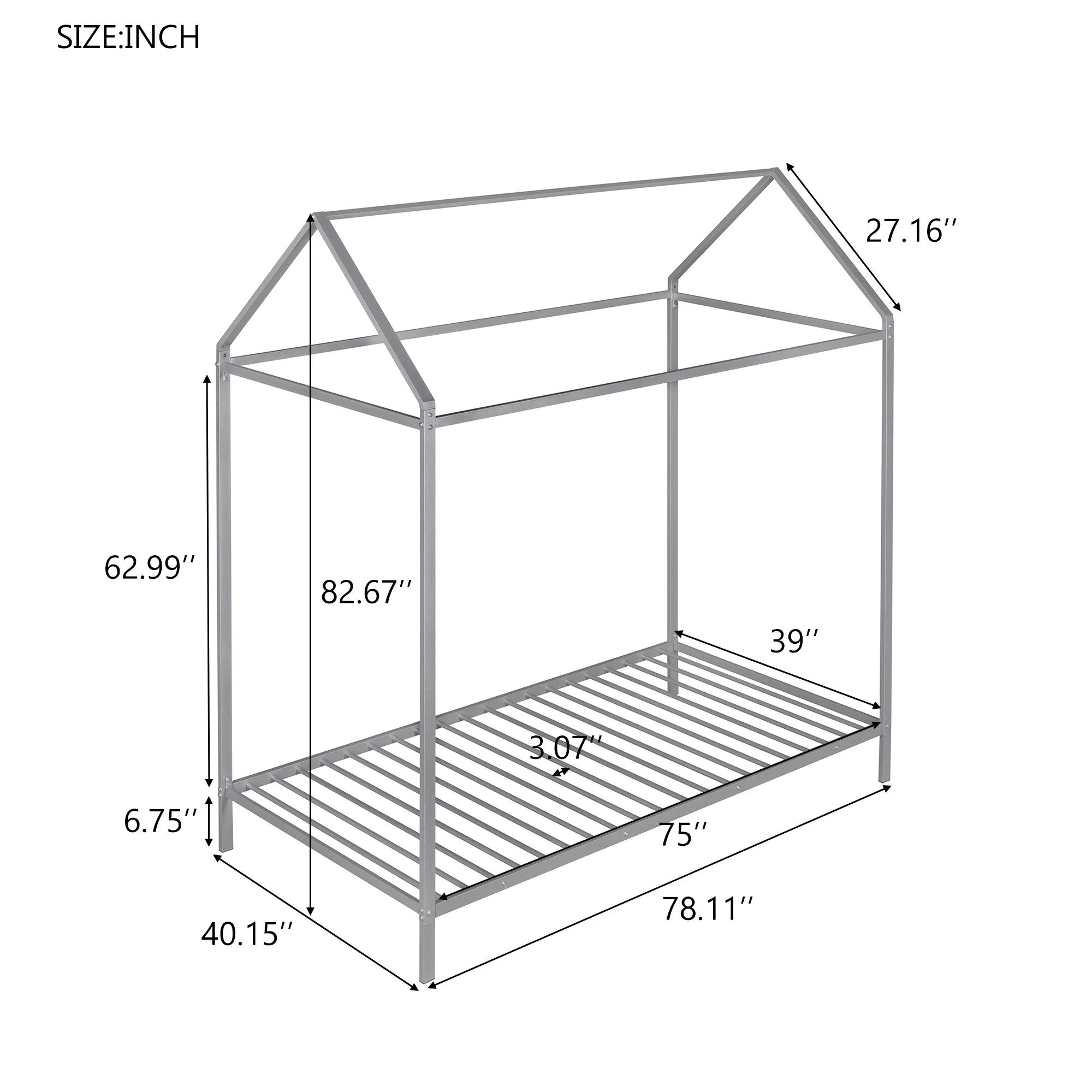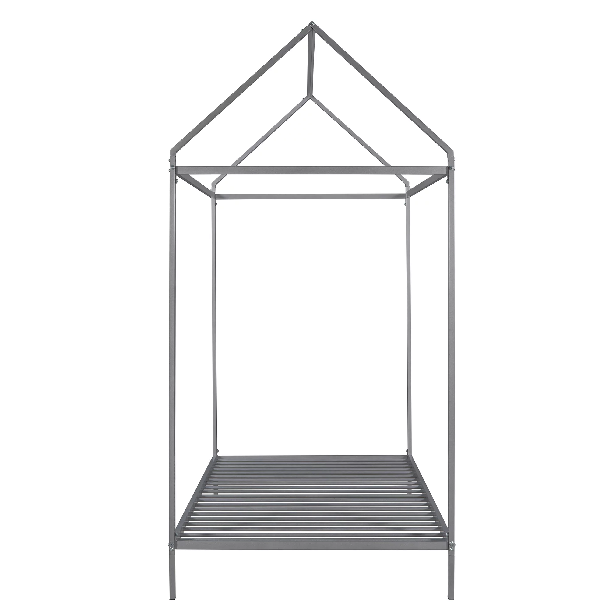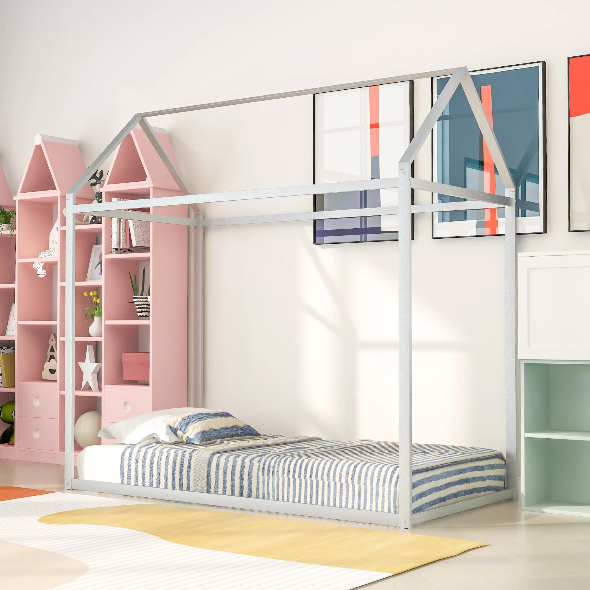 House Bed Frame Twin Size , Kids Bed Frame Metal Platform Bed Floor Bed for Kids Boys Girls No Box Spring Needed Silver