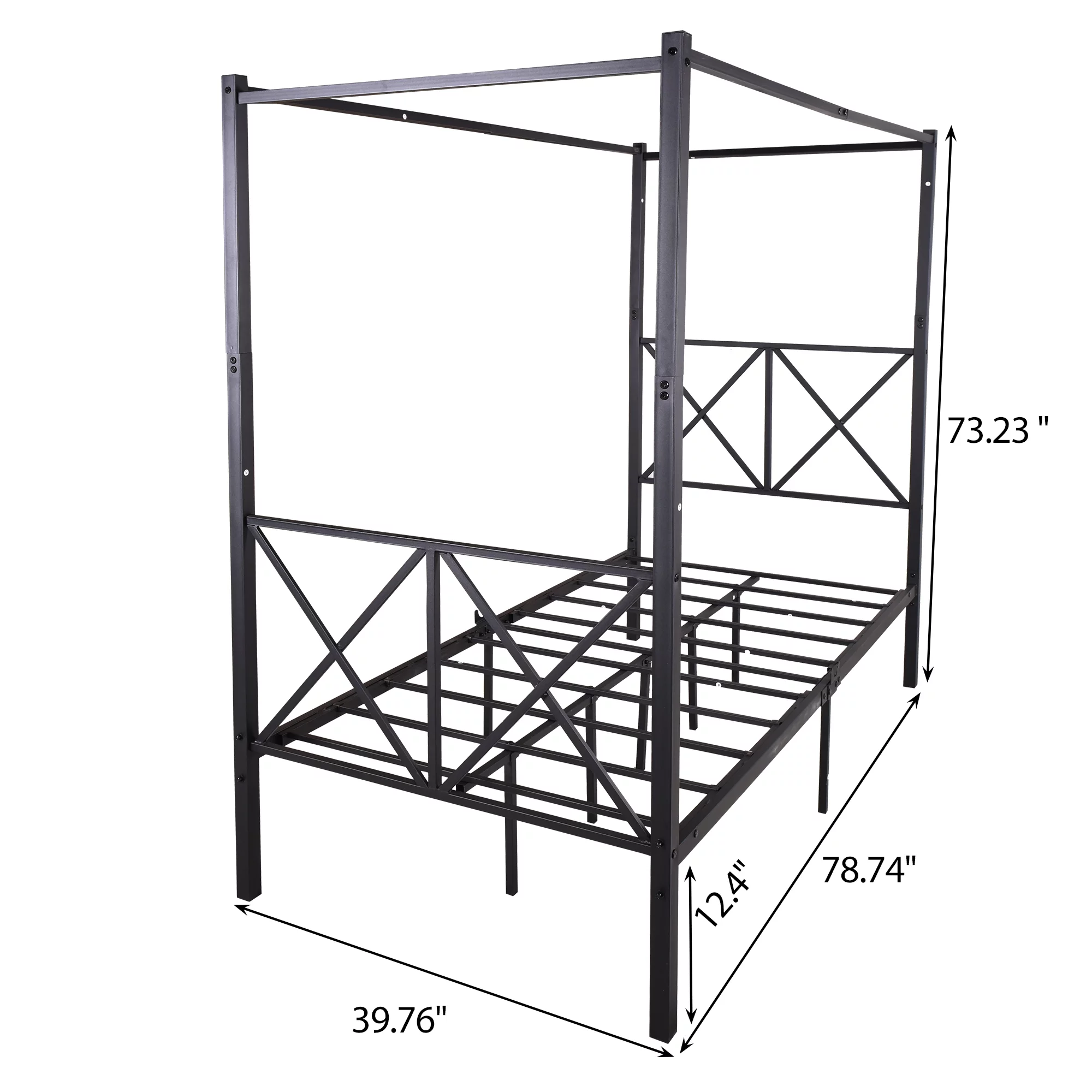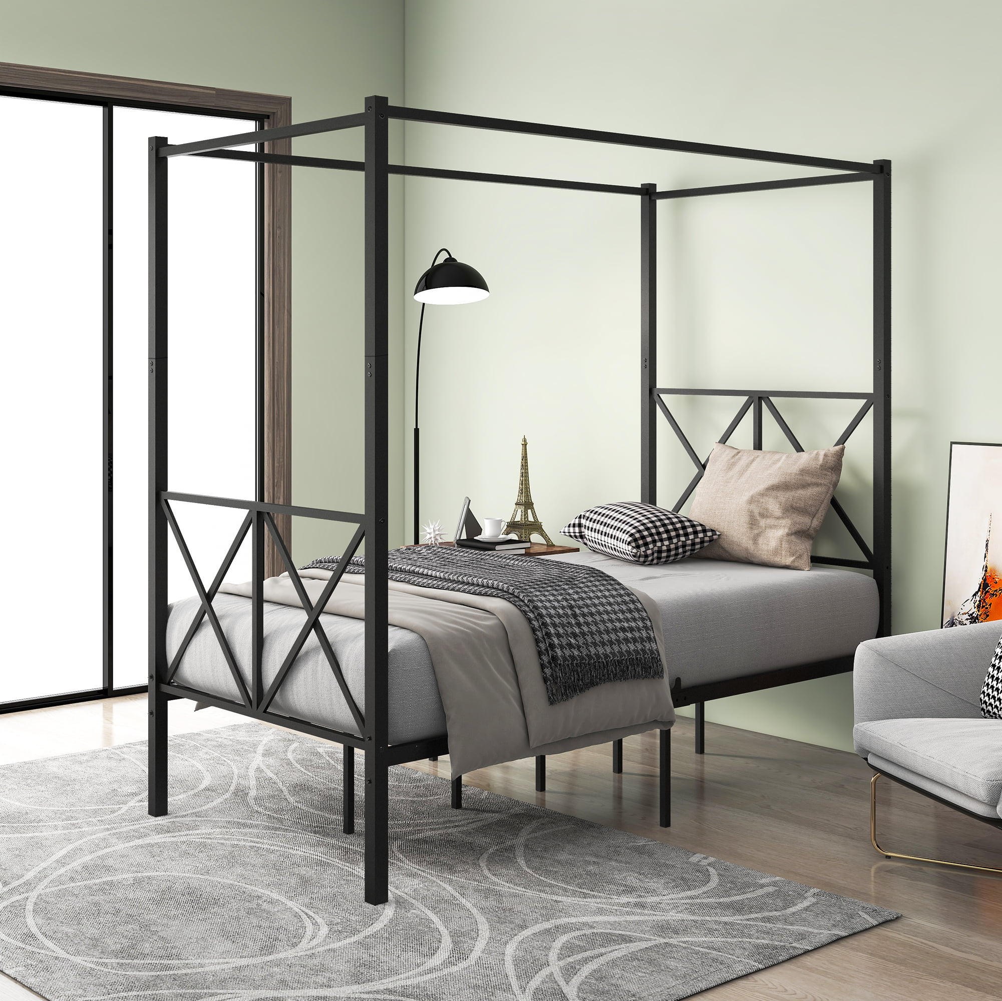 Twin Size Metal Canopy Bed Frame, Platform Bed Frame with X Shaped Frame Black