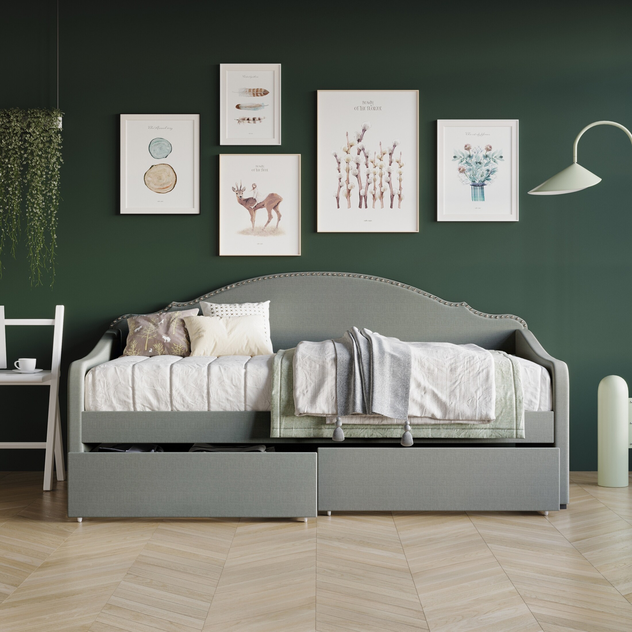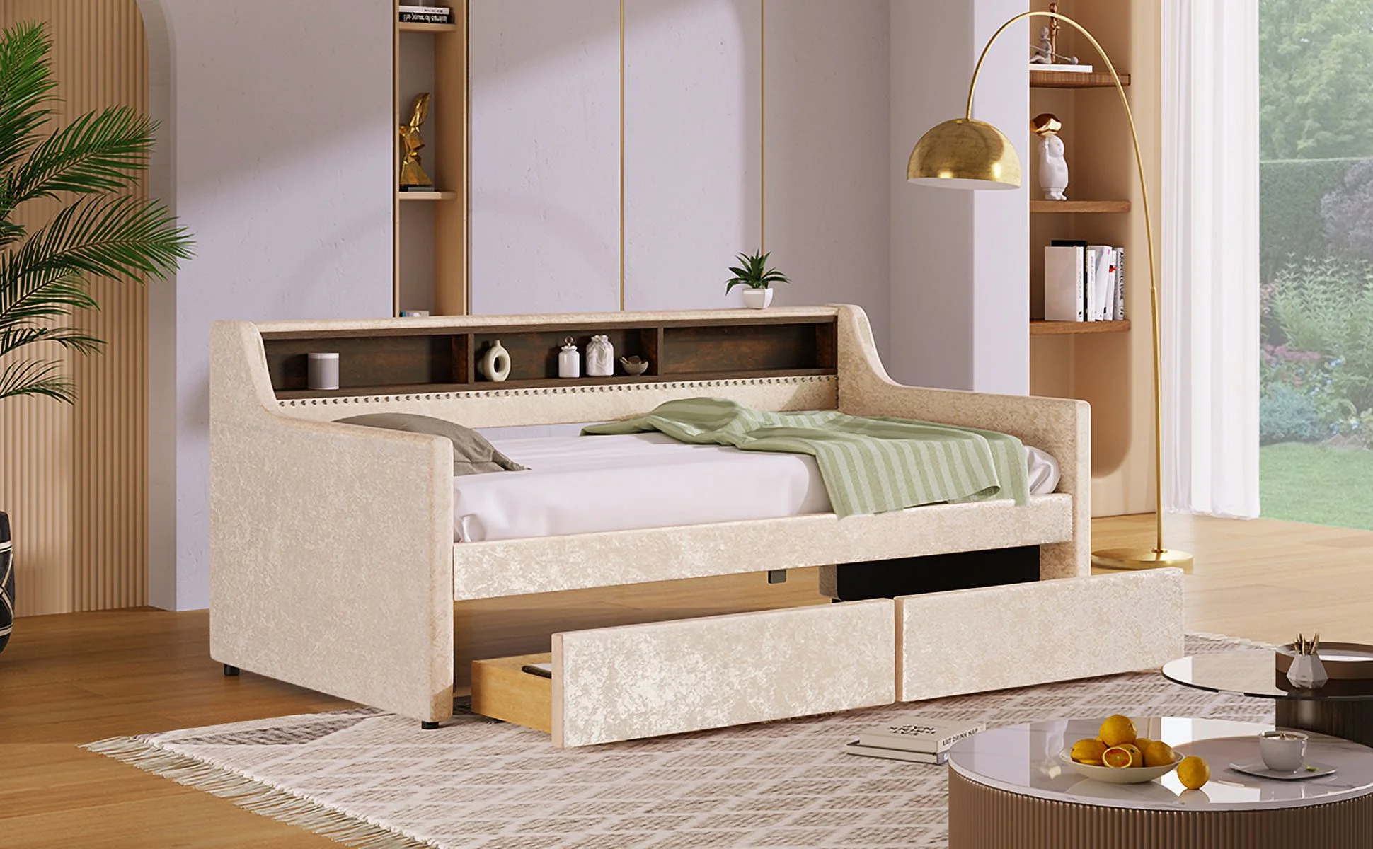 CoSoTower Twin Size Snowflake Velvet Daybed with Two Storage Drawers and Built-In Storage Shelves,Beige