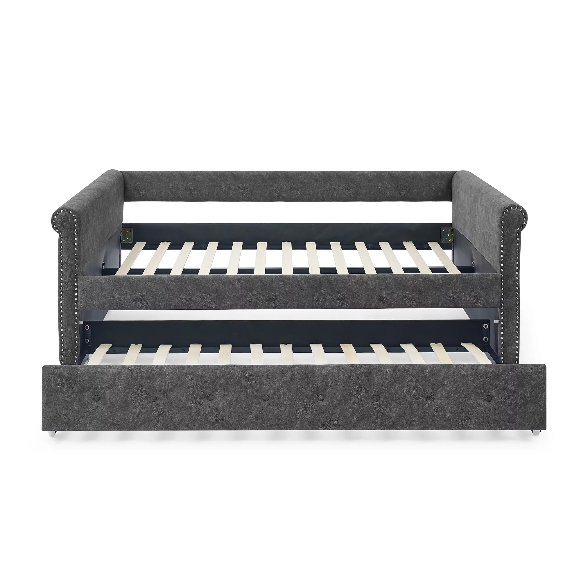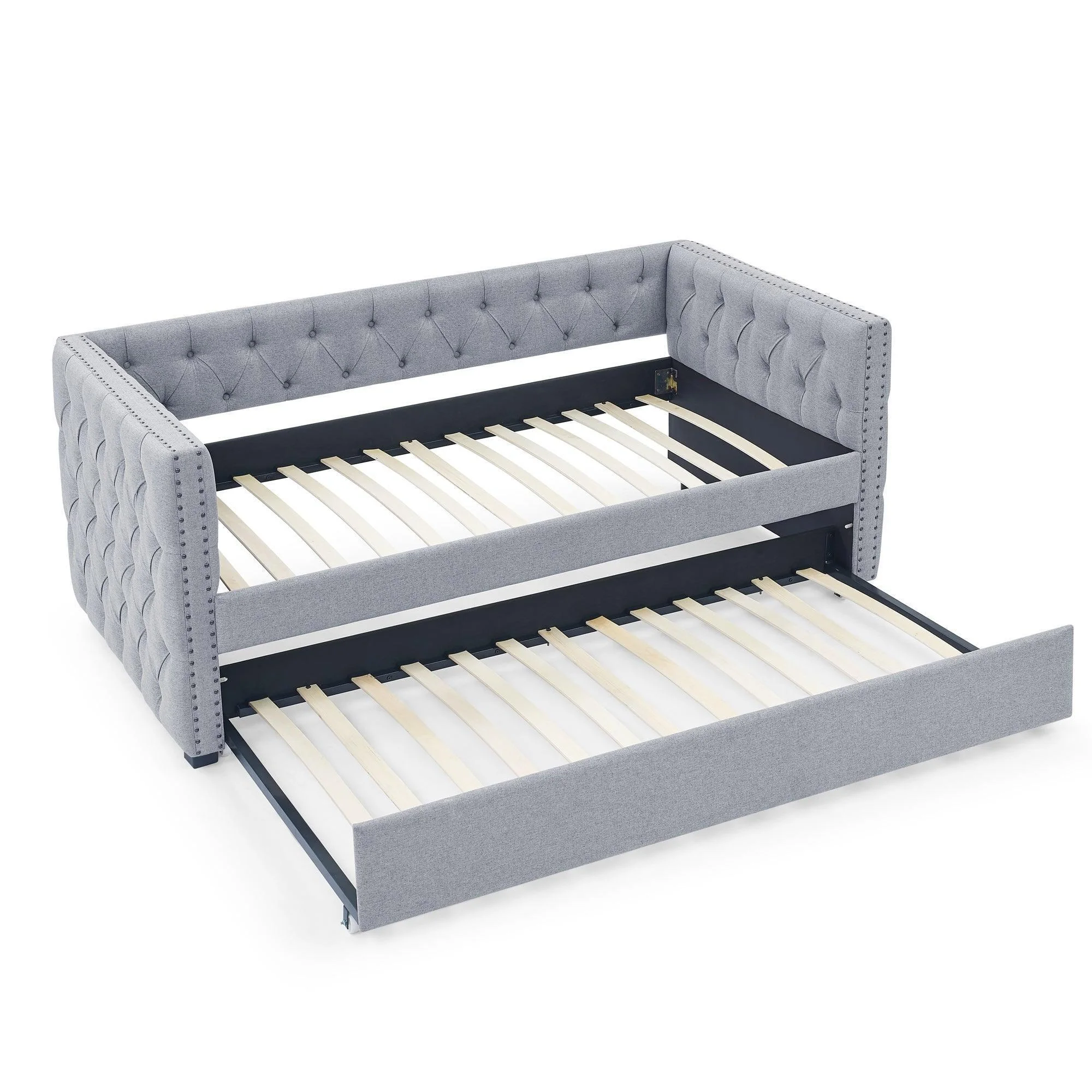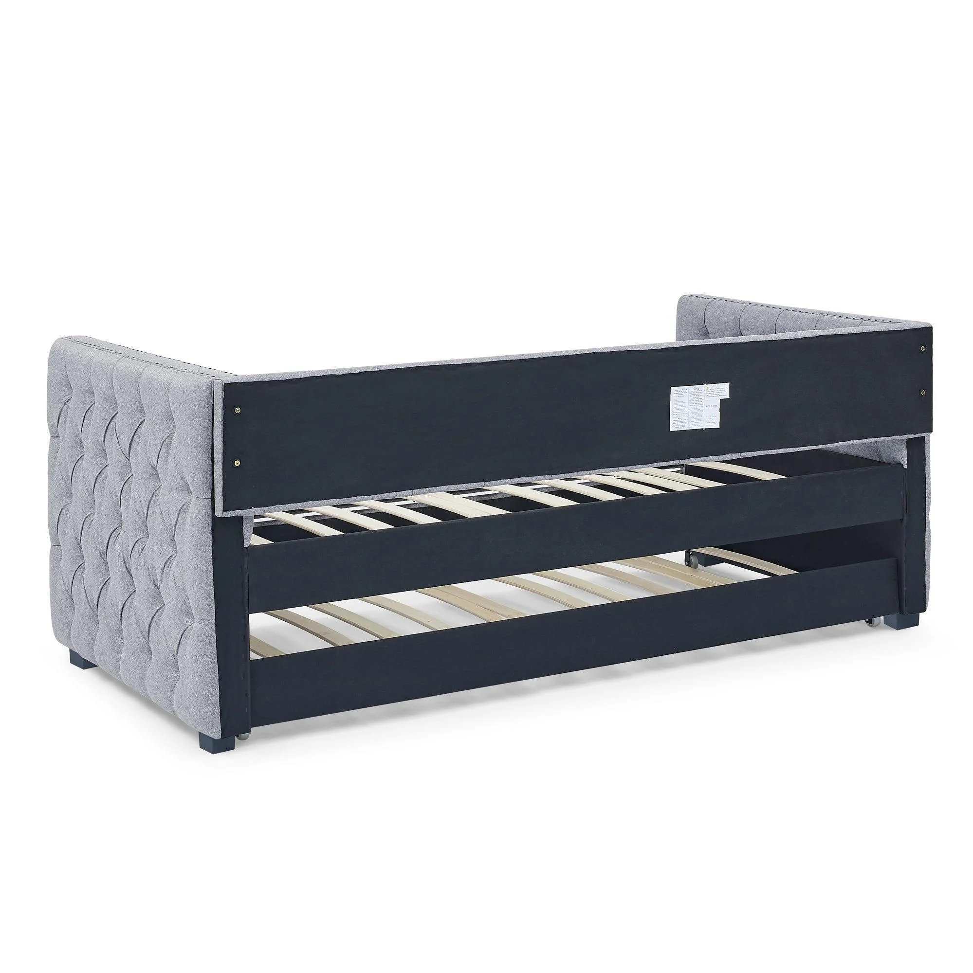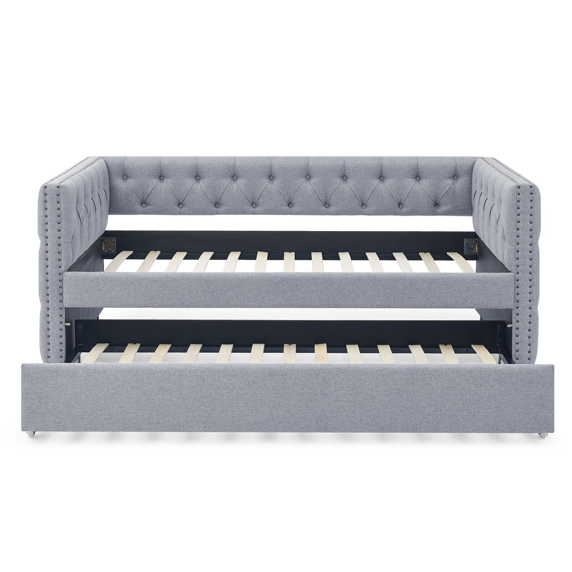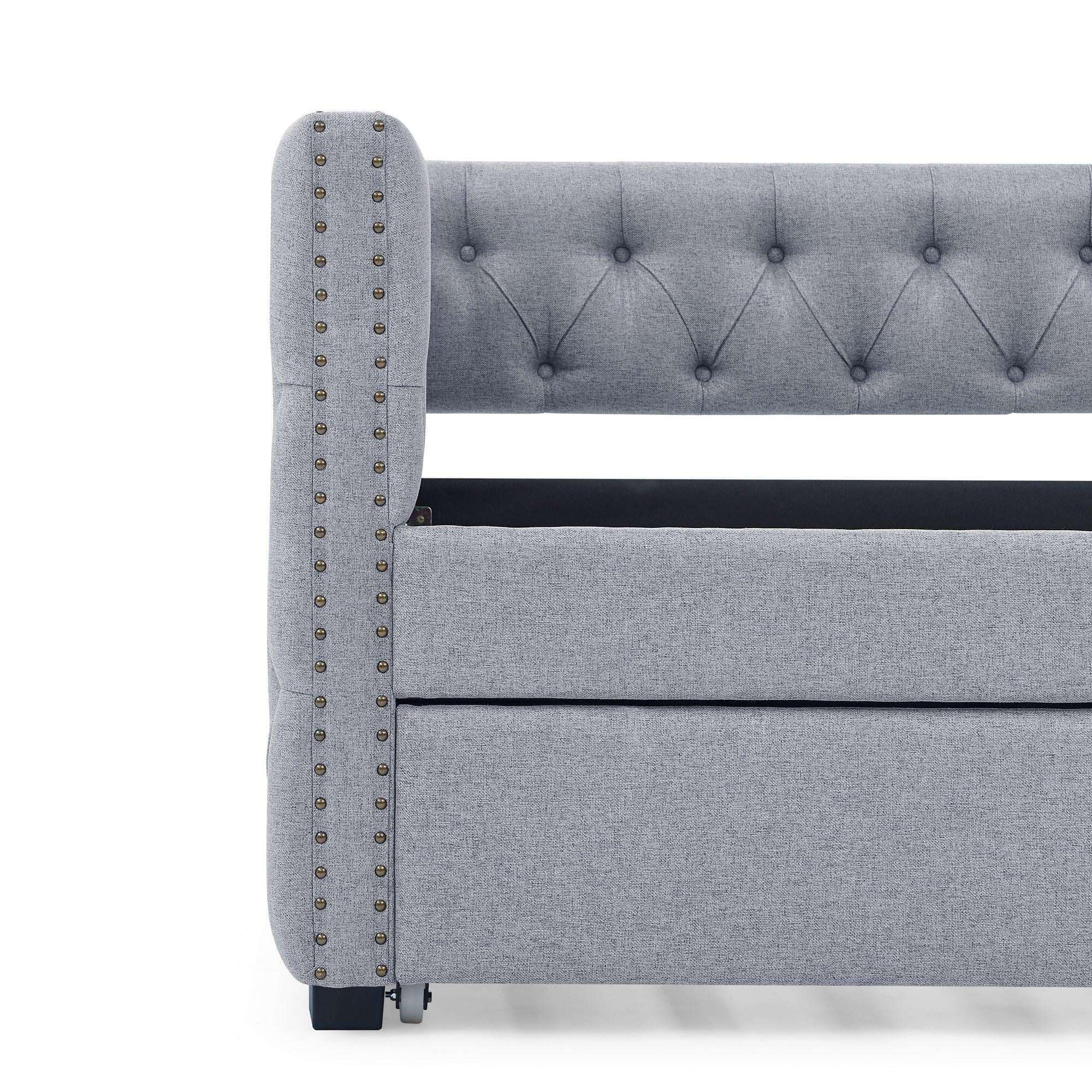 Upholstered Twin Size Daybed with Two Drawers, with Button and Copper Nail on Square Arms, Grey (82.75''x43''x30.75'')