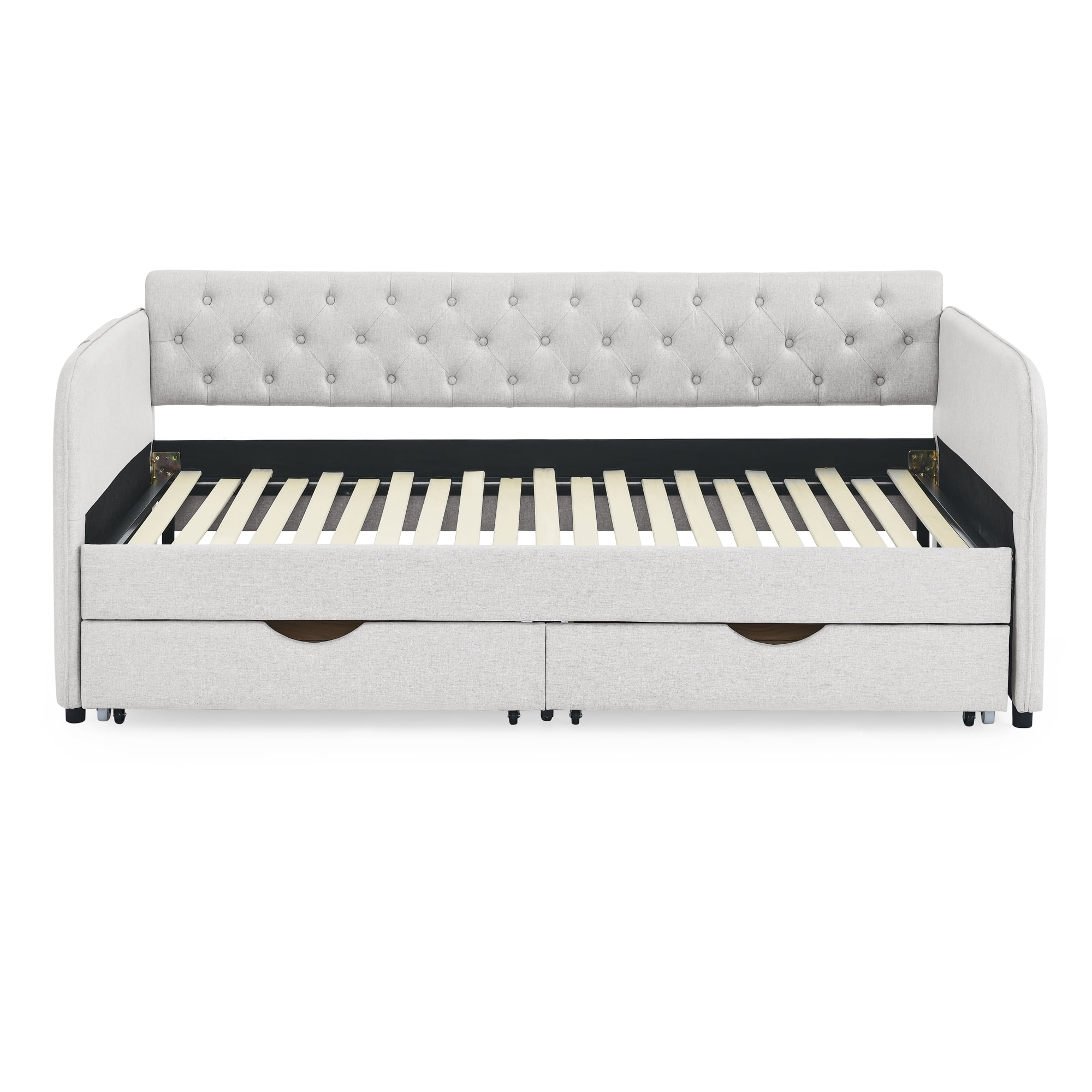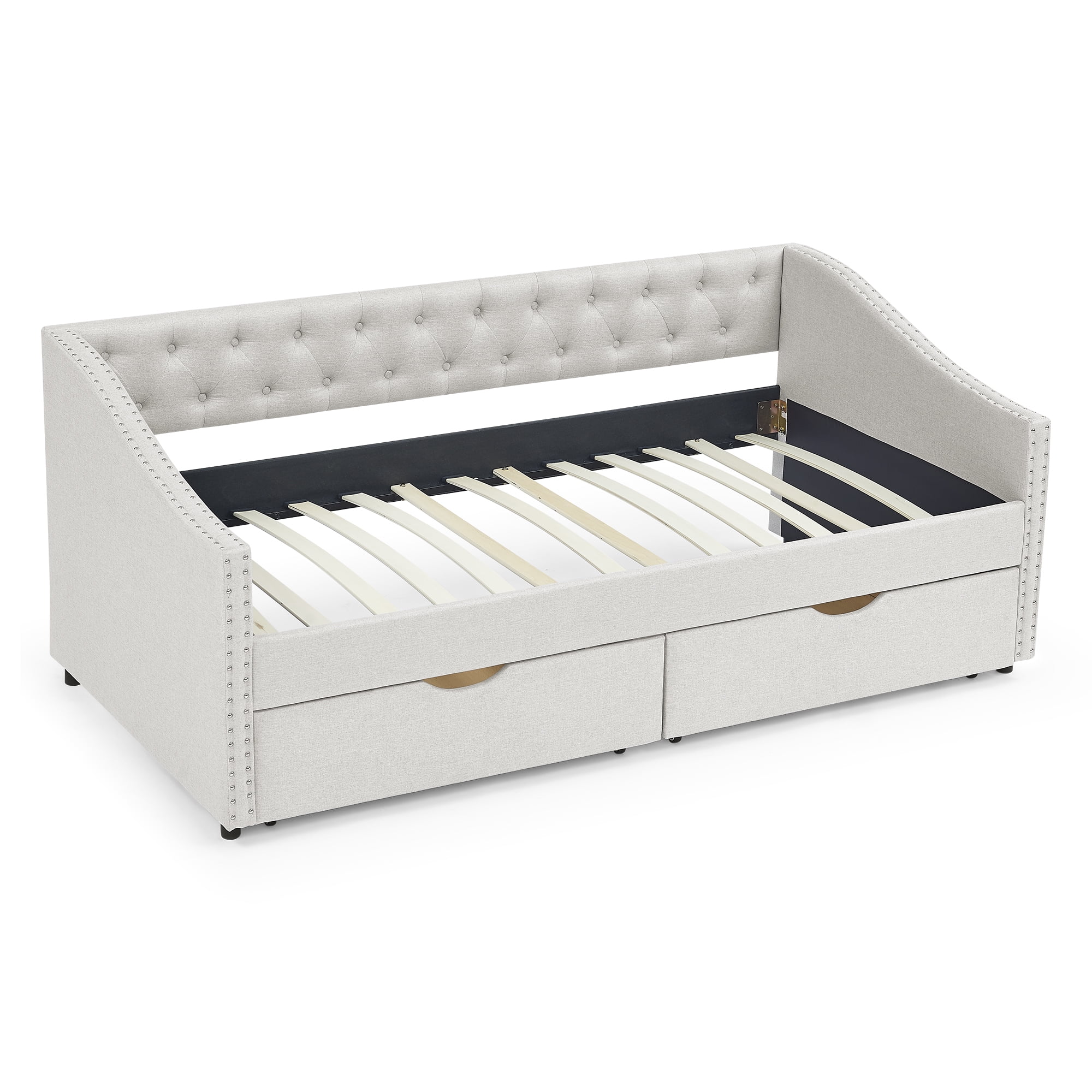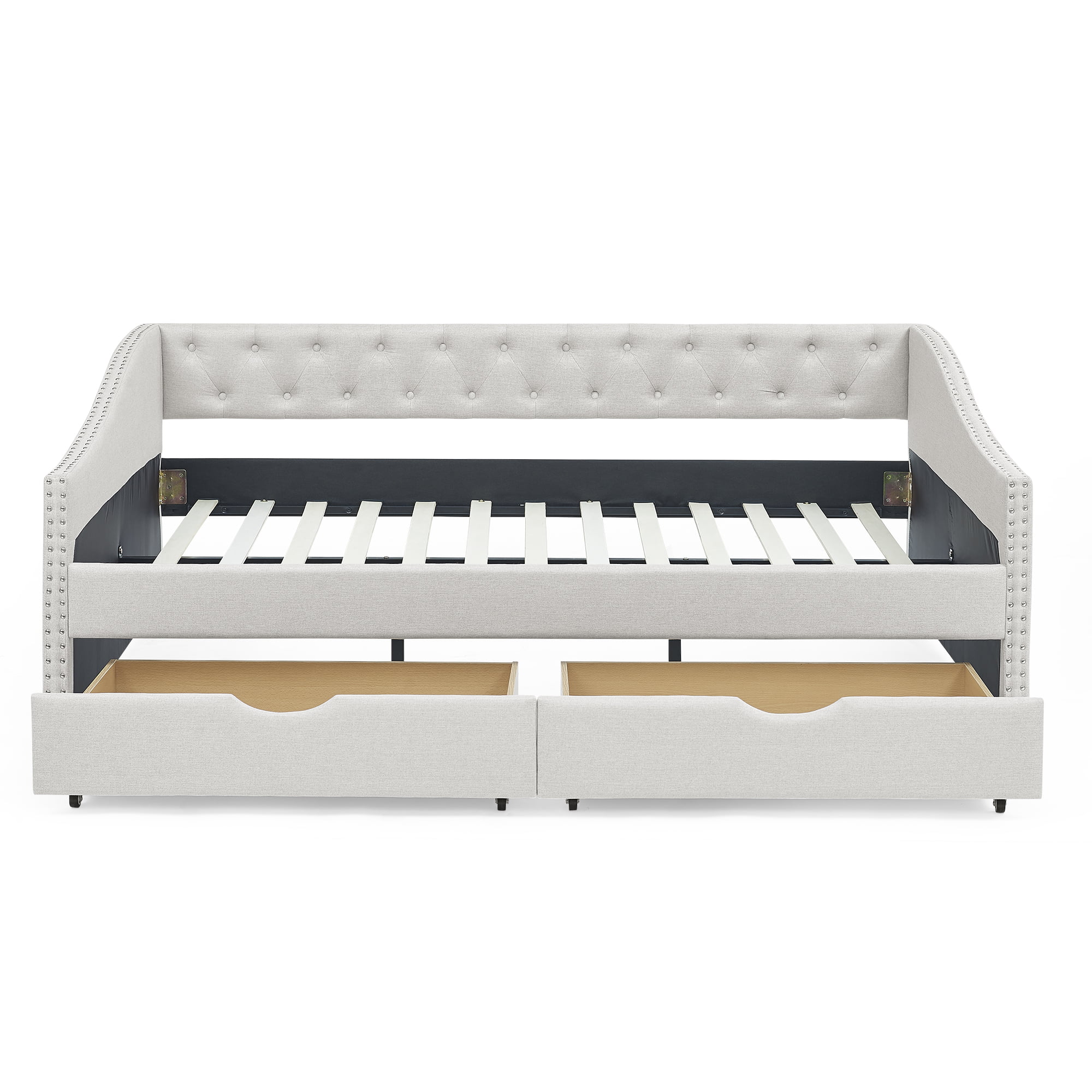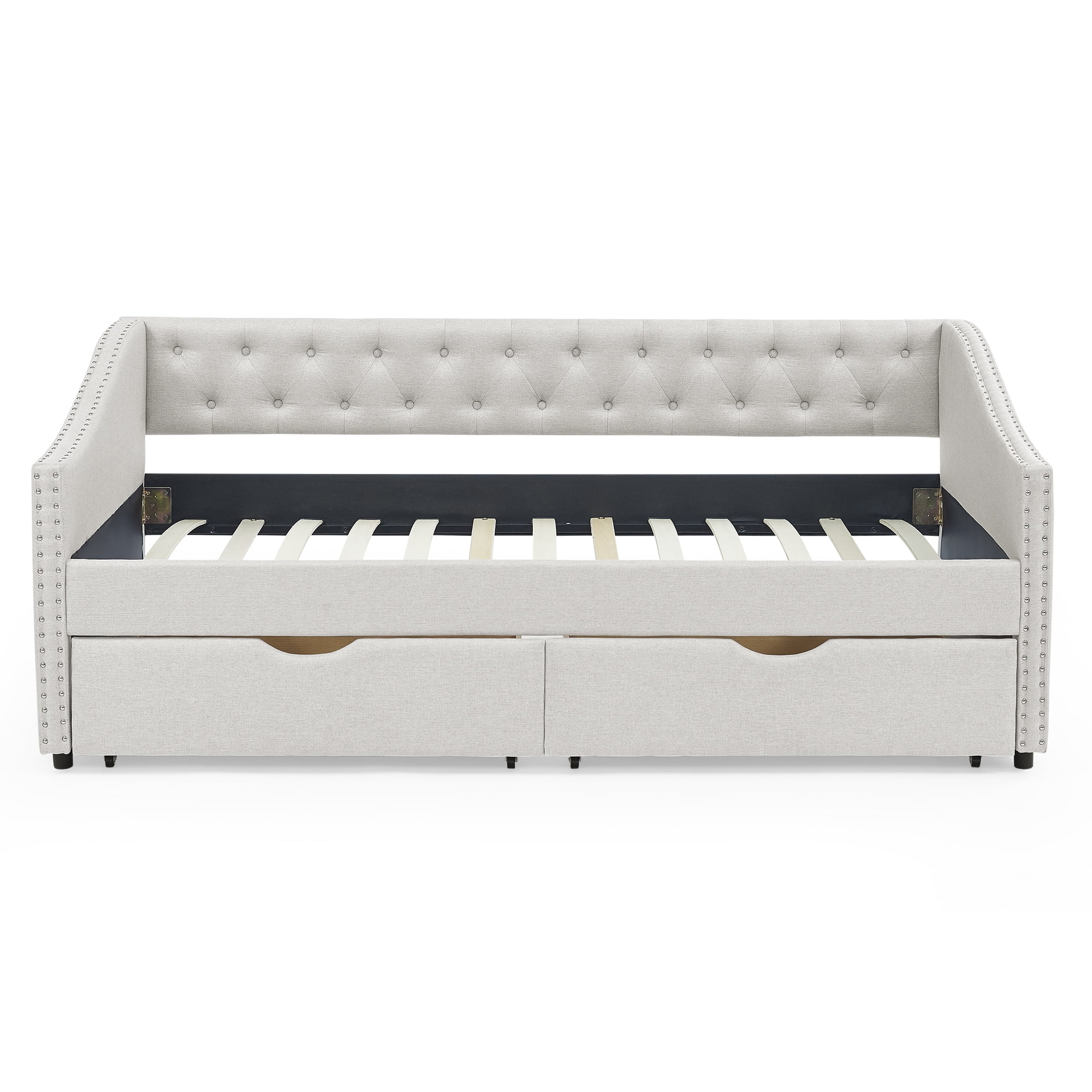 Upholstered Twin Size Daybed with Two Drawers, with Button and Copper Nail on Square Arms, Beige (82.75''x43''x30.75'')