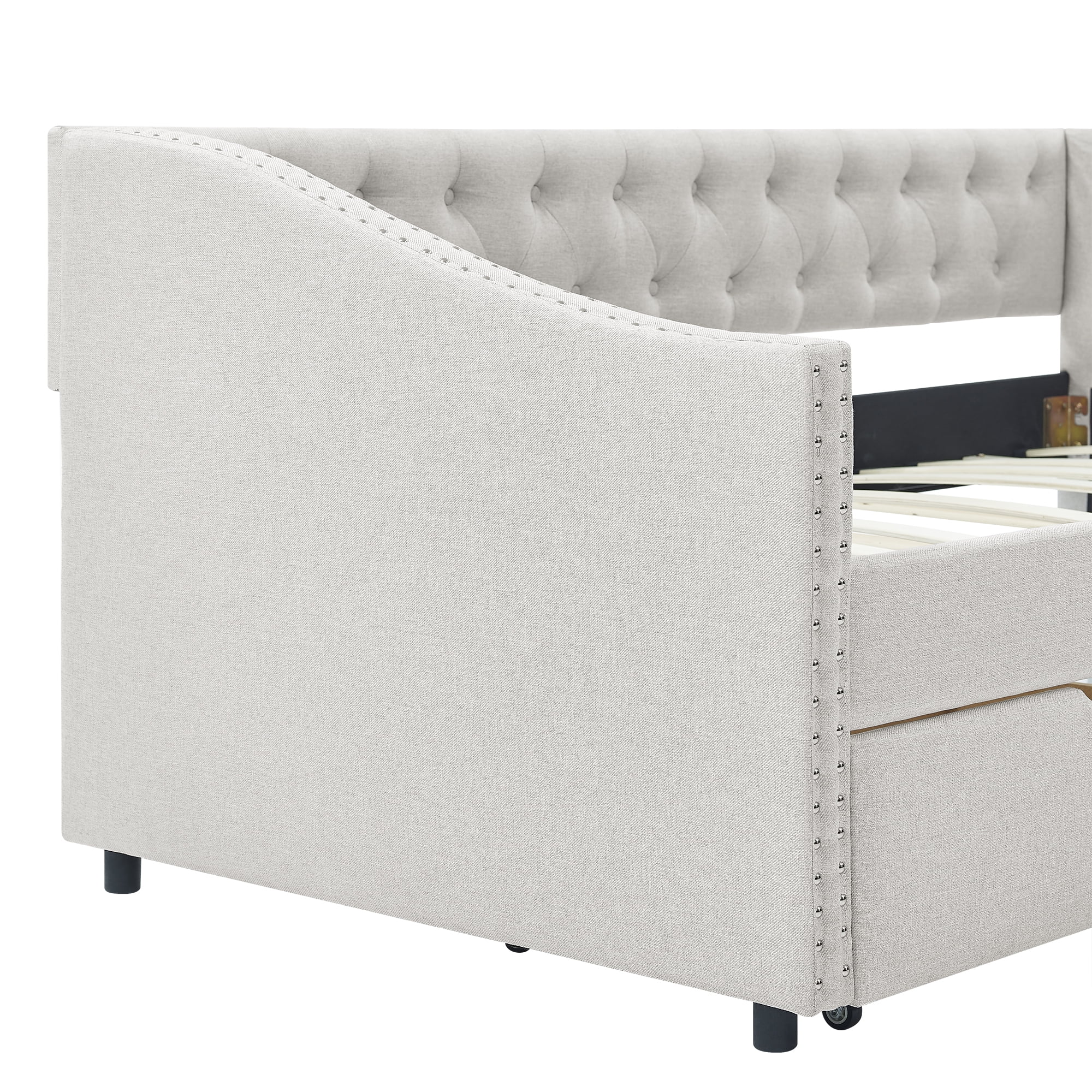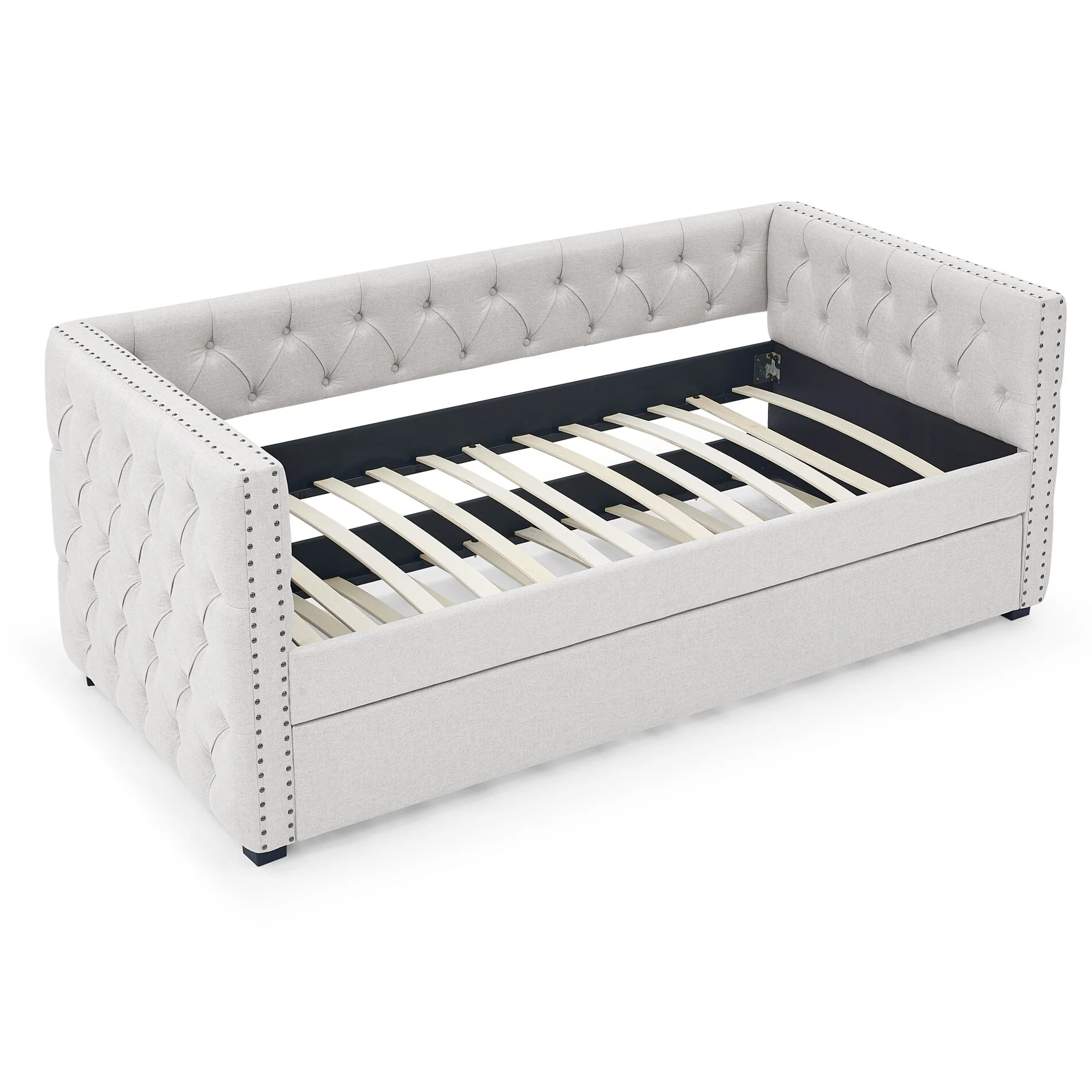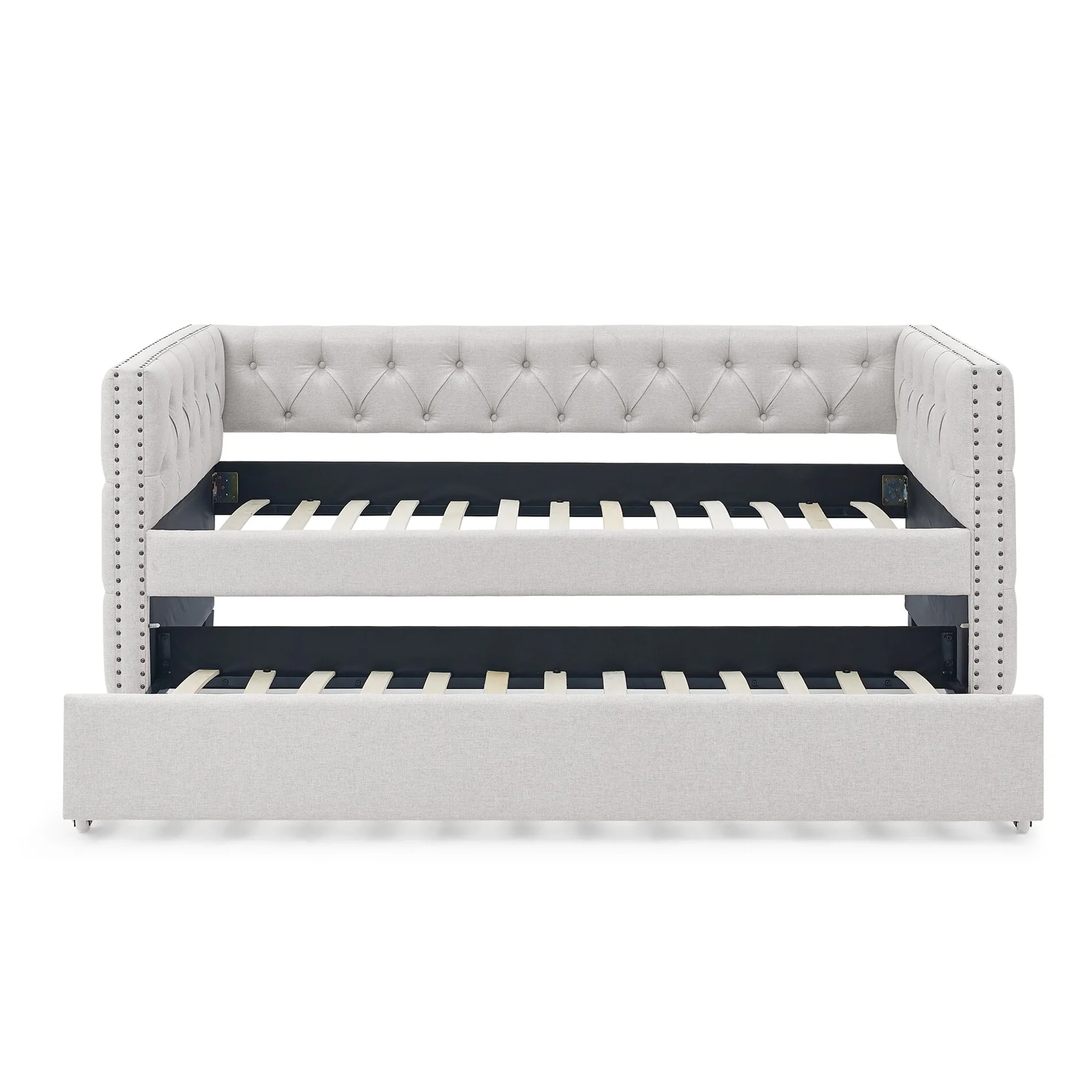Upholstered Twin Size Daybed with Two Drawers, with Button and Copper Nail on Square Arms, Beige (82.75''x43''x30.75'')