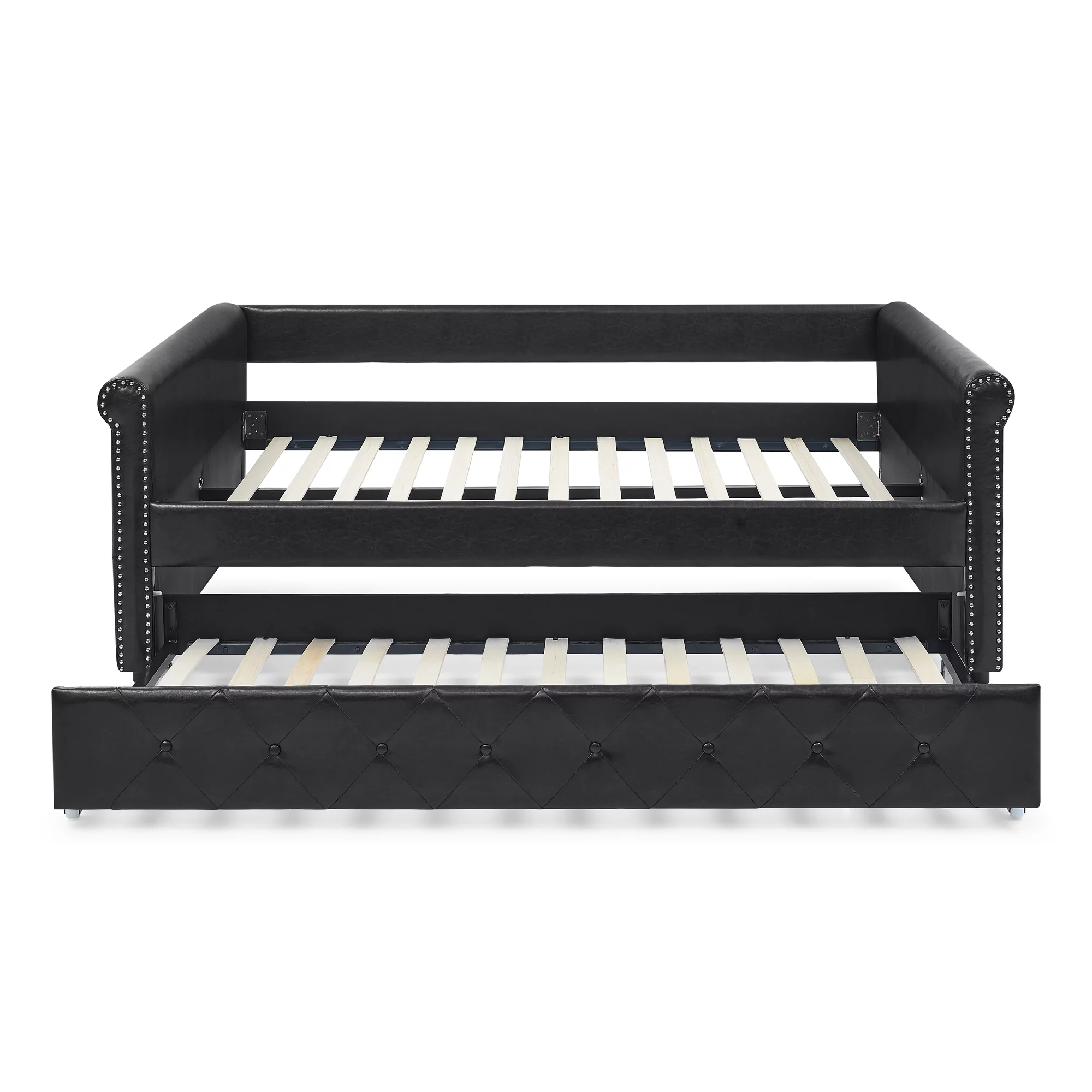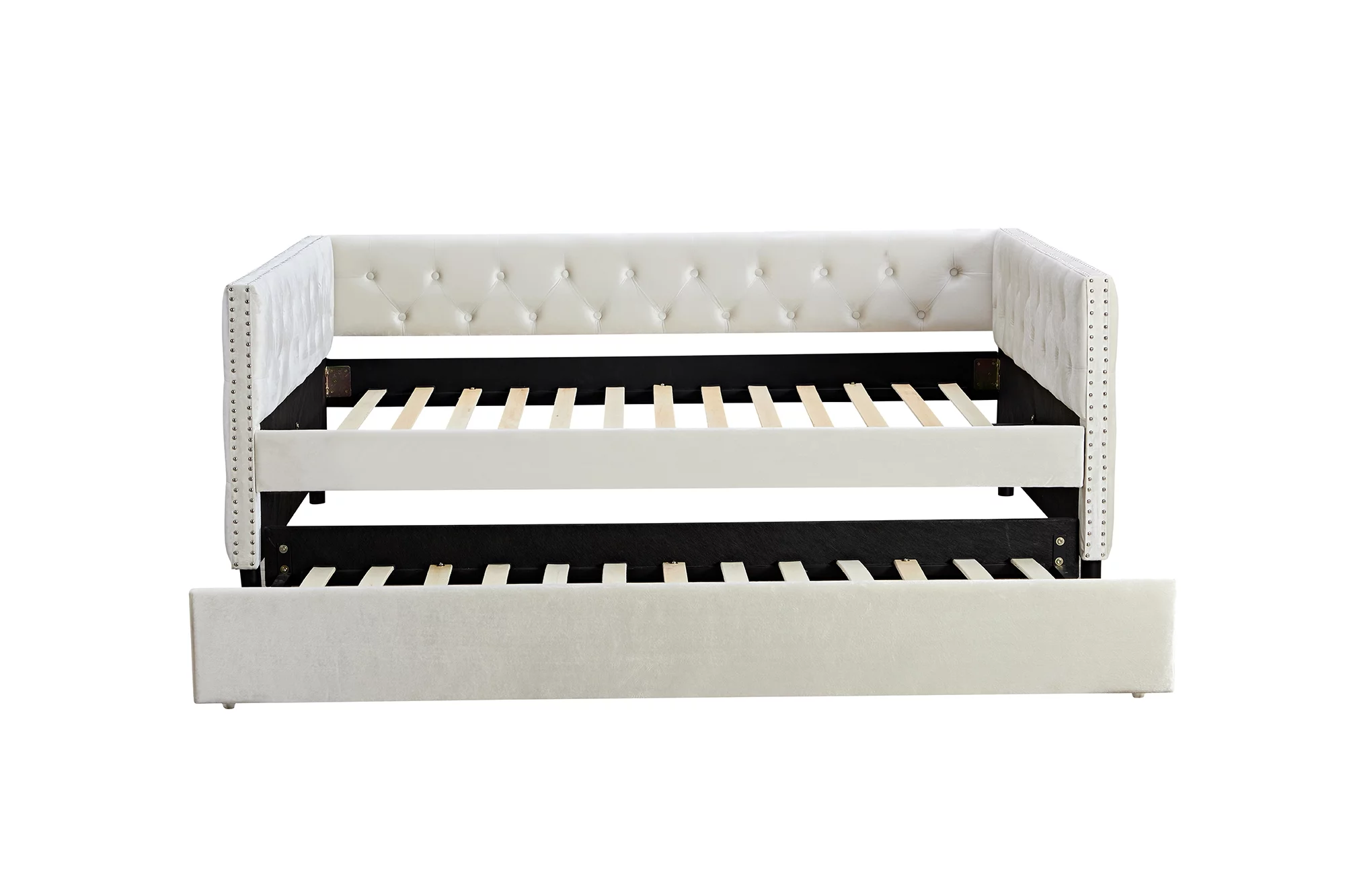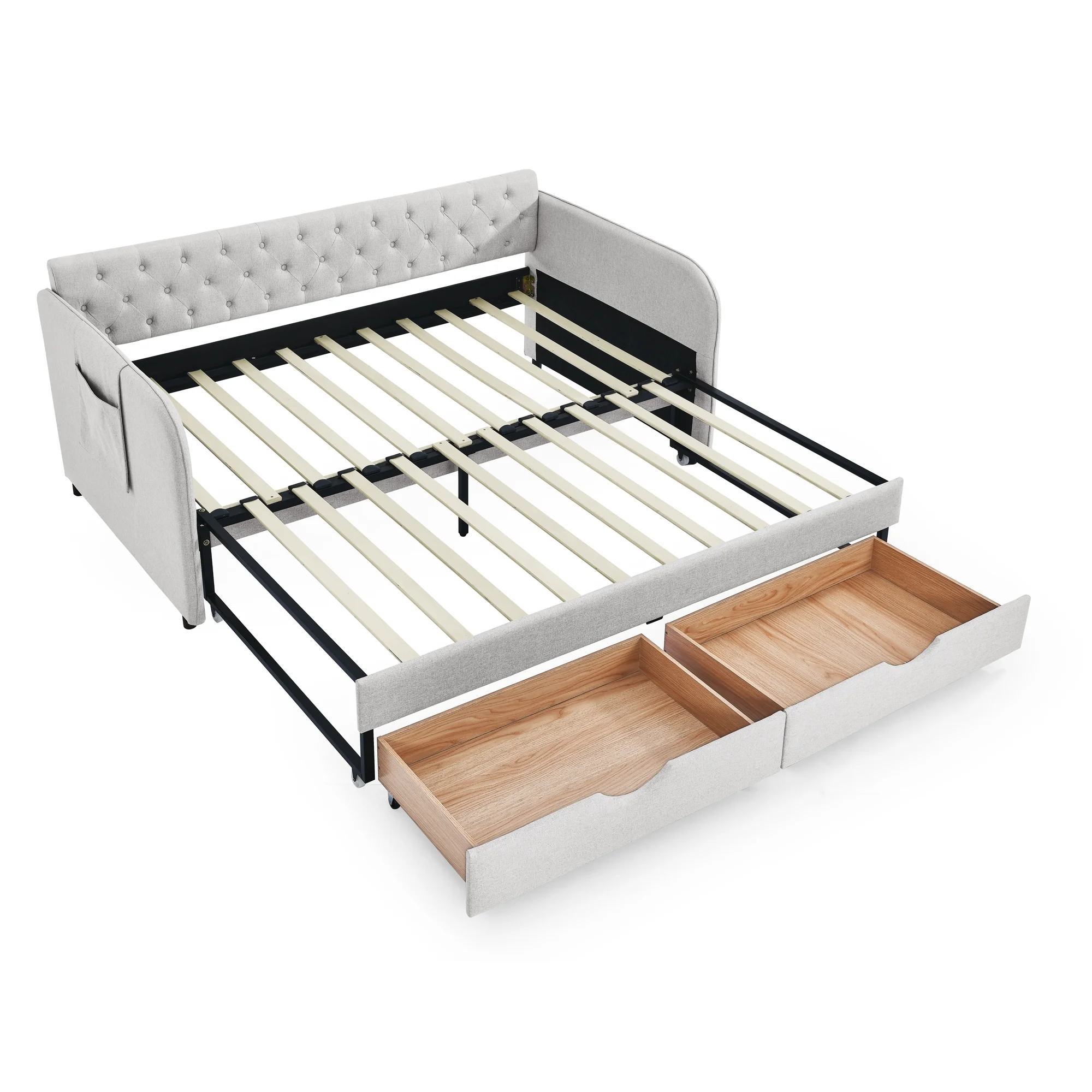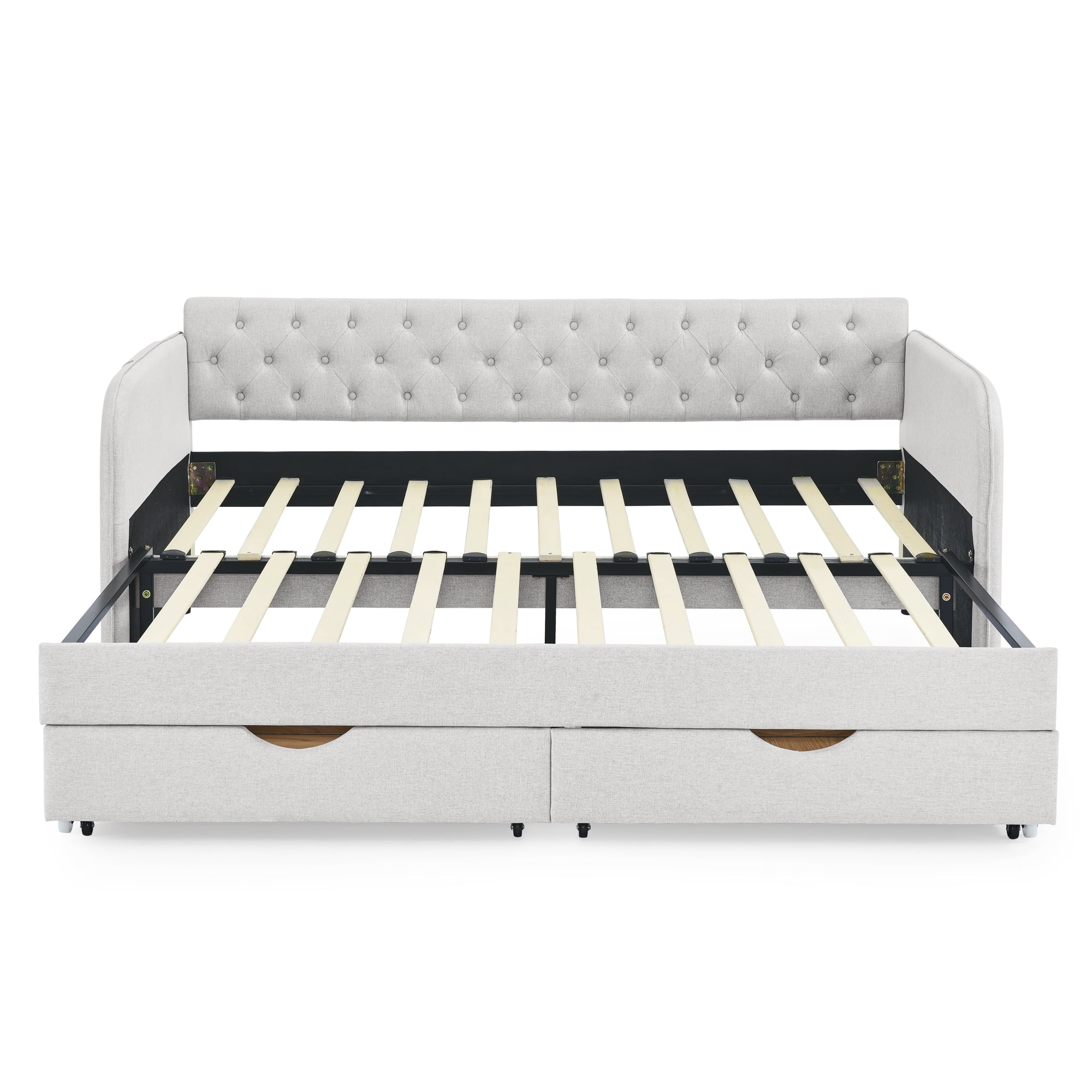 Upholstered Twin Size Daybed with Two Drawers, with Button and Copper Nail on Square Arms, Beige (82.75''x43''x30.75'')