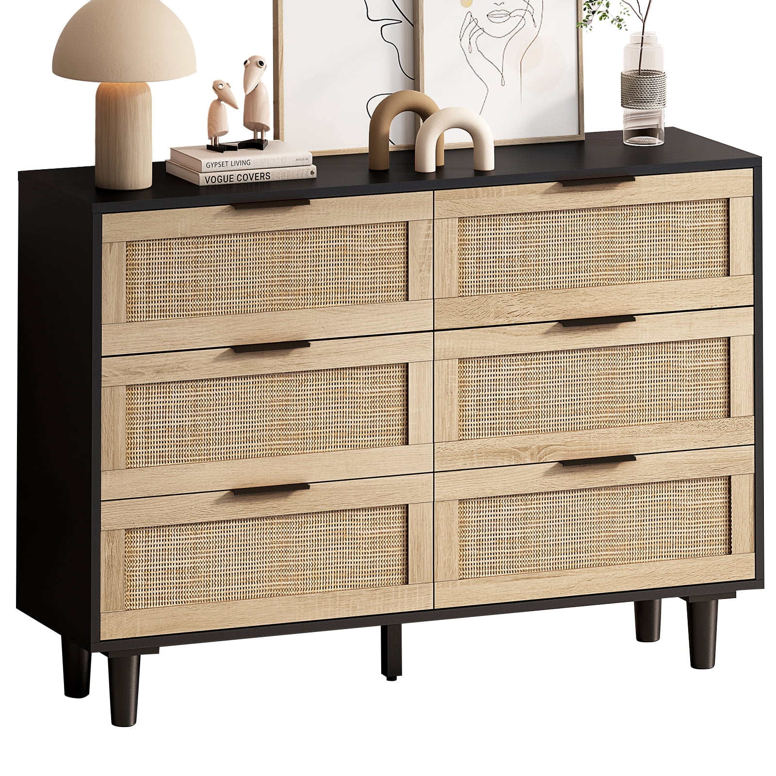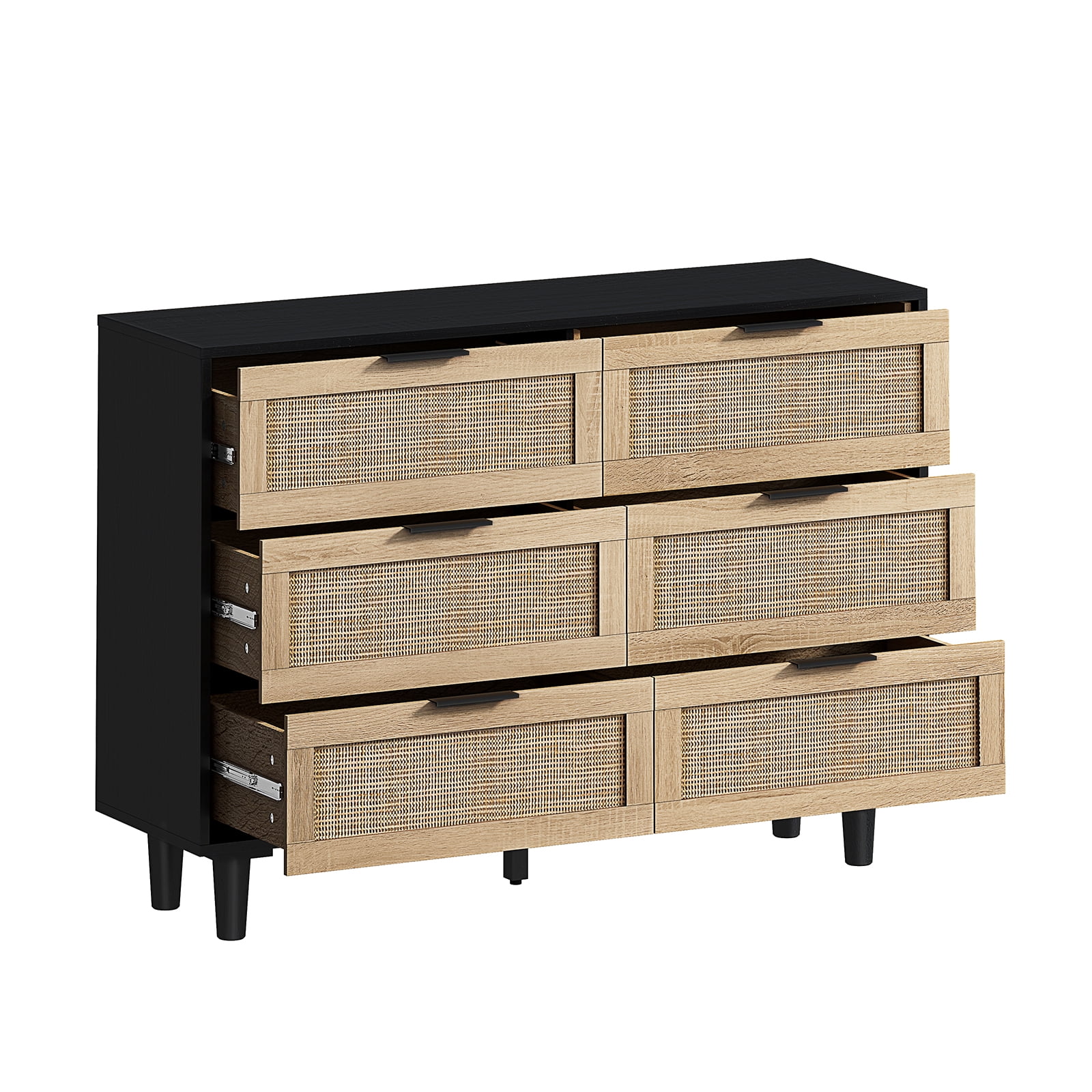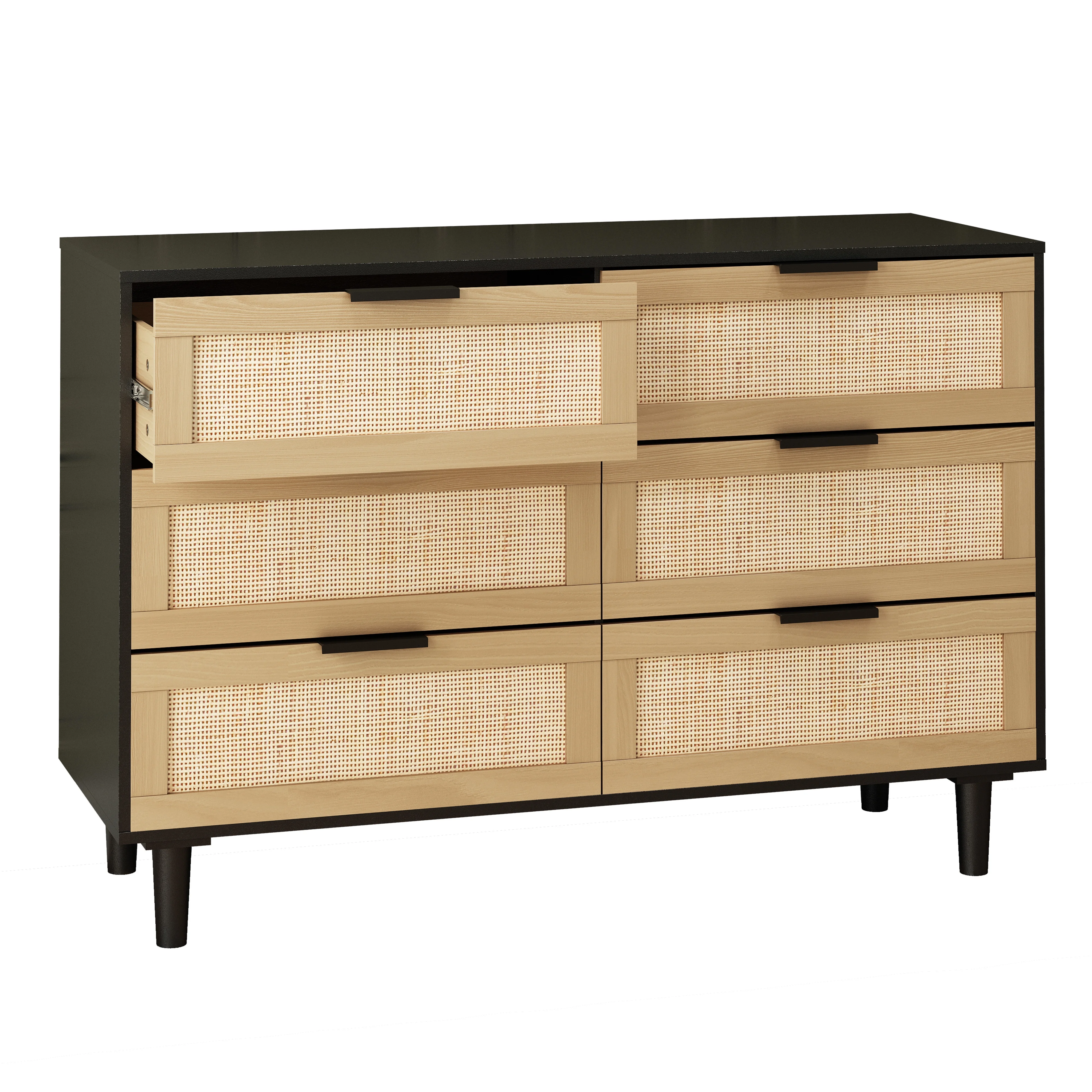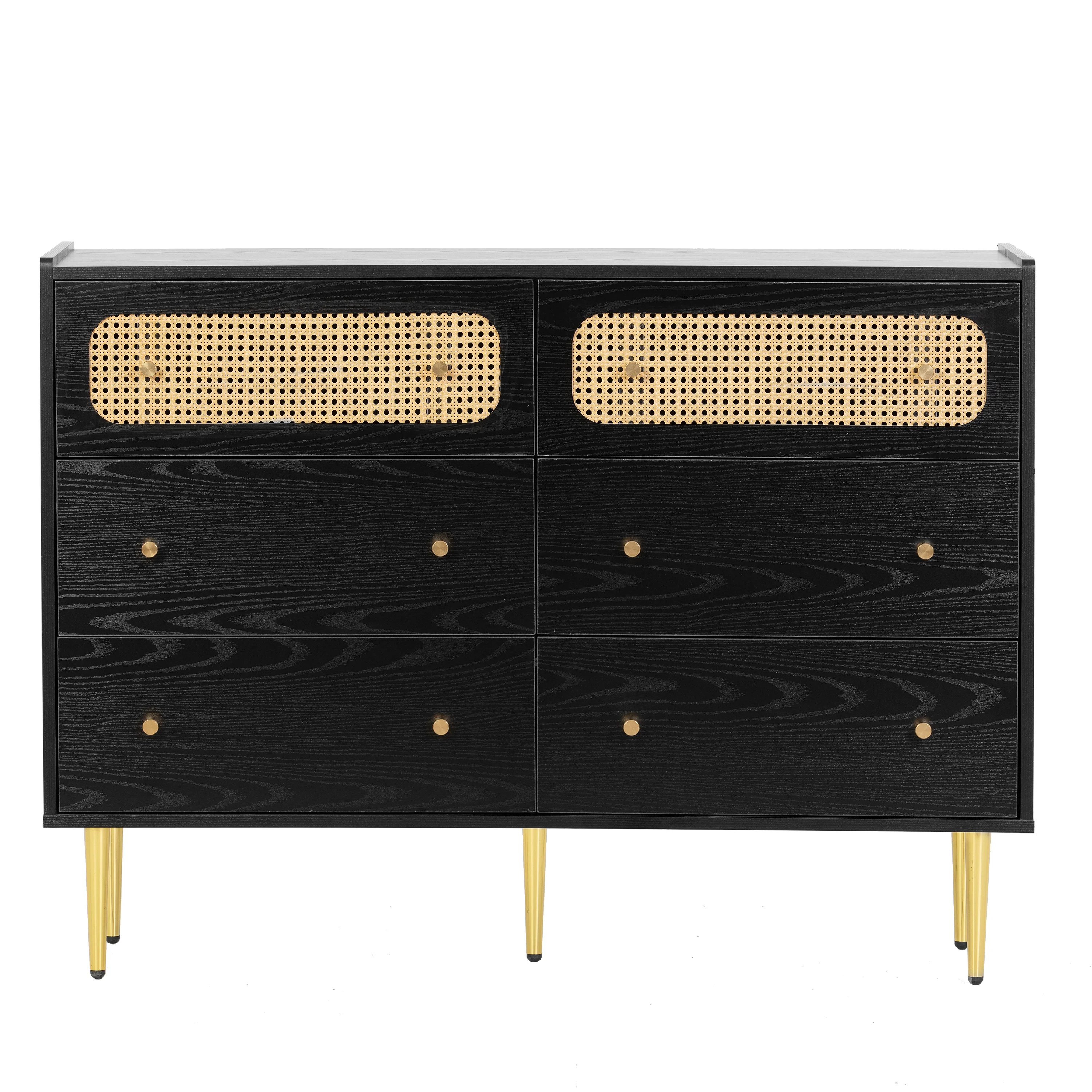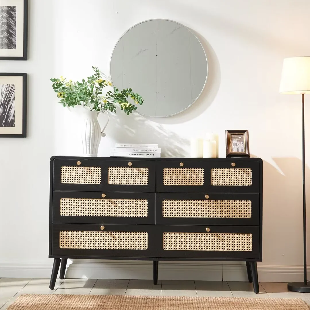 Glavbiku Modern 6 Drawers Rattan Dresser Table with Metal Handles Cabinet for Bedroom,Black,Adult