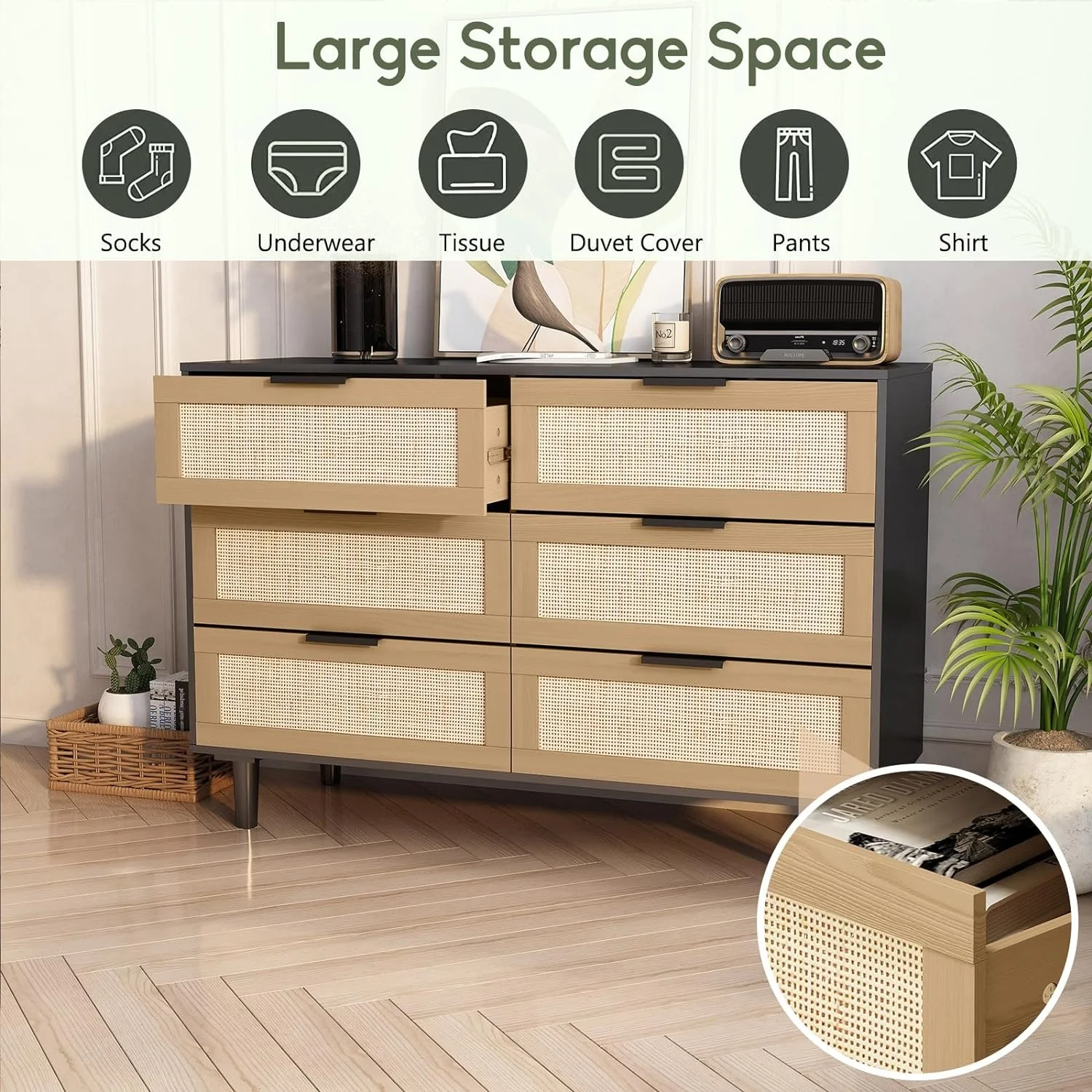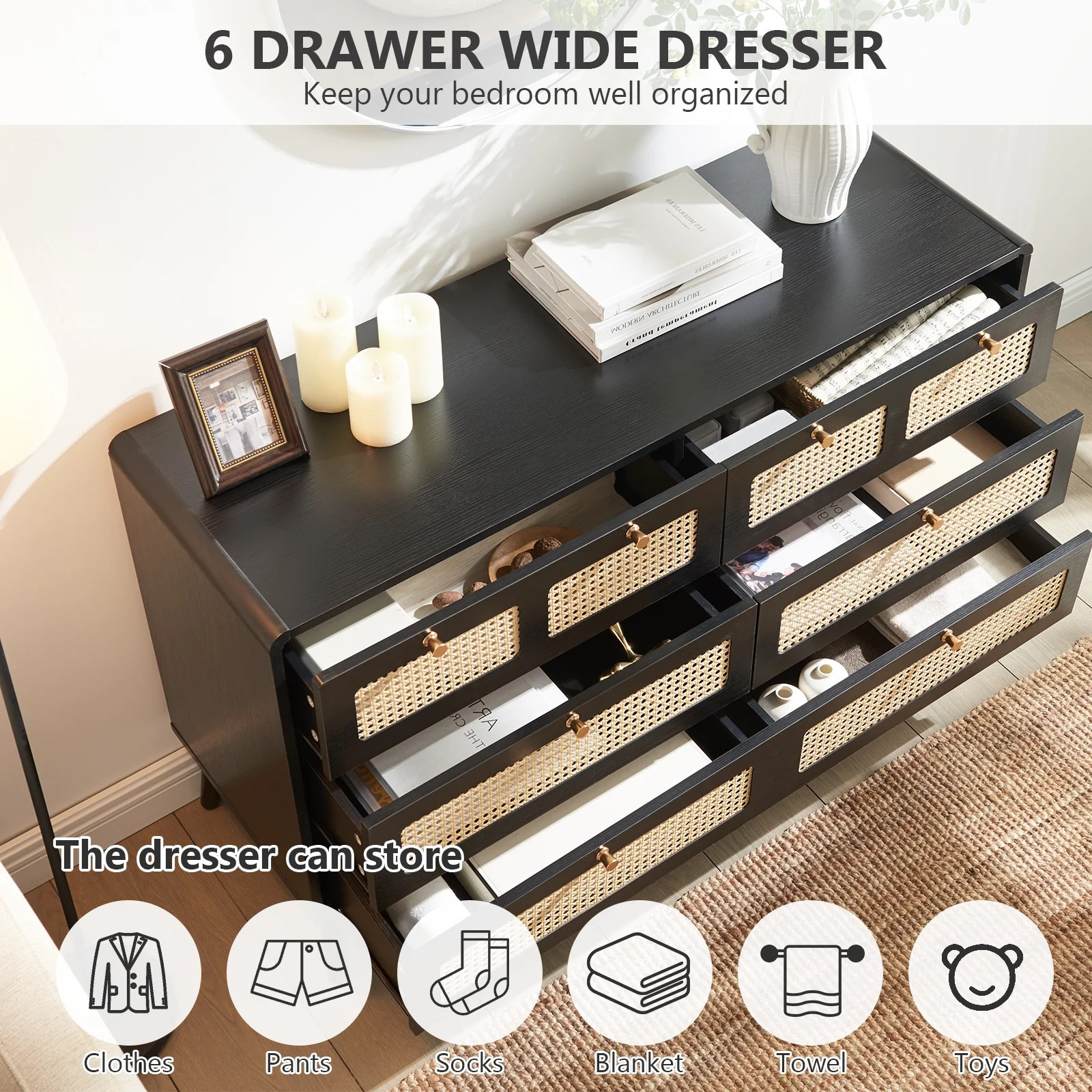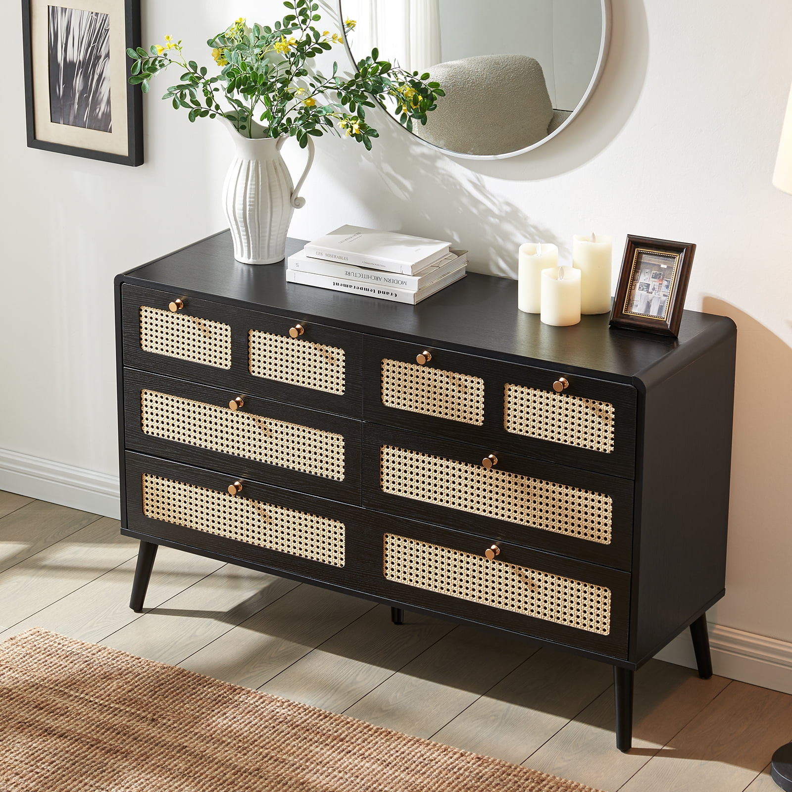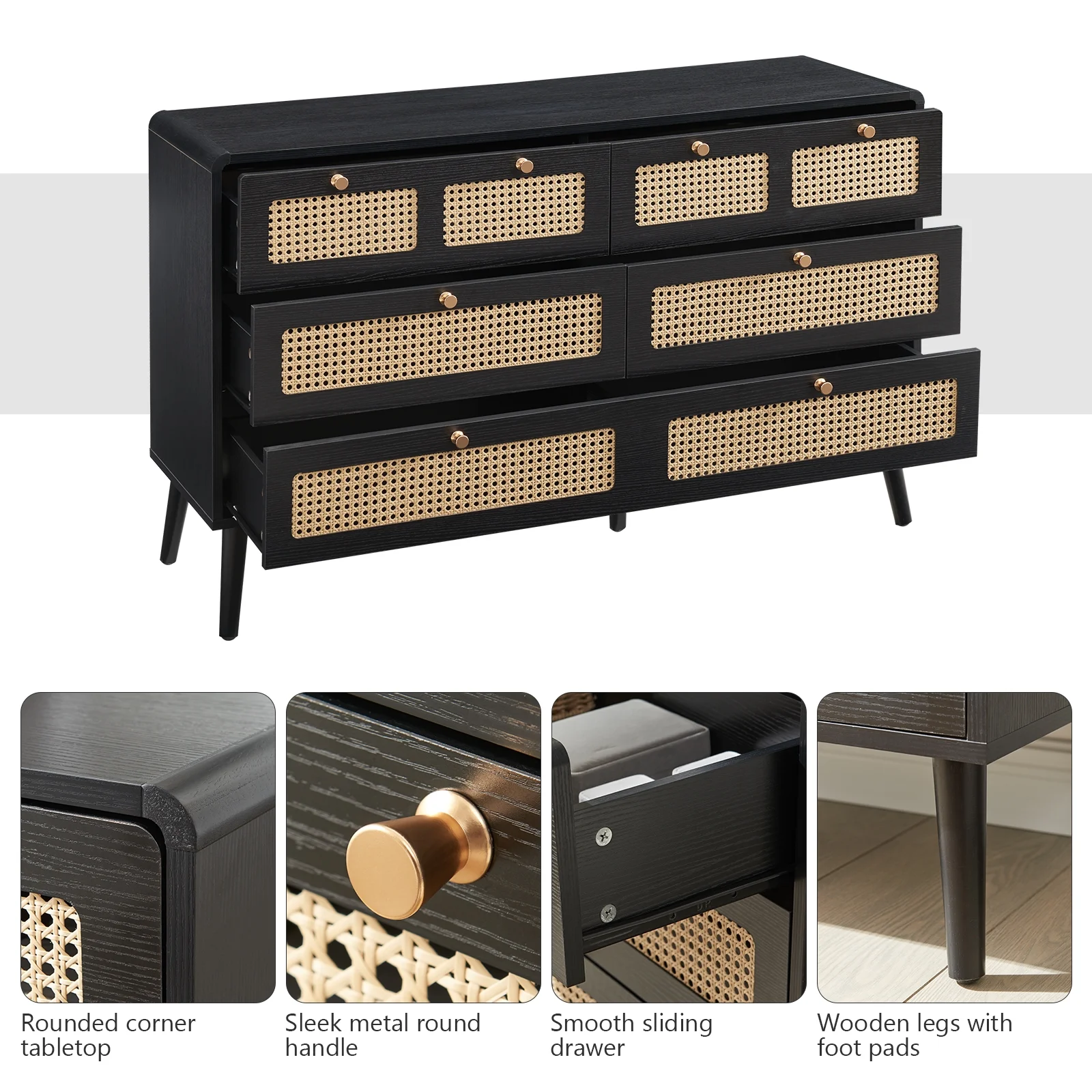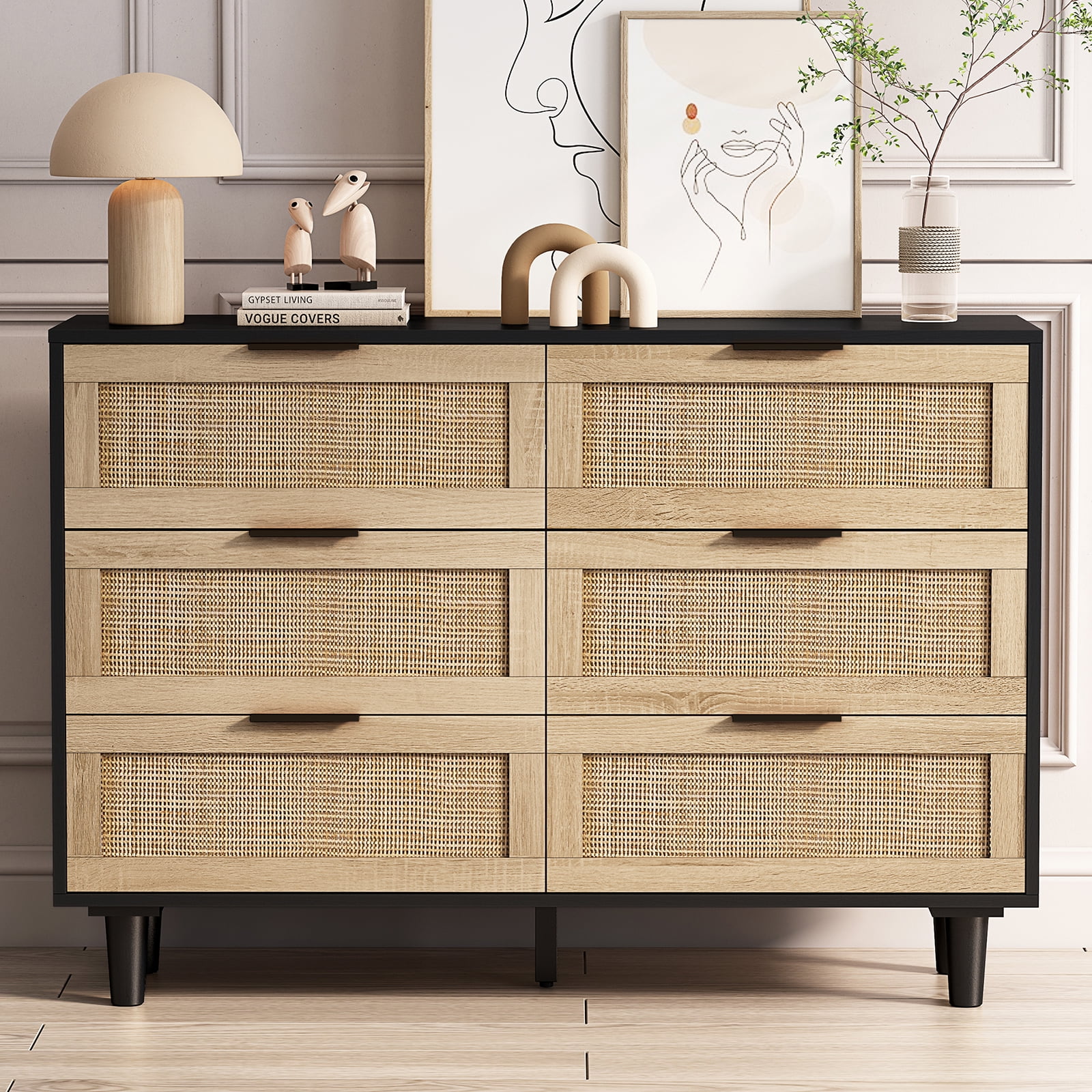 Glavbiku Modern 6 Drawers Rattan Dresser Table with Metal Handles Cabinet for Bedroom,Black,Adult