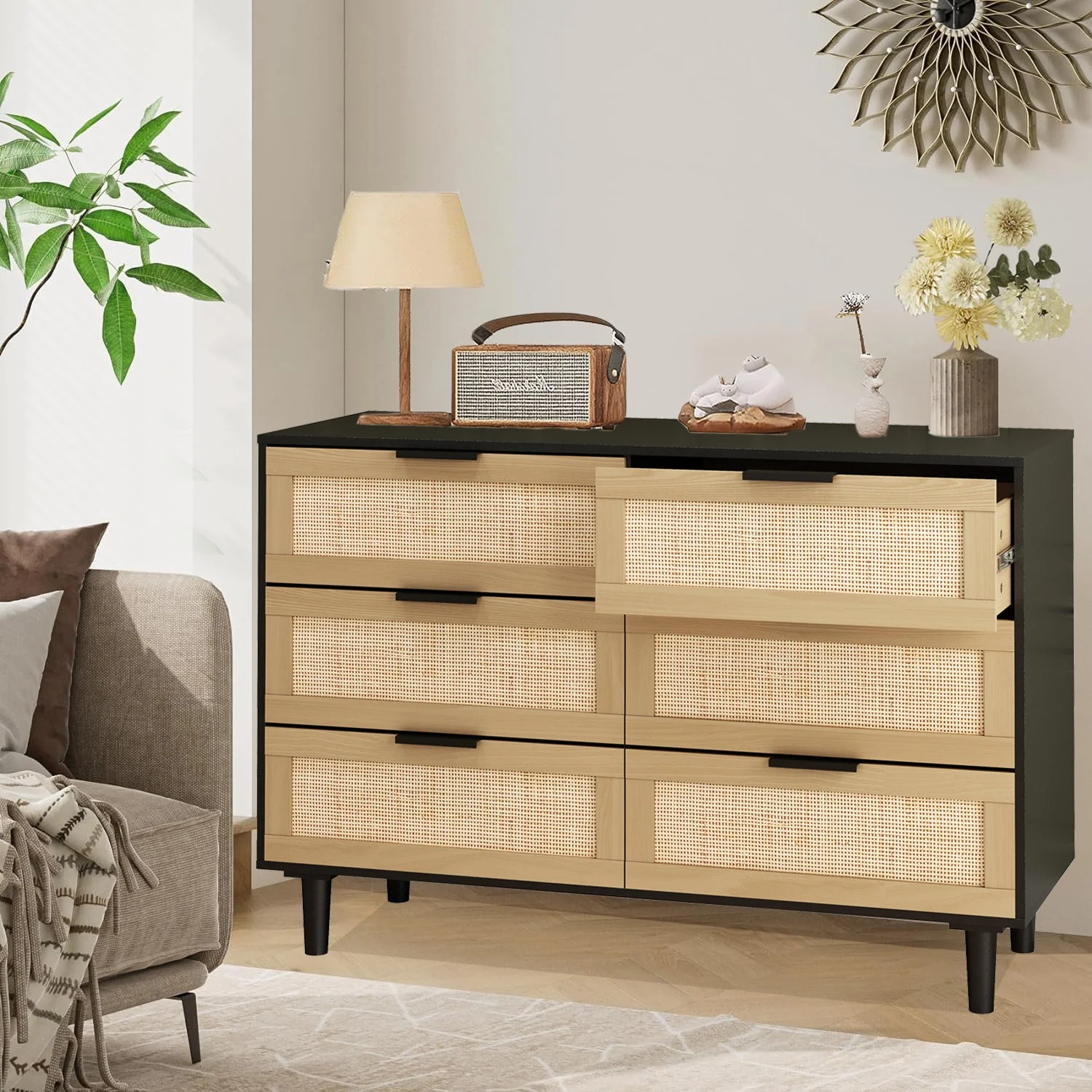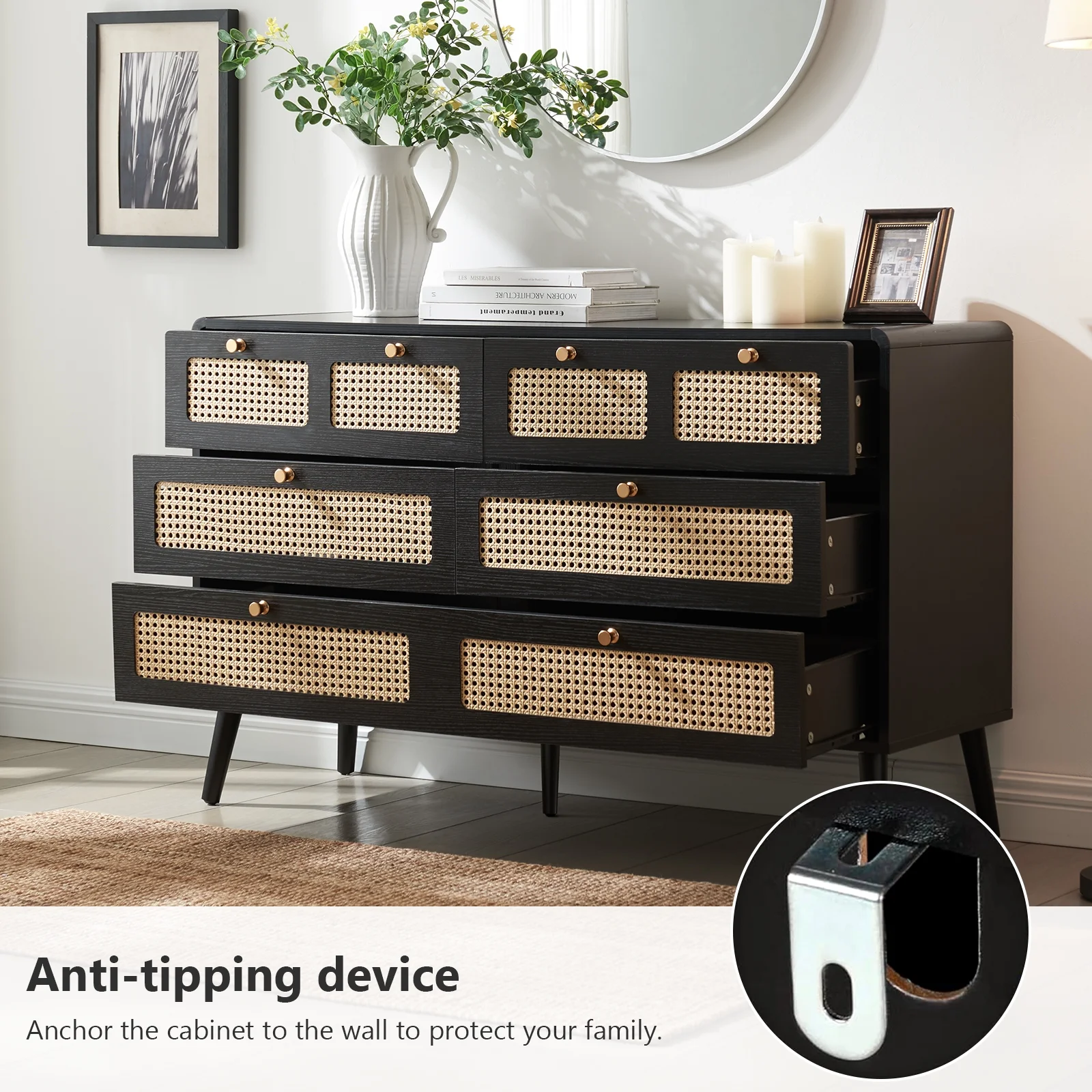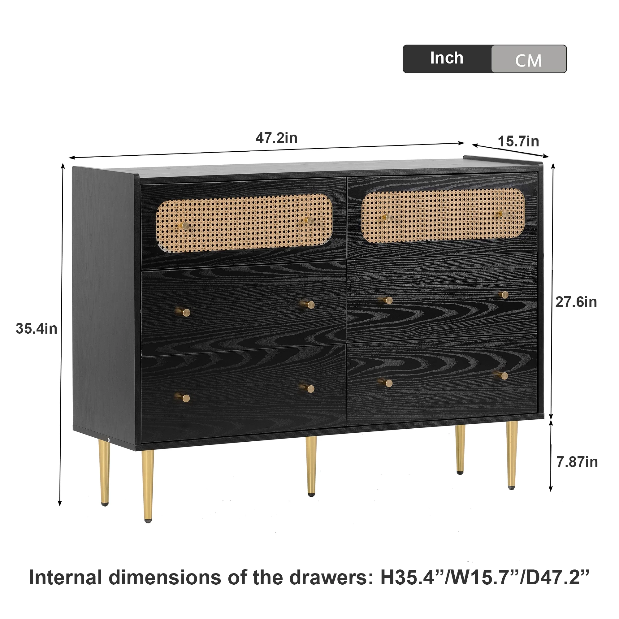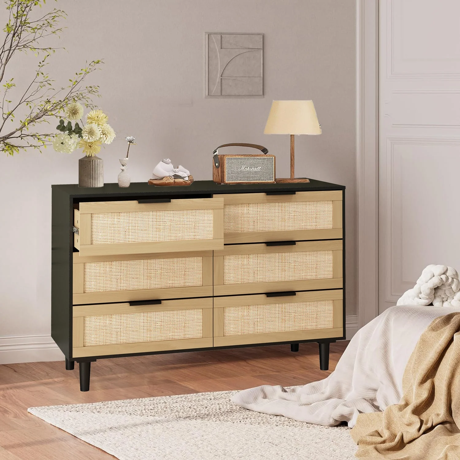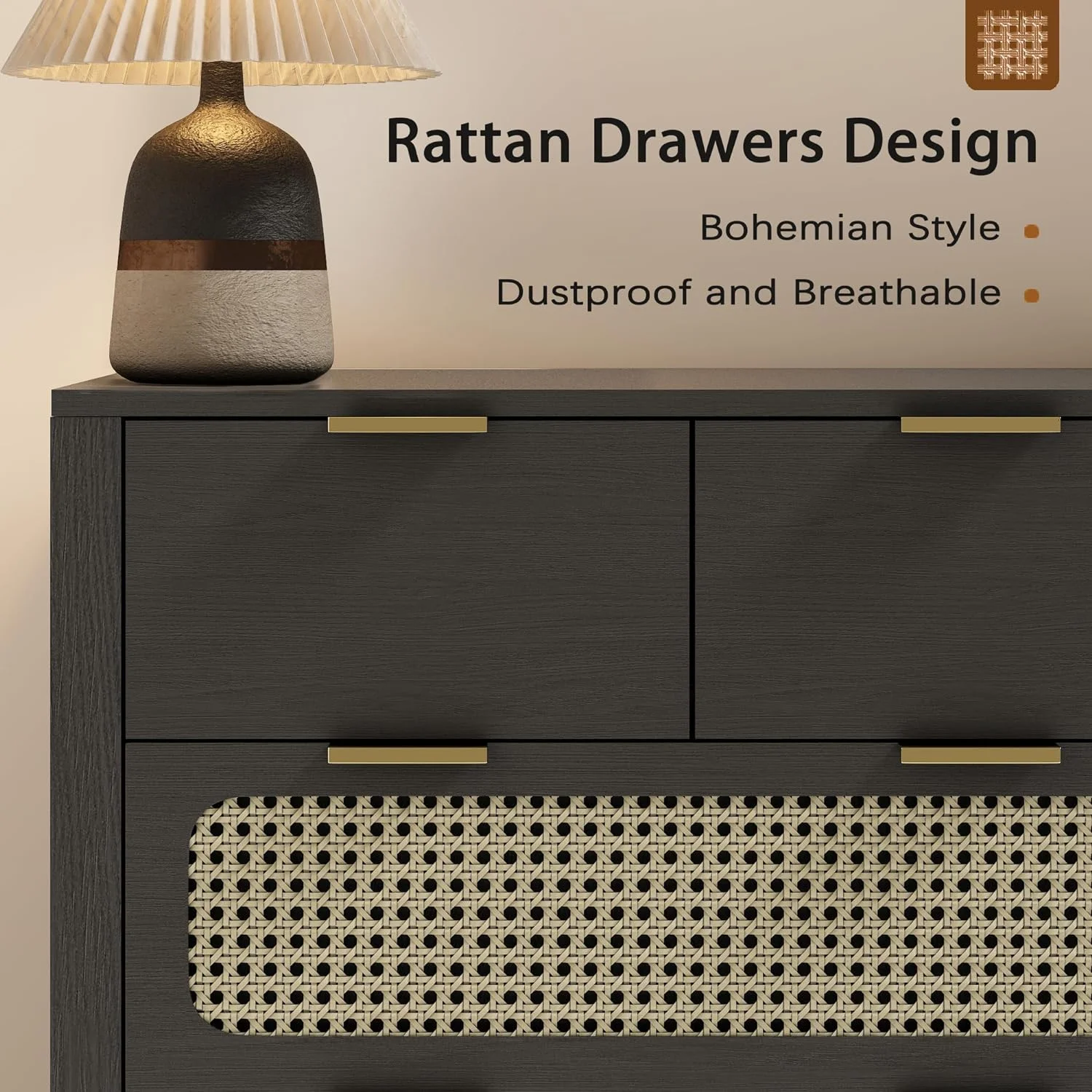 Glavbiku Modern 6 Drawers Rattan Dresser Table with Metal Handles Cabinet for Bedroom,Black,Adult