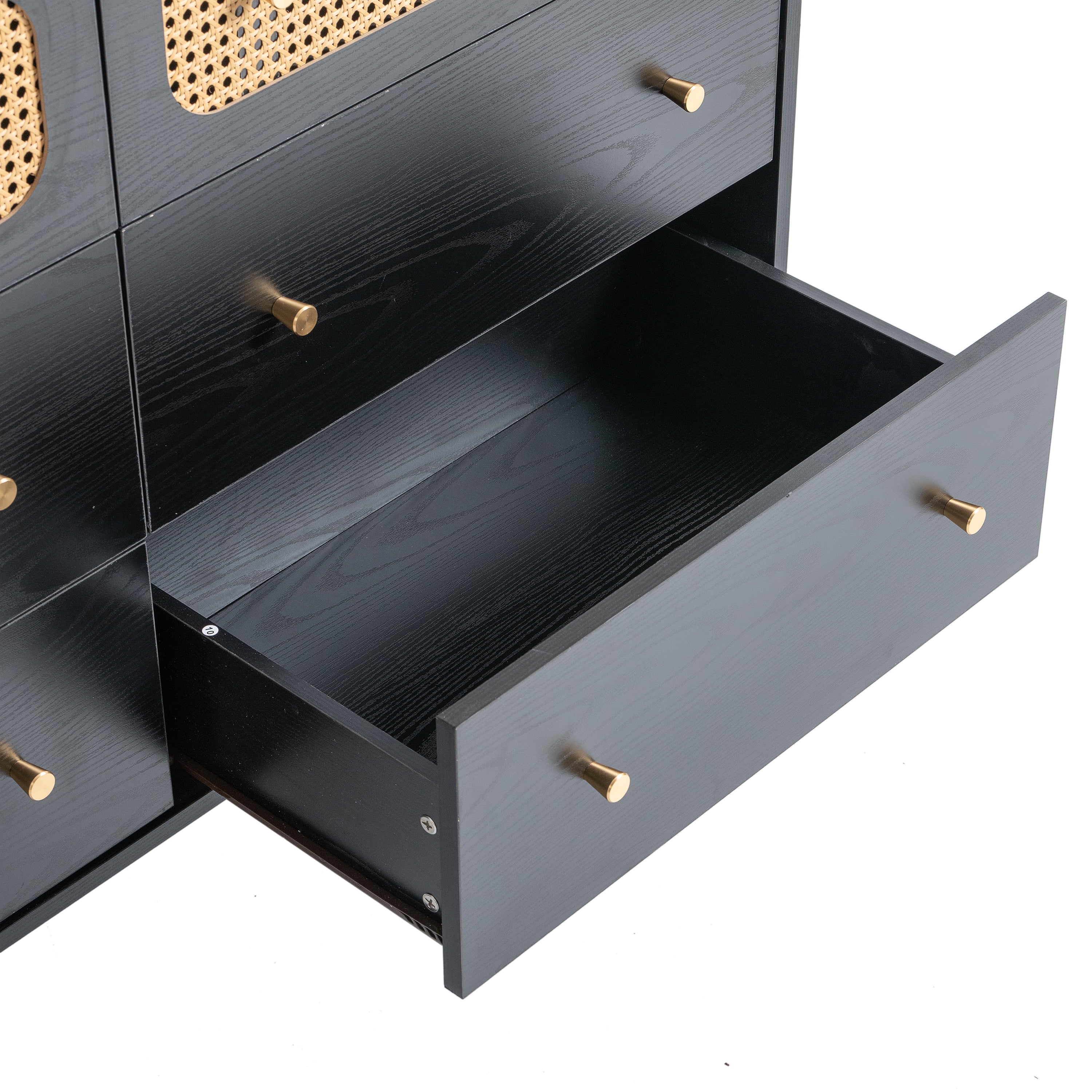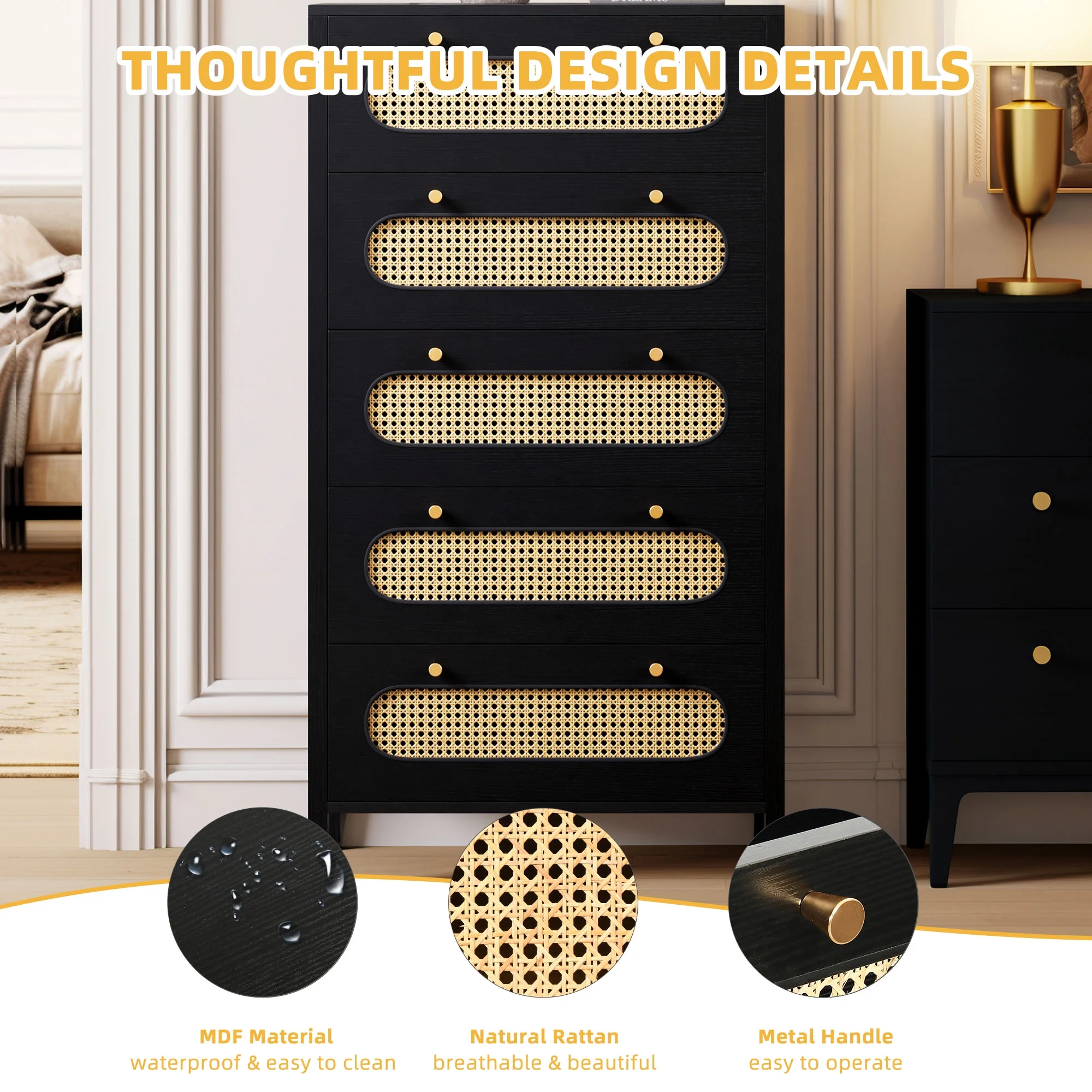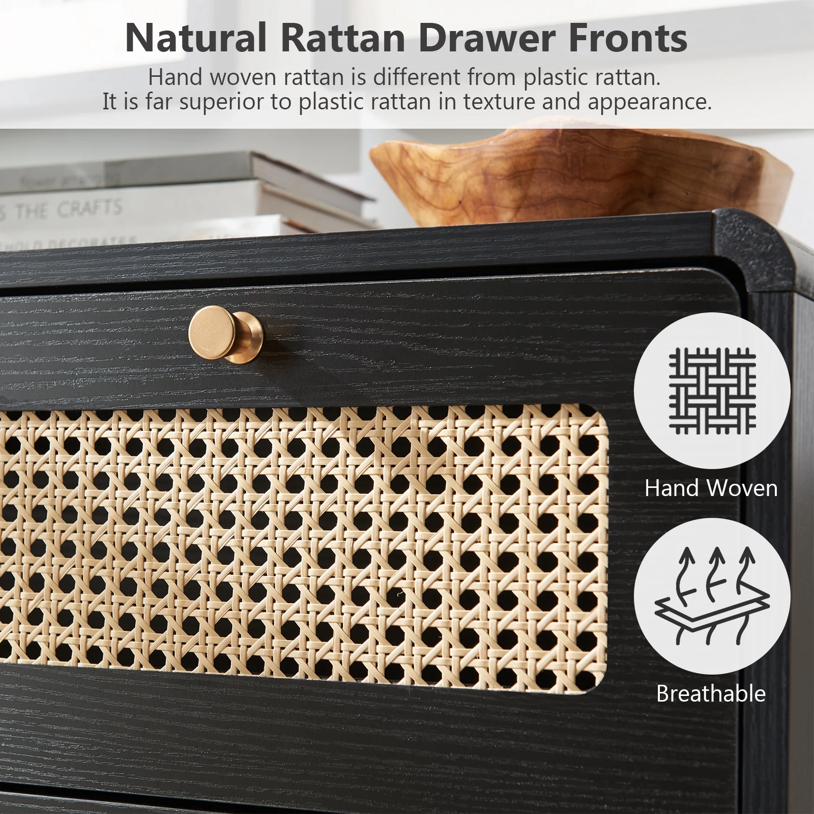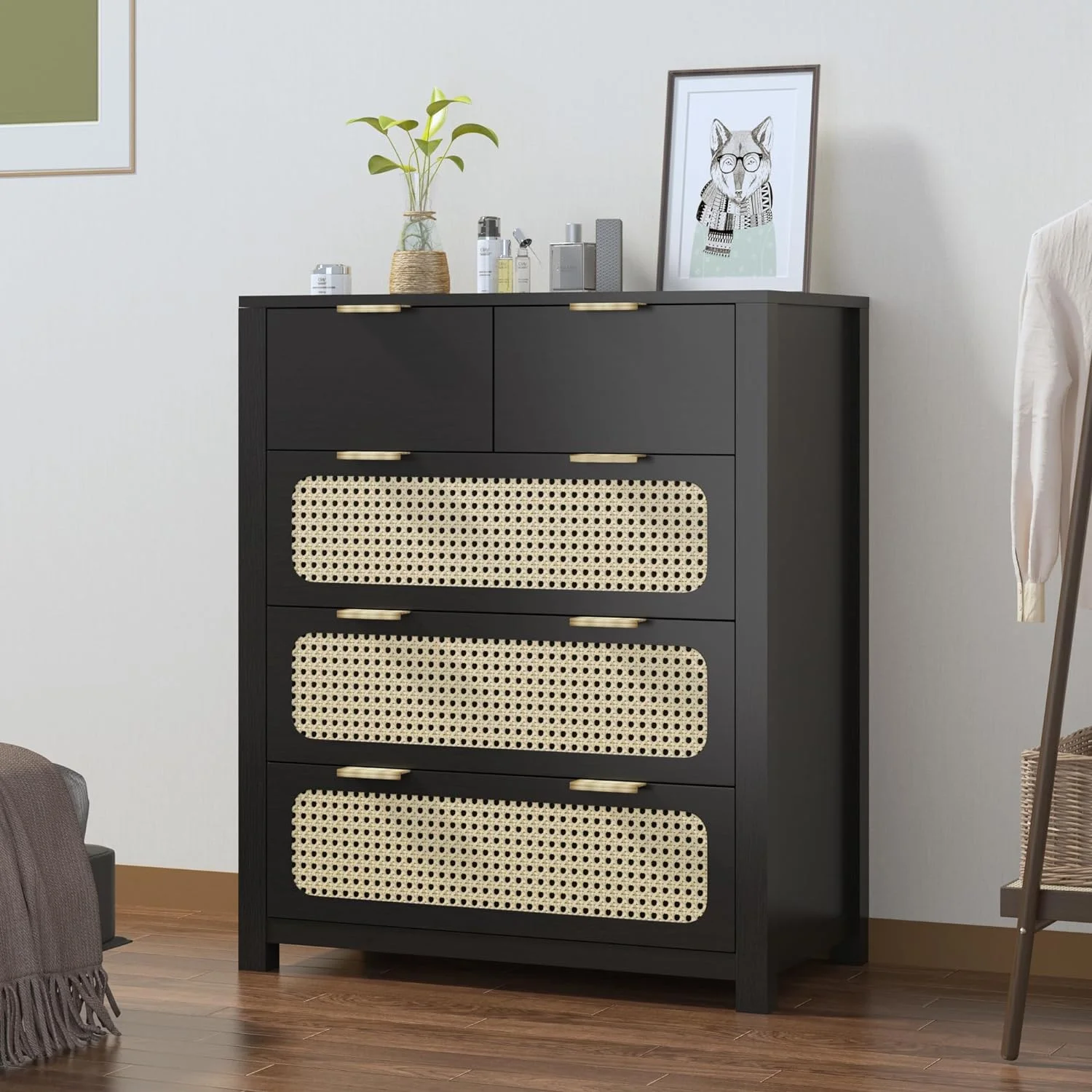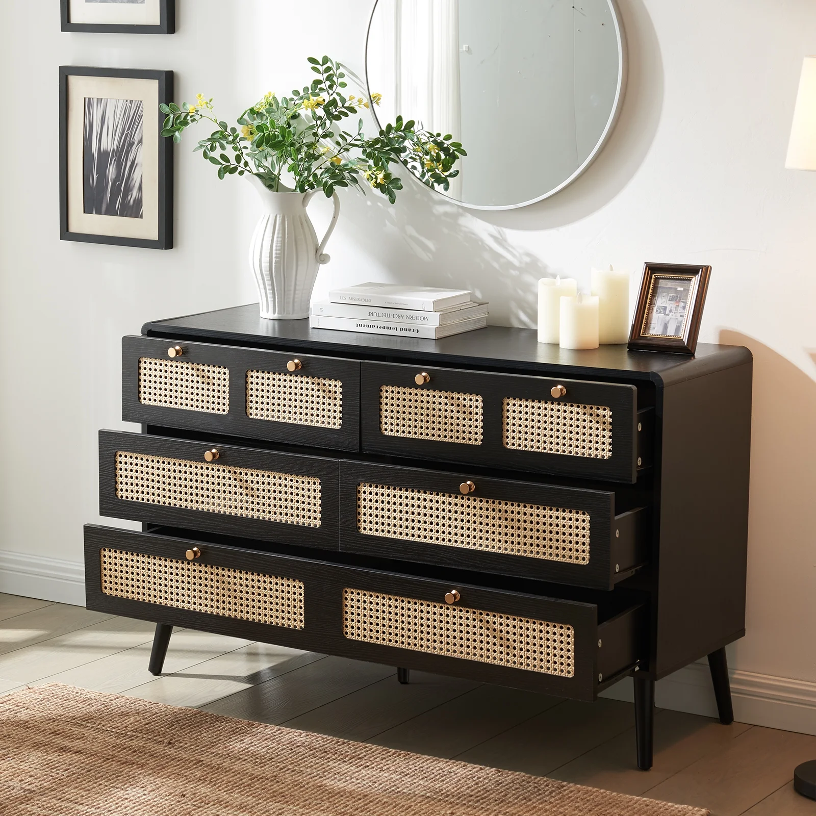Glavbiku Modern 6 Drawers Rattan Dresser Table with Metal Handles Cabinet for Bedroom,Black,Adult