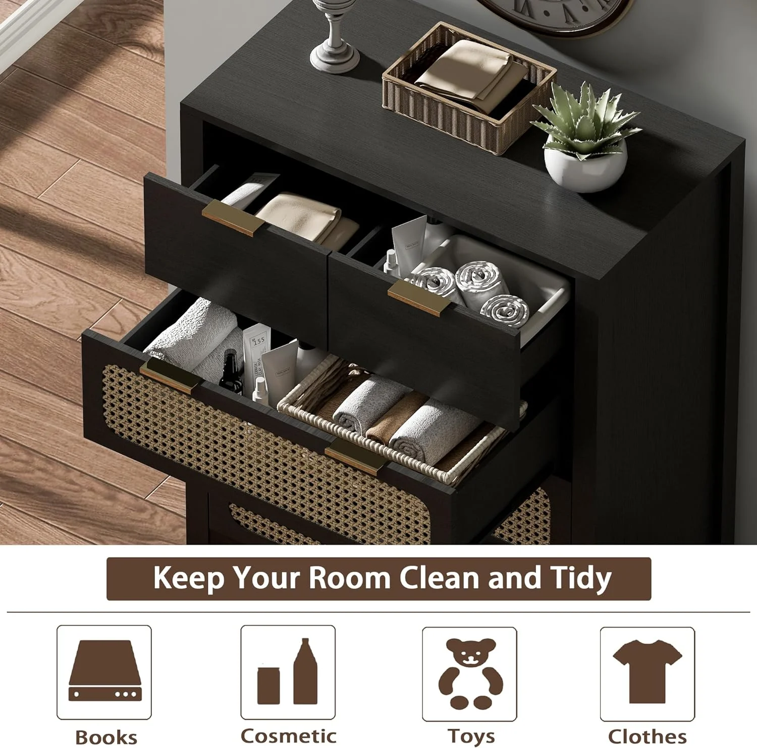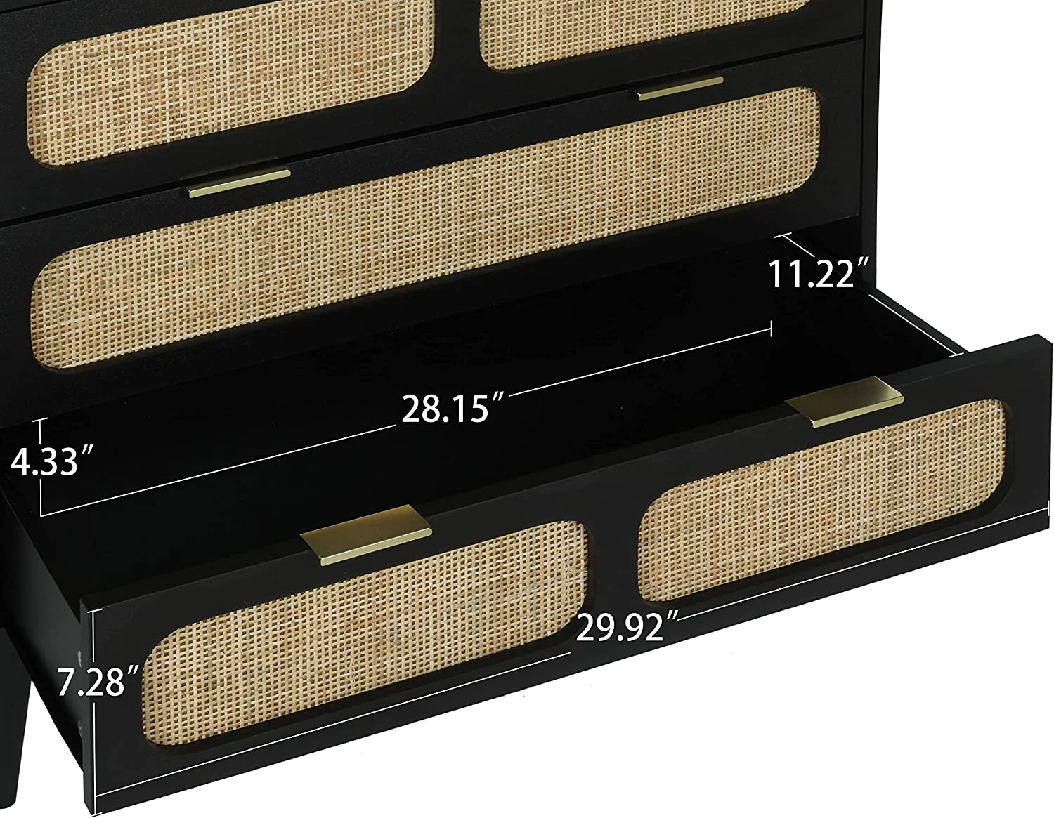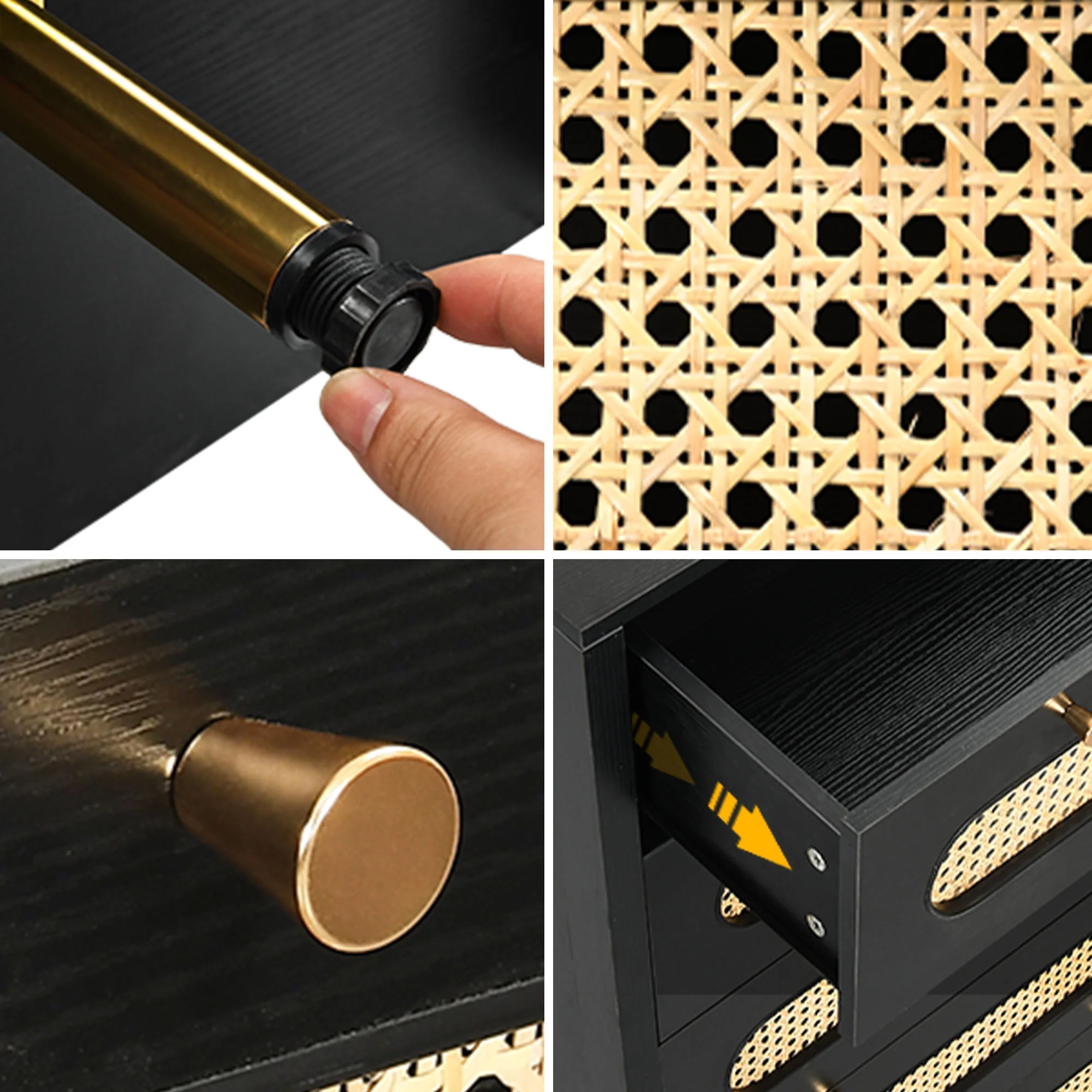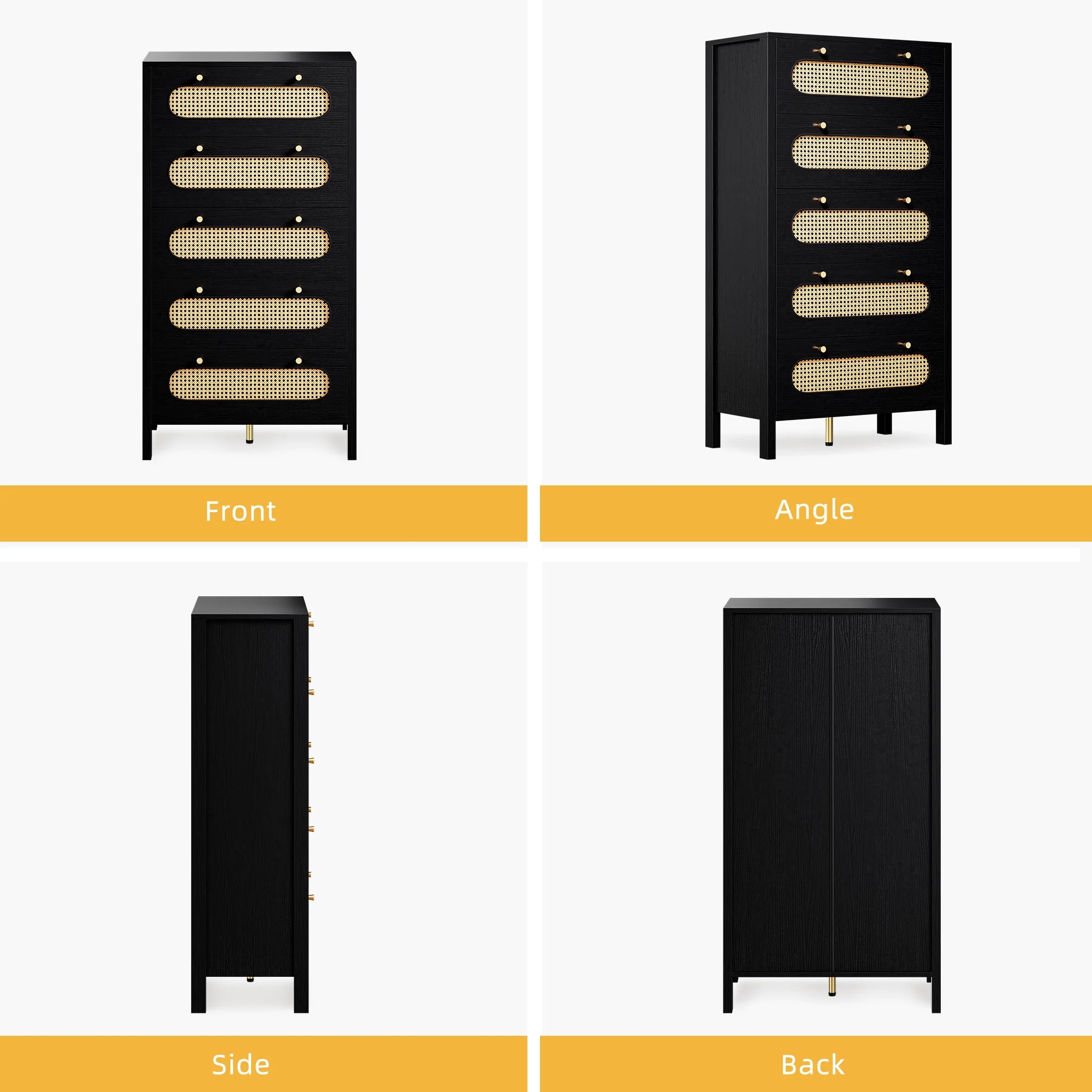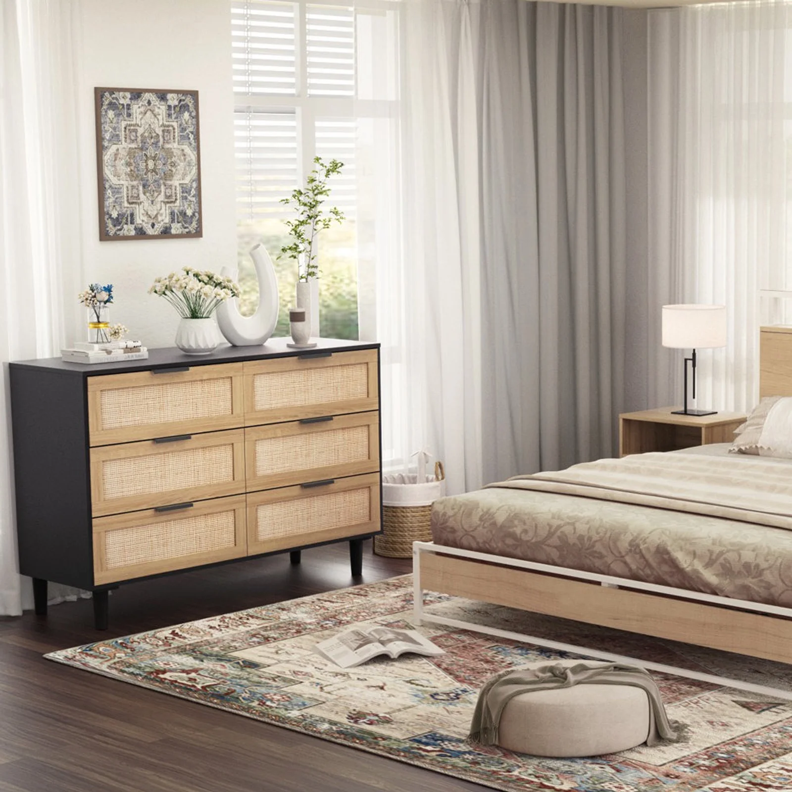 Glavbiku Modern 6 Drawers Rattan Dresser Table with Metal Handles Cabinet for Bedroom,Black,Adult
