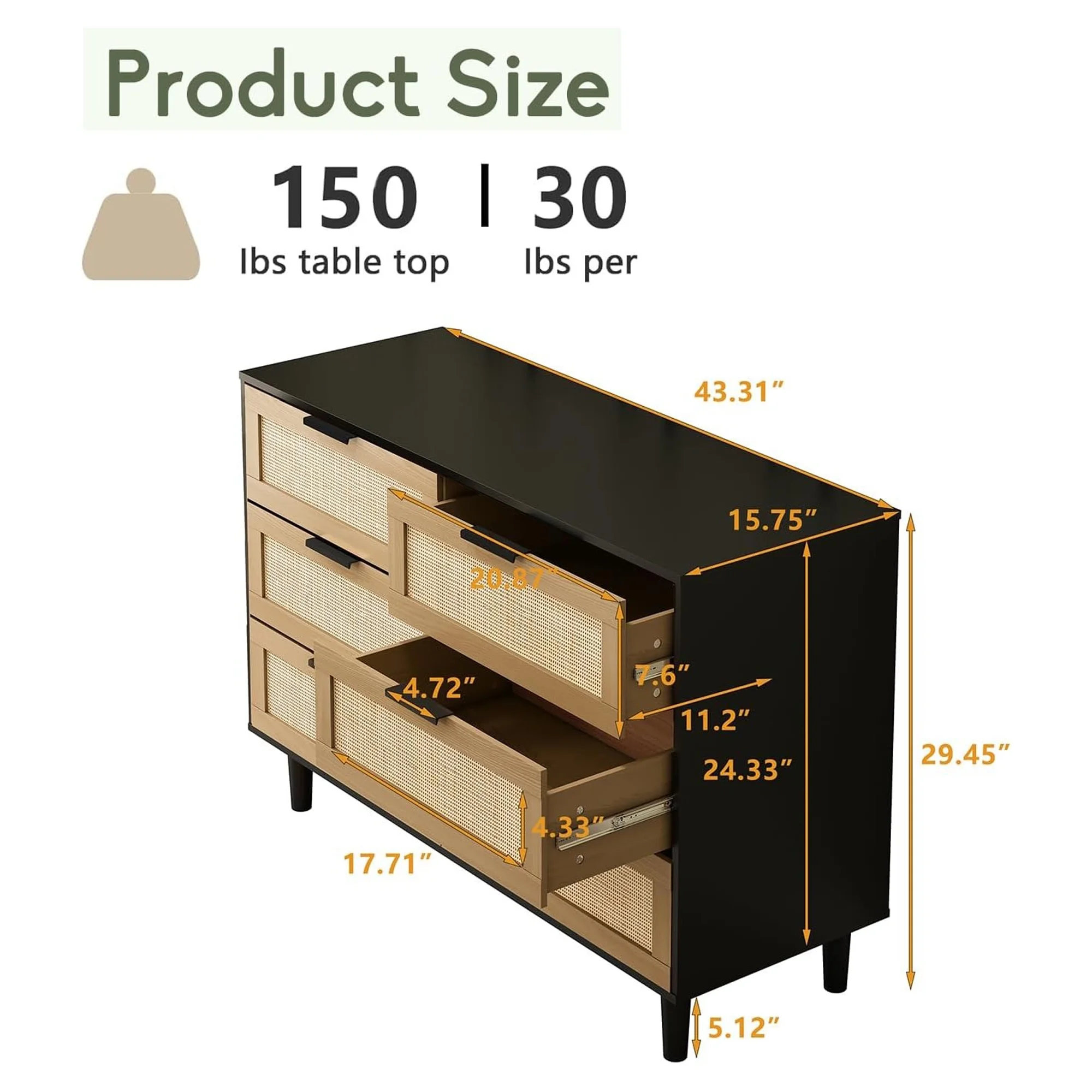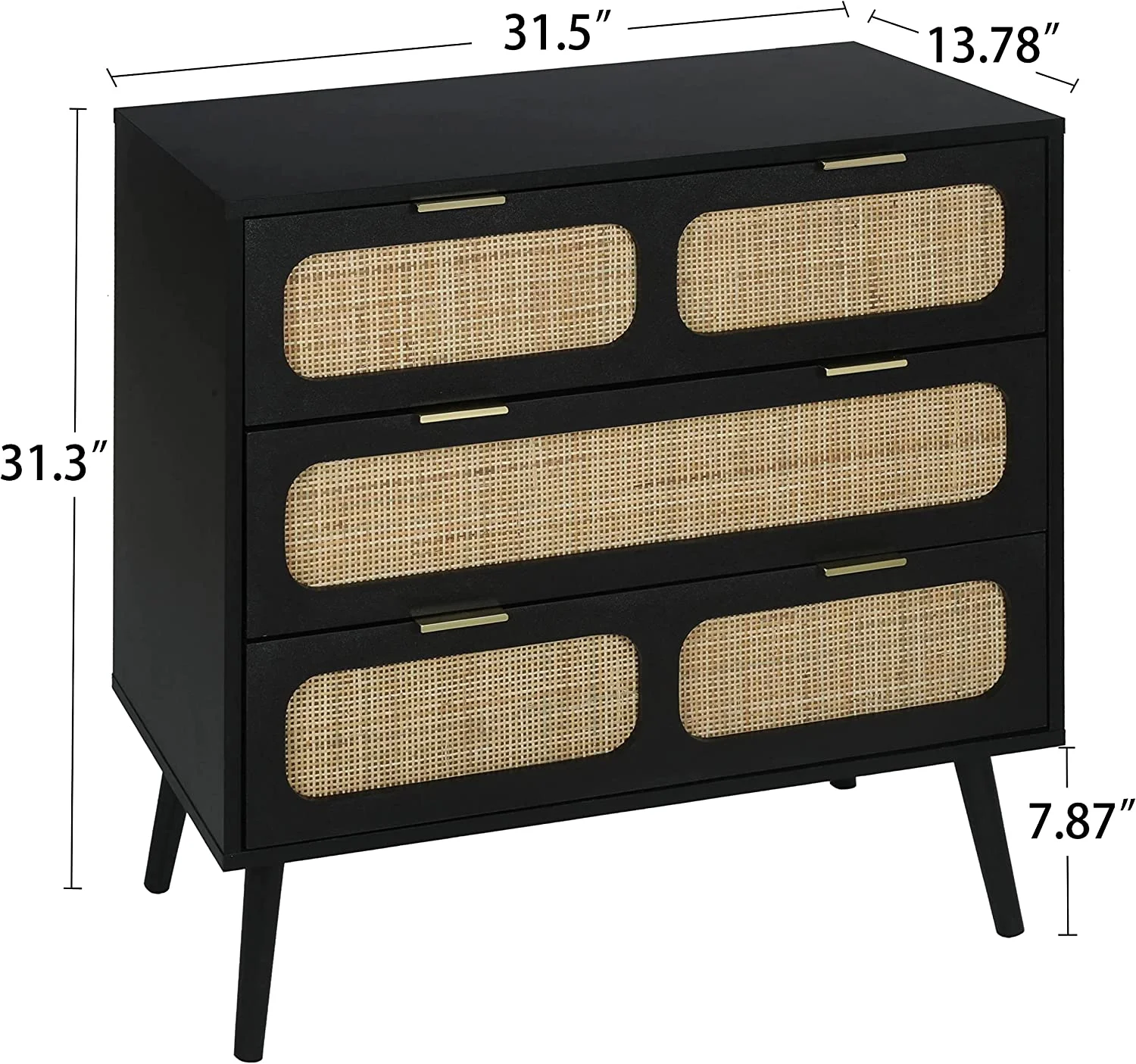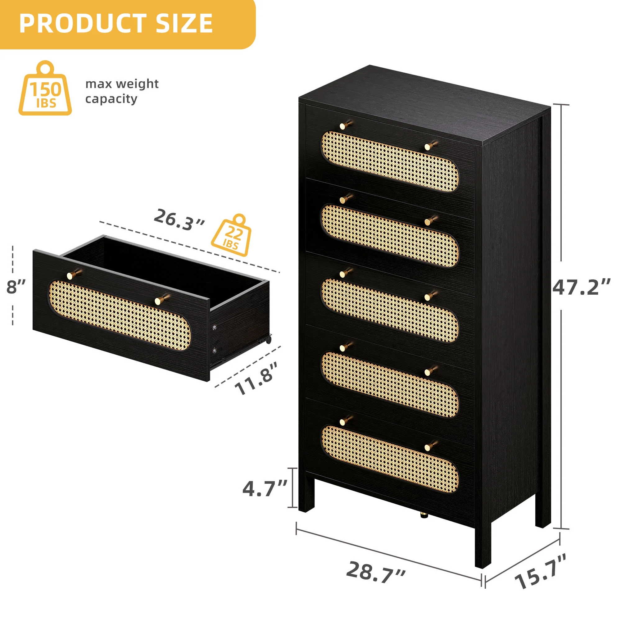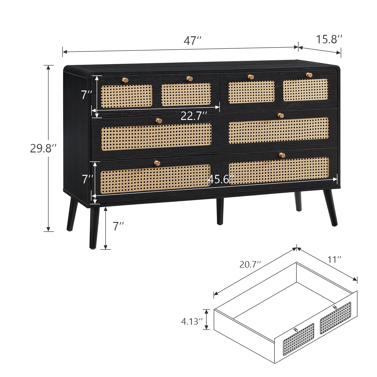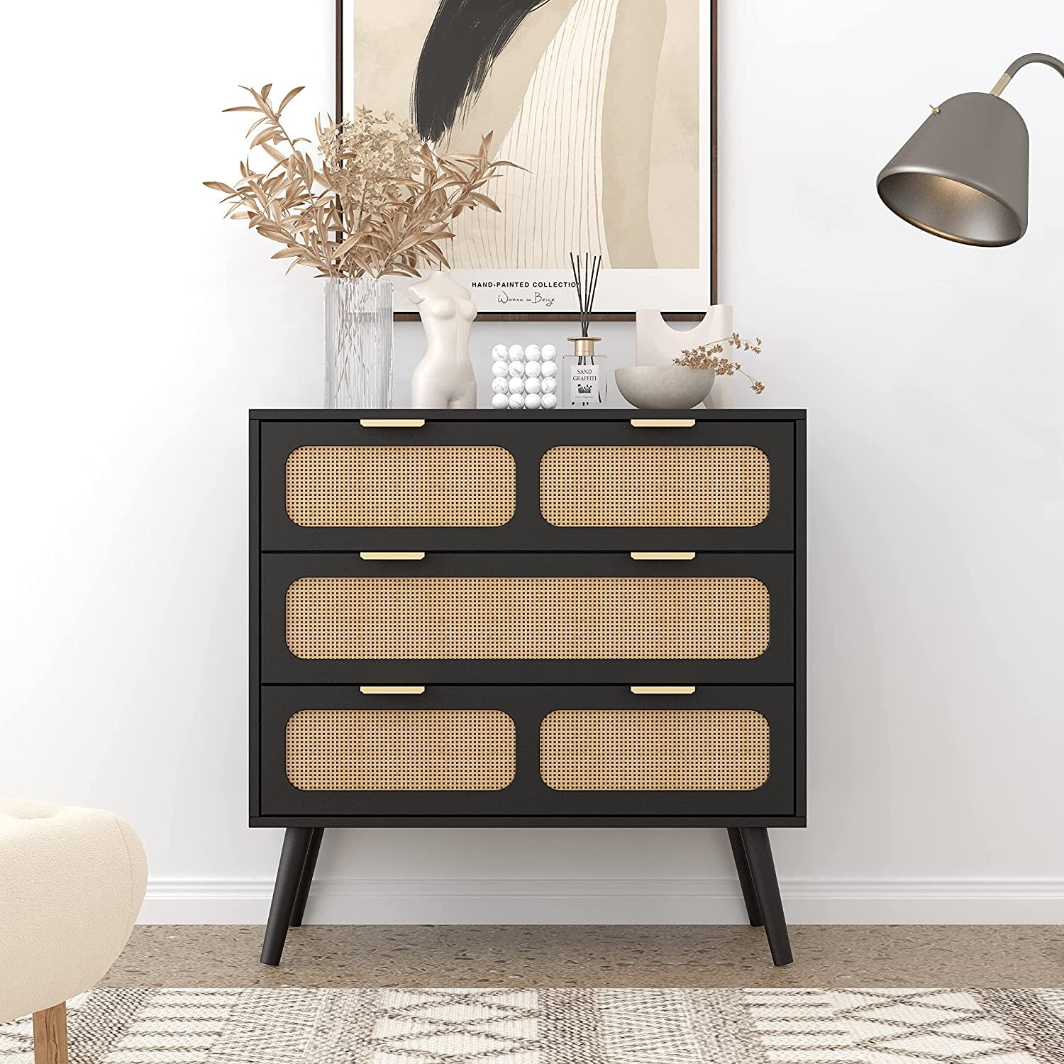 Glavbiku Modern 6 Drawers Rattan Dresser Table with Metal Handles Cabinet for Bedroom,Black,Adult