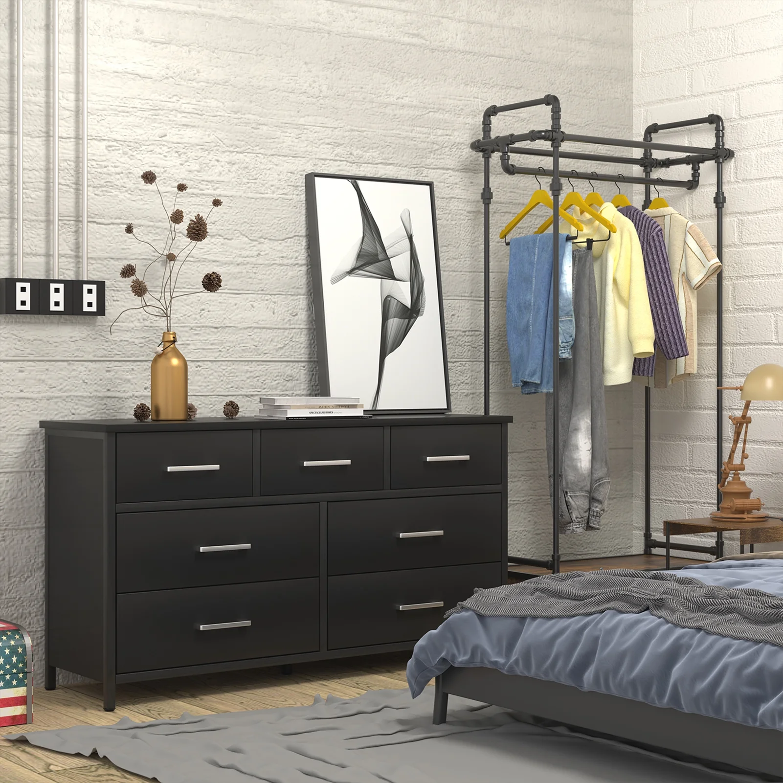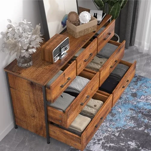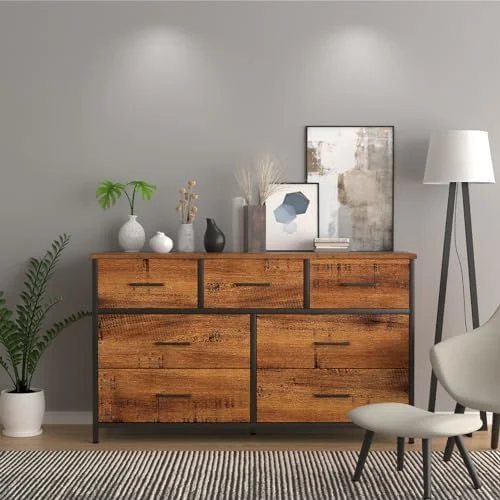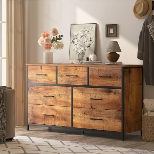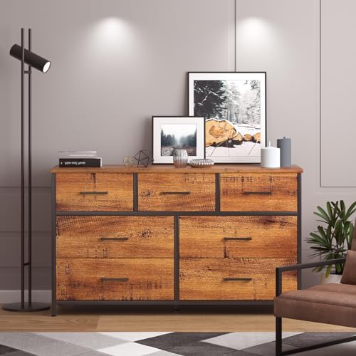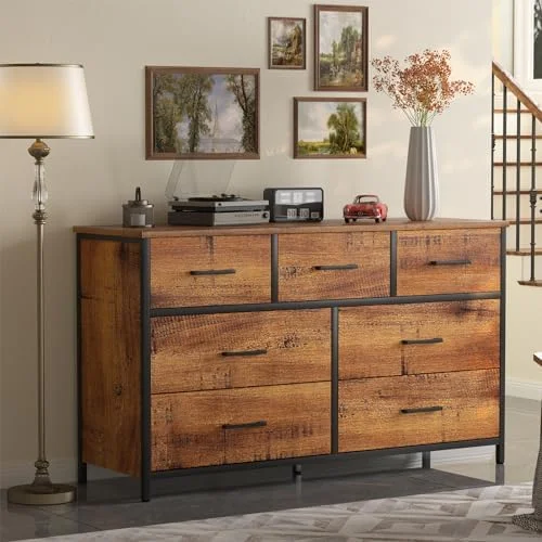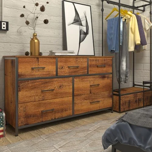 7 Drawer Wood Dresser Industrial Chests of Drawers with Sturdy Steel Frame Accent Wood Dresser for Bedroom