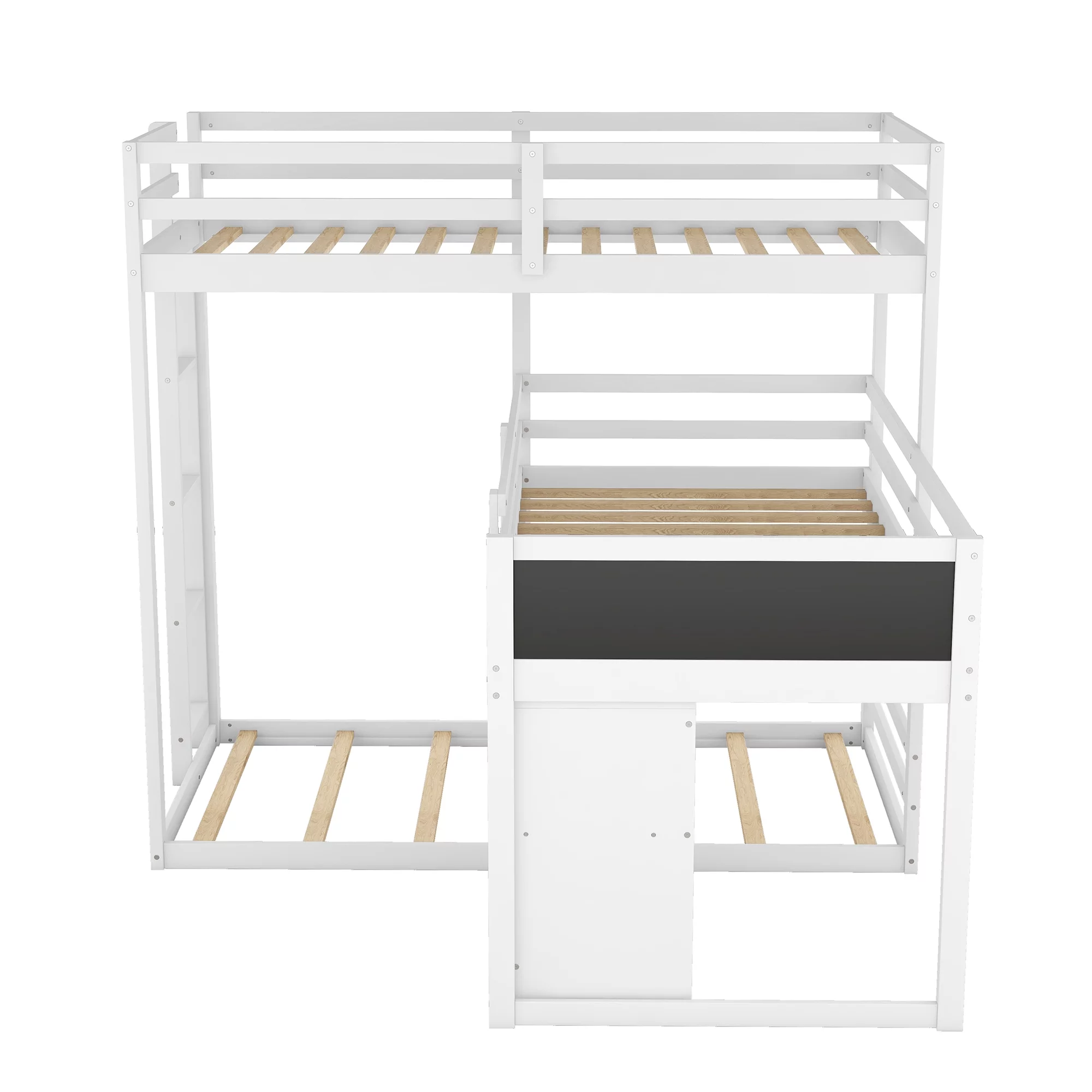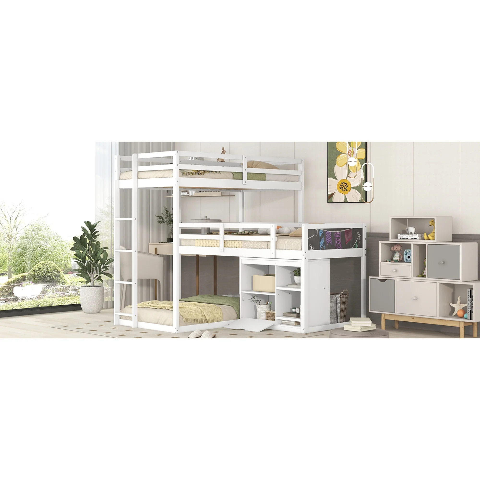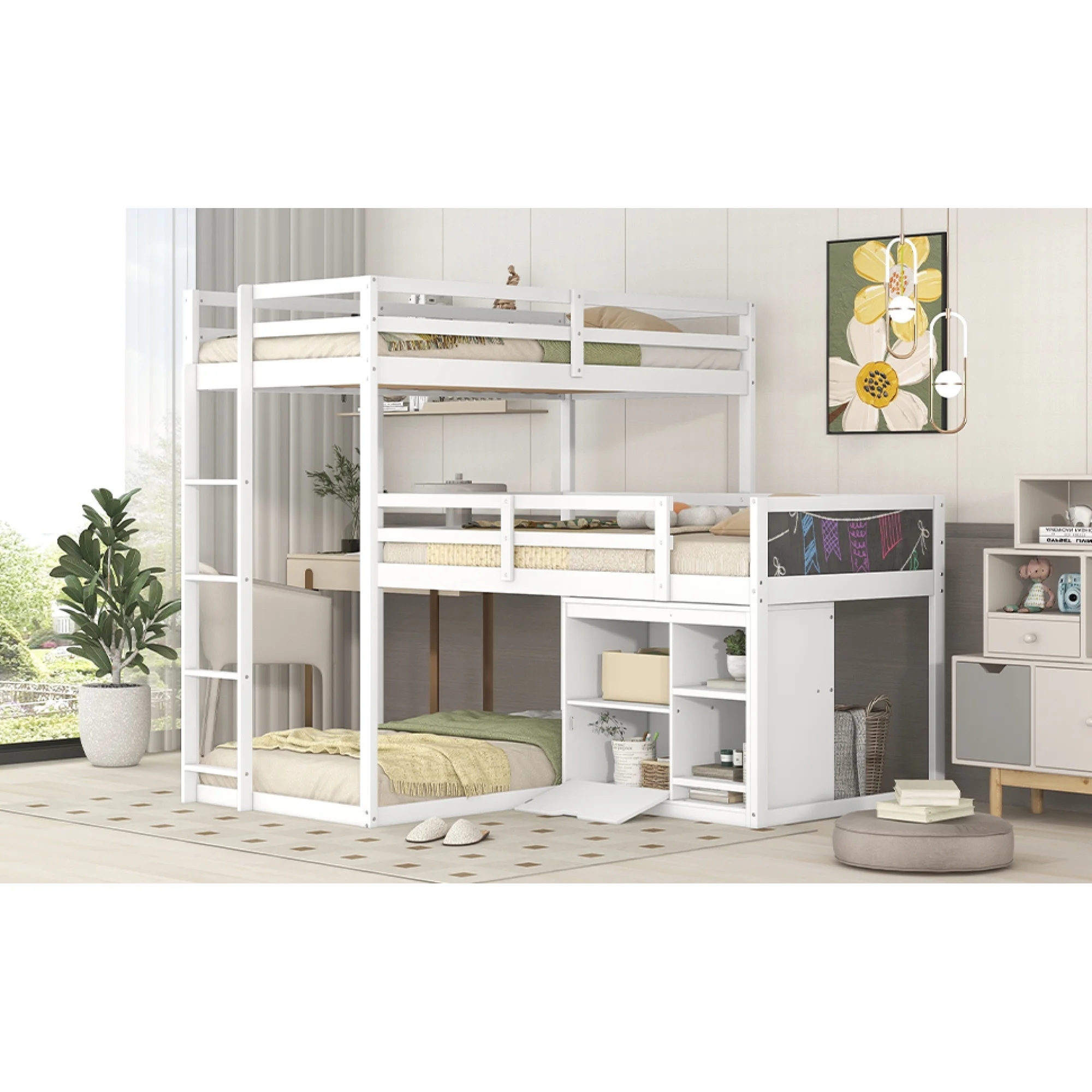 L-shaped Wood Triple Twin Size Bunk Bed with Storage Cabinet and Blackboard, Ladder, White