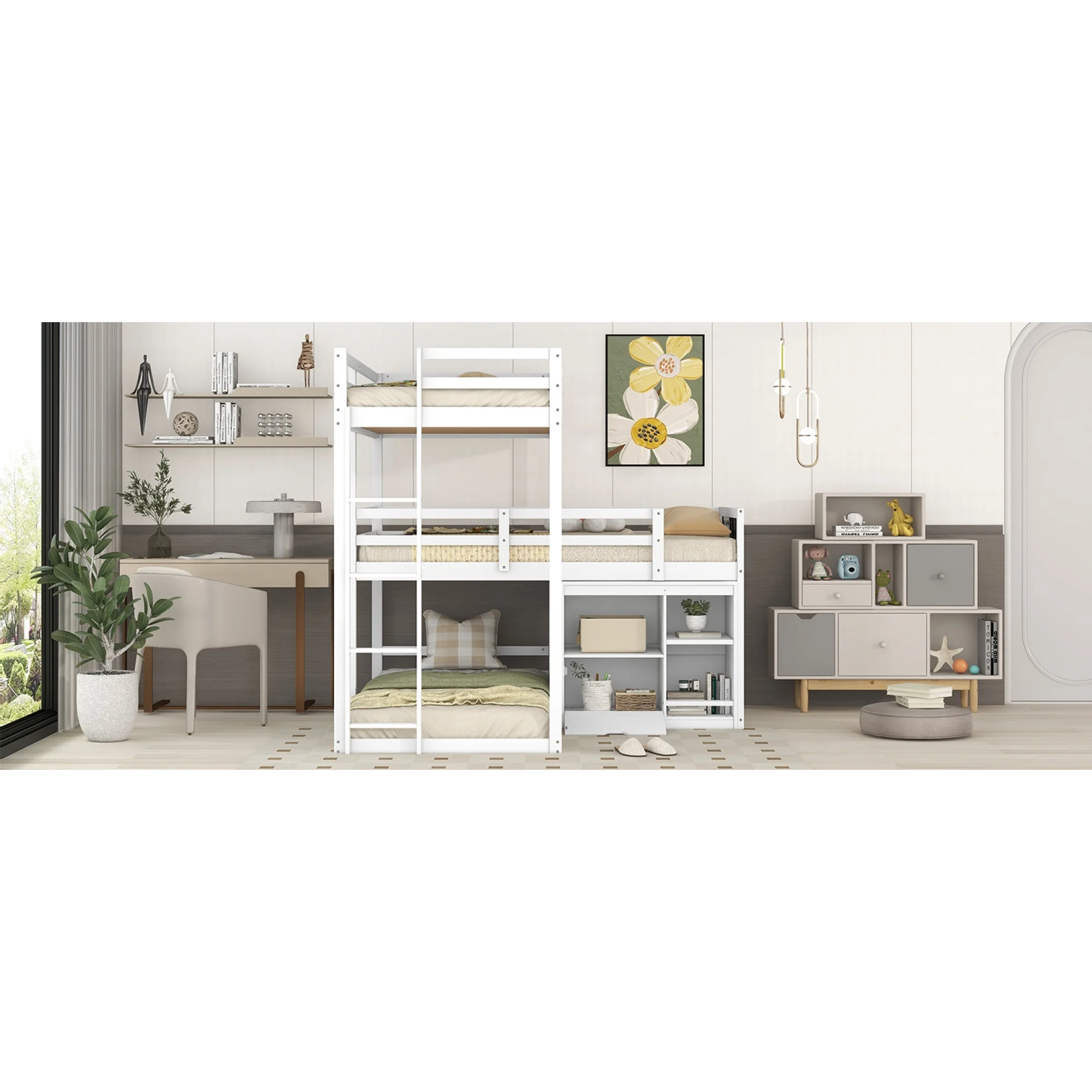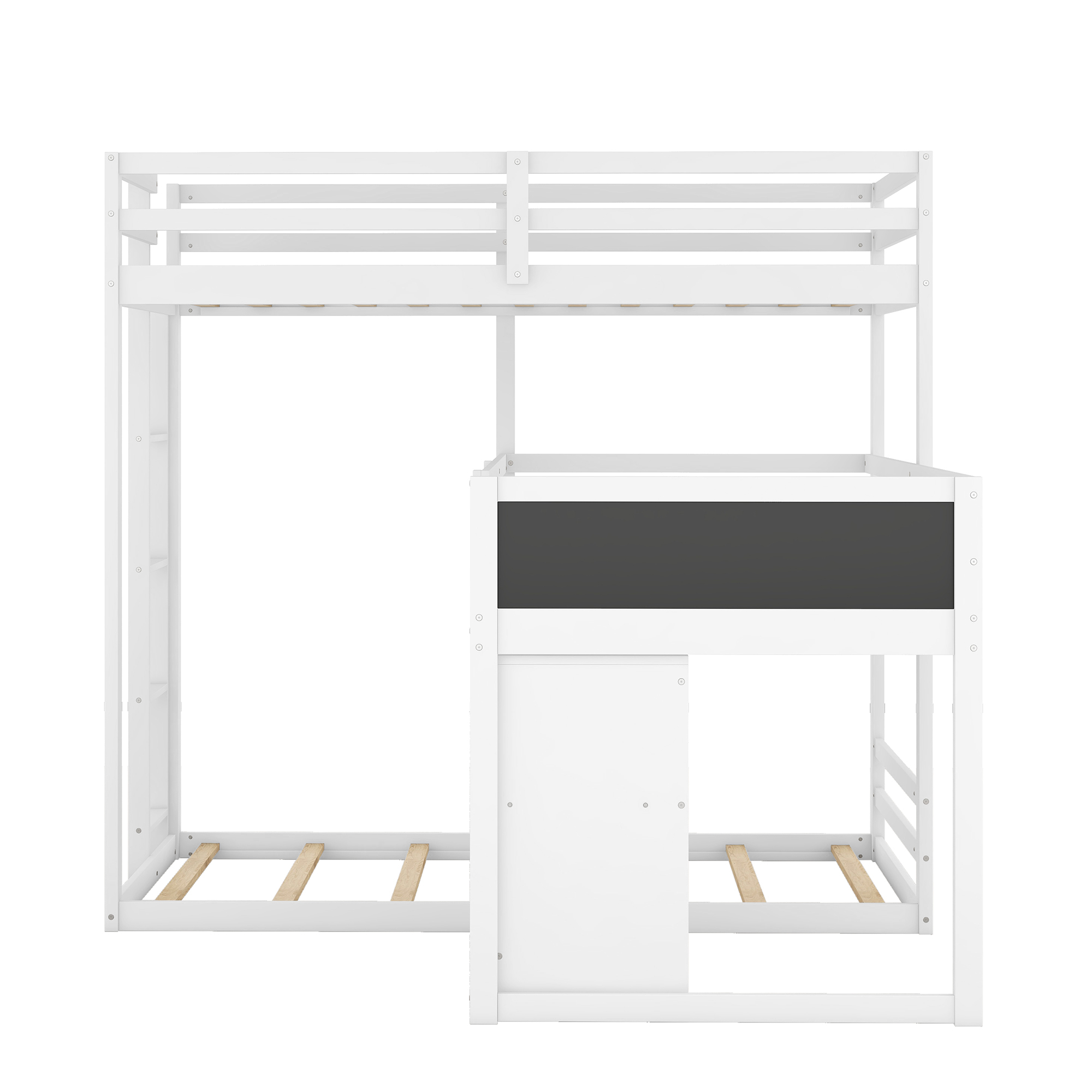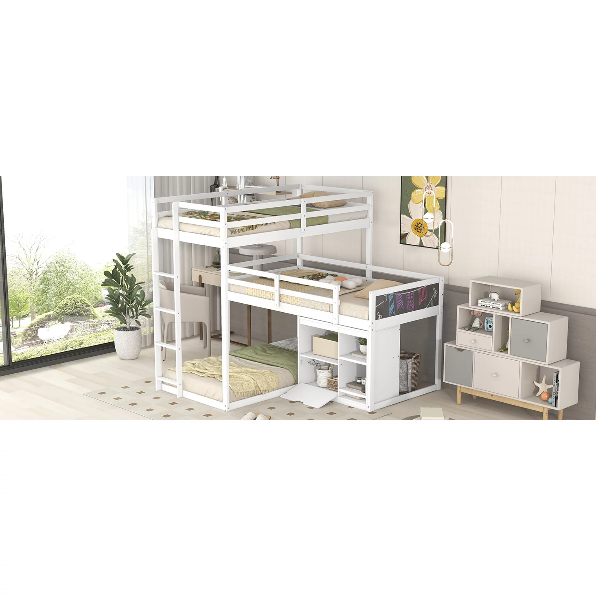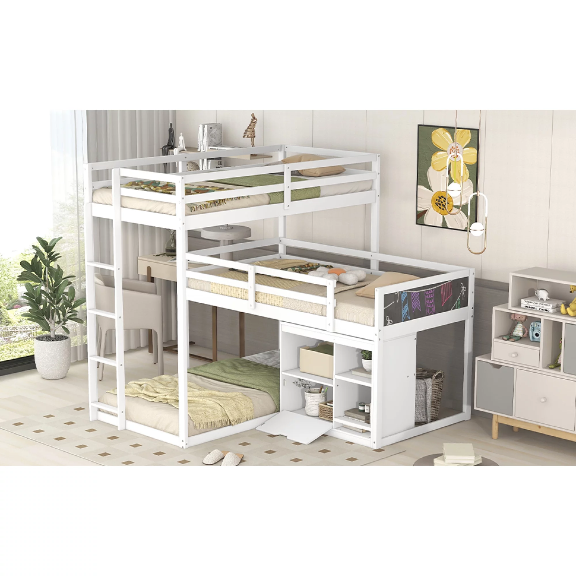 L-shaped Wood Triple Twin Size Bunk Bed with Storage Cabinet and Blackboard, Ladder, White