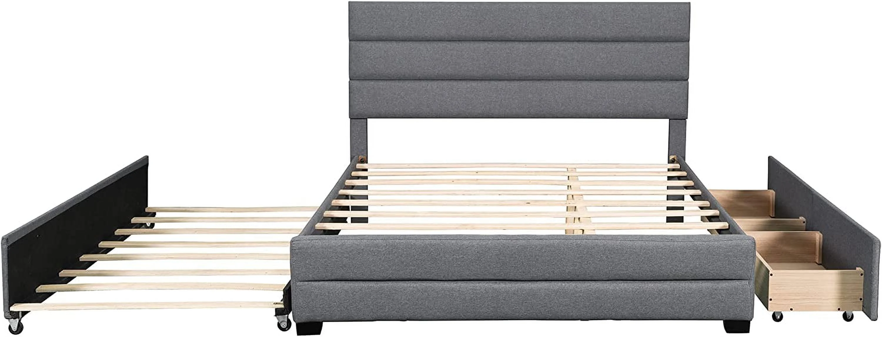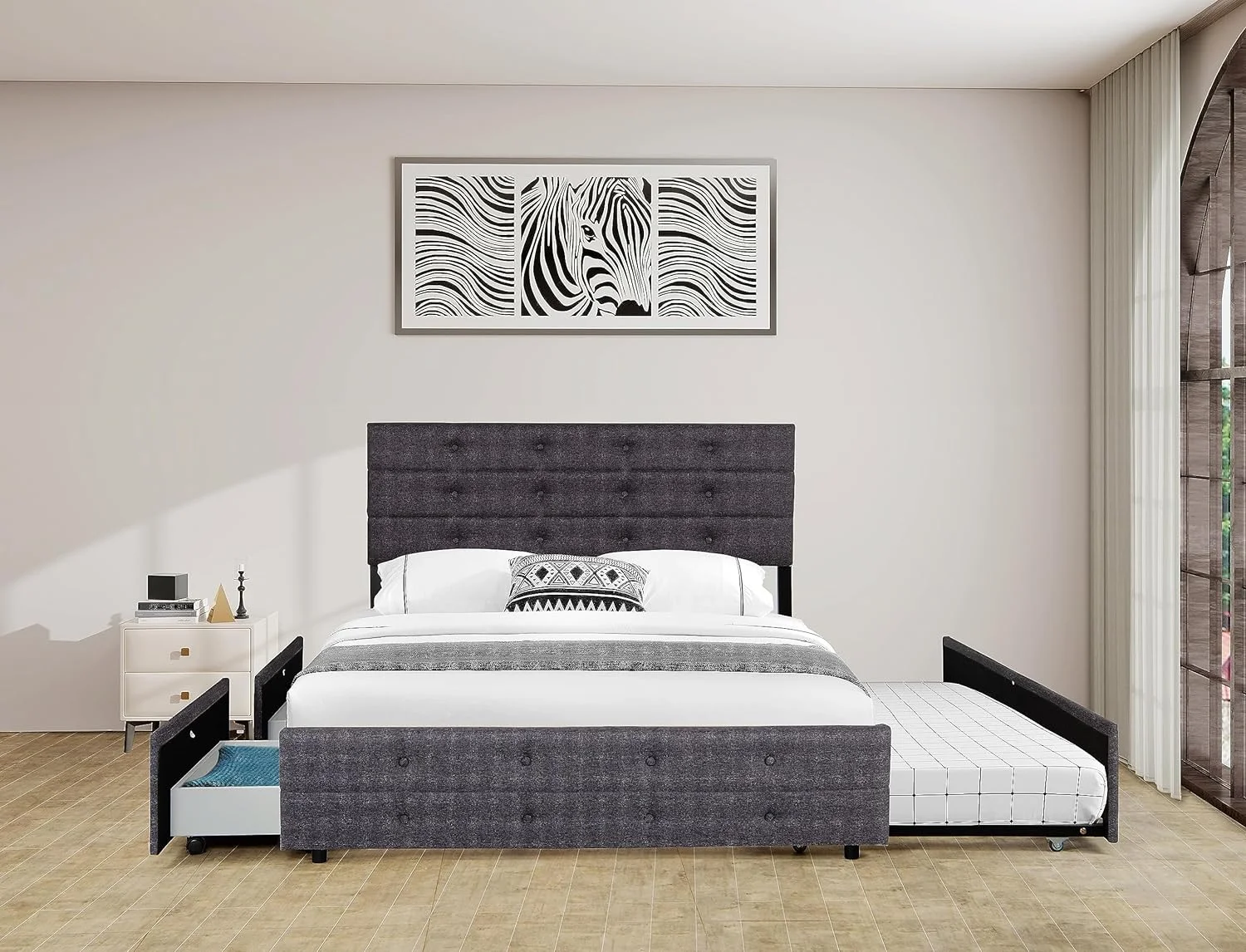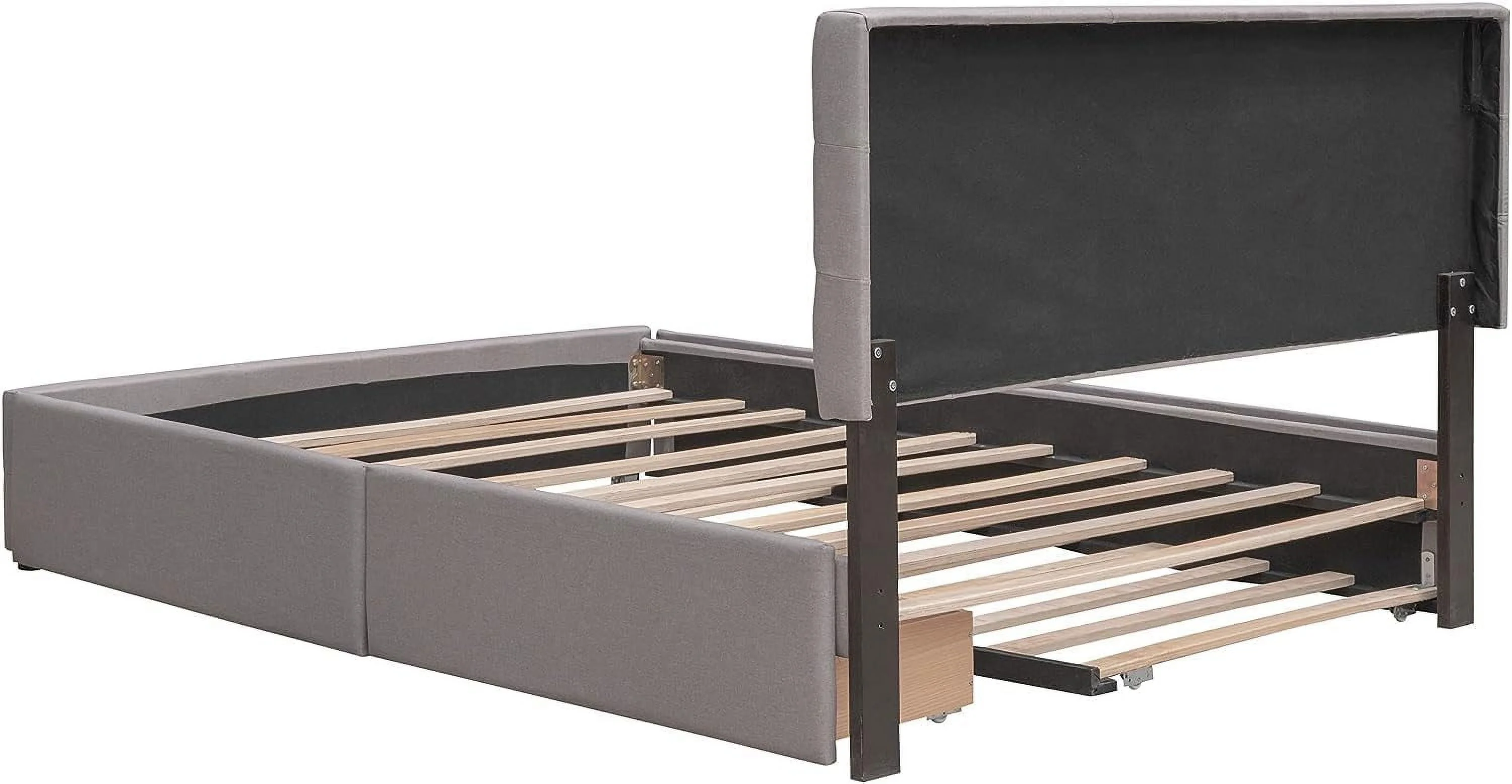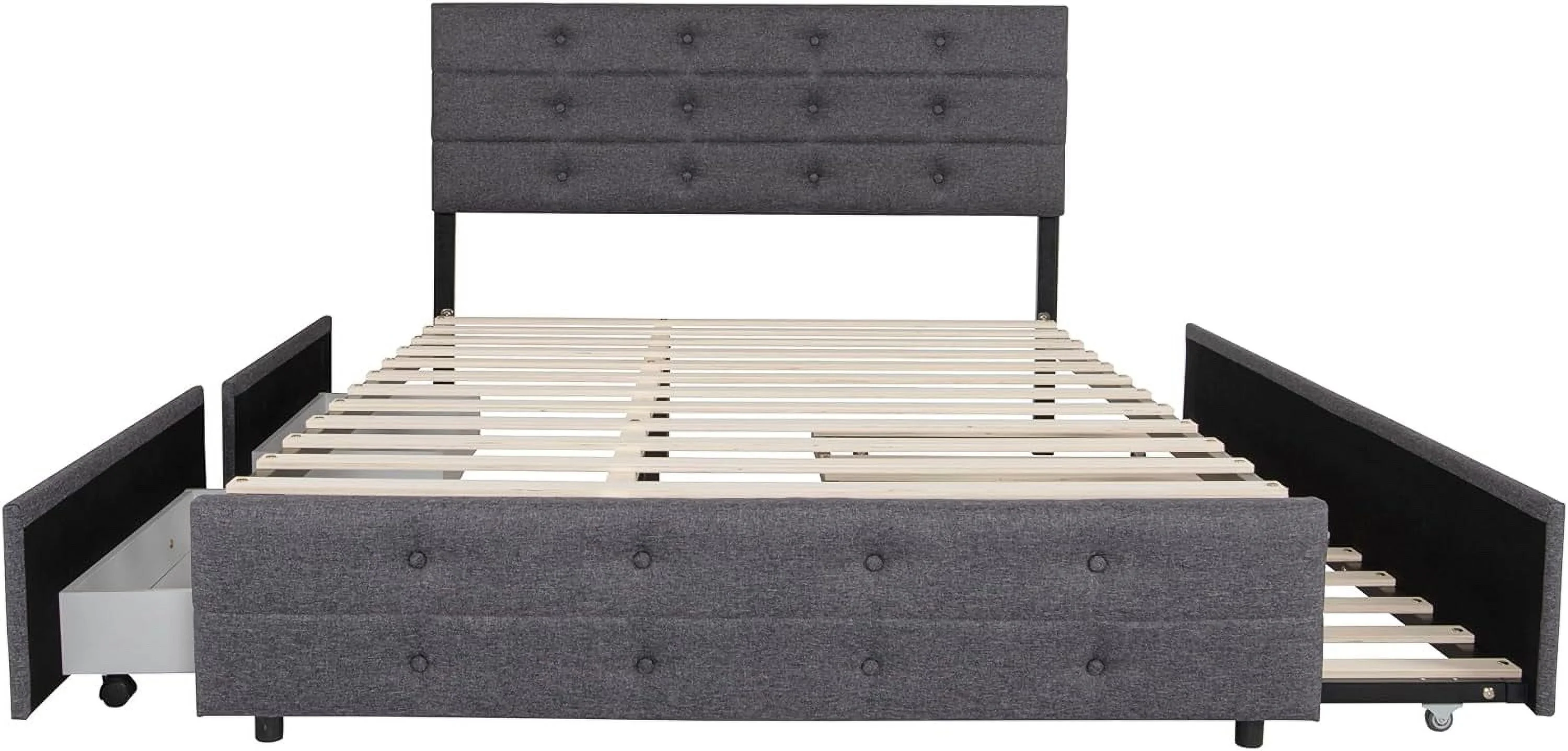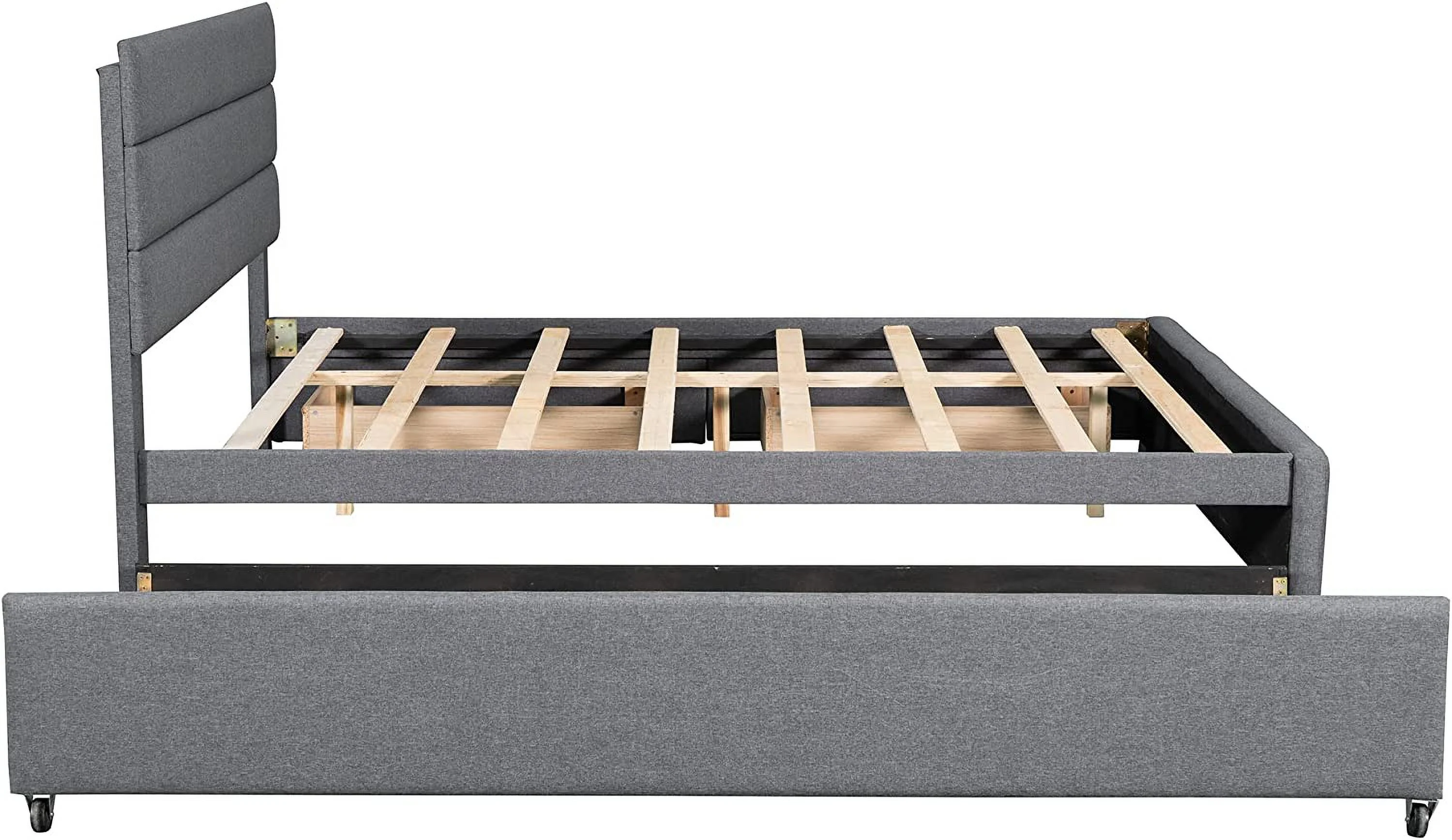 Queen Size Platform Bed, Upholstered Queen Size Bed With Trundle Bed And Drawers, Linen Fabric, Gray