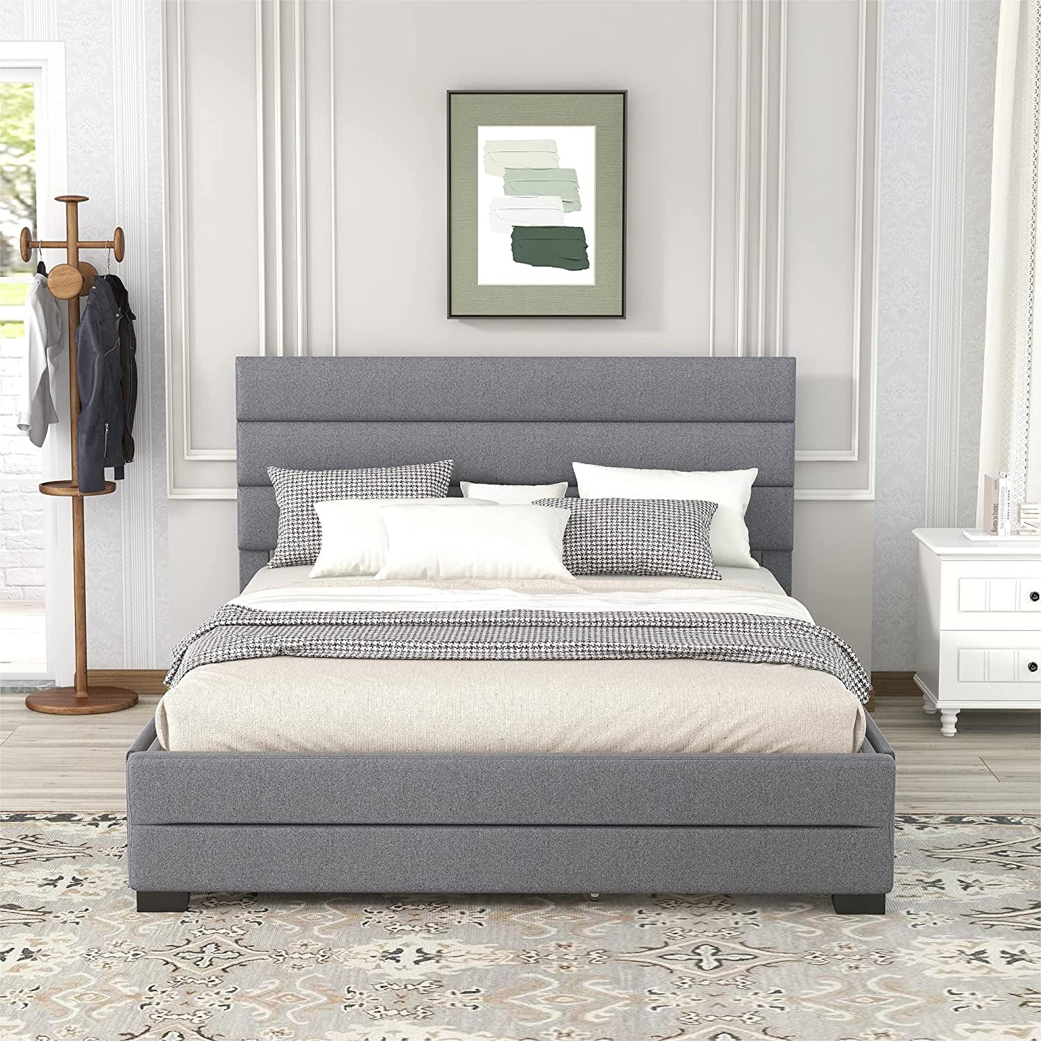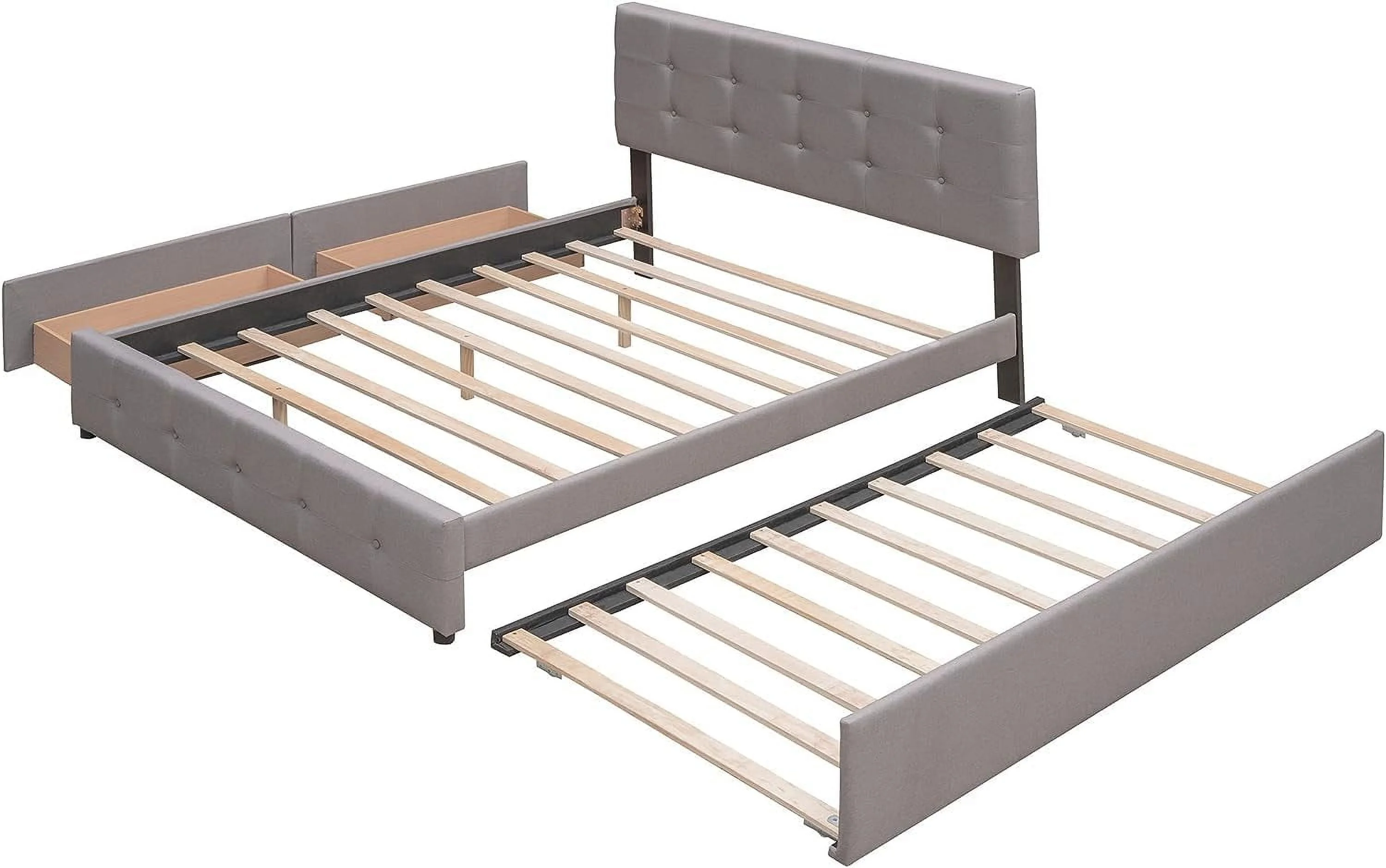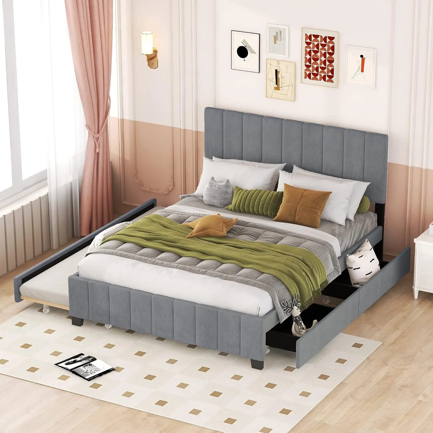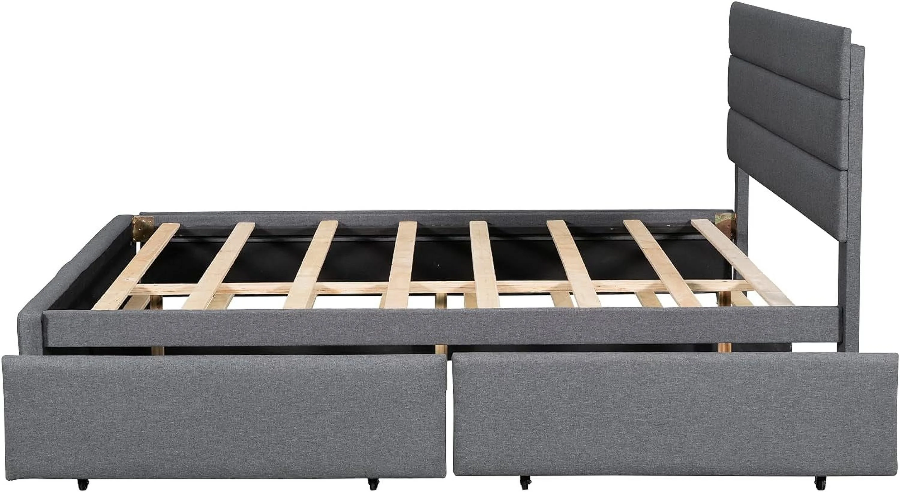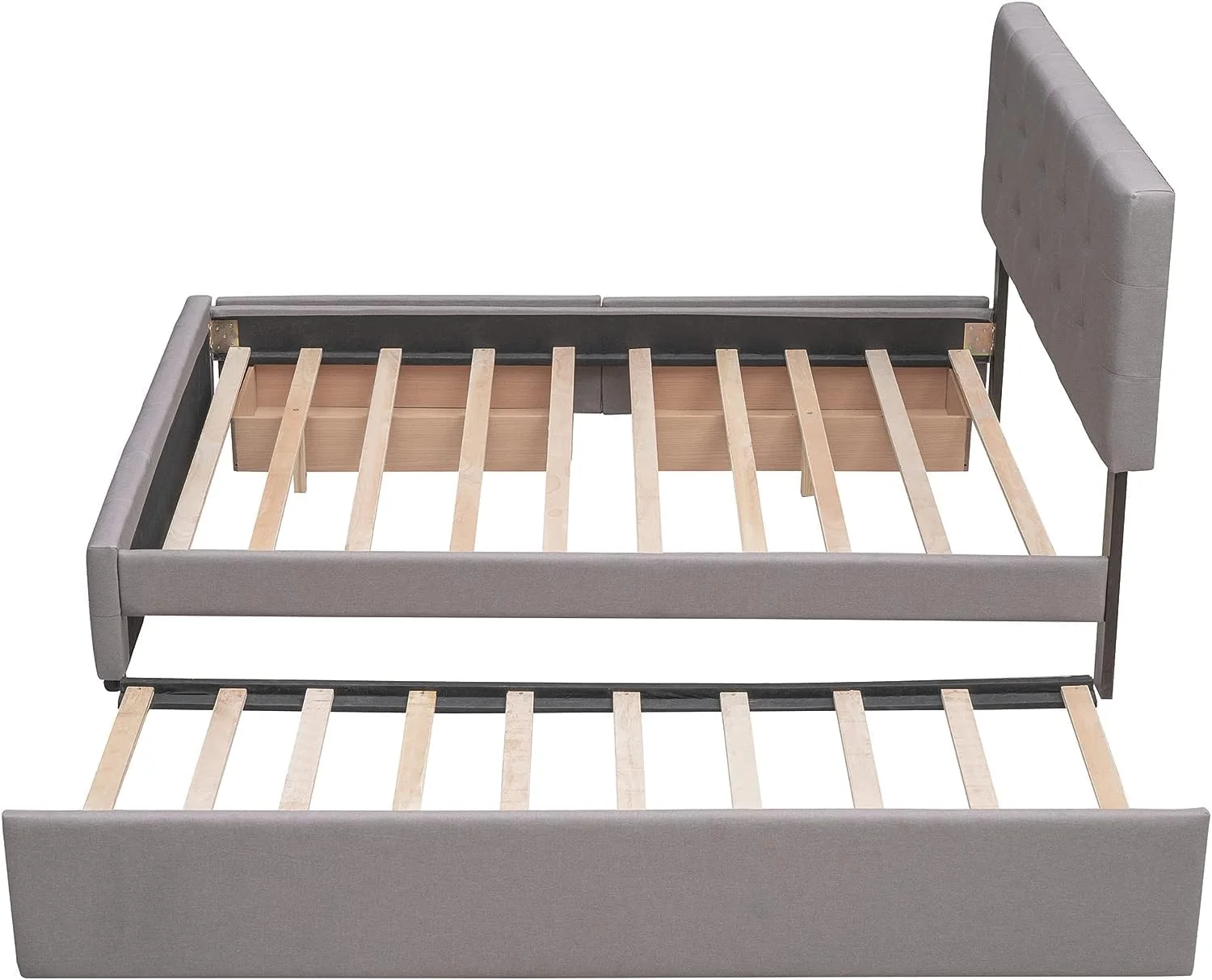 Queen Size Platform Bed, Upholstered Queen Size Bed With Trundle Bed And Drawers, Linen Fabric, Gray