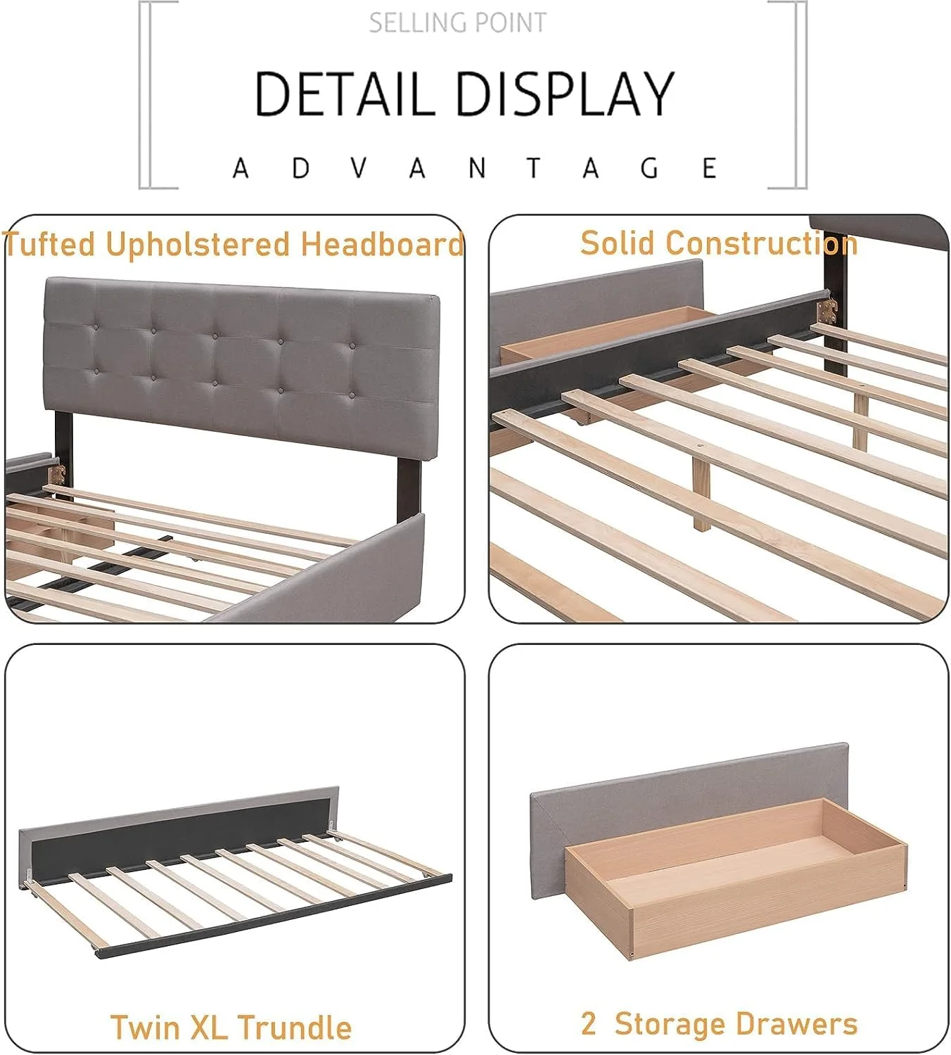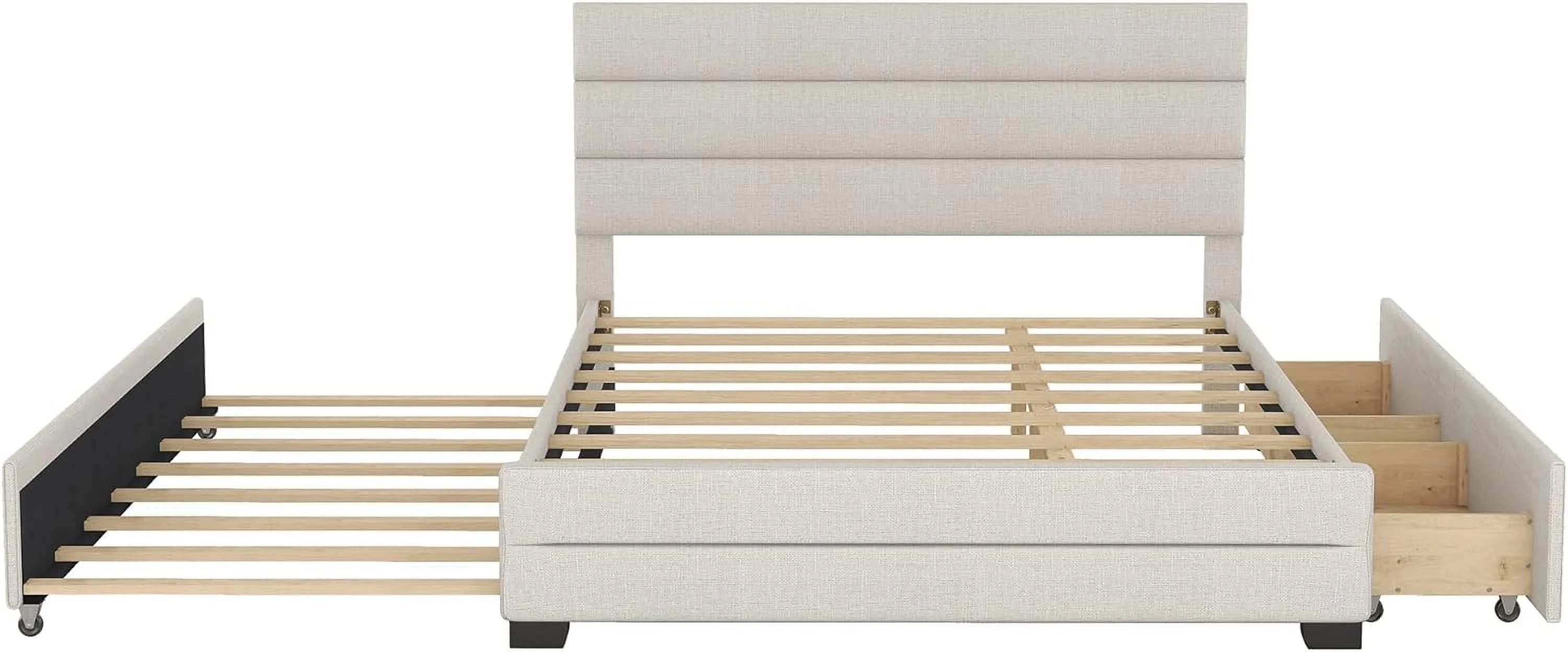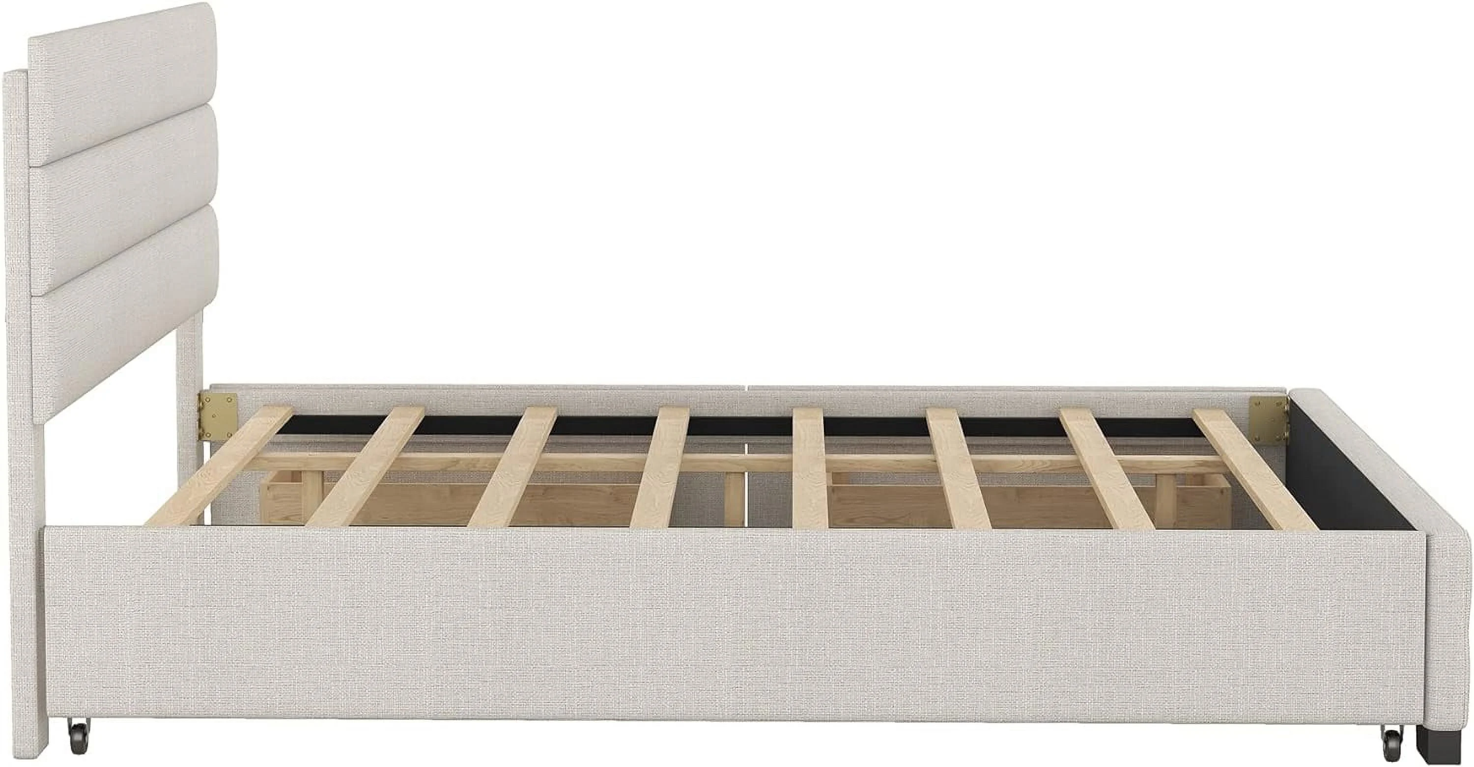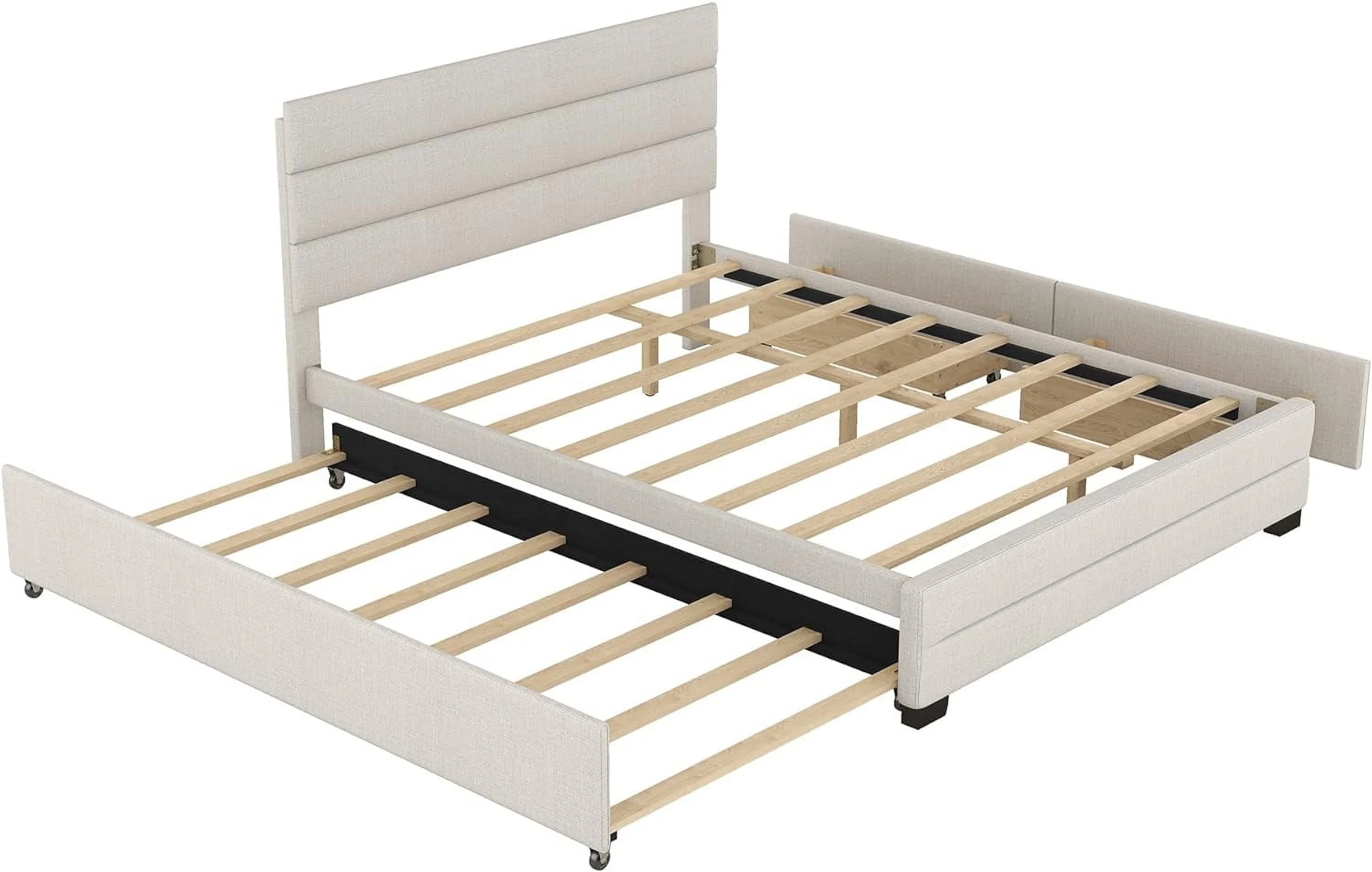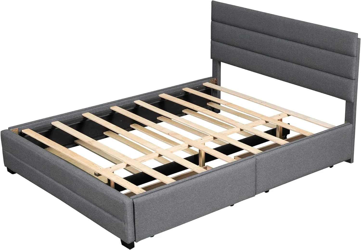 Queen Size Platform Bed, Upholstered Queen Size Bed With Trundle Bed And Drawers, Linen Fabric, Gray