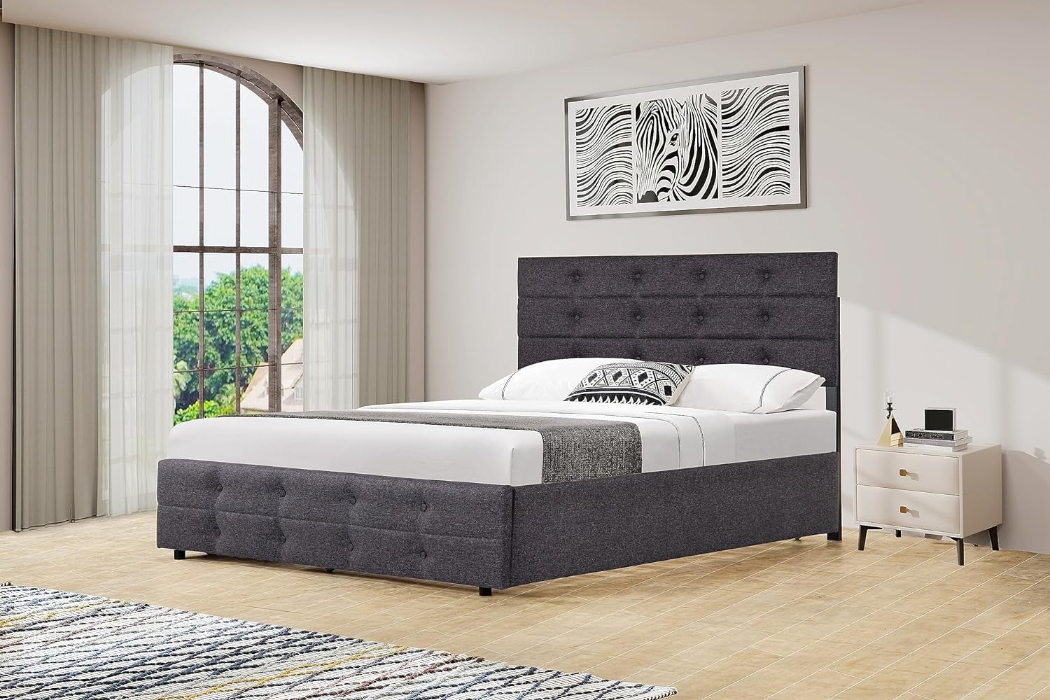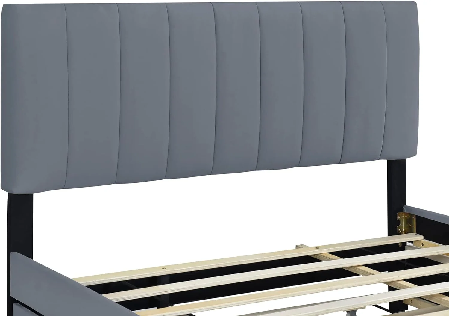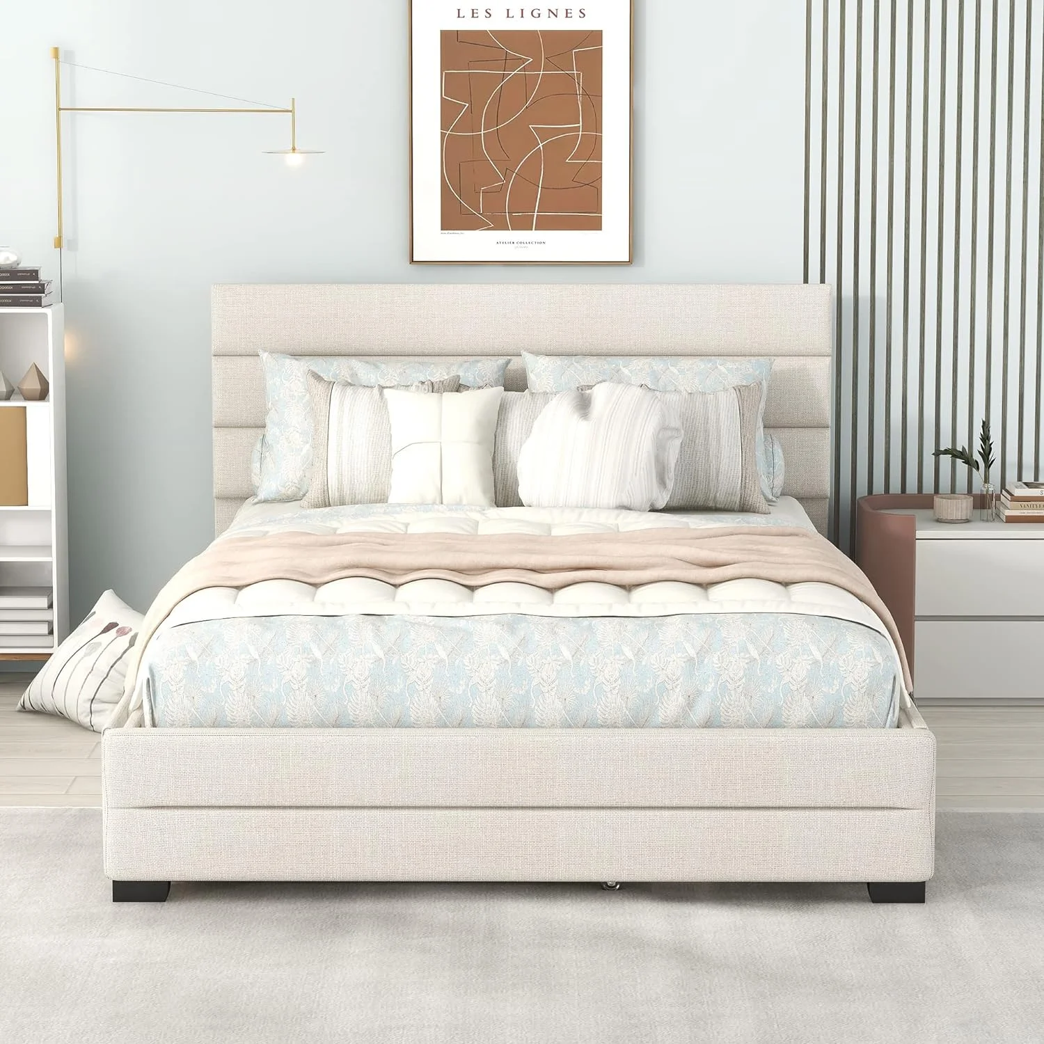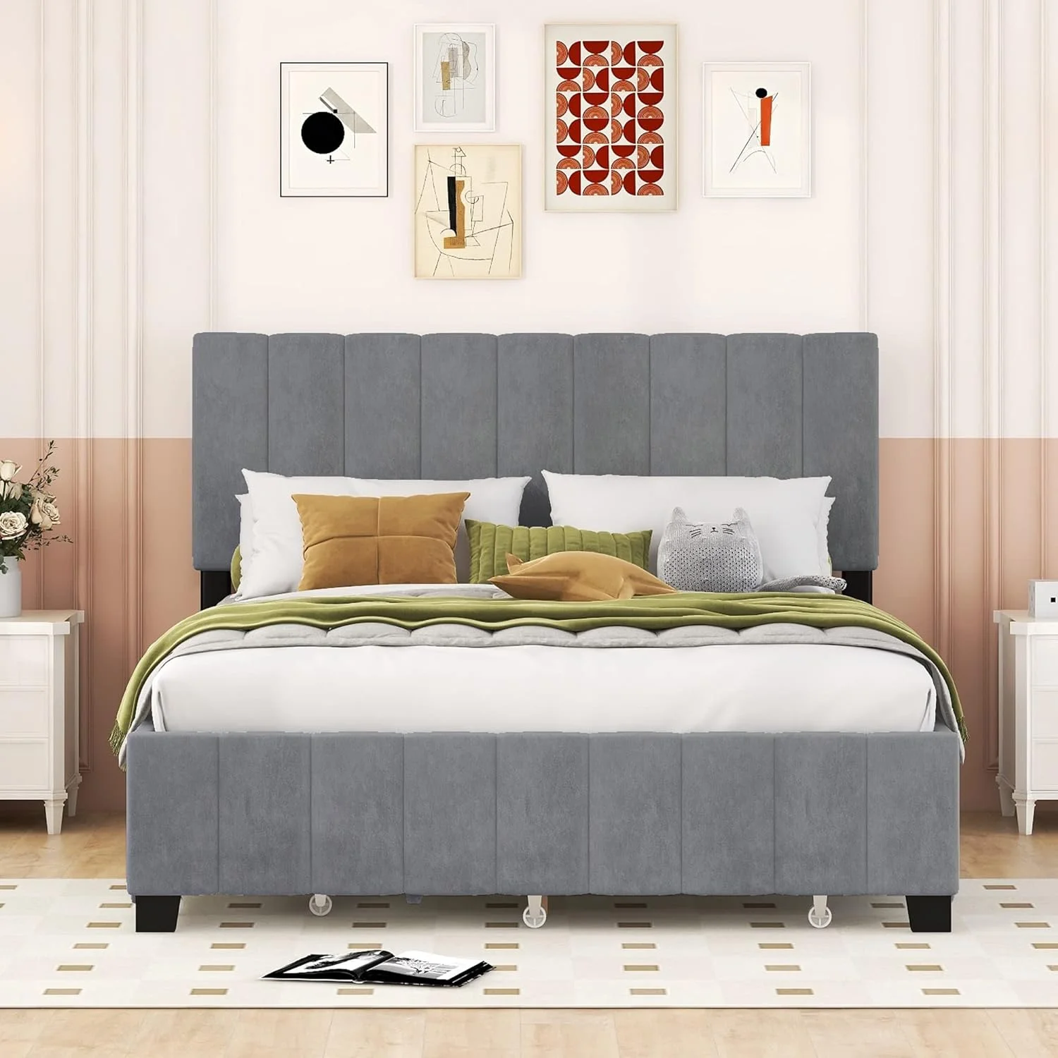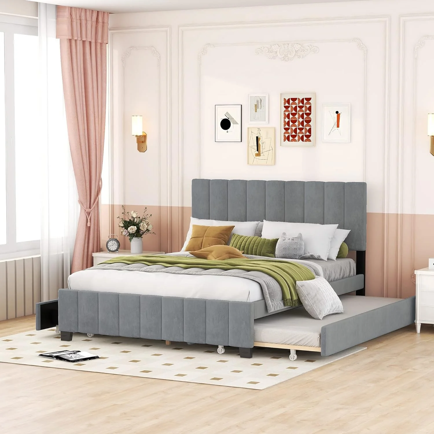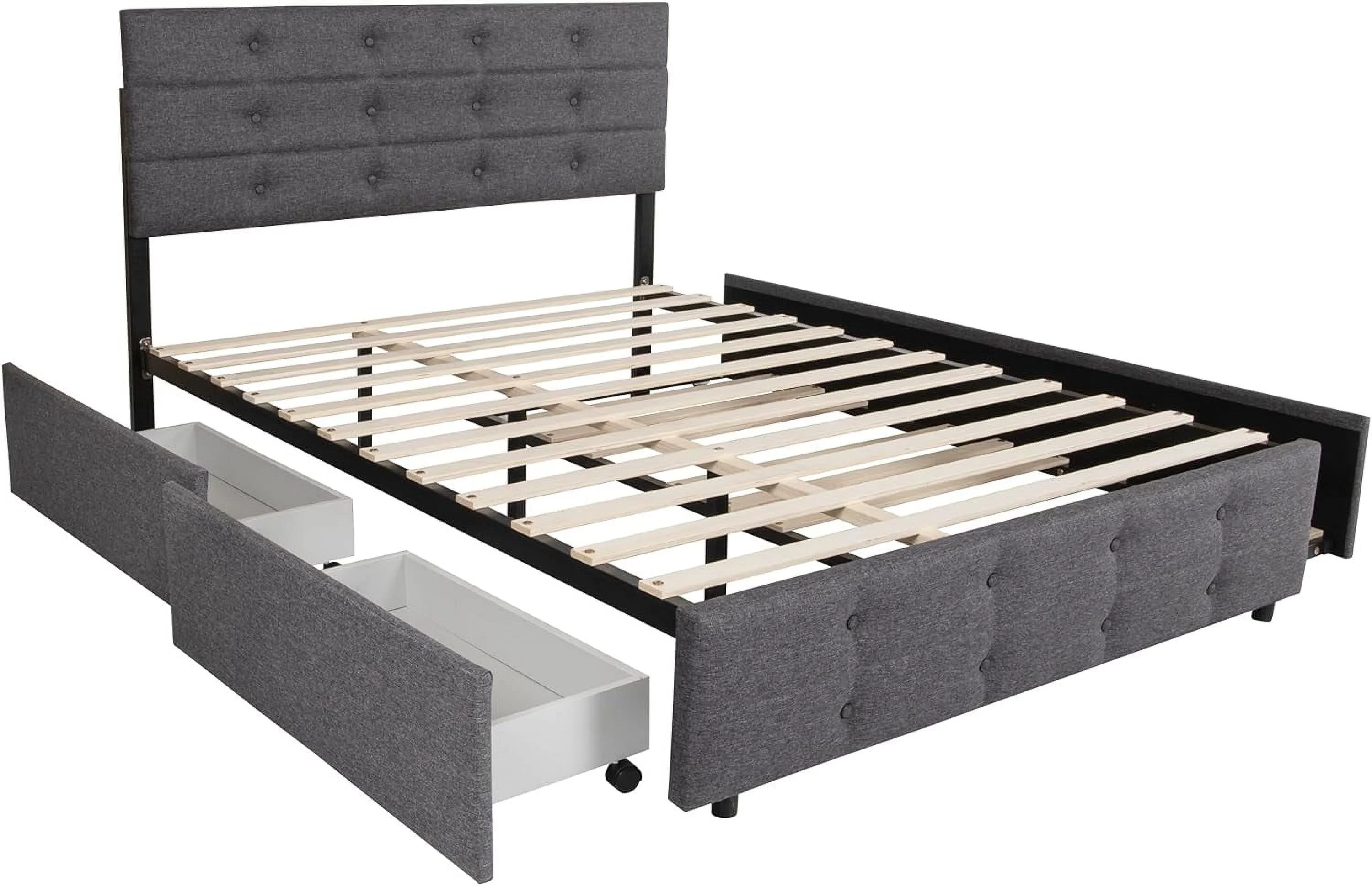 Queen Size Platform Bed, Upholstered Queen Size Bed With Trundle Bed And Drawers, Linen Fabric, Gray