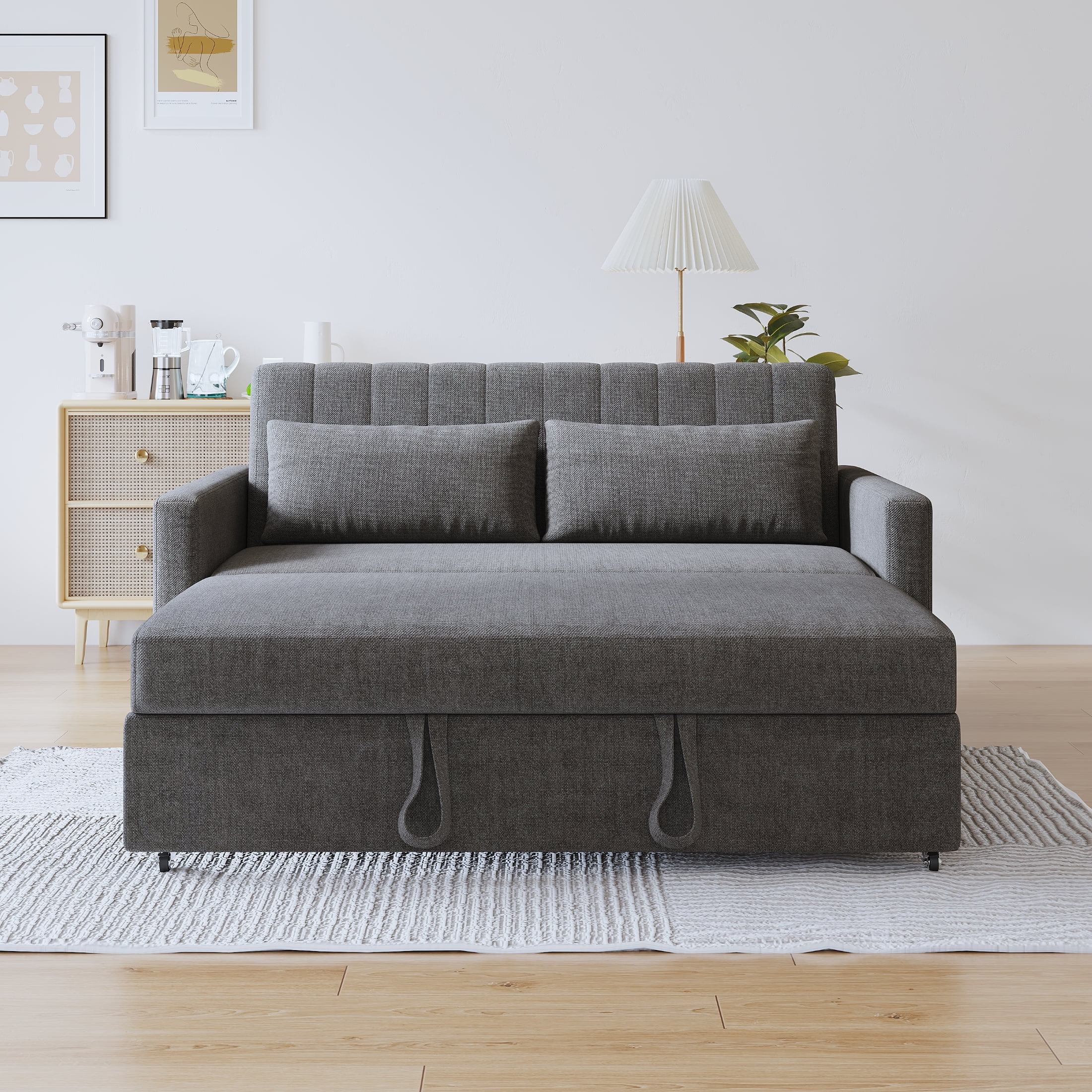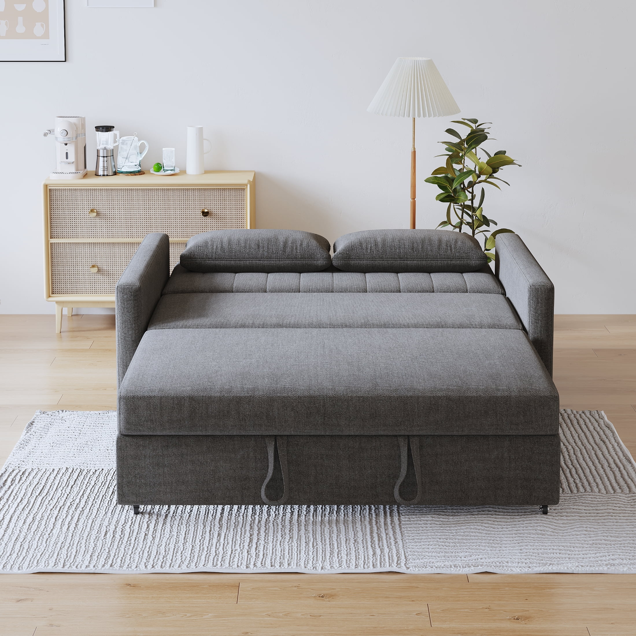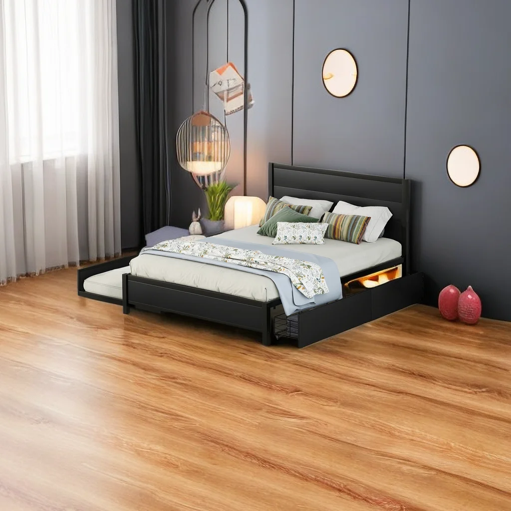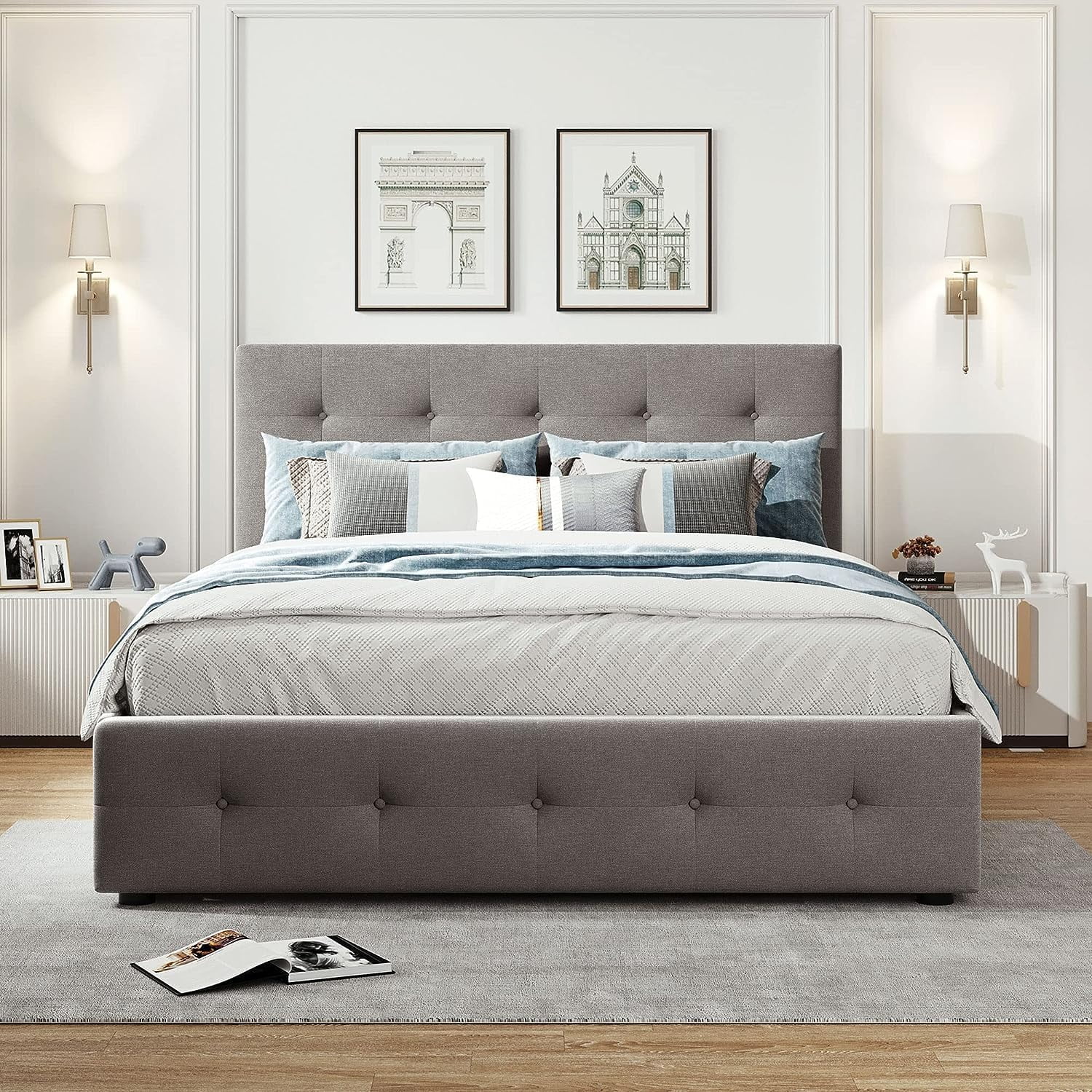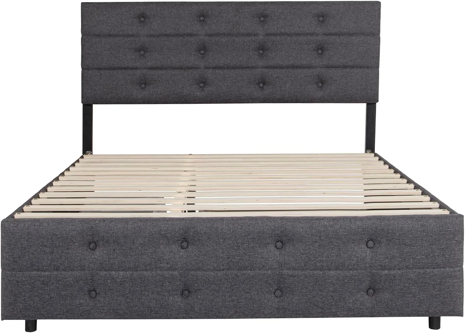 Queen Size Platform Bed, Upholstered Queen Size Bed With Trundle Bed And Drawers, Linen Fabric, Gray