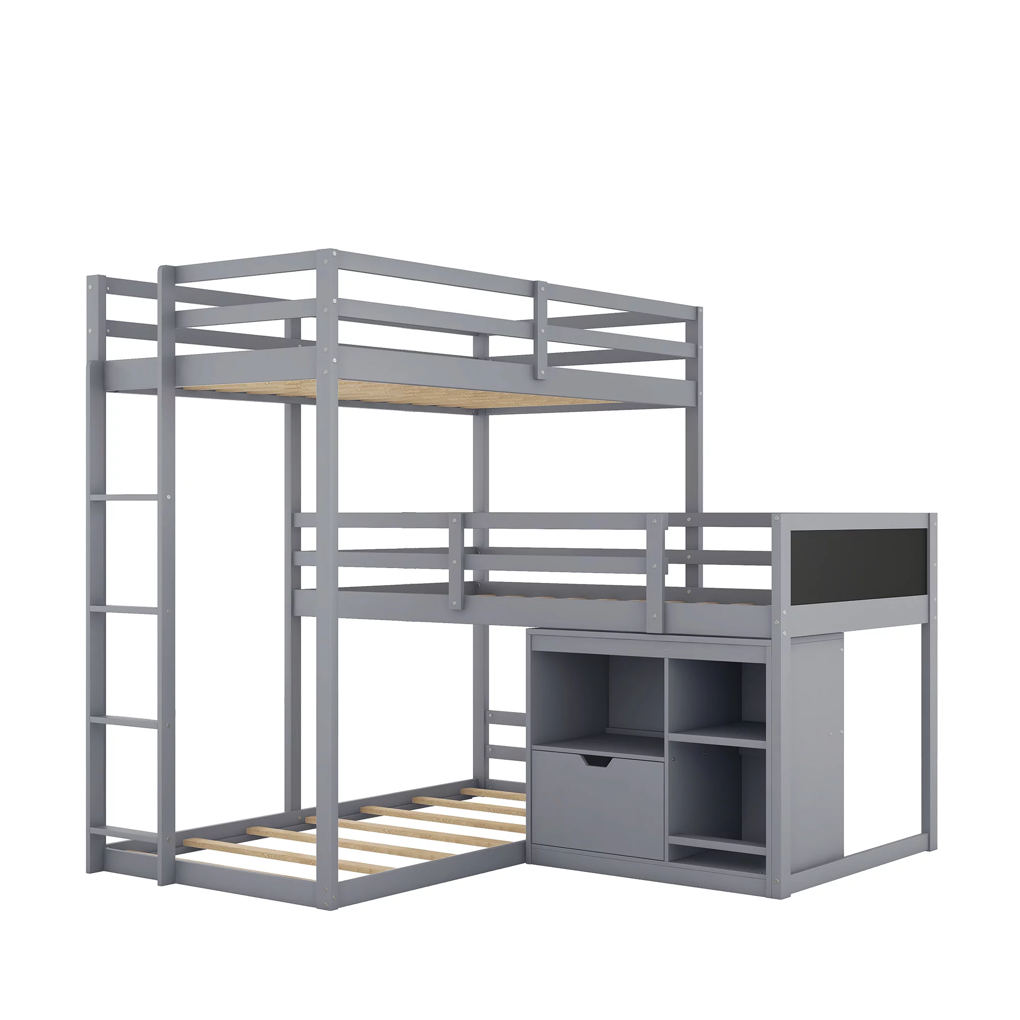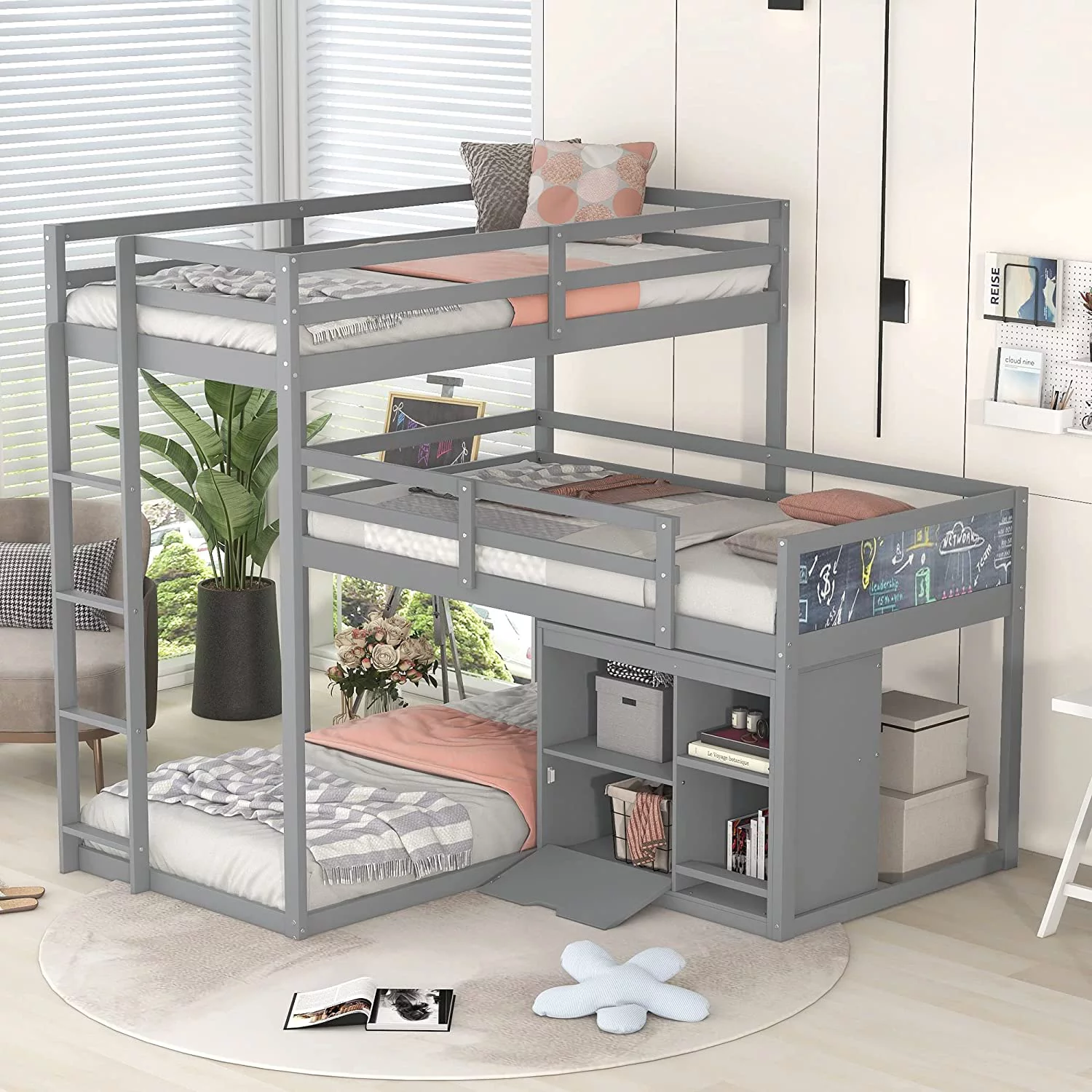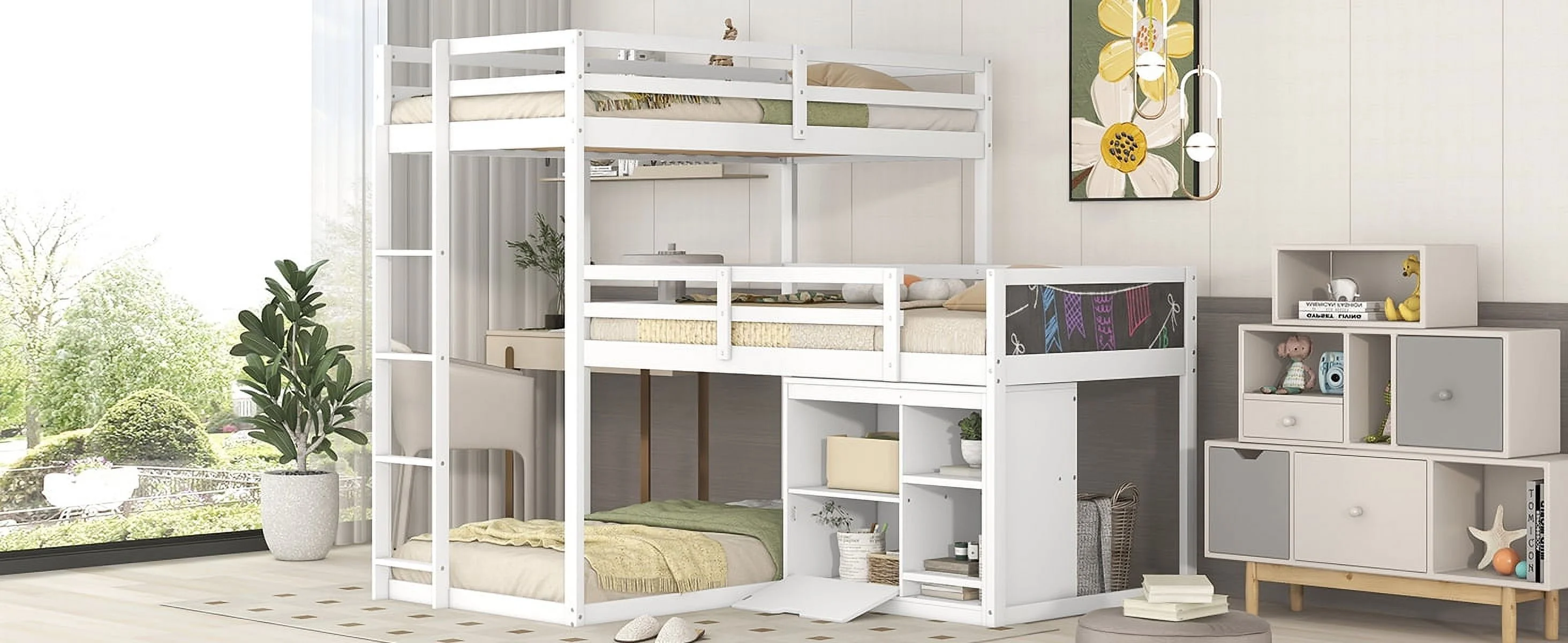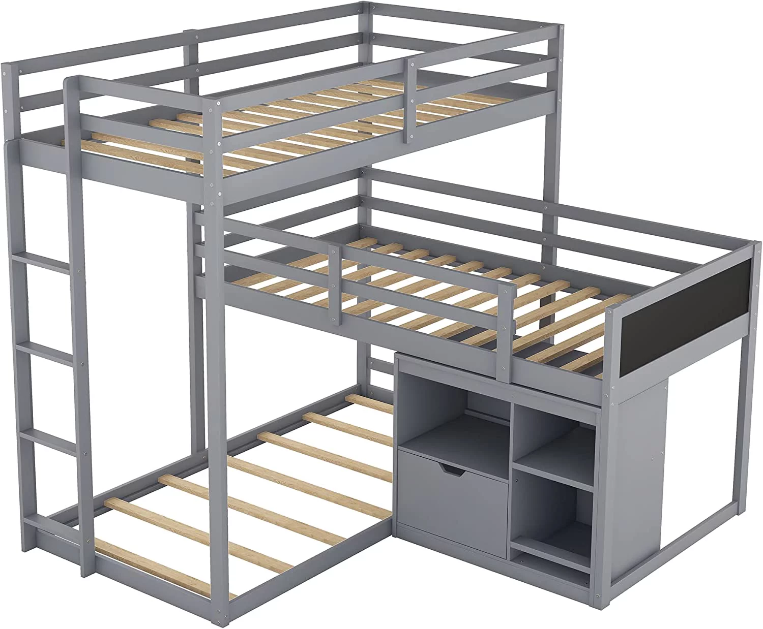 CoSoTower L-Shaped Wood Triple Twin Size Bunk Bed with Storage Cabinet and Blackboard, Ladder, White