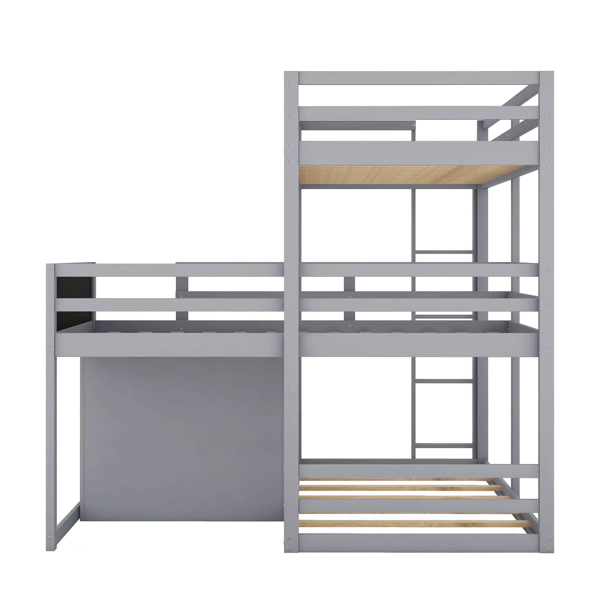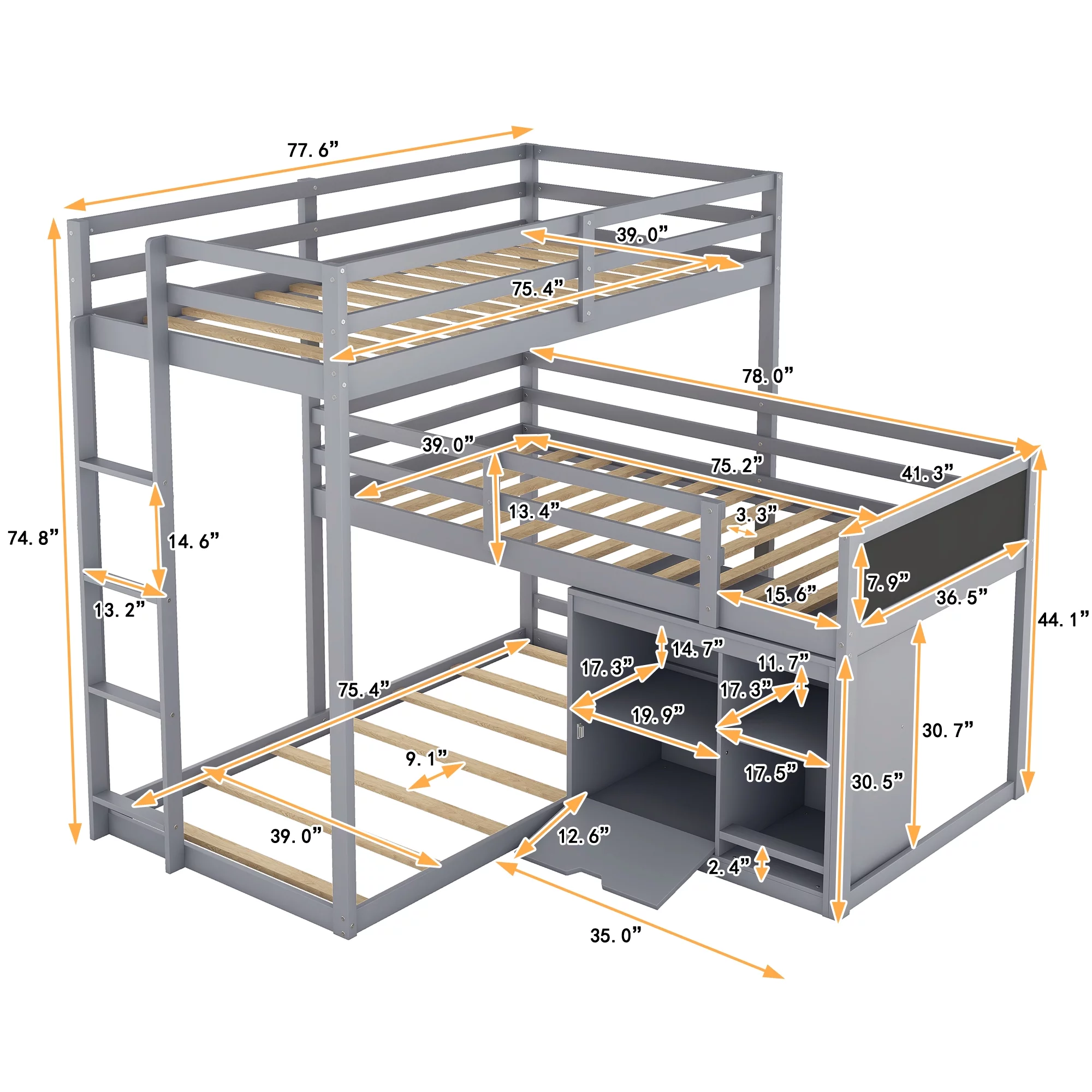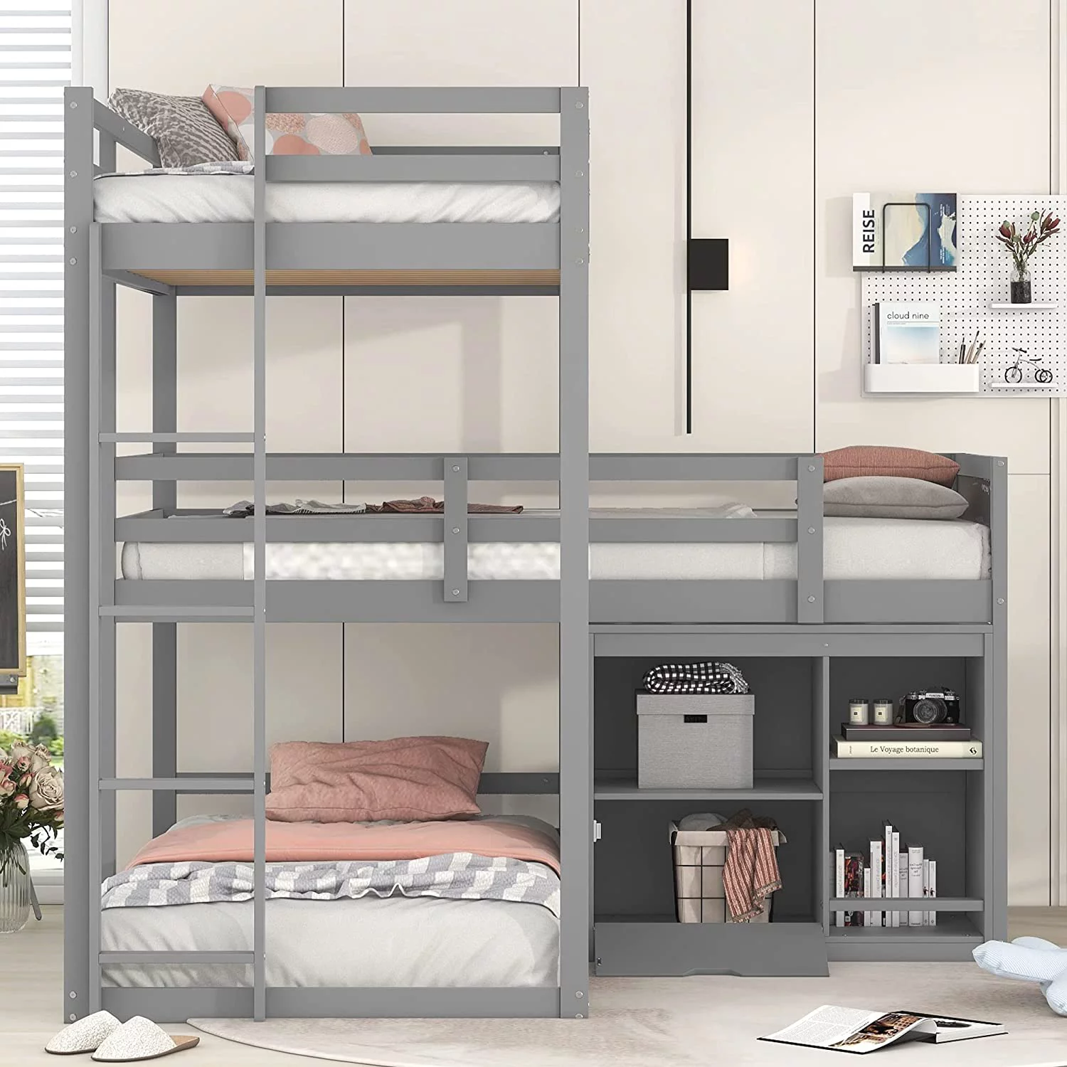 CoSoTower L-Shaped Wood Triple Twin Size Bunk Bed with Storage Cabinet and Blackboard, Ladder, White