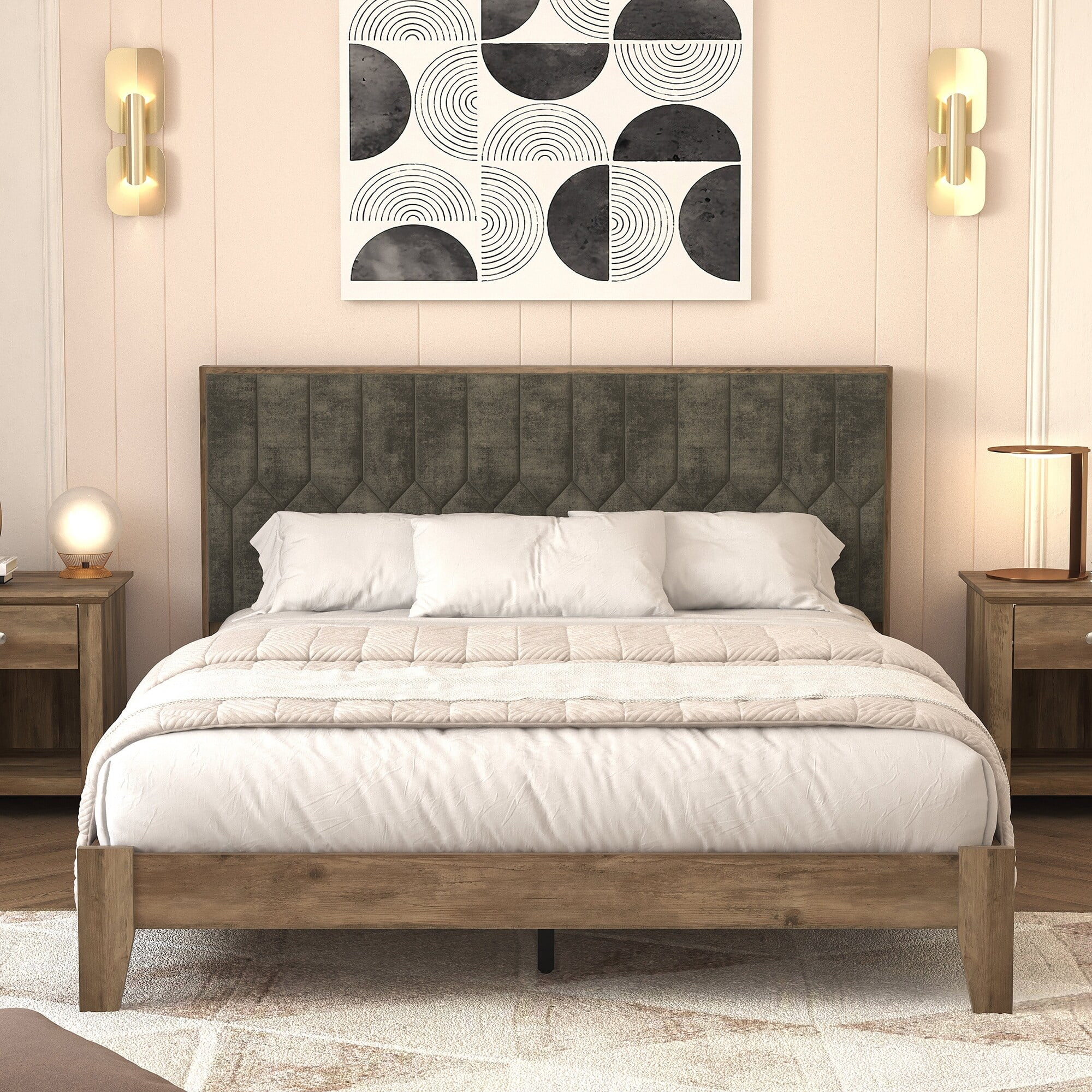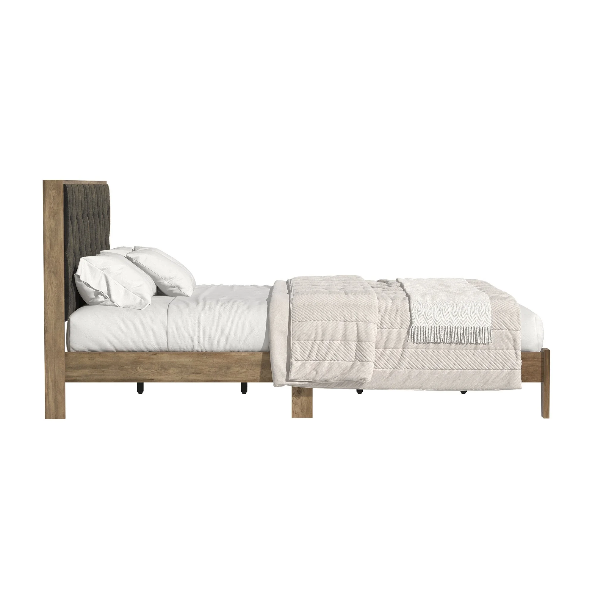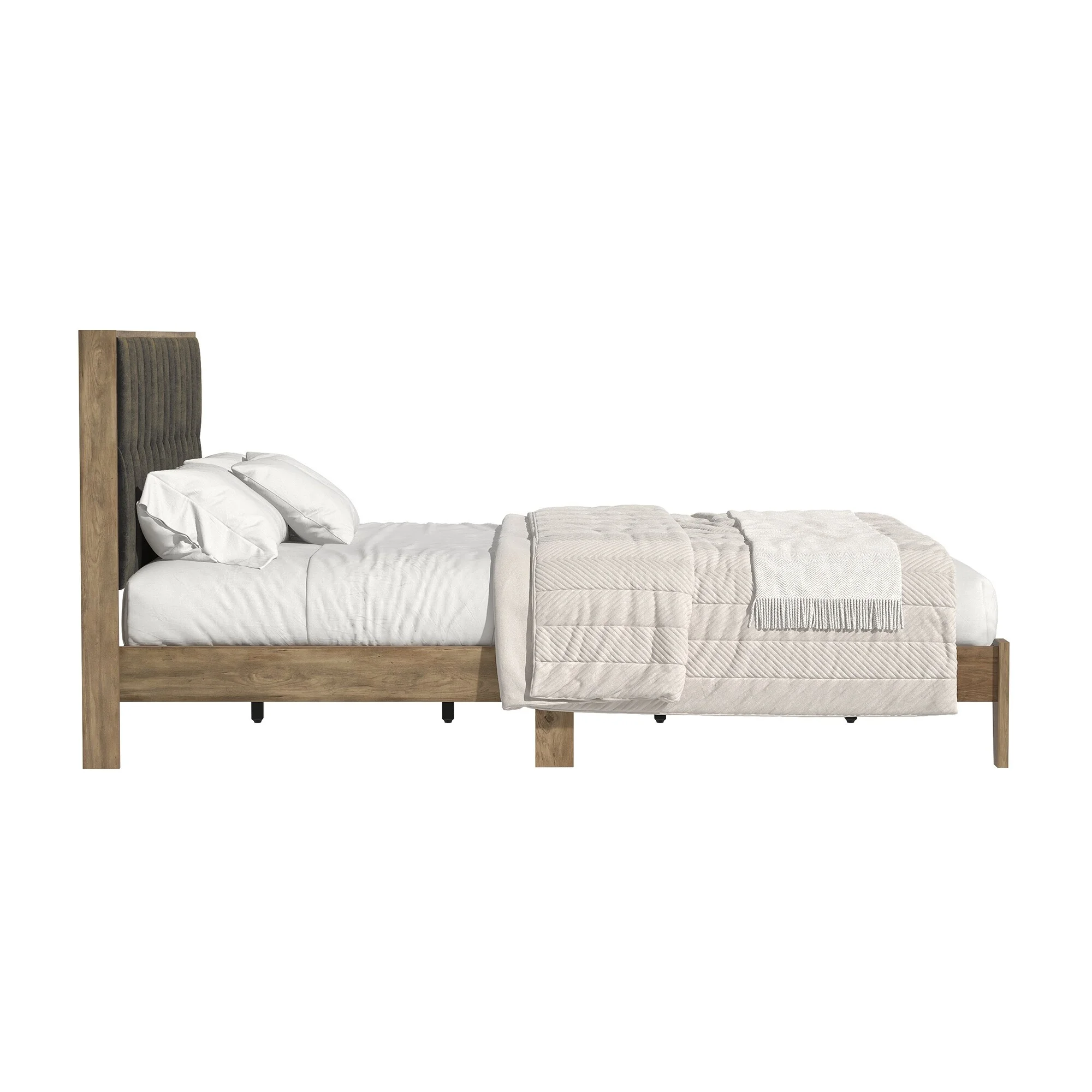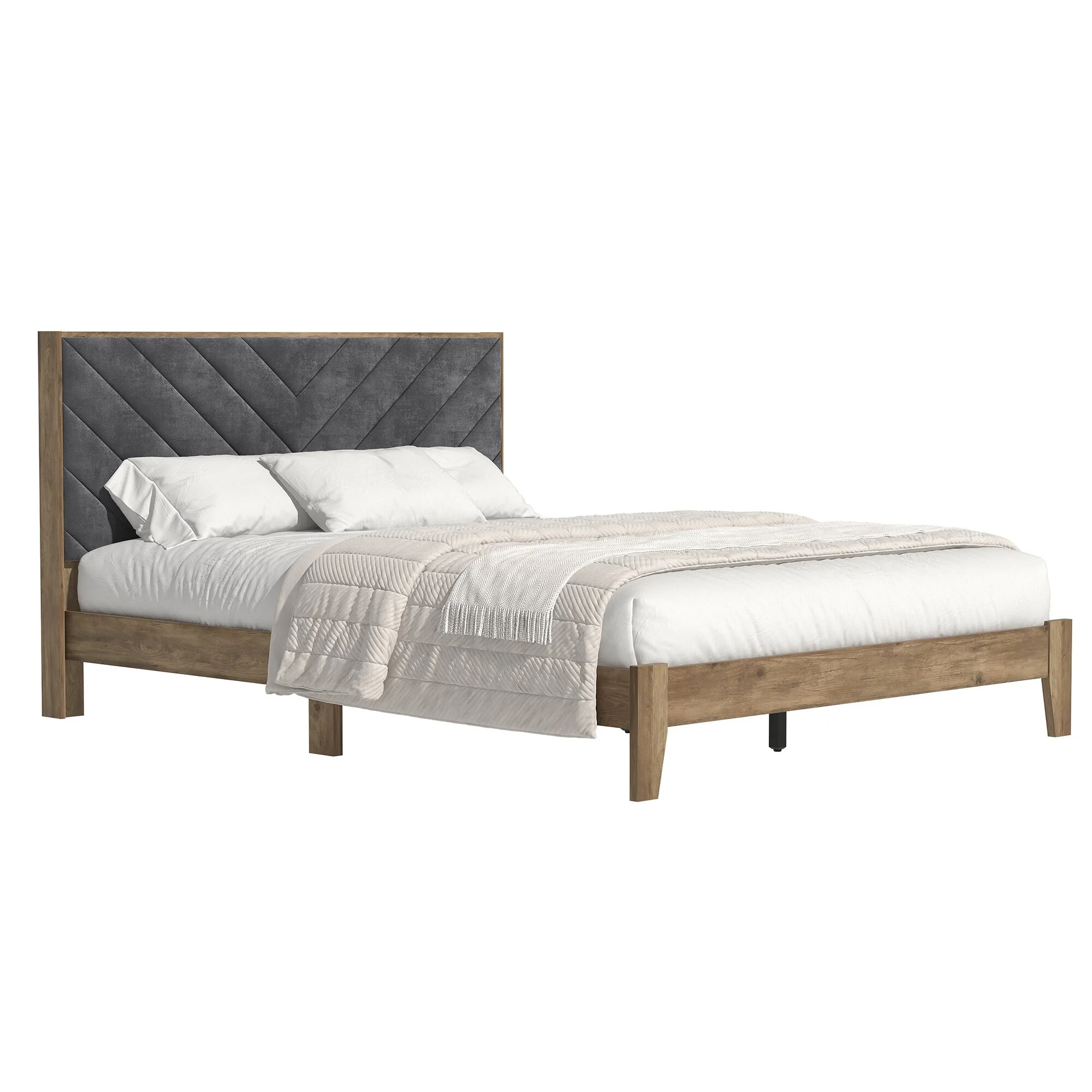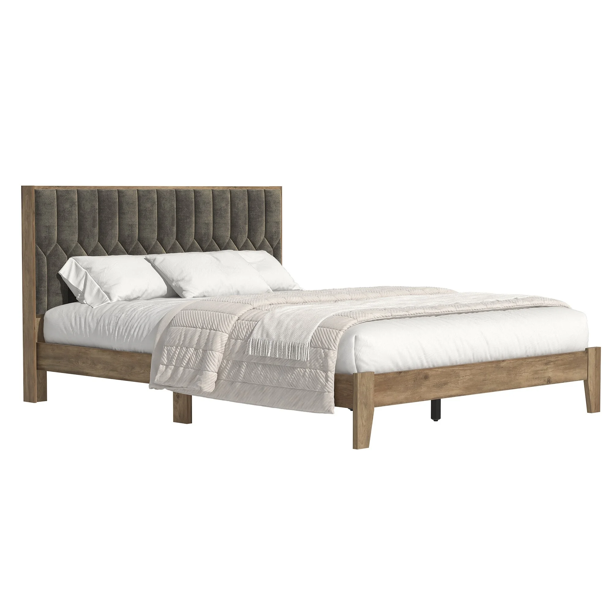 GALANO Vancus Knotty Oak with Velvet Grey Upholstered Queen Platform Bed with Headboard
