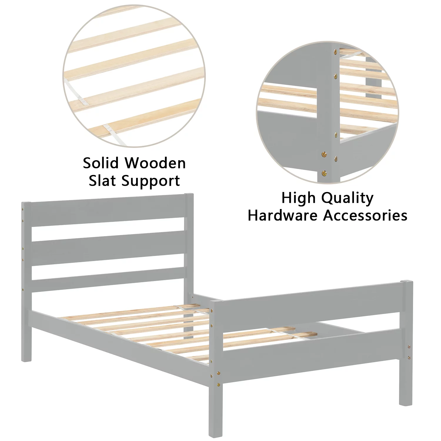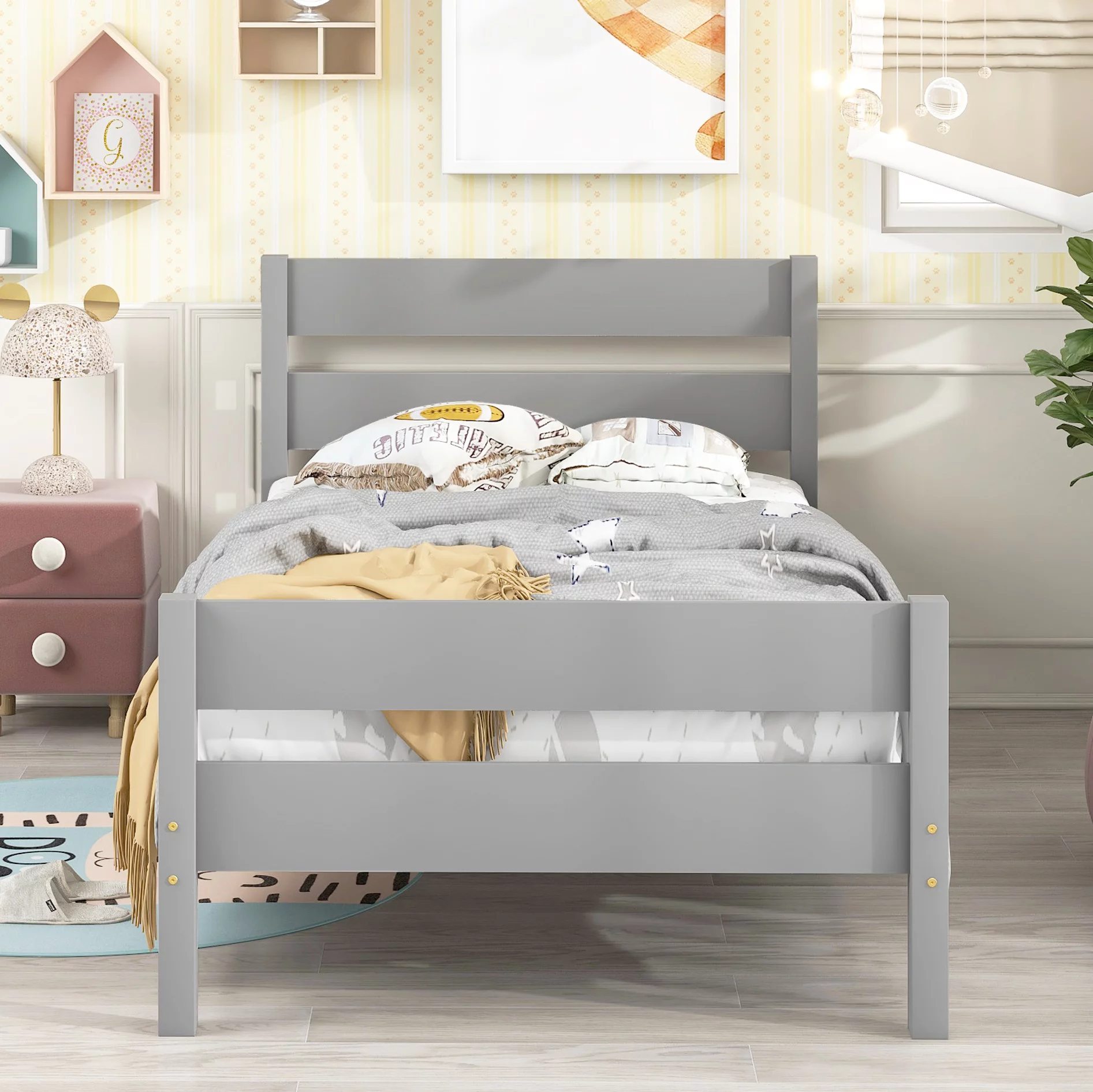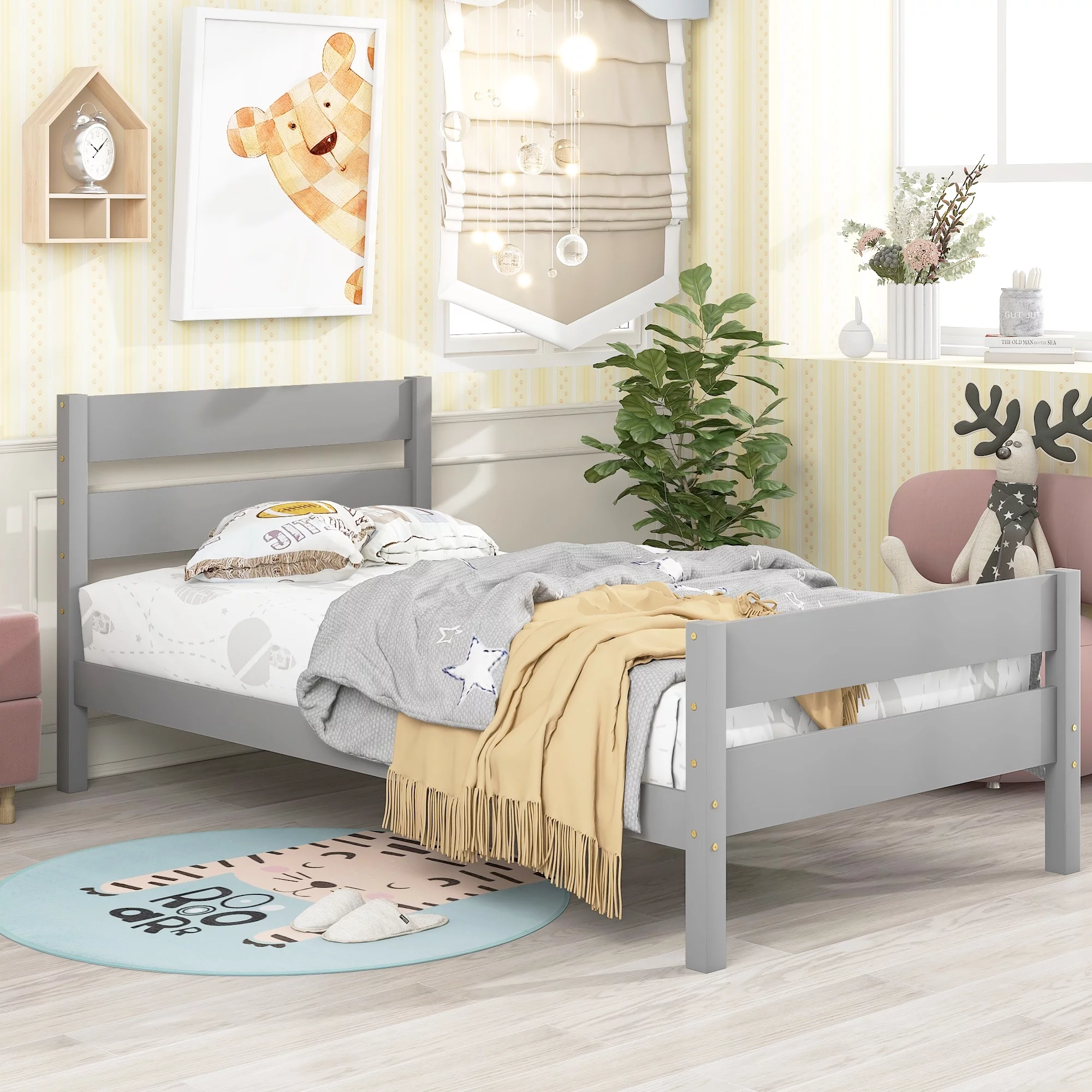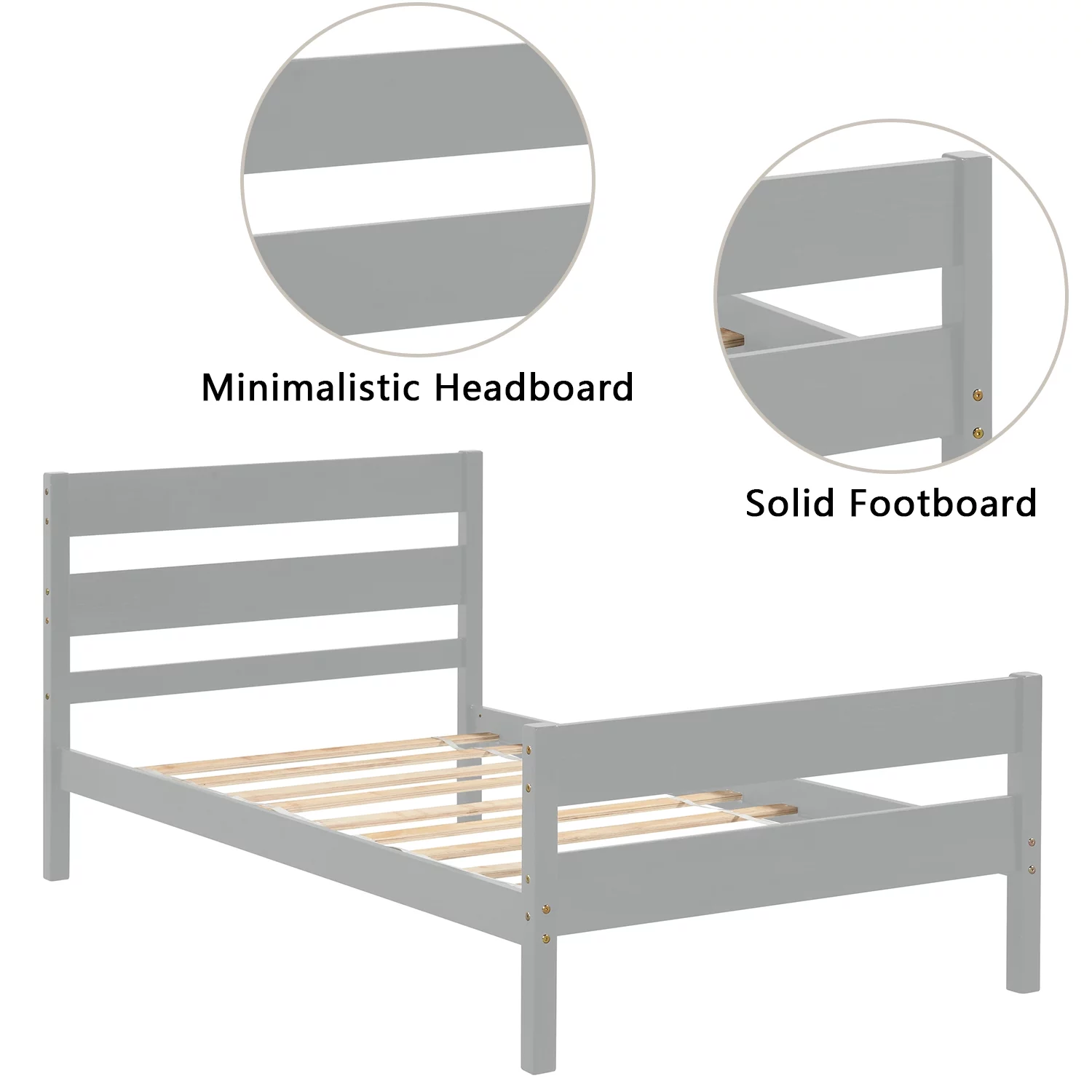 iRerts Twin Size Wood Platform Bed Frame with Headboard, Solid Pine Wood Kids Bed Frame w/ Strong Slat Support, Gray
