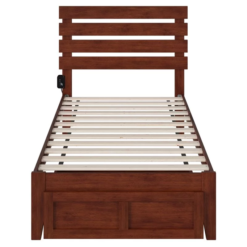 Pemberly Row Farmhouse Wood Twin Bed with Foot Drawer and USB Charger in Walnut