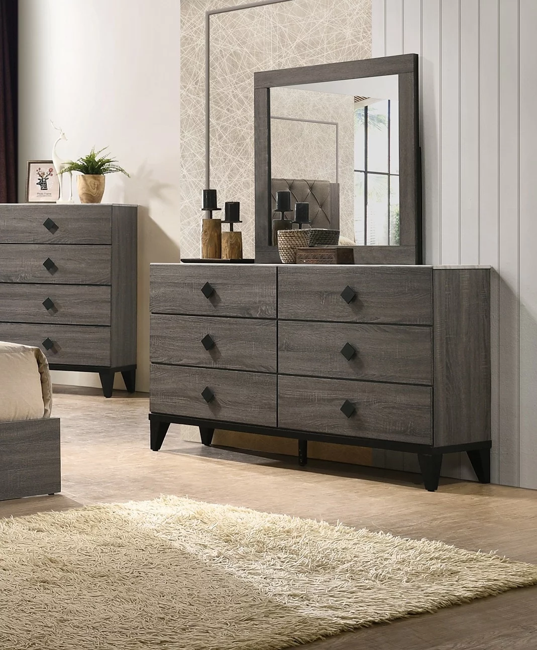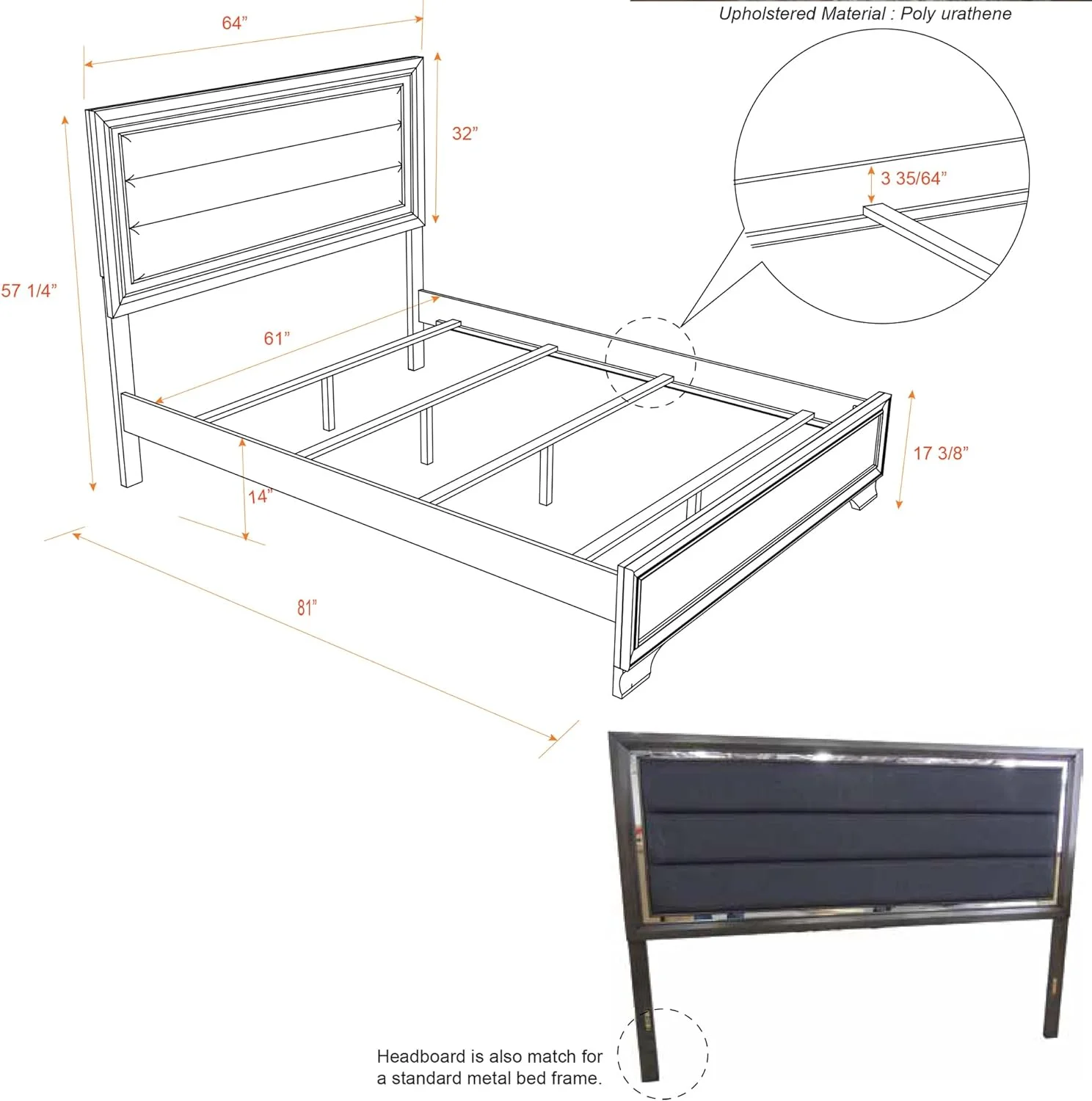 Wooden And Upholstered Tufted Headboard Queen Size Bed Dresser Mirror Nightstand Unique drawers Handles 4pc Bedroom Furniture