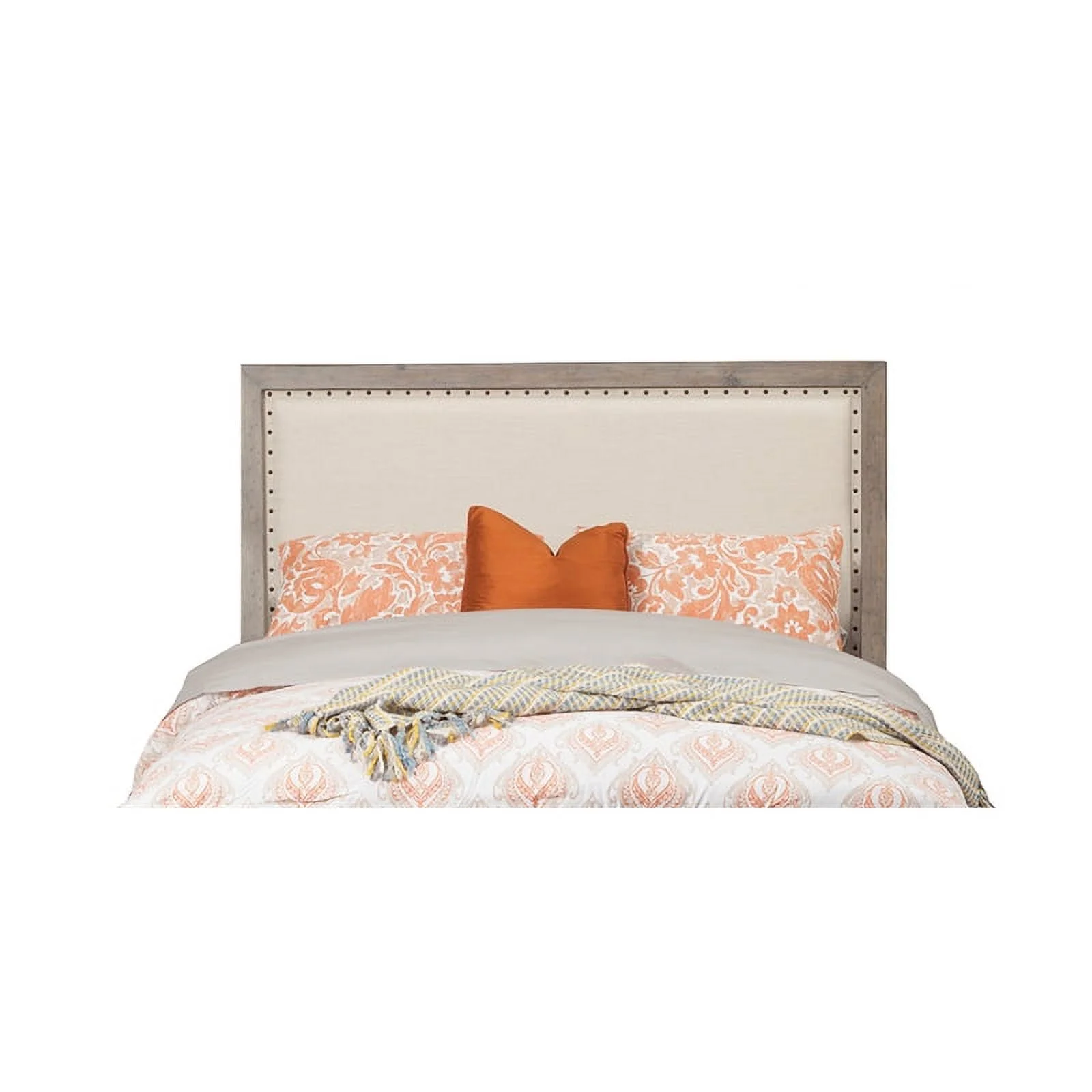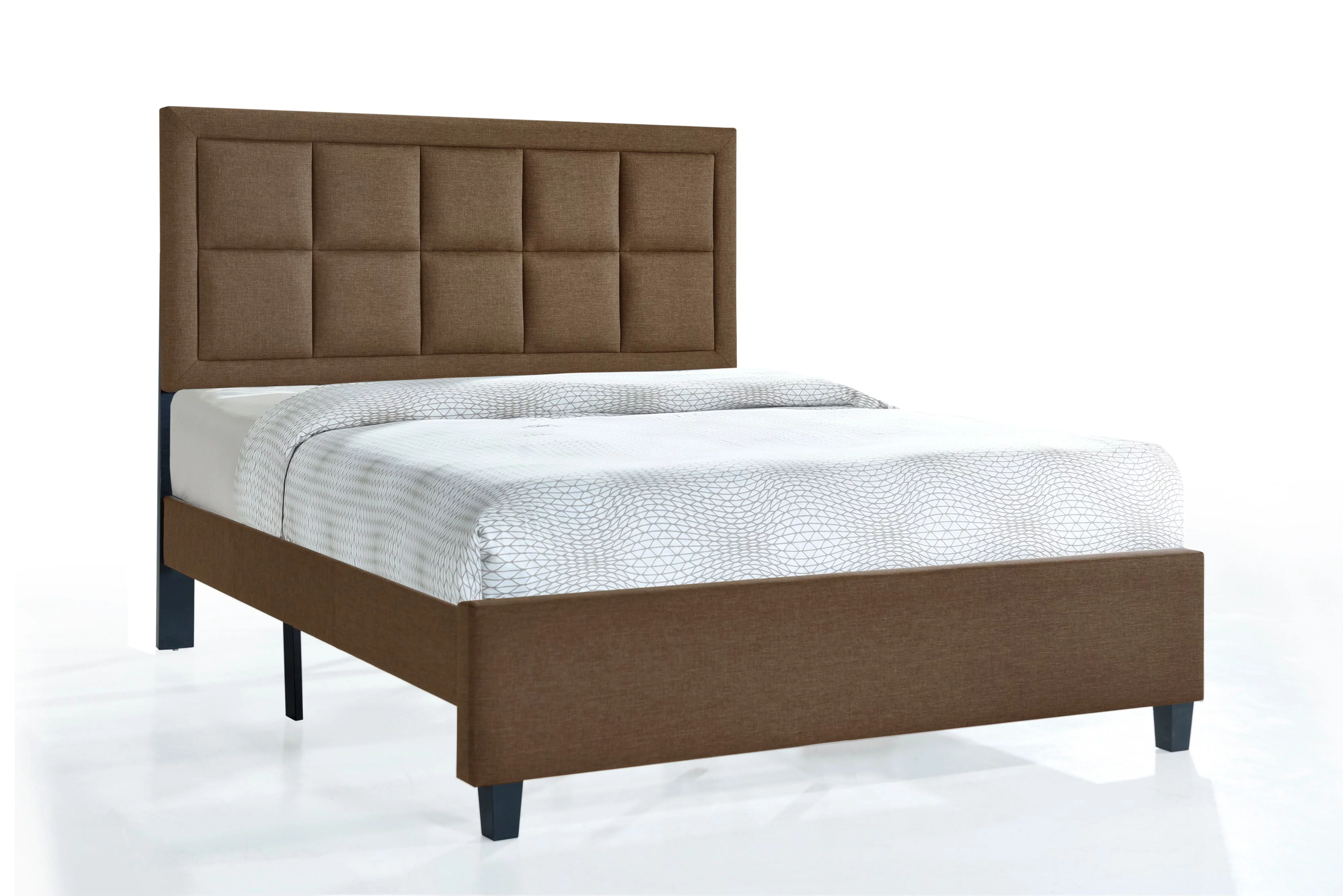Queen Size Wooden Bedroom Set includes Fabric Cushion Headboard, Footboard, Dresser, Mirror, Chest, Nightstand in Warm Brown