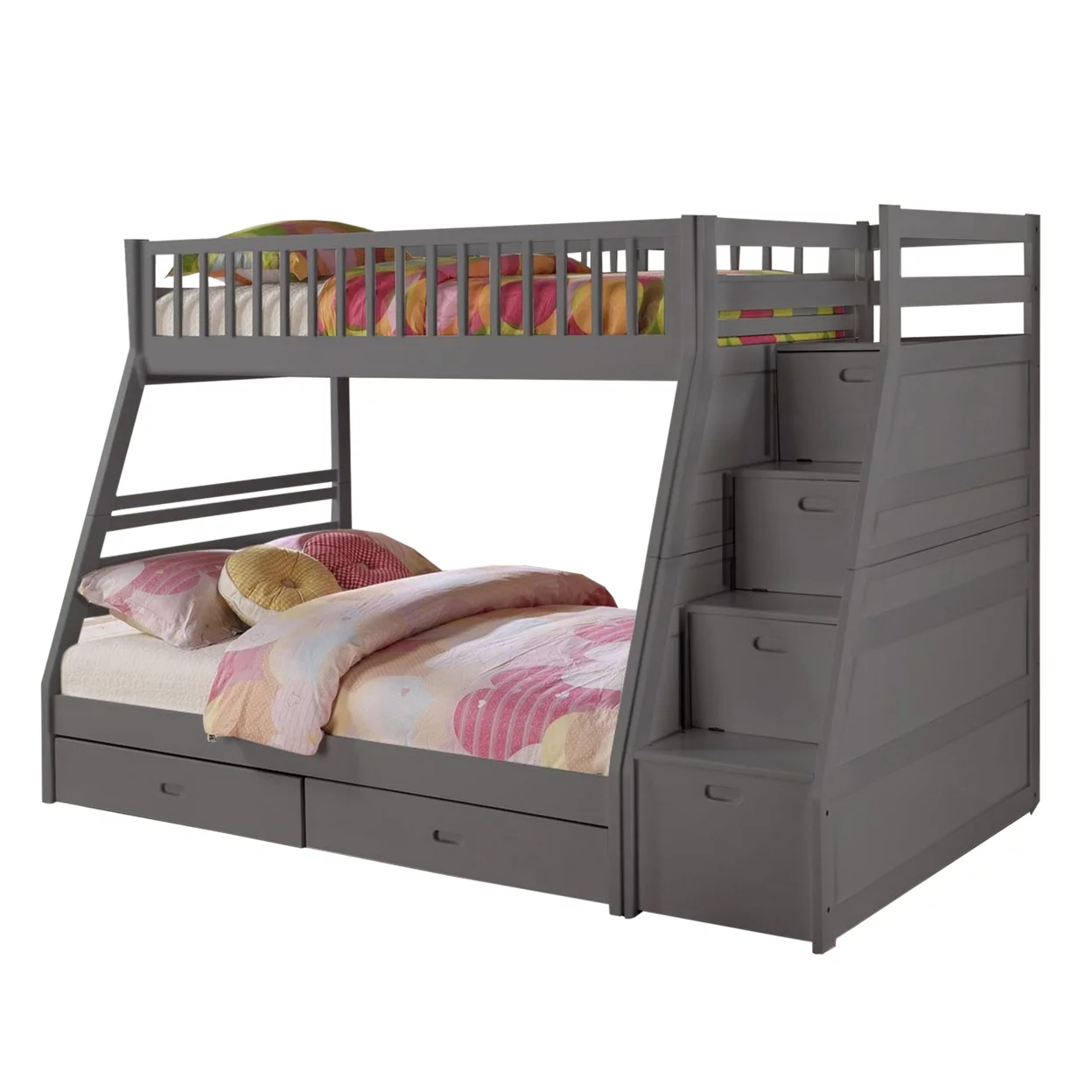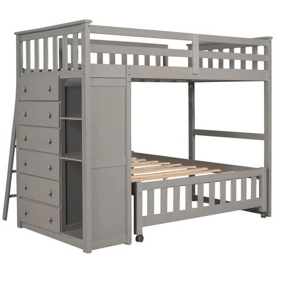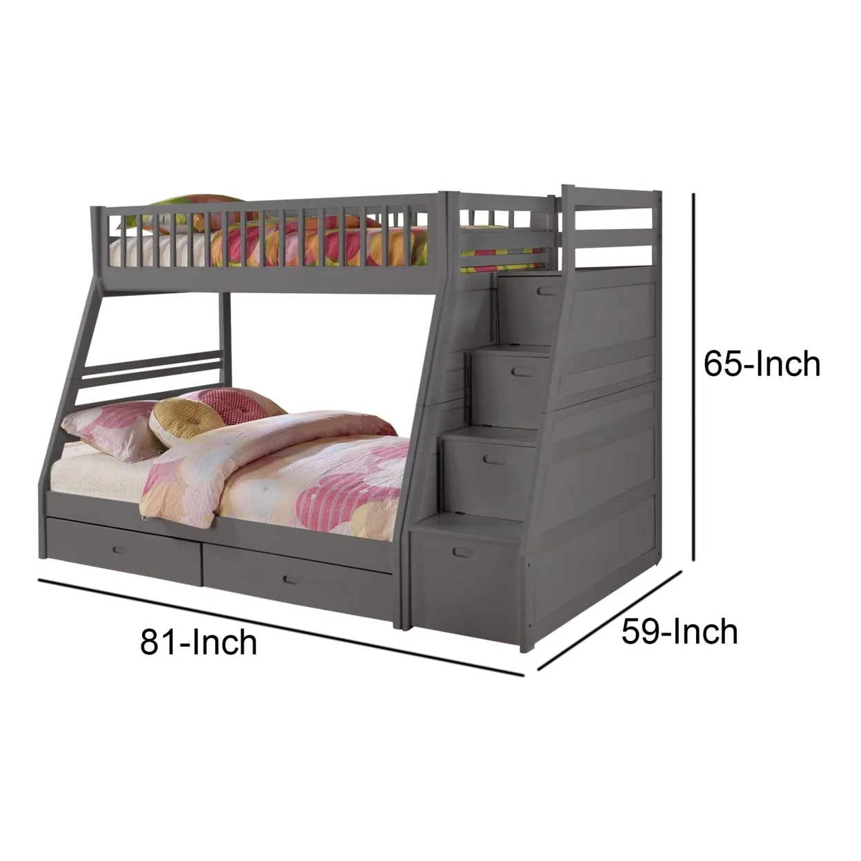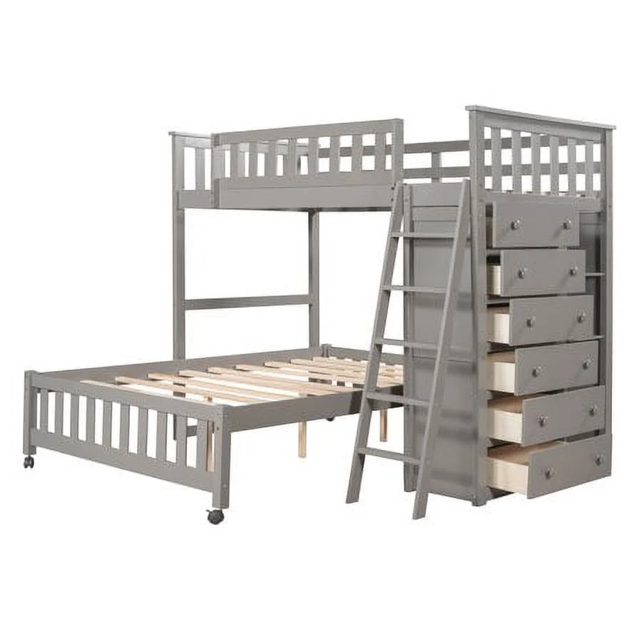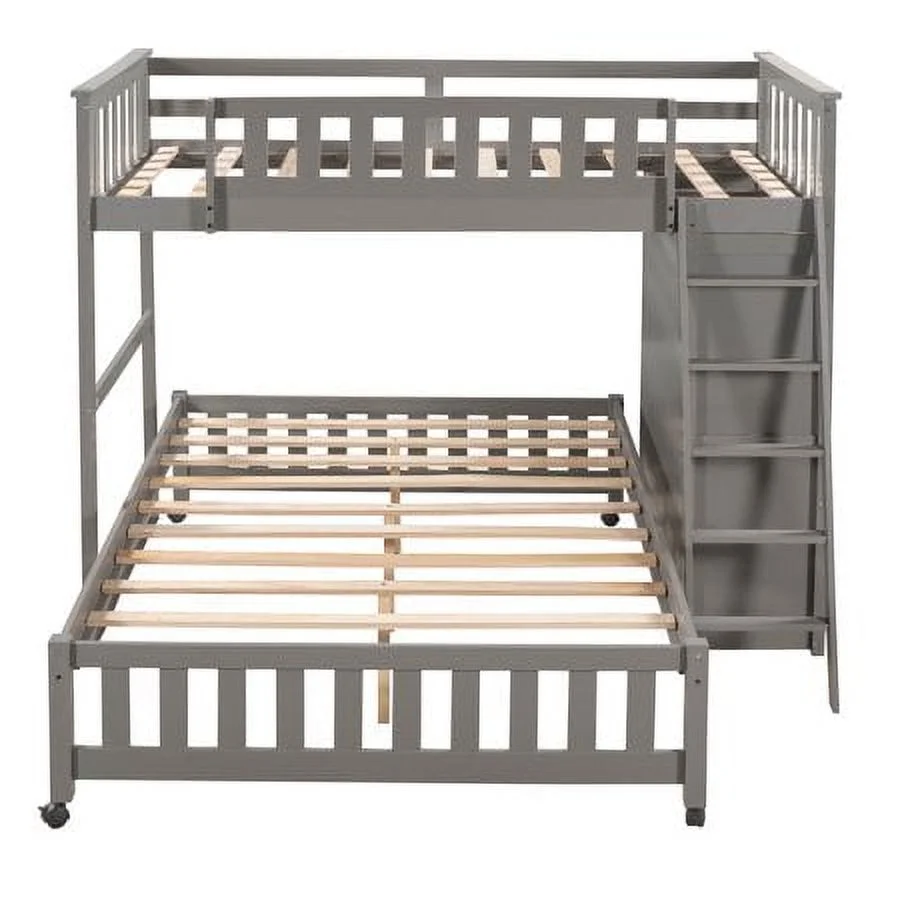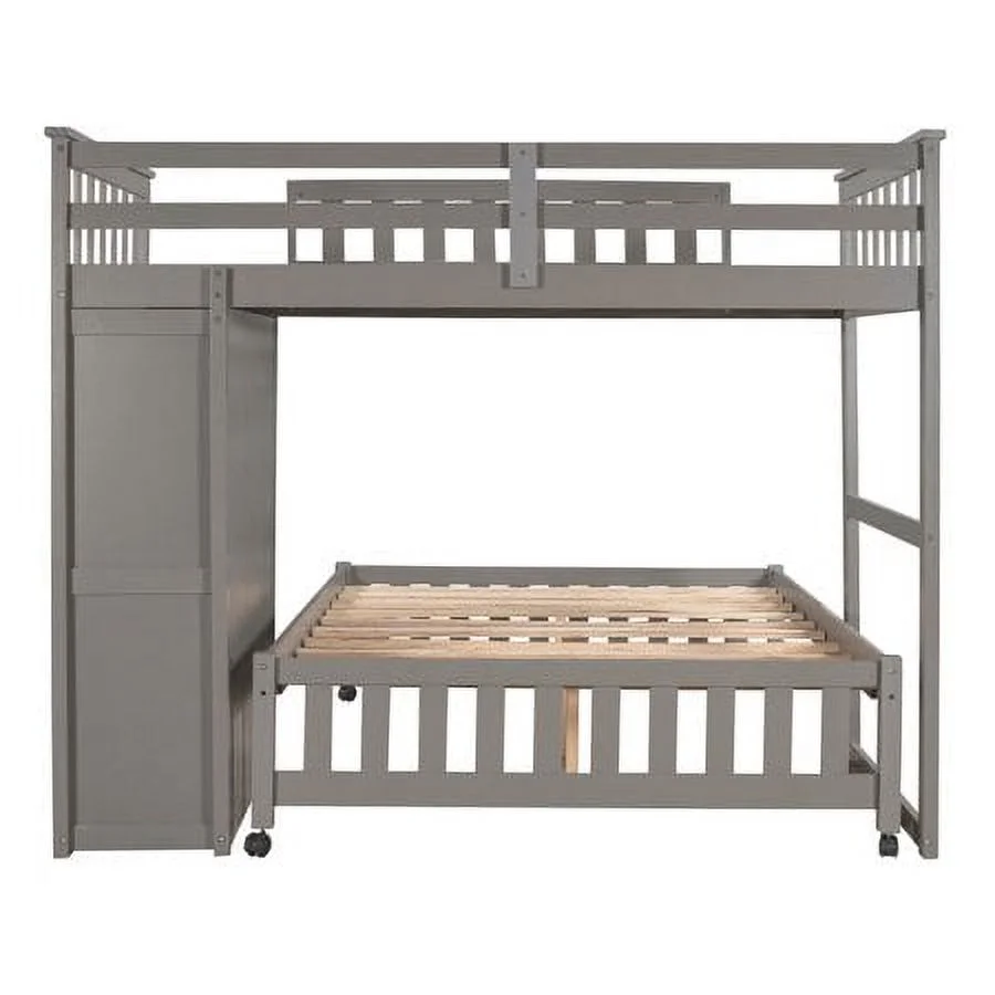2 Drawer Wooden Twin Over Full Bunk Bed with Storage Staircase, Gray- Saltoro Sherpi
