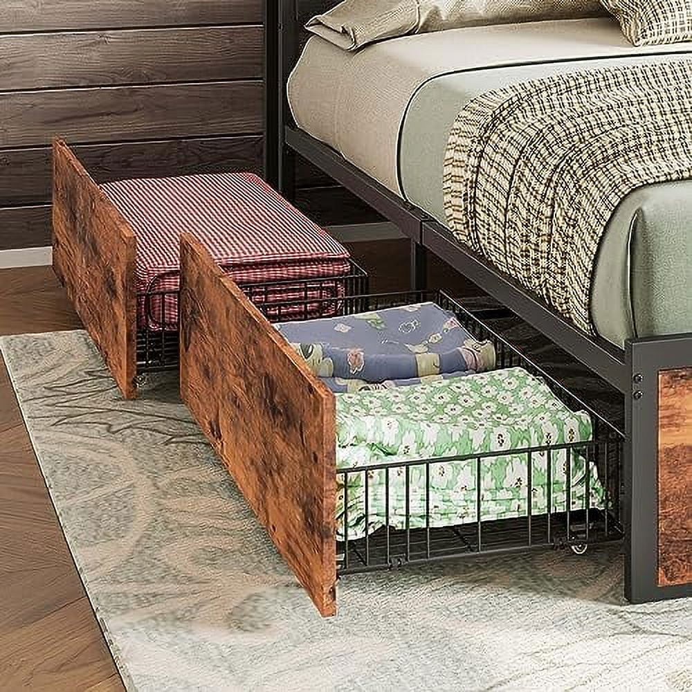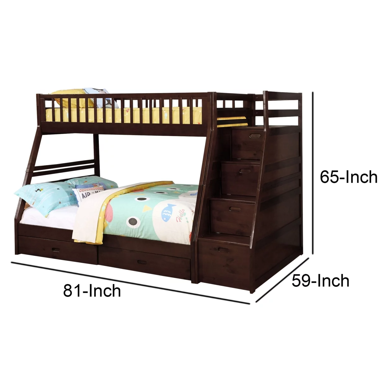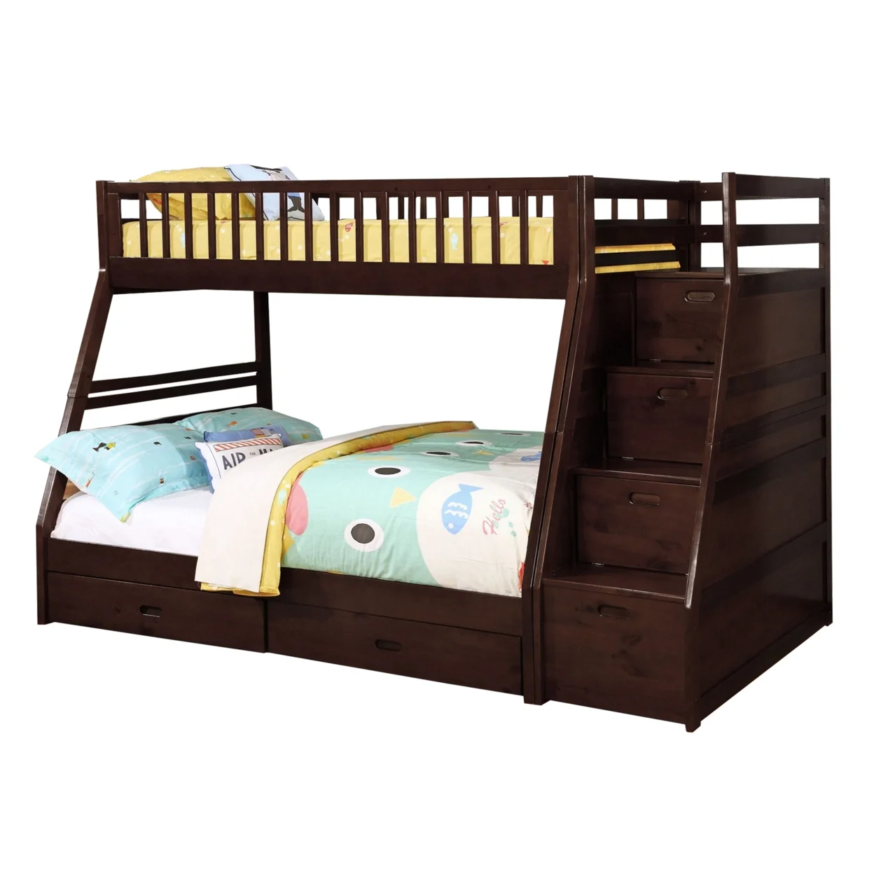 2 Drawer Wooden Twin Over Full Bunk Bed with Storage Staircase, Brown- Saltoro Sherpi