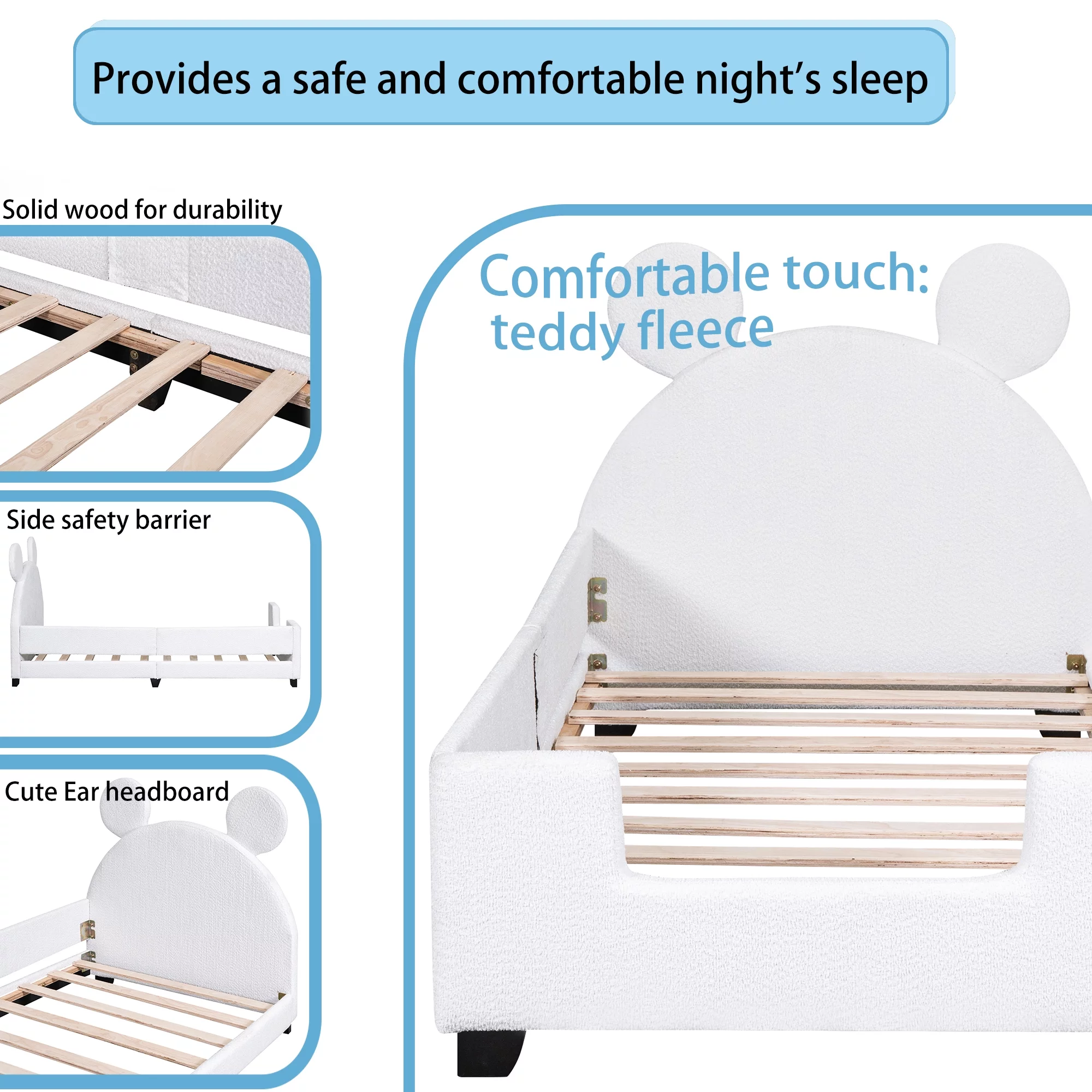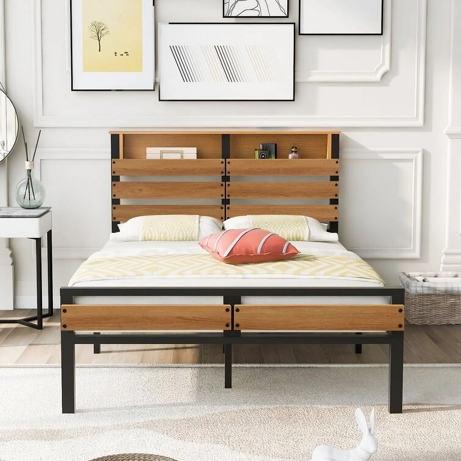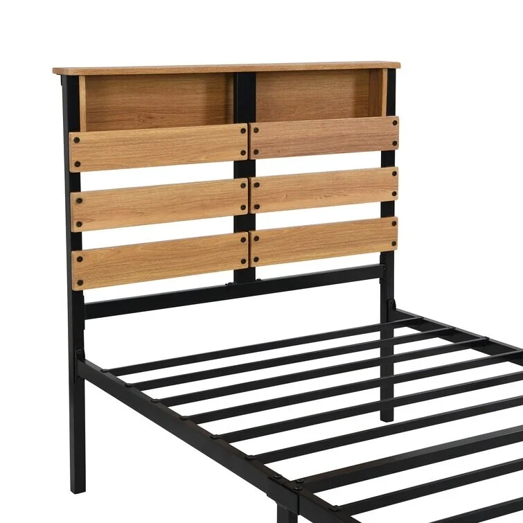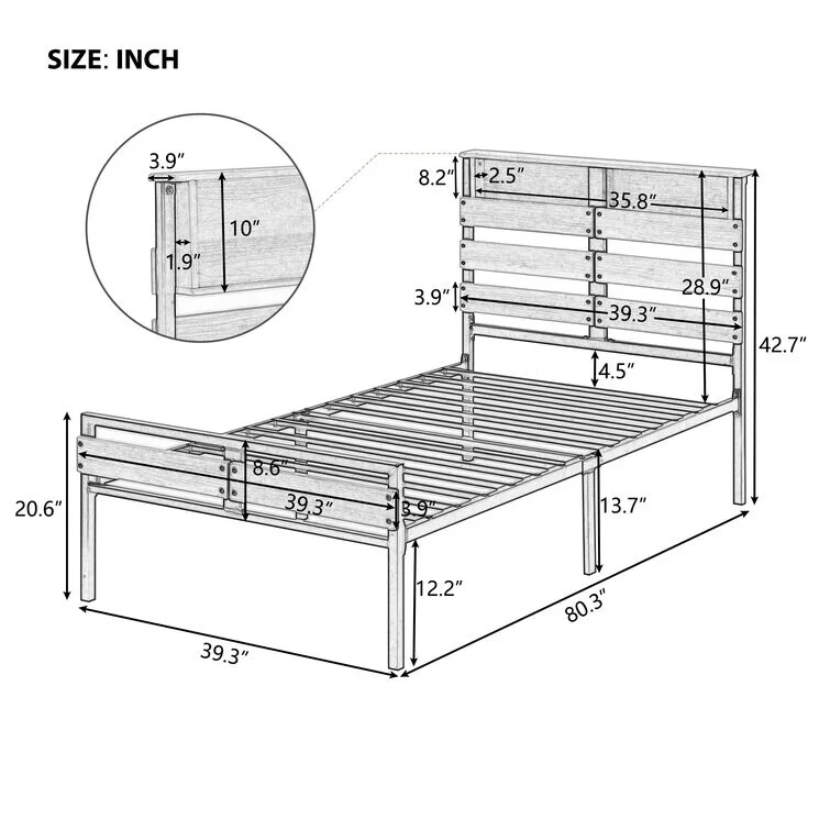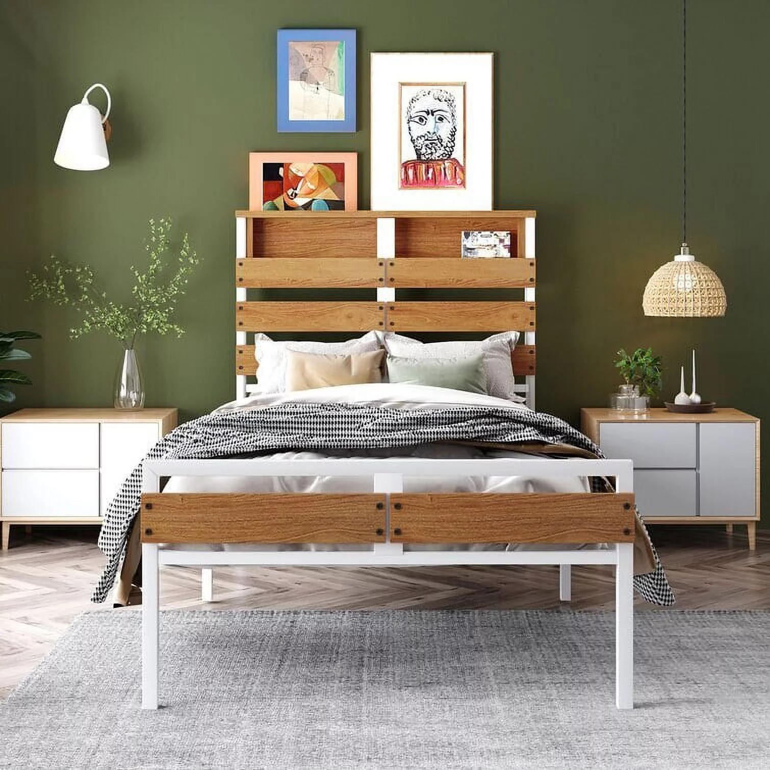 Metal and Wood Bed Frame with Headboard and Footboard ,Twin Size White