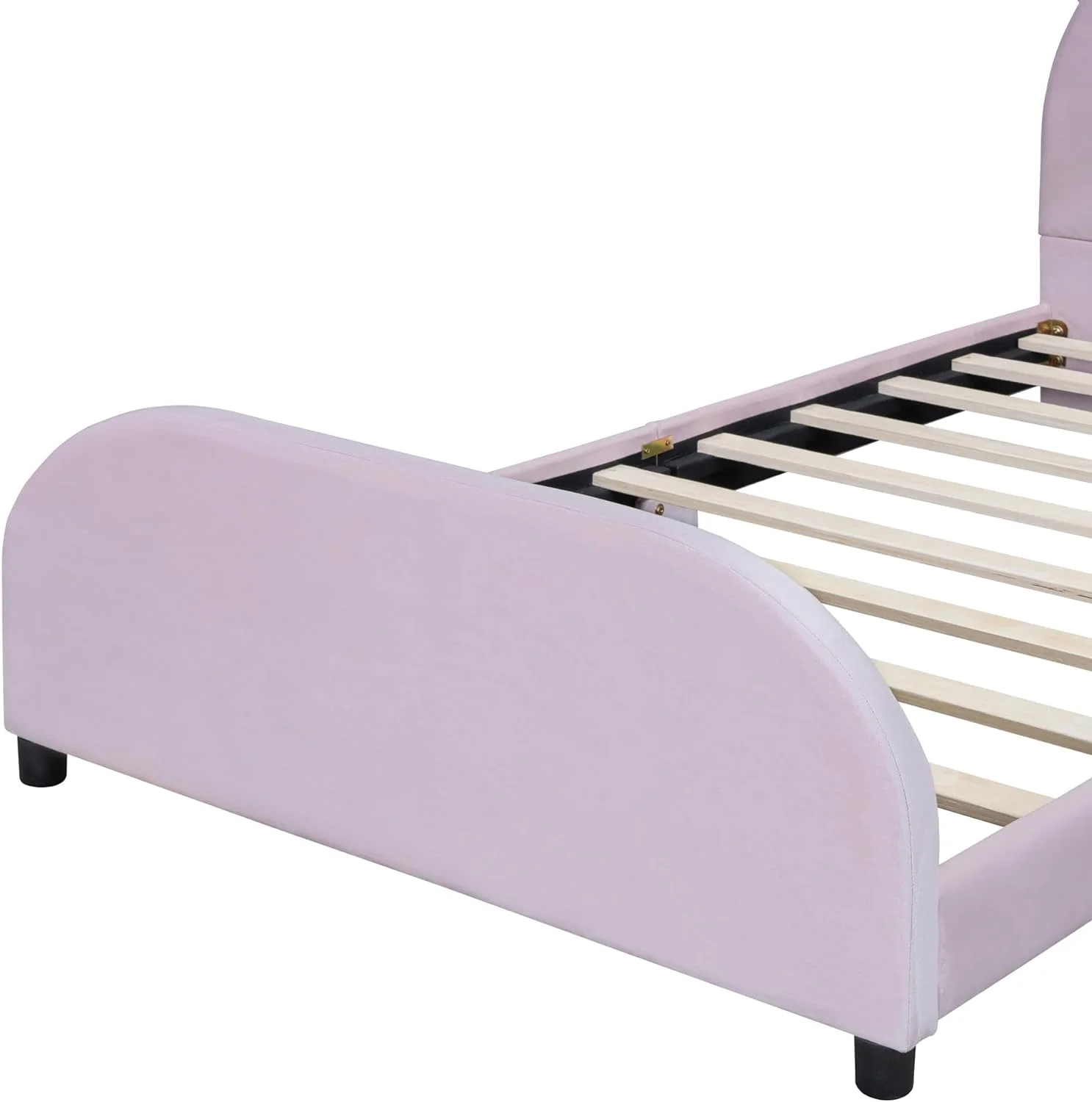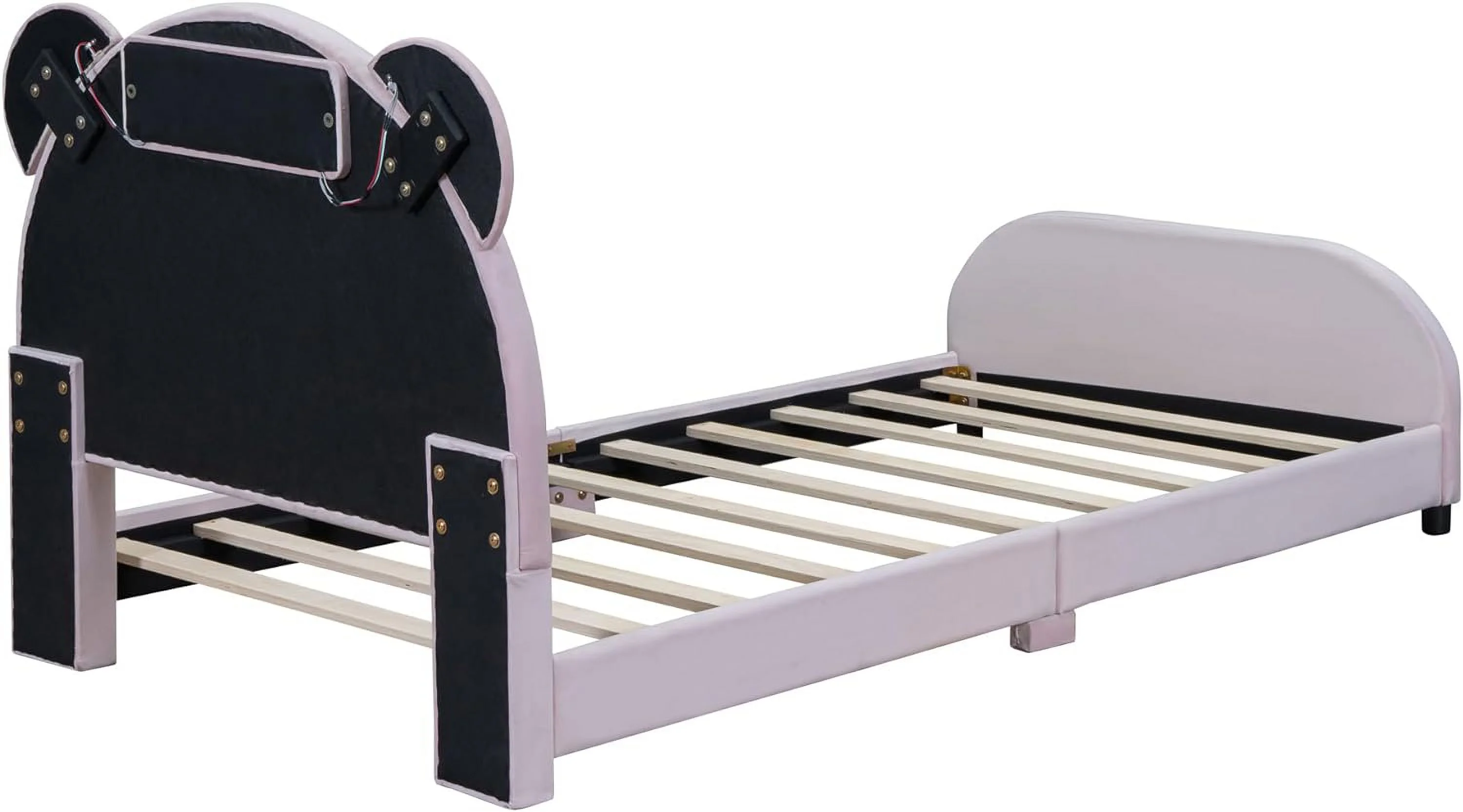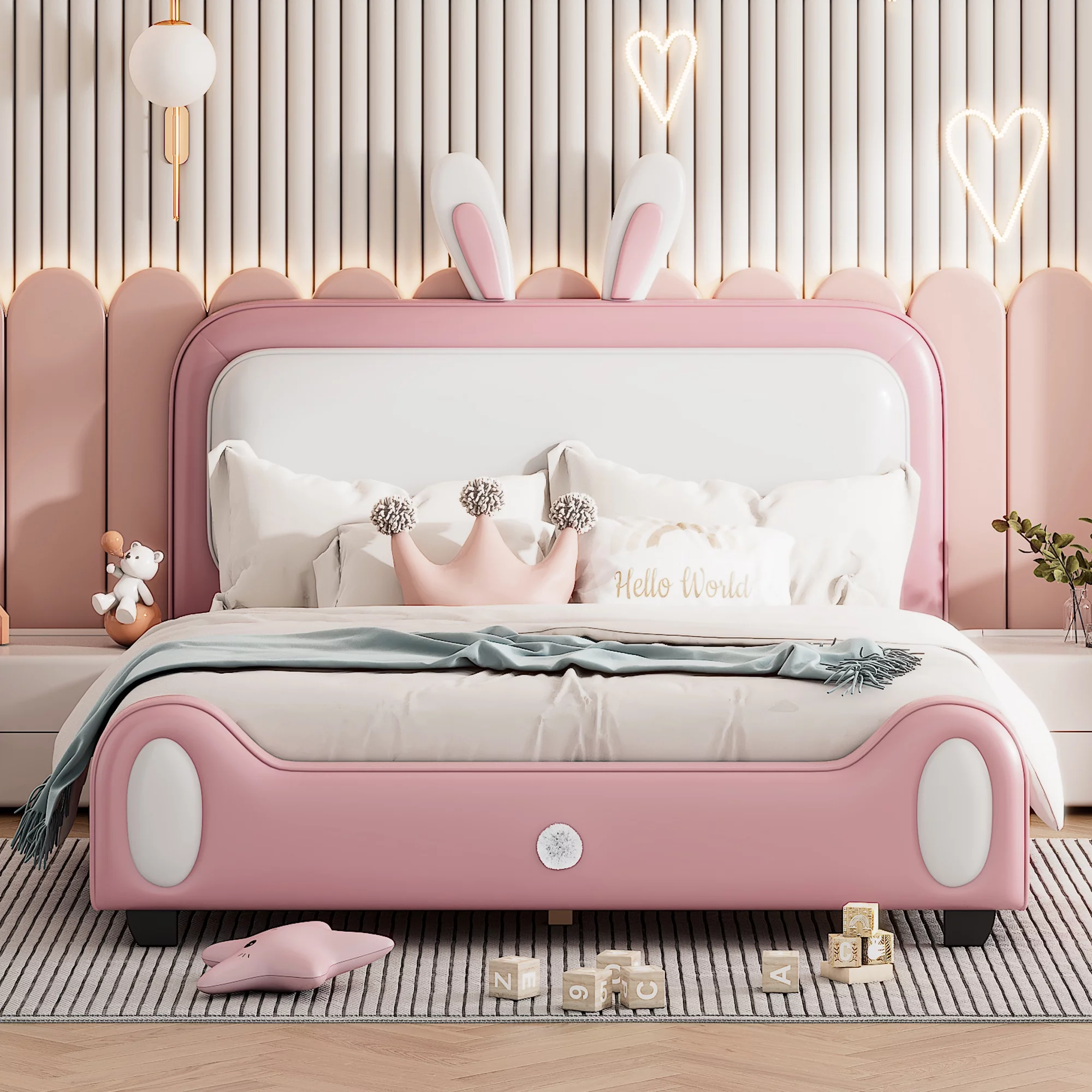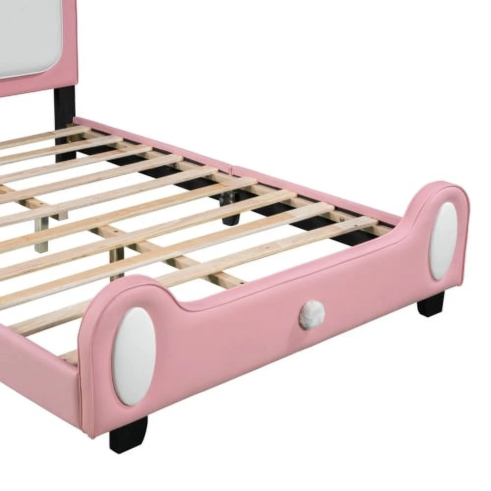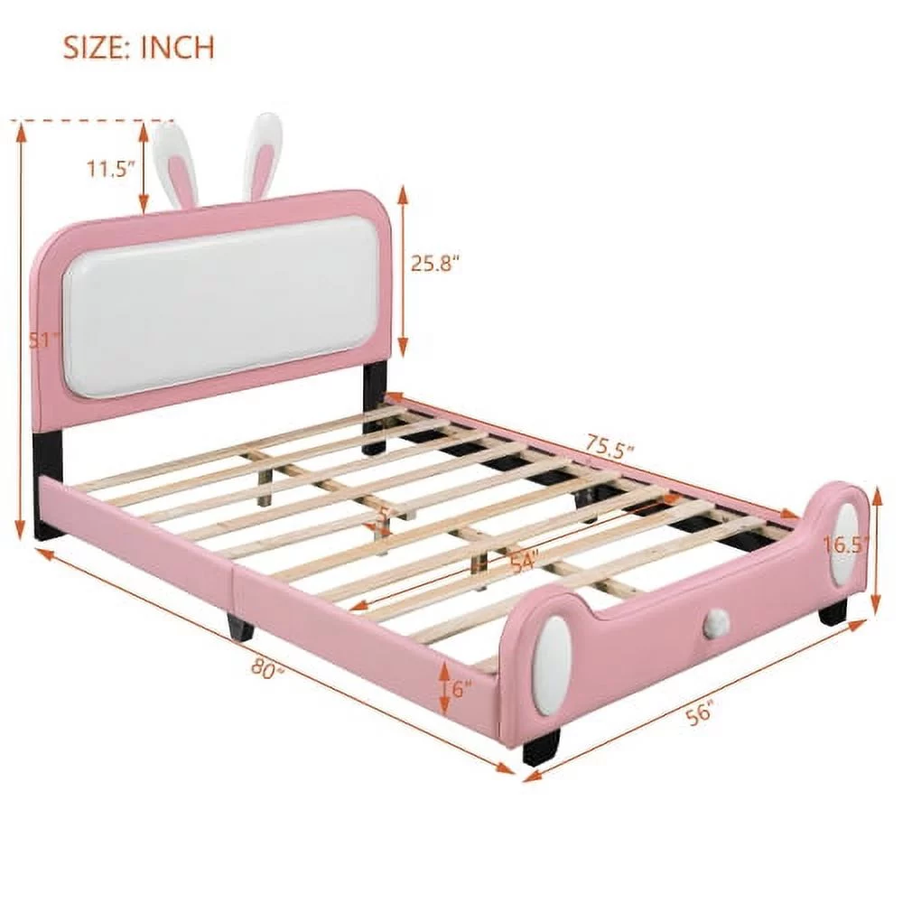 Full size Upholstered Rabbit-Shape Princess Bed ,Full Size Platform Bed with Headboard and Footboard,White+Pink