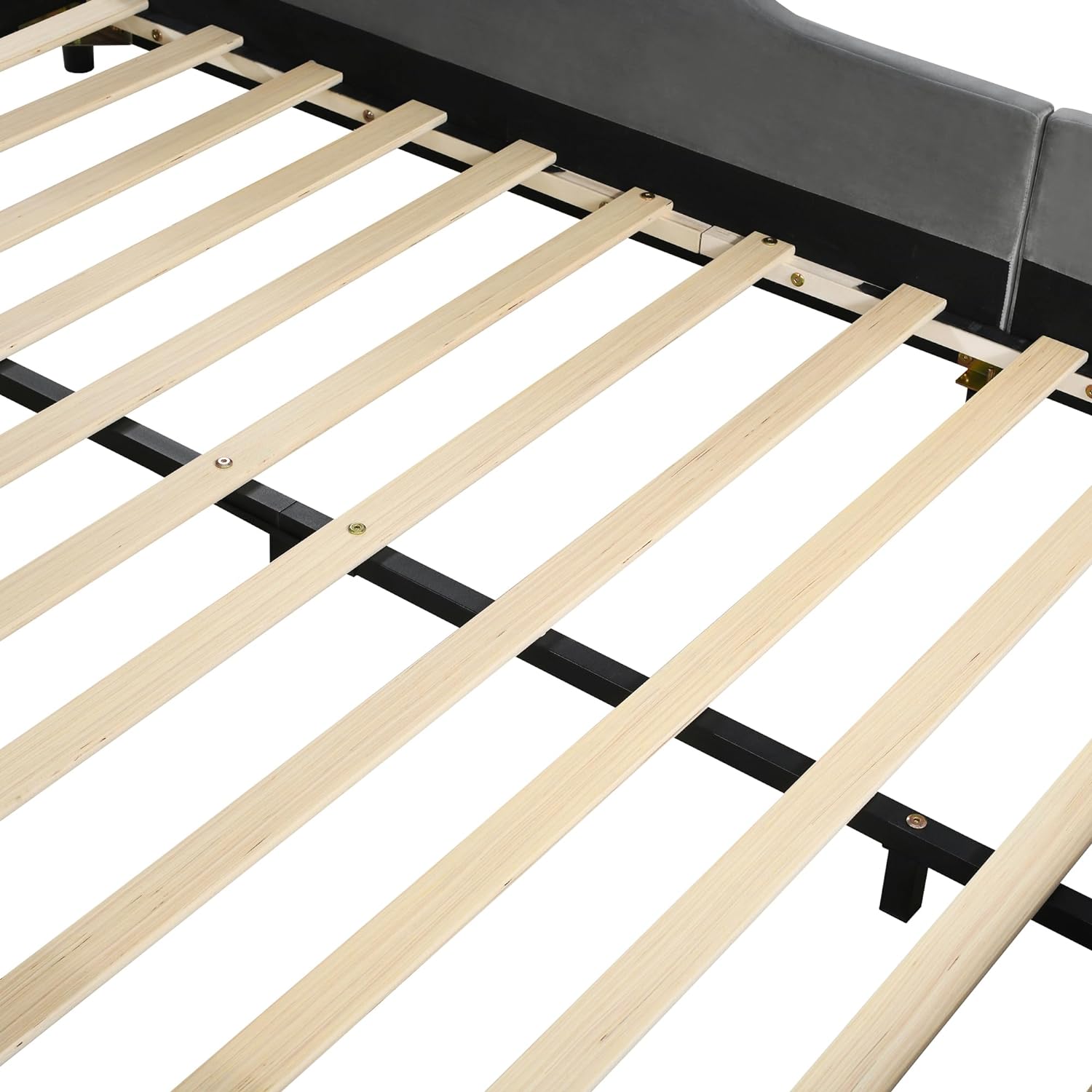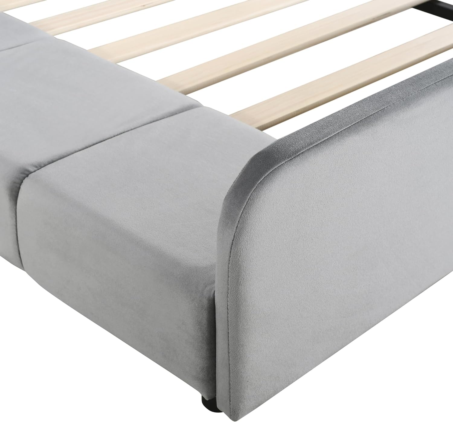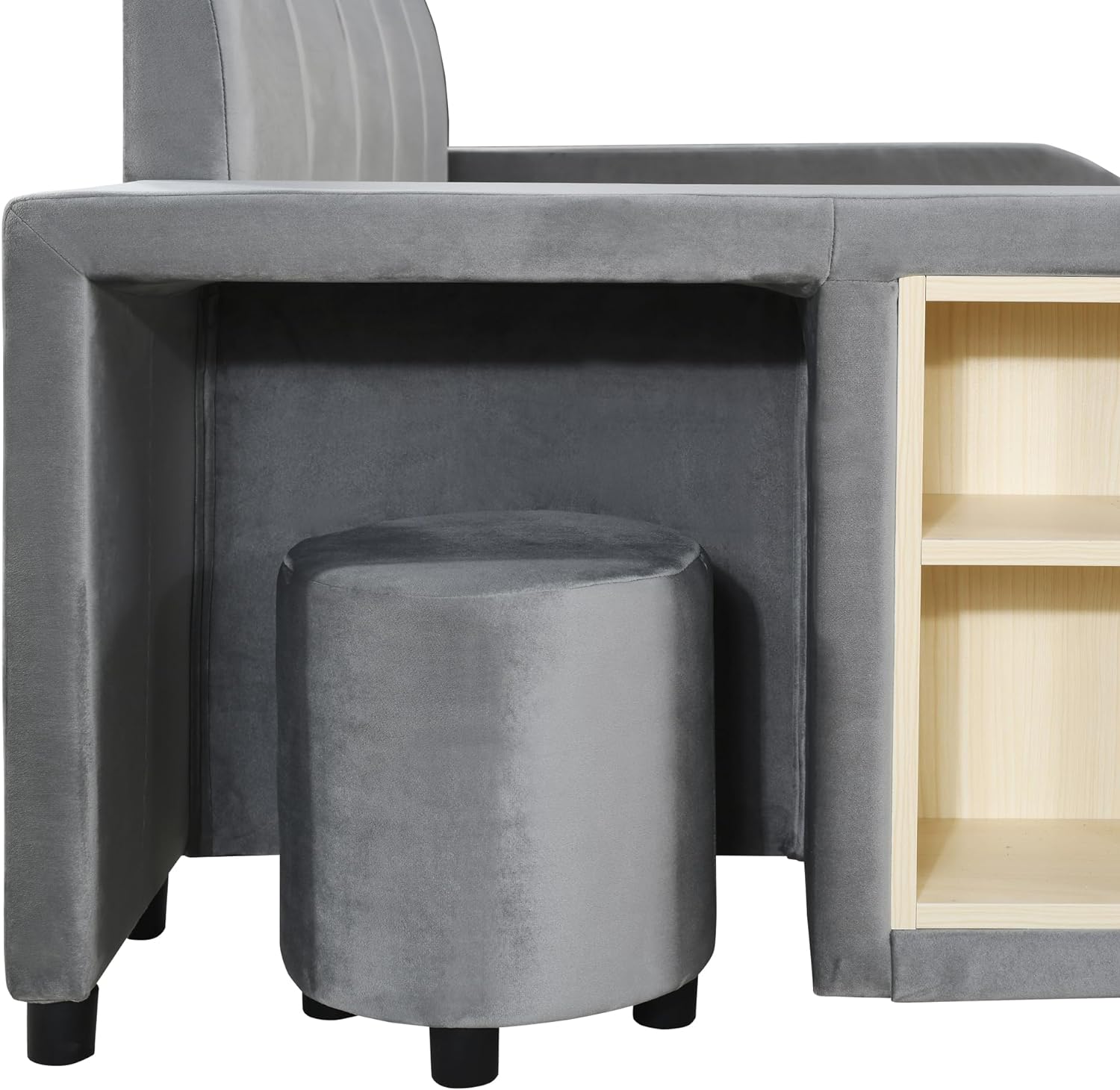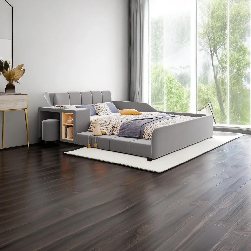 Full Size Upholstered Grounded Bed,Mother & Child Velvet Platform Bed with Bedside Desk and Little Round Stool for Bedroom