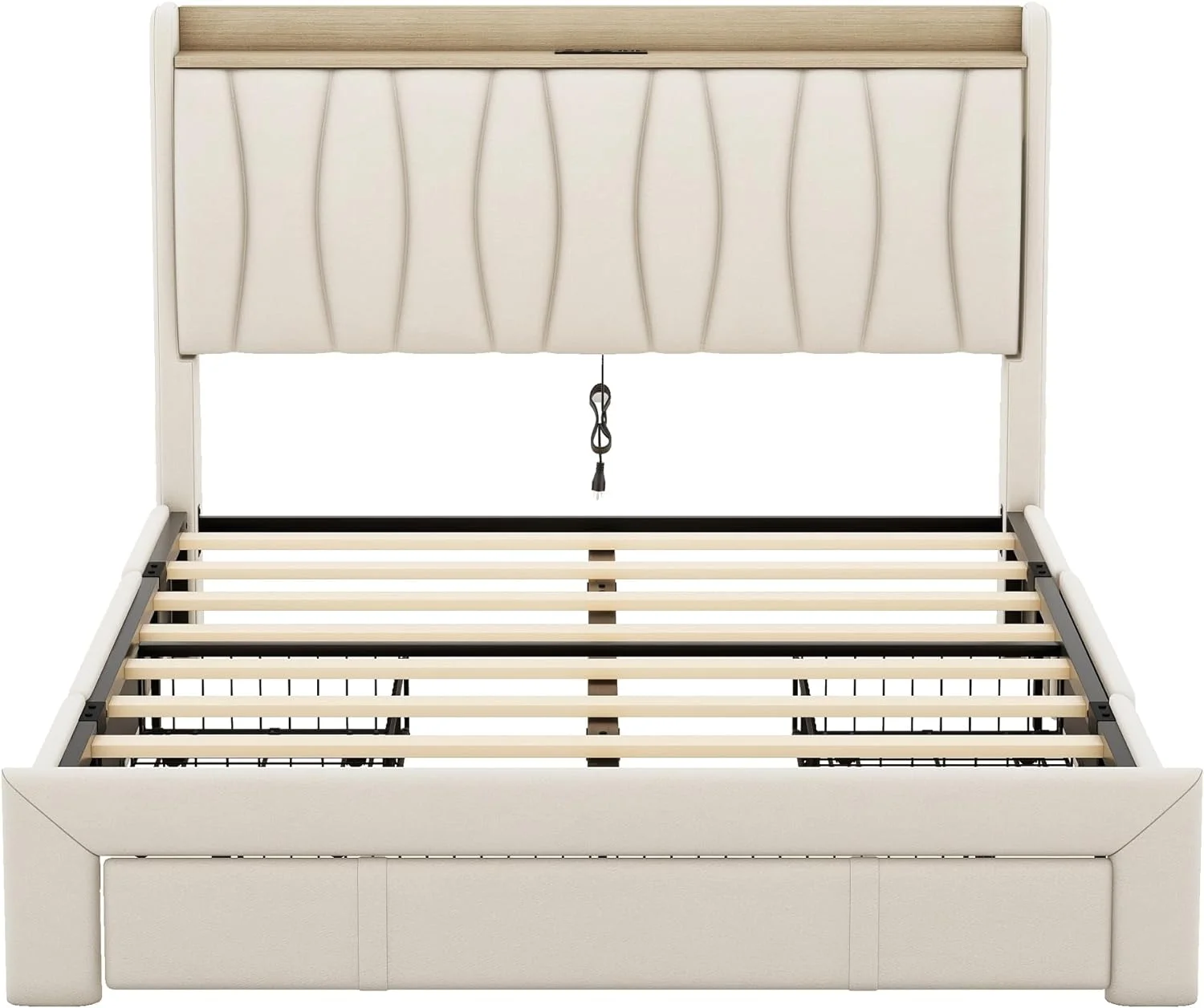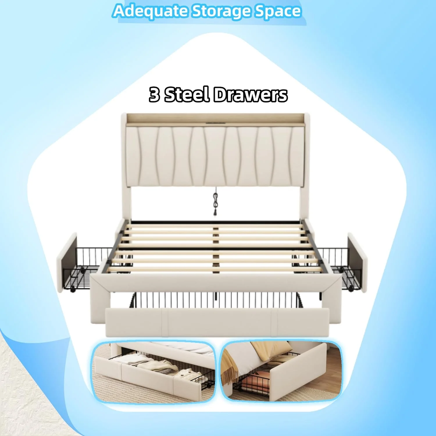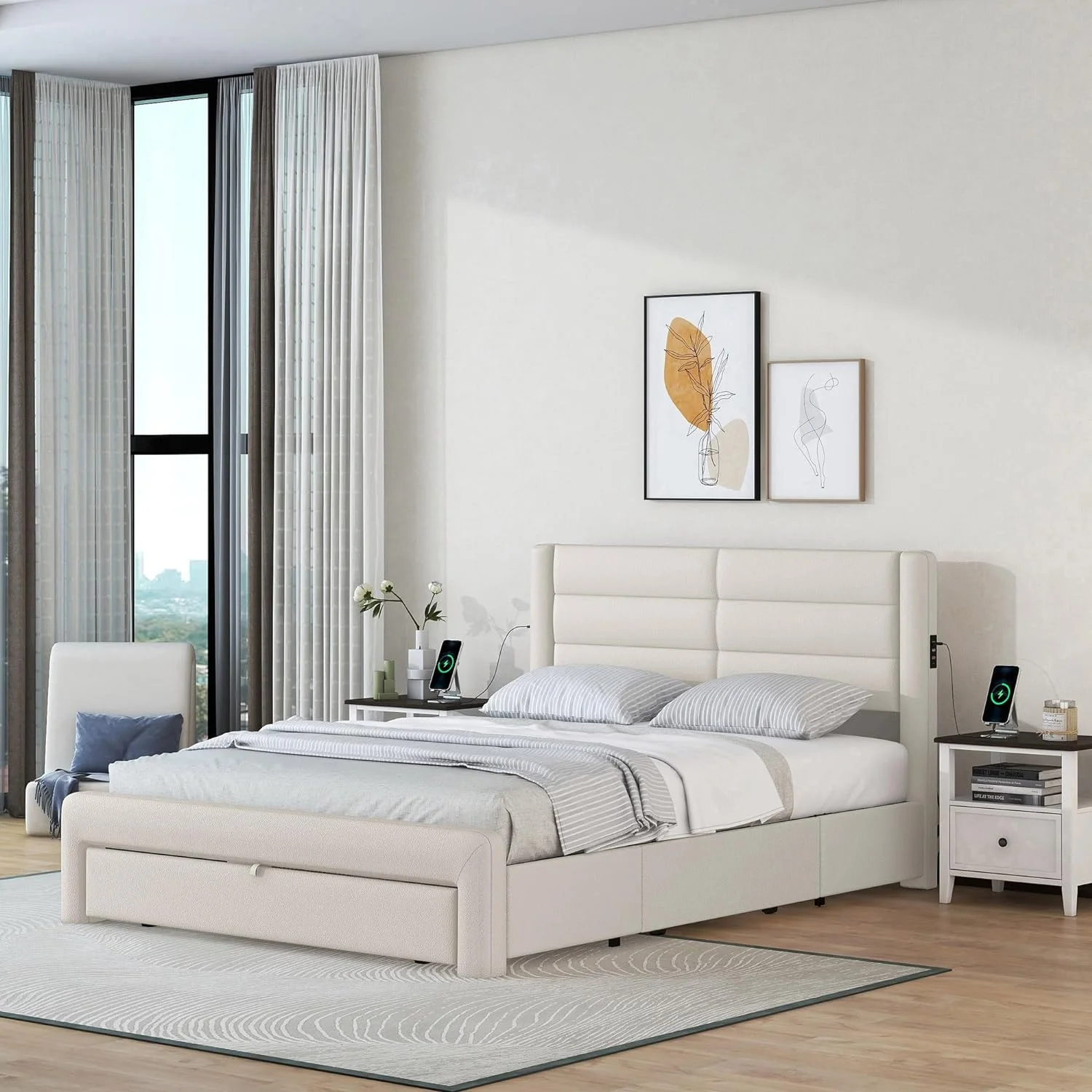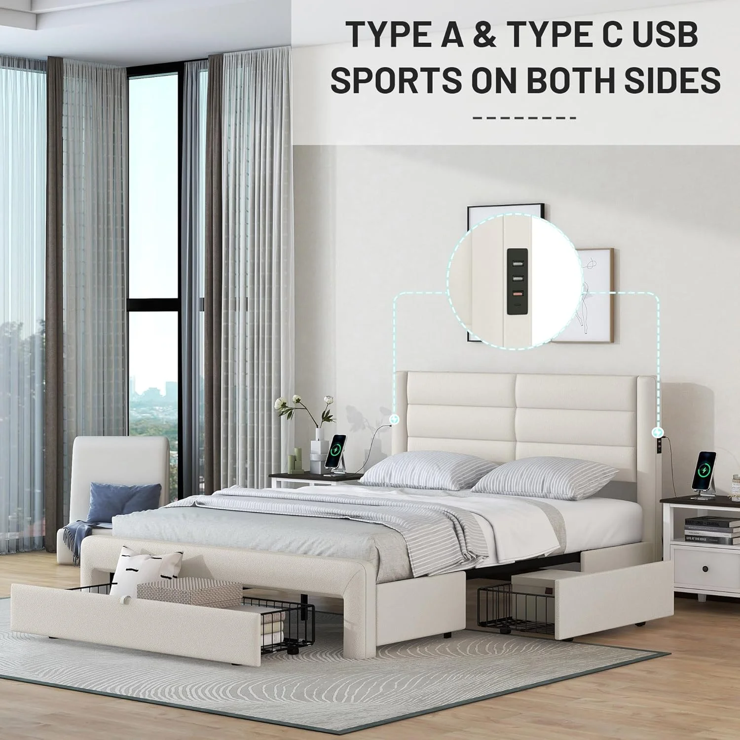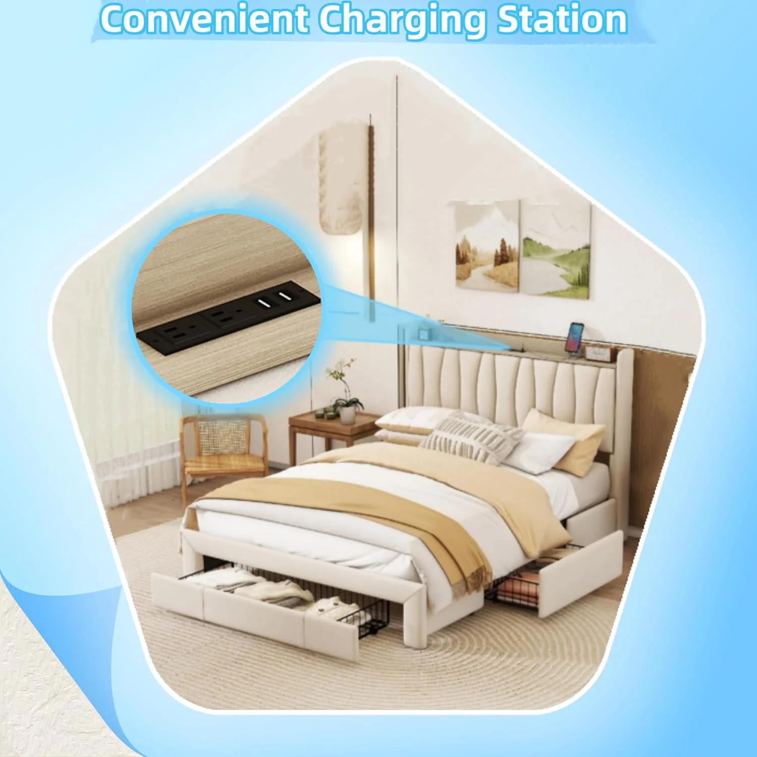 Quee Size Bed Frame Wih Sorage Headboard Ad Chargig Saio, Upholsered Plaform Bed Wih 3 Drawers, o Box Sprig eeded, Beige
