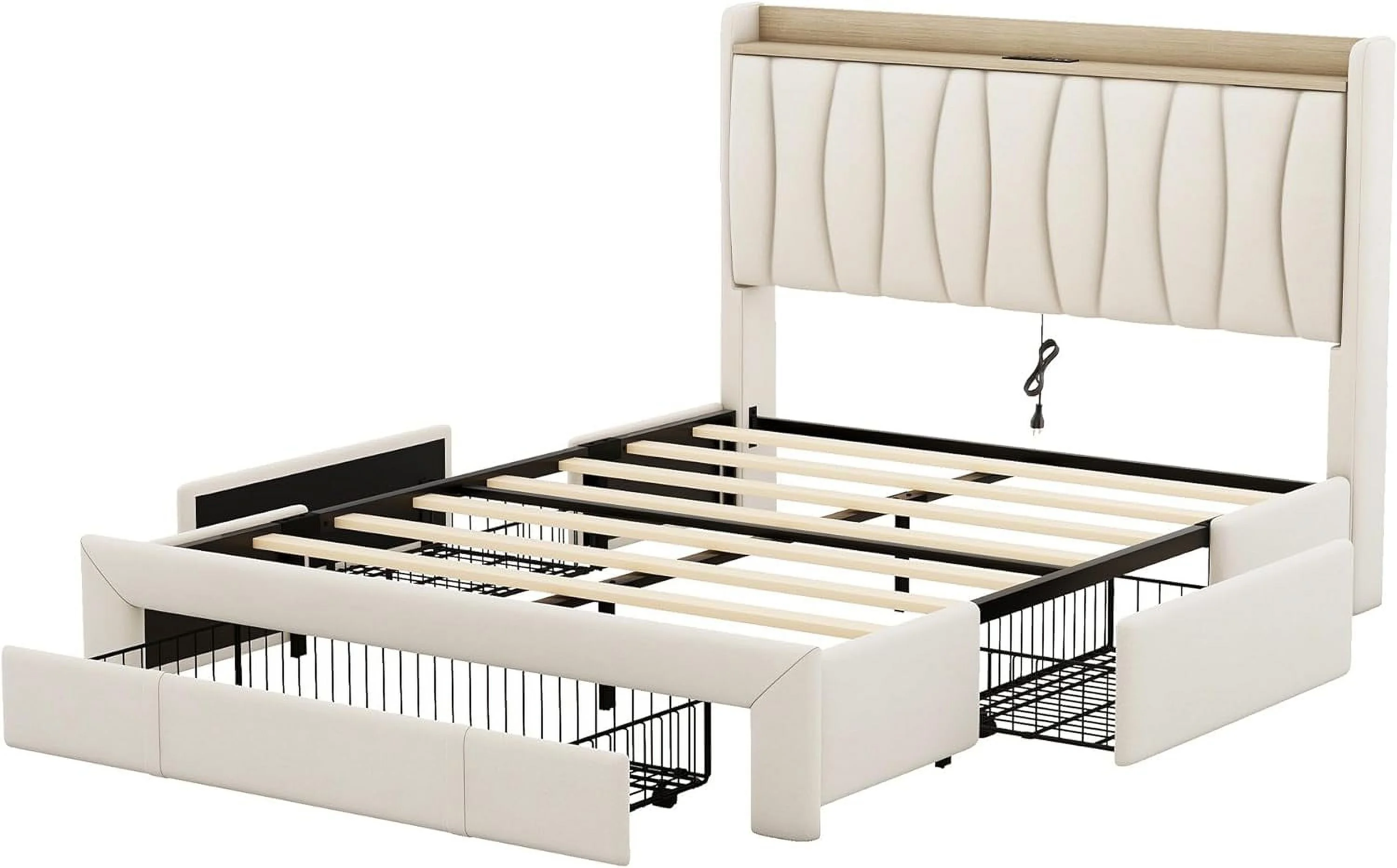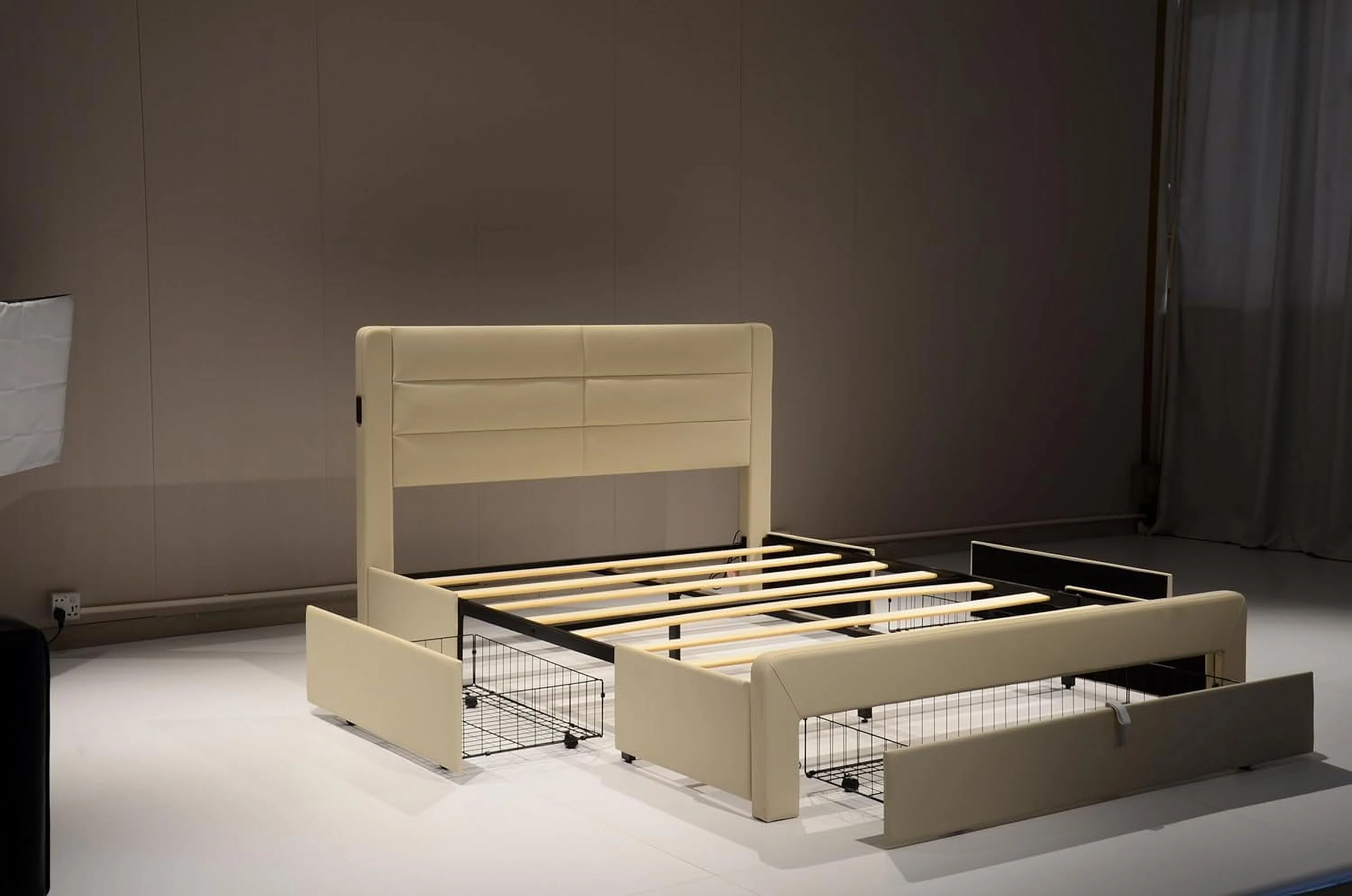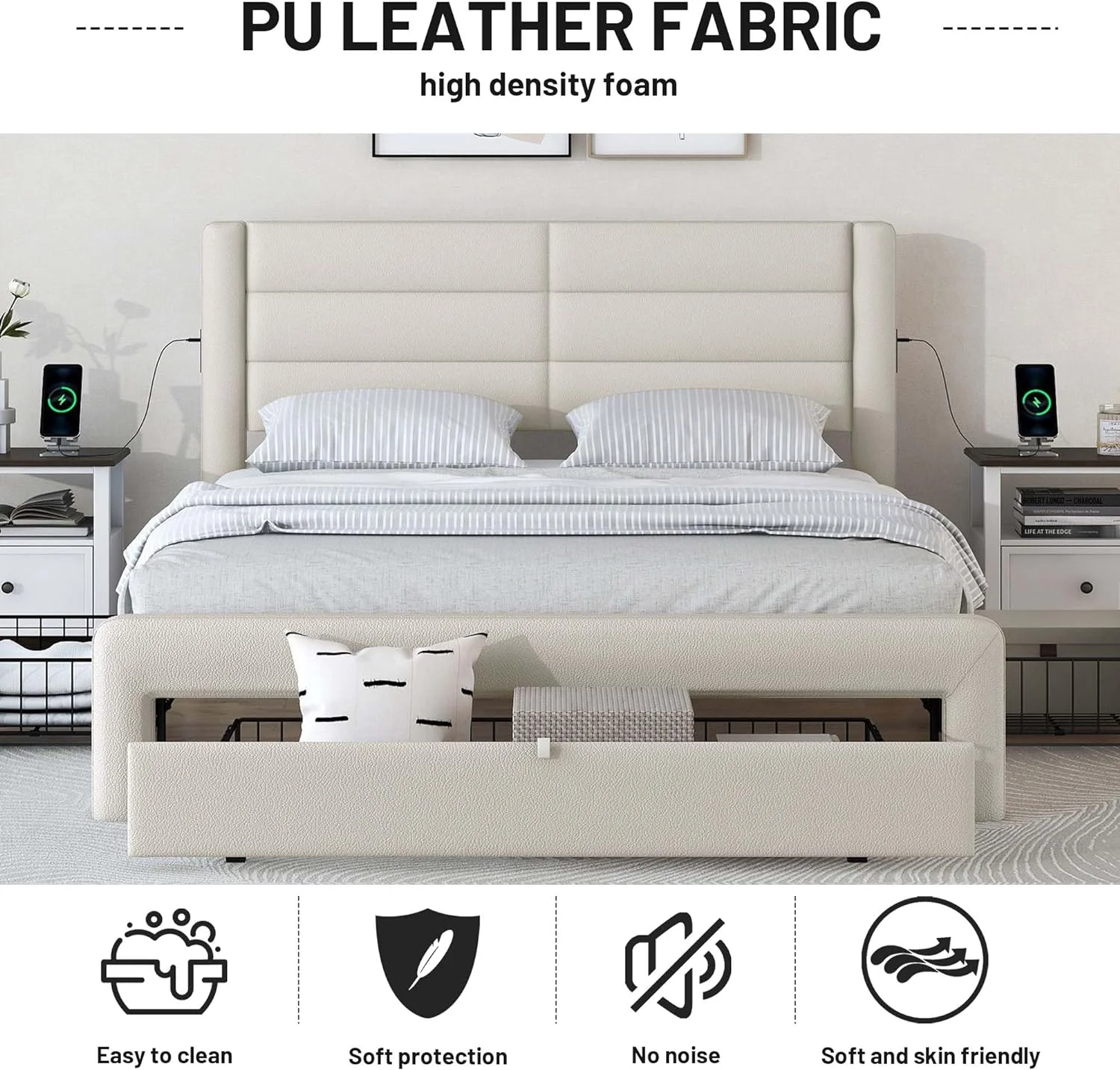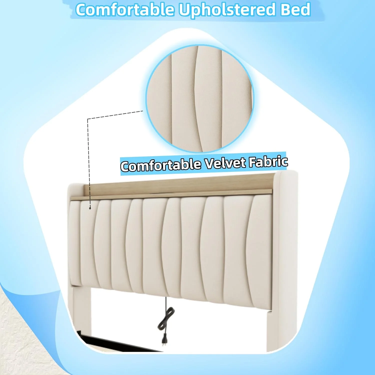 Quee Size Bed Frame Wih Sorage Headboard Ad Chargig Saio, Upholsered Plaform Bed Wih 3 Drawers, o Box Sprig eeded, Beige