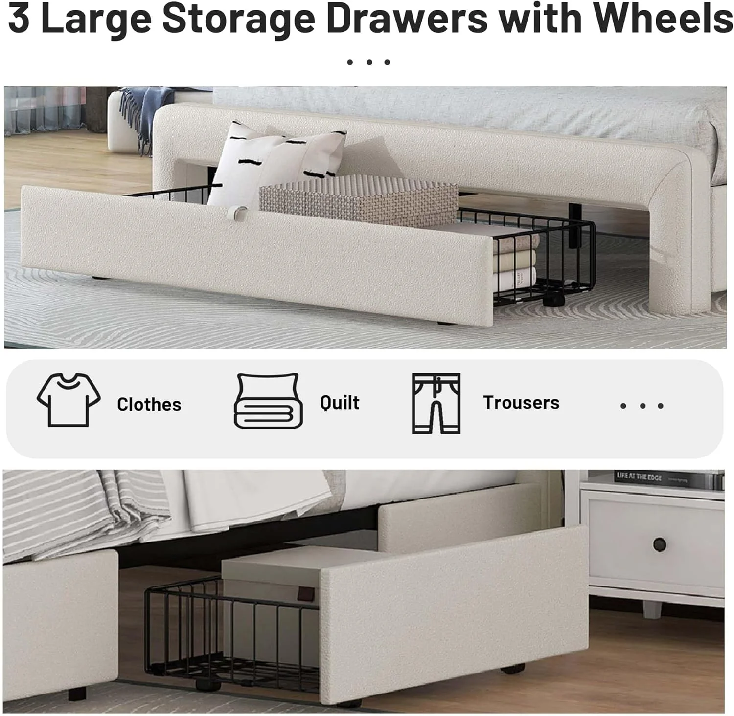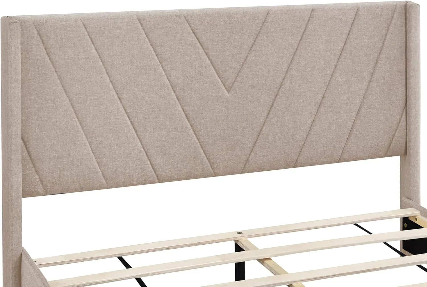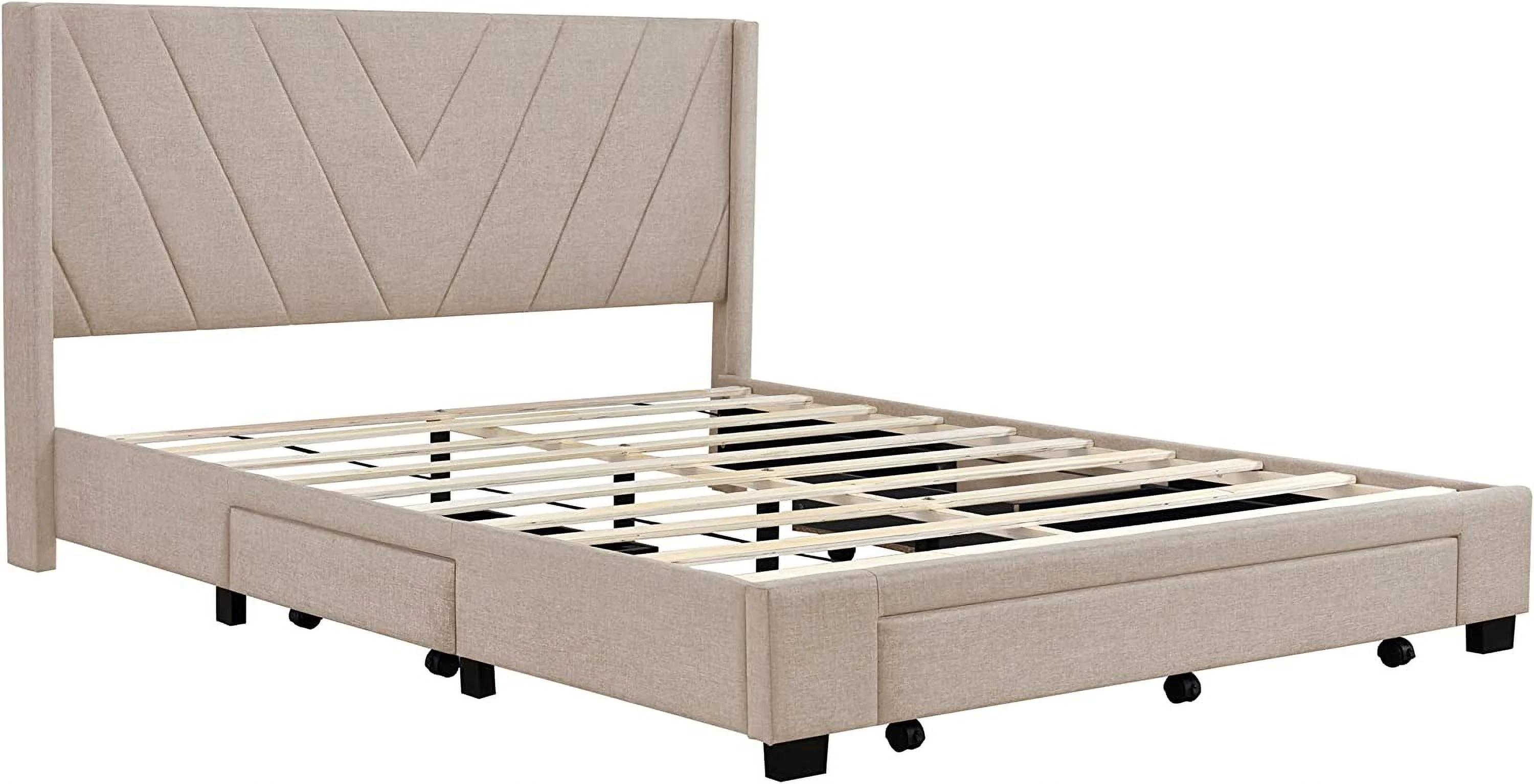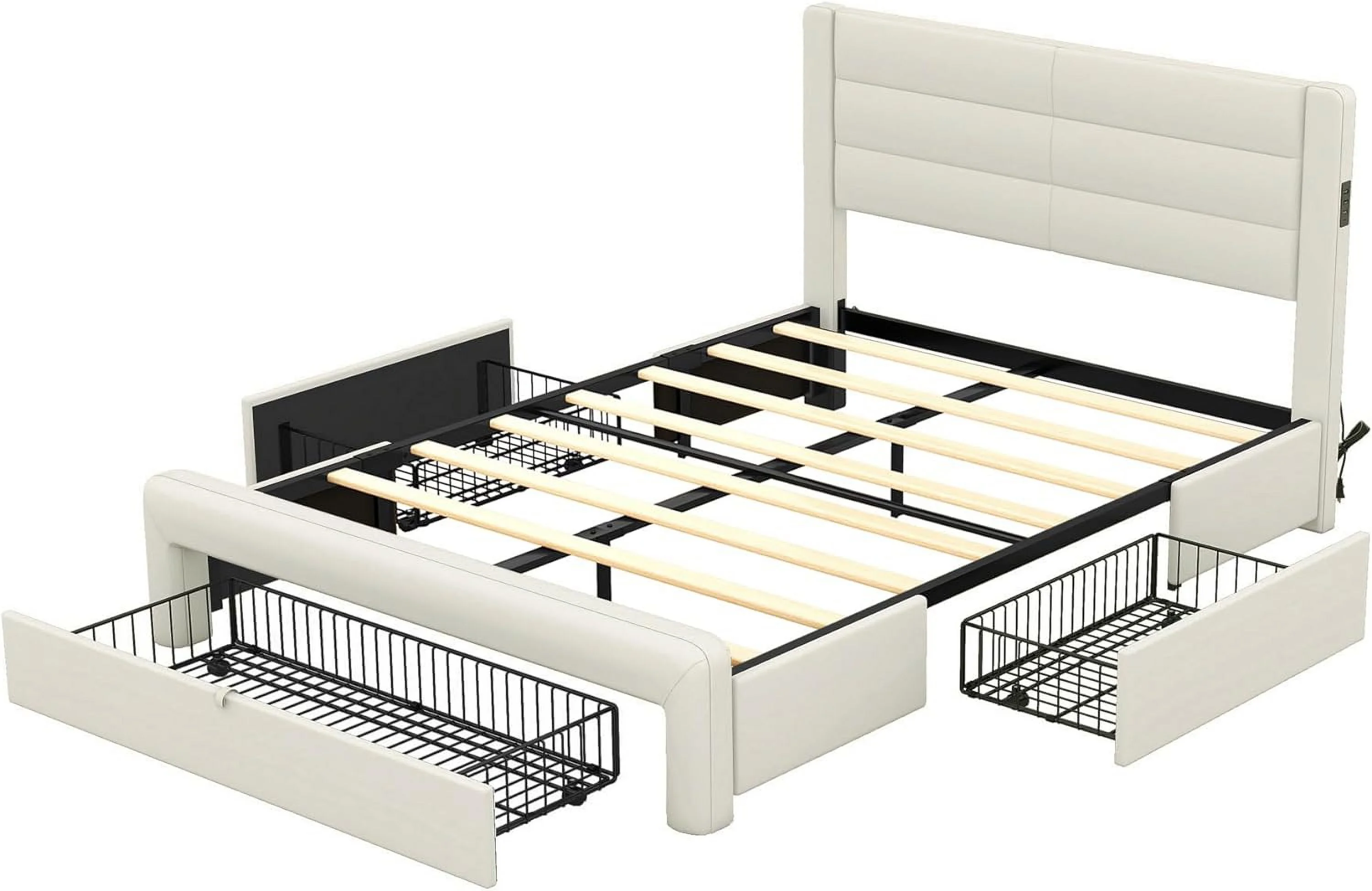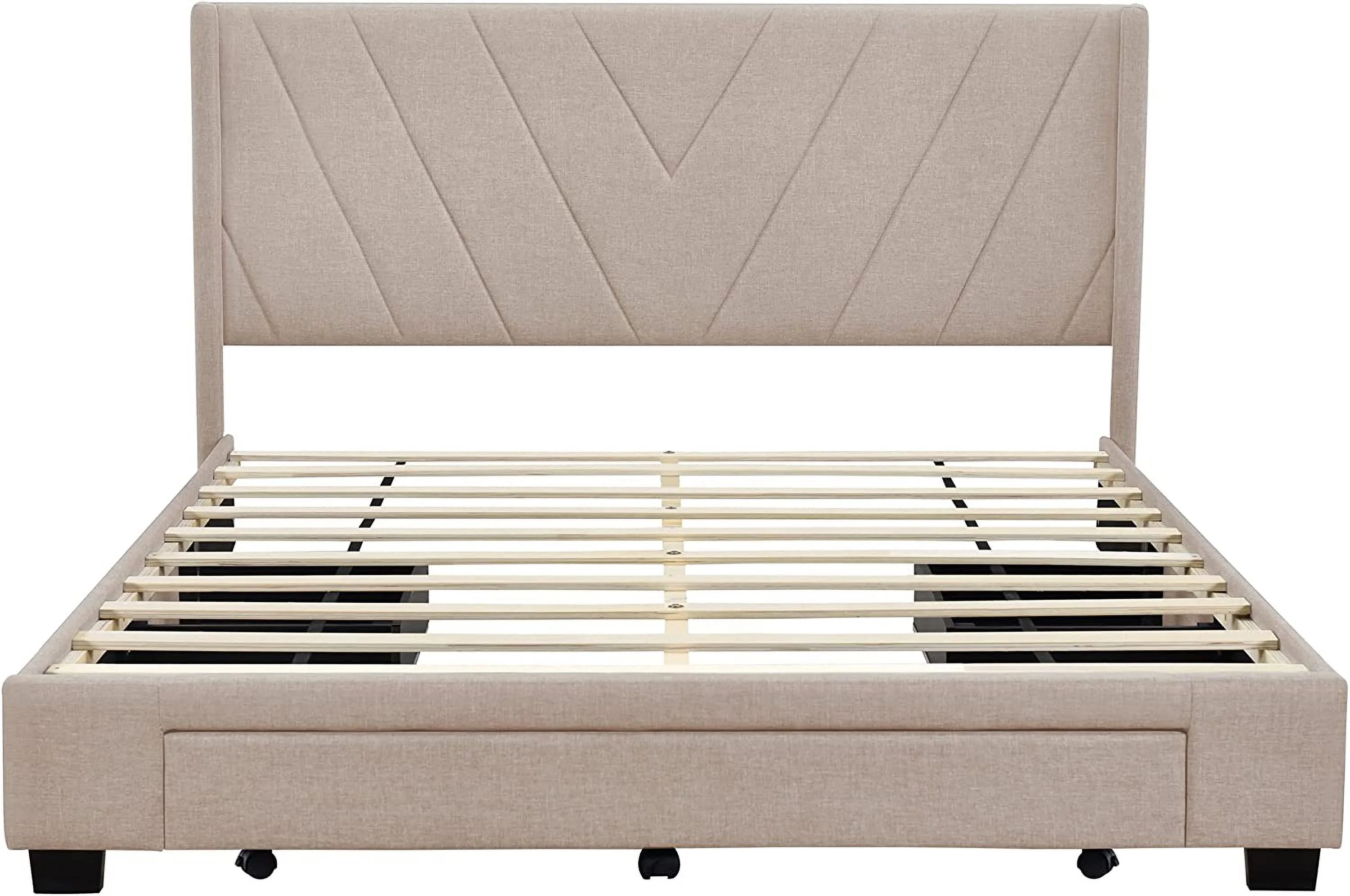Quee Size Bed Frame Wih Sorage Headboard Ad Chargig Saio, Upholsered Plaform Bed Wih 3 Drawers, o Box Sprig eeded, Beige