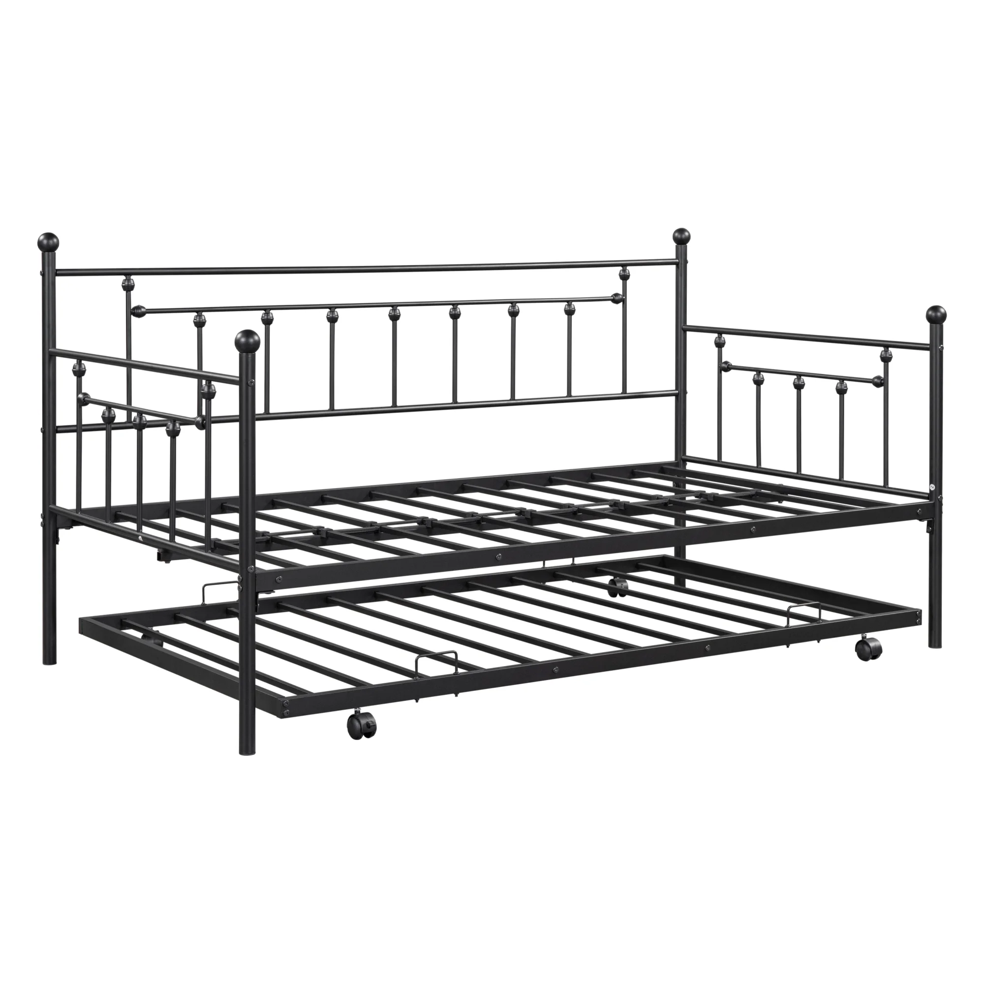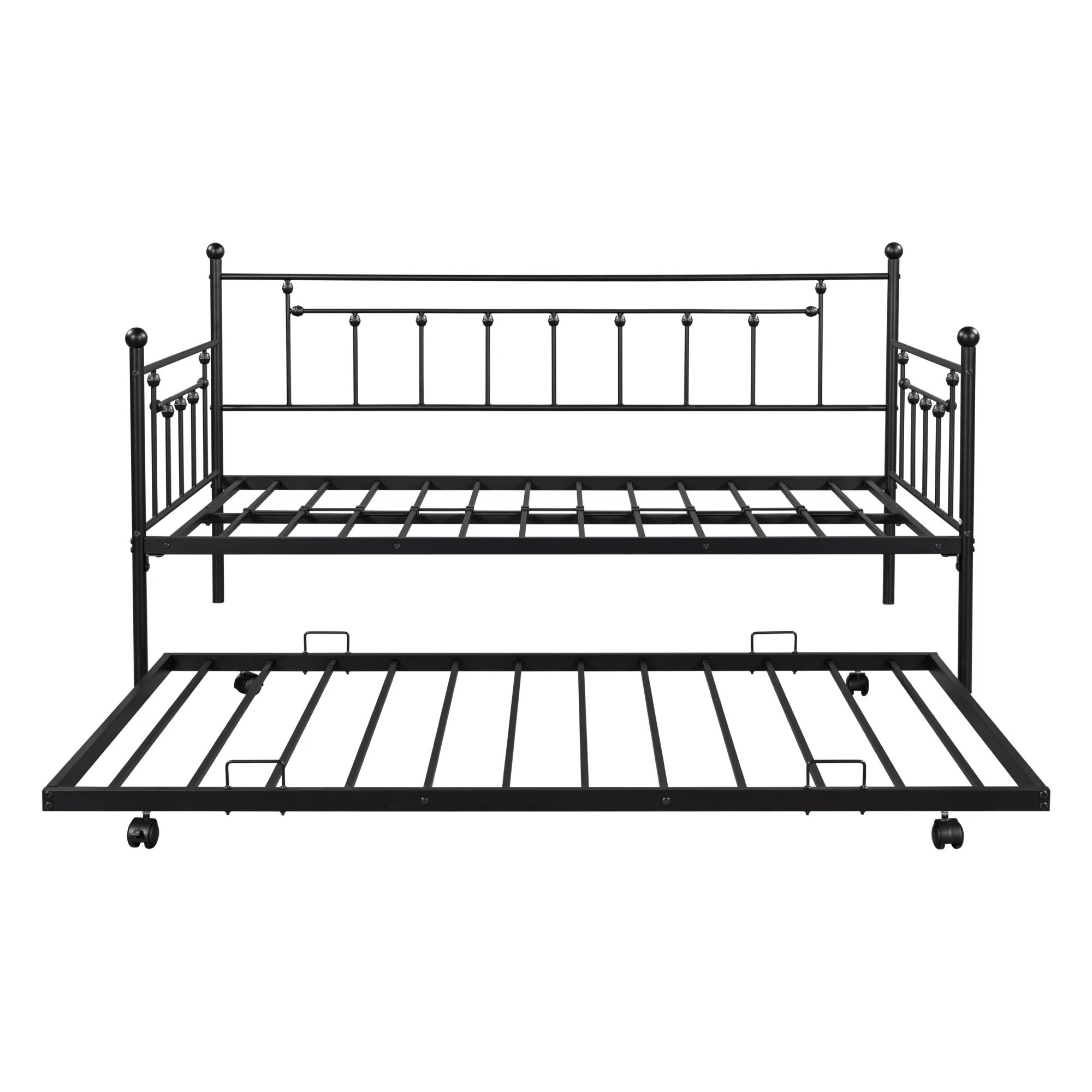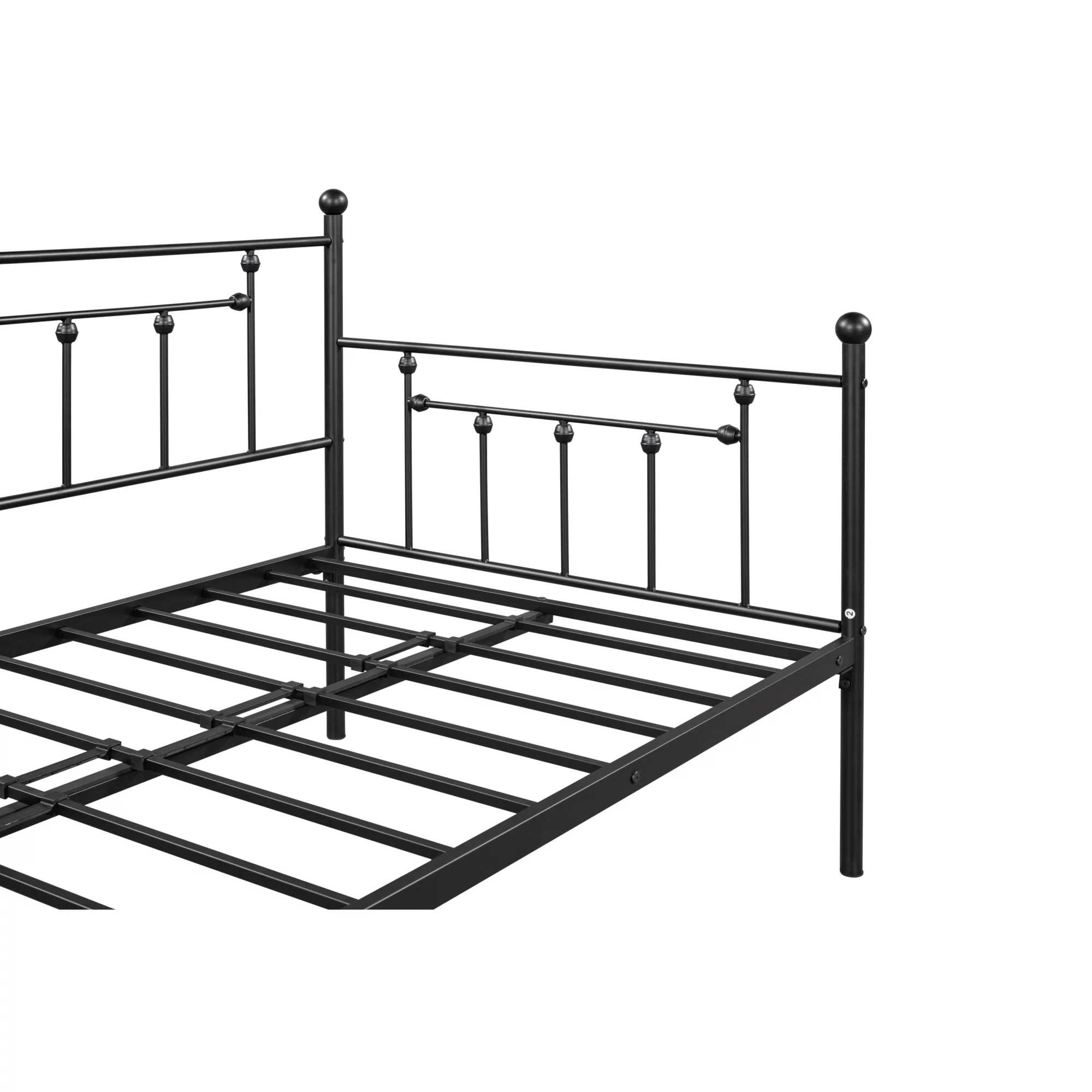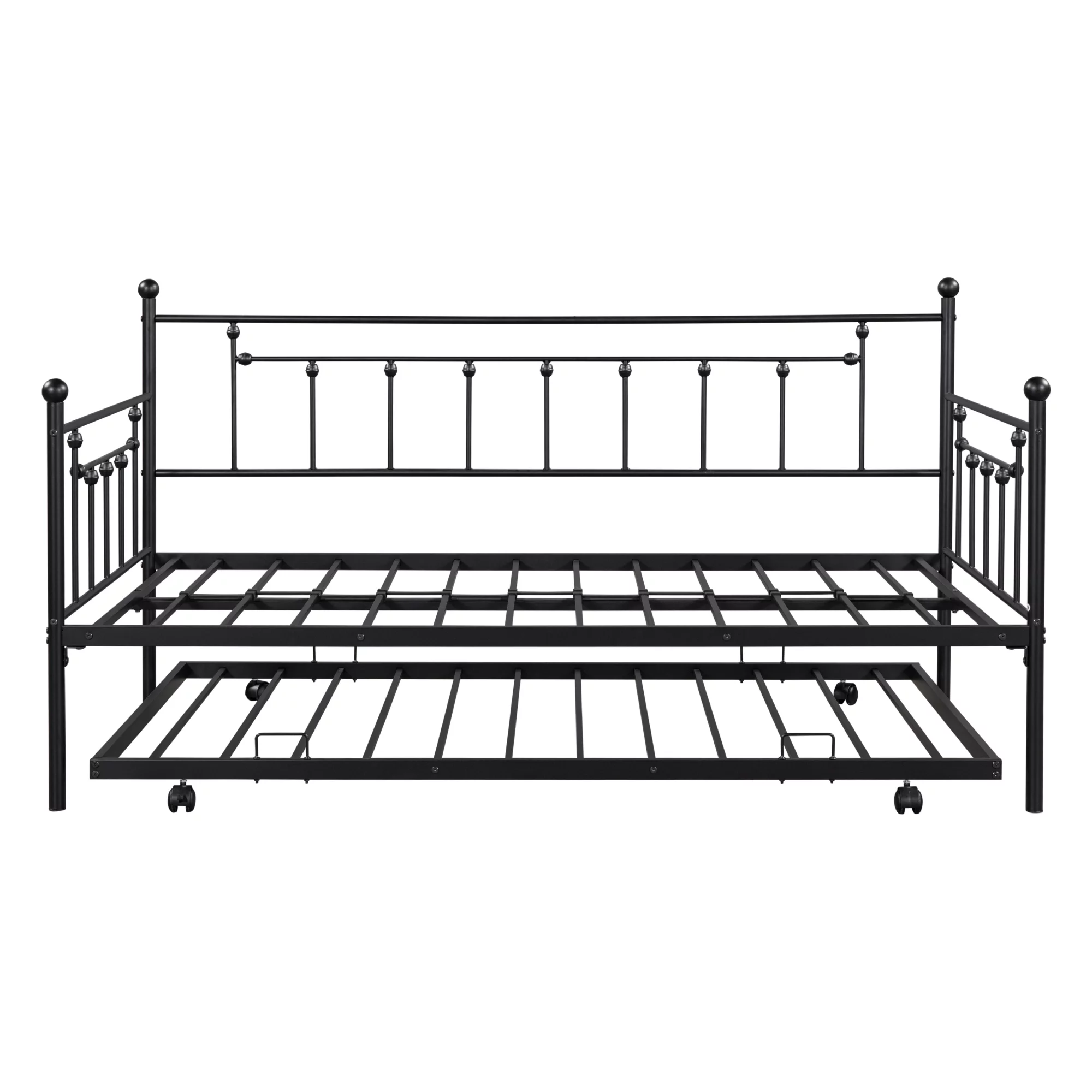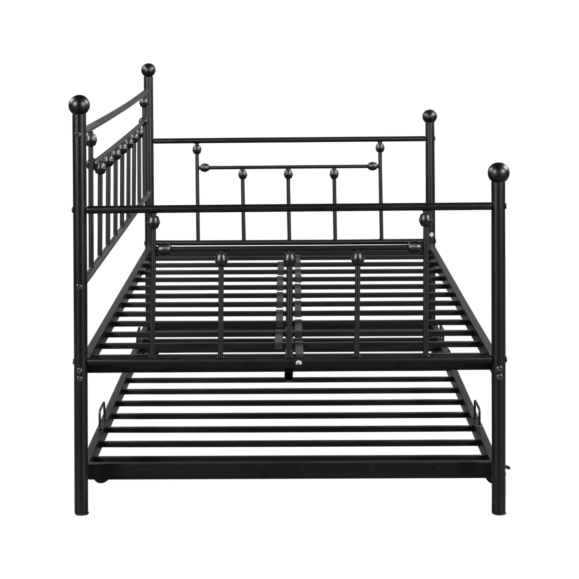 "Heavy-Duty Twin-Size Metal Daybed Frame with Trundle, Steel Slat Support, Headboard, No Box Spring Required, Black"